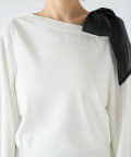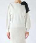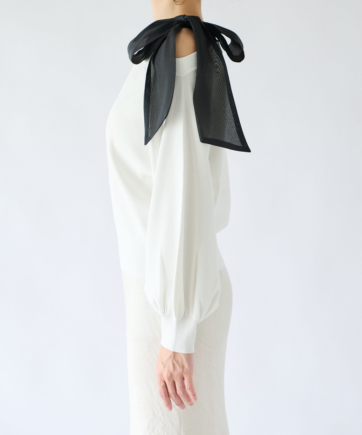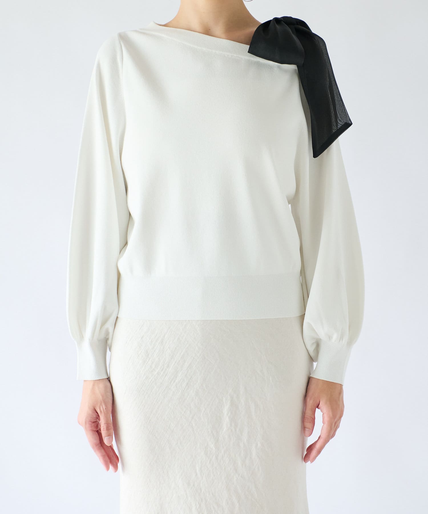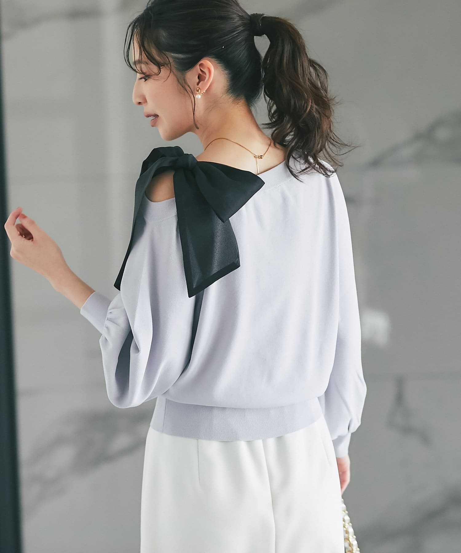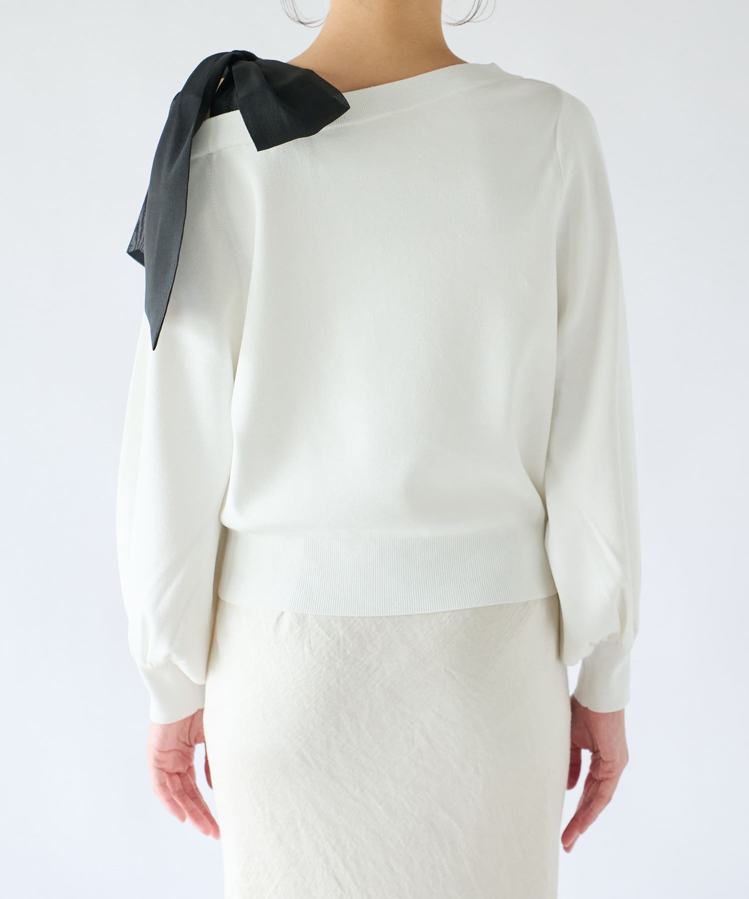 身にまとうだけで女子力高まるリボン付きワンショルダーニット。