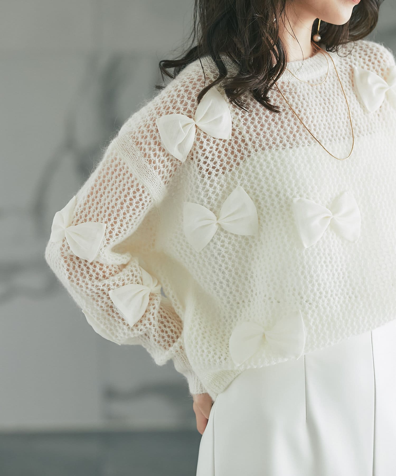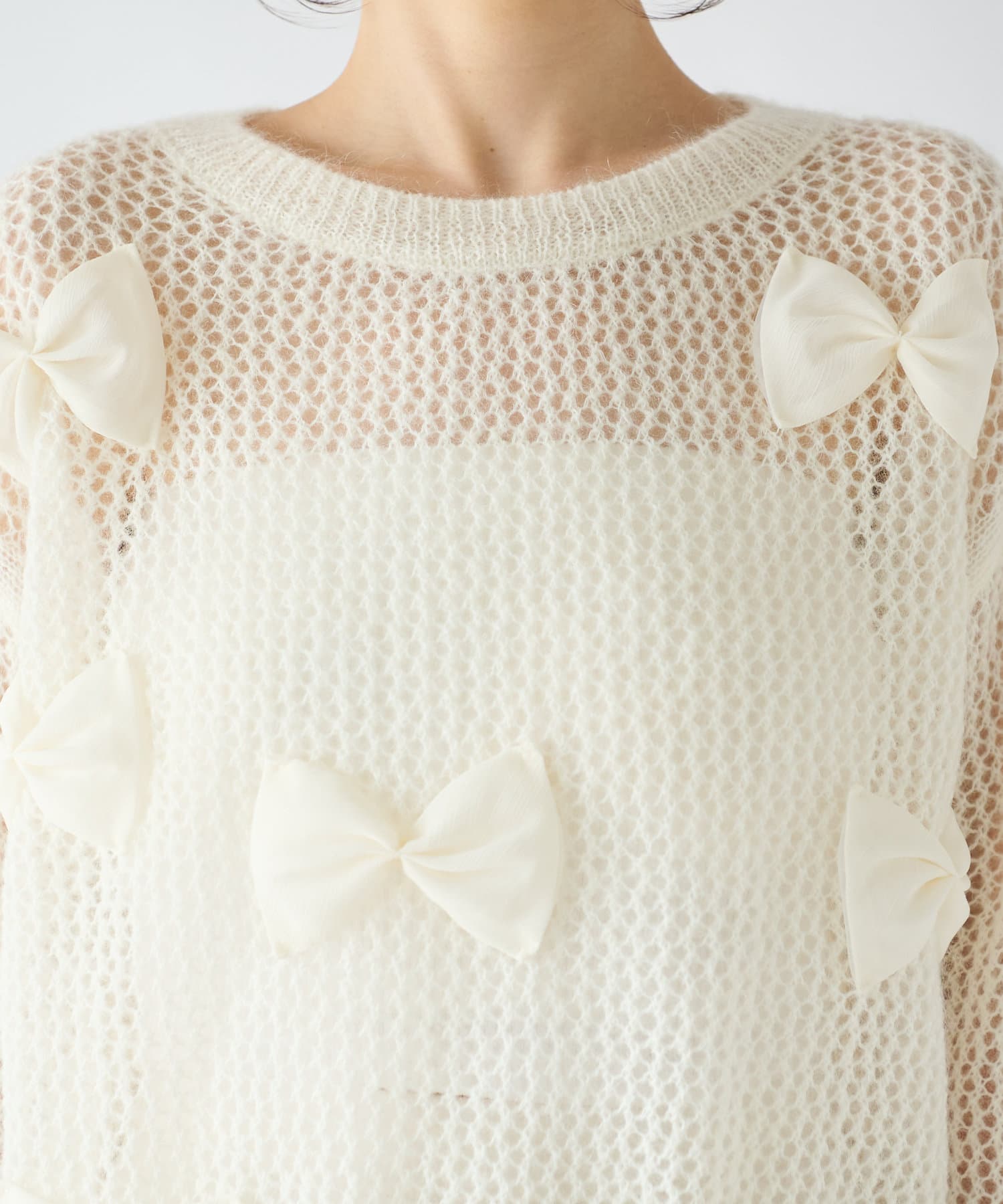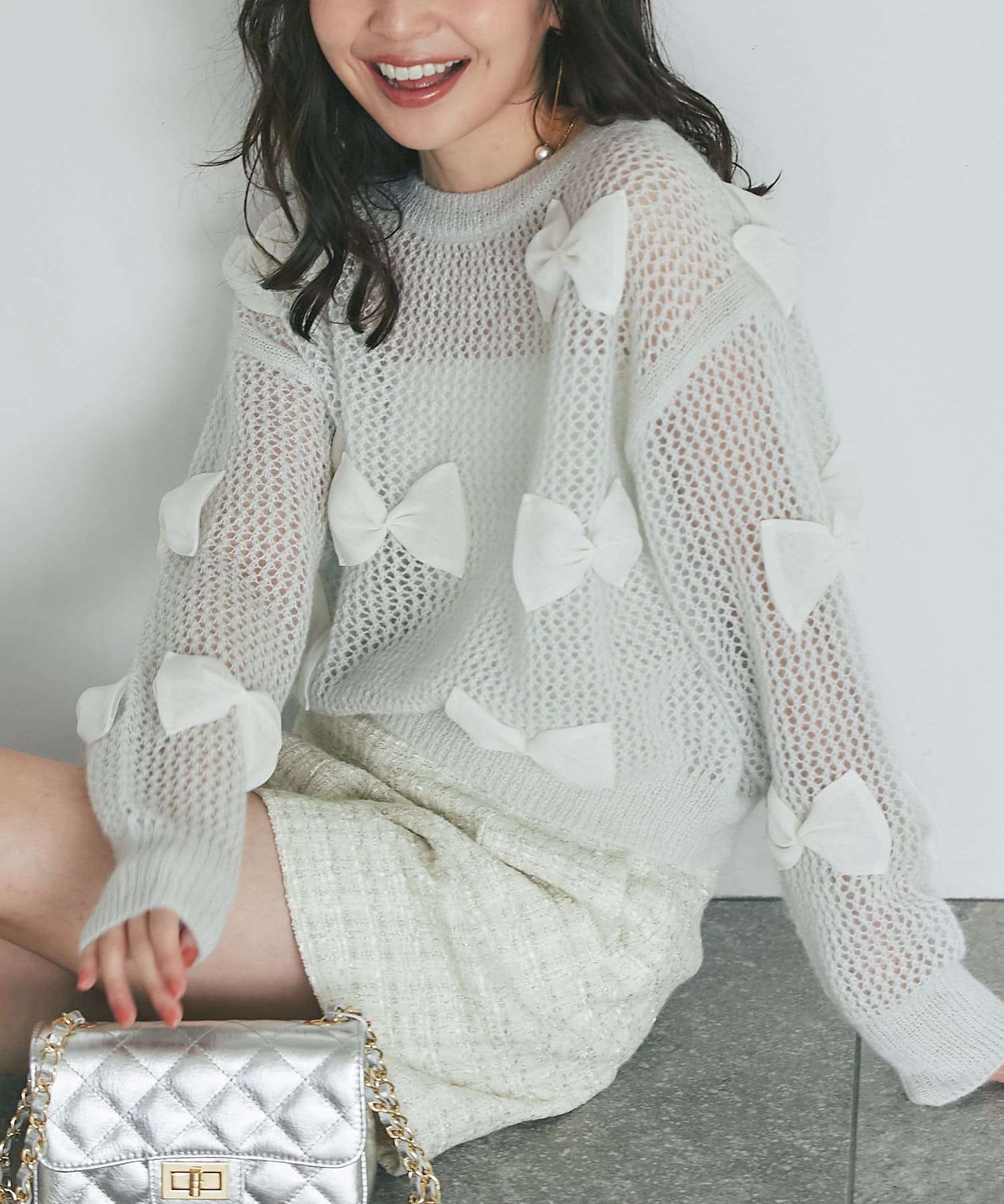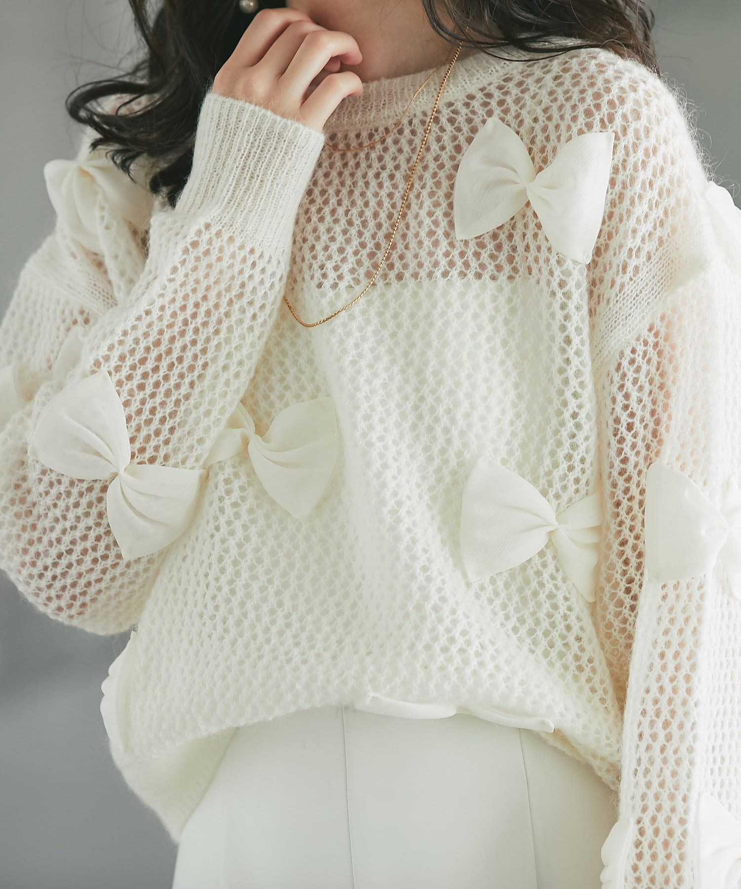 トレンドのリボンが散りばめられたオーバーサイズのメッシュニット。