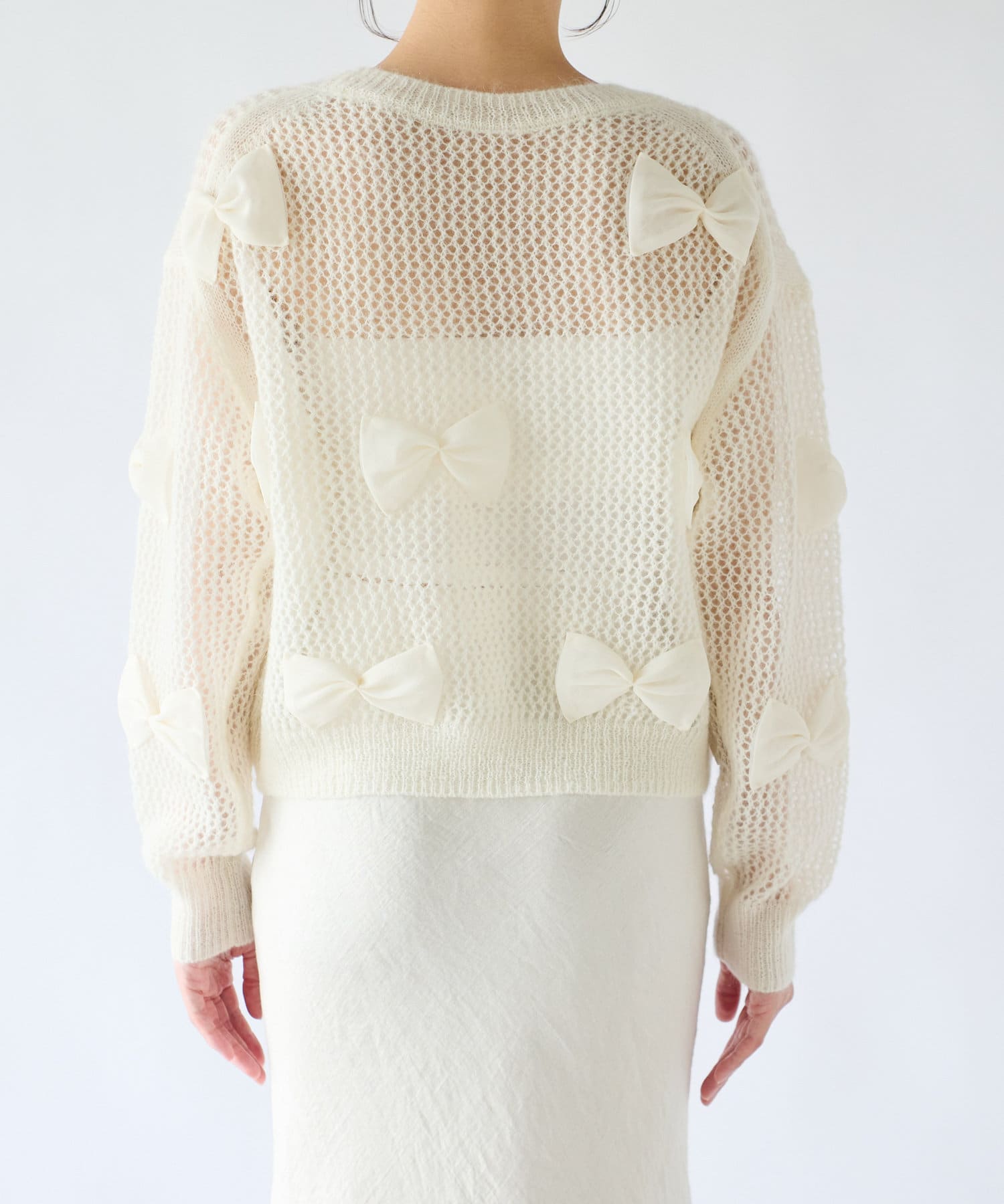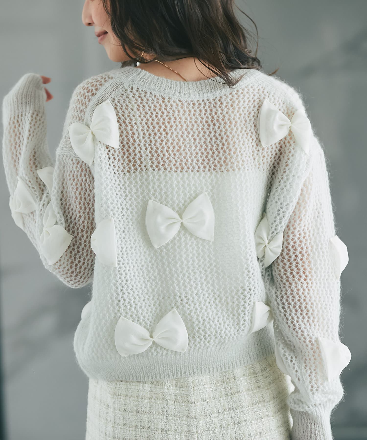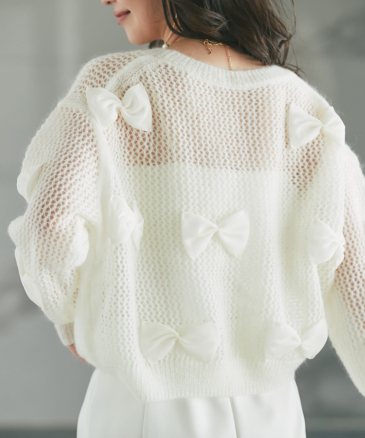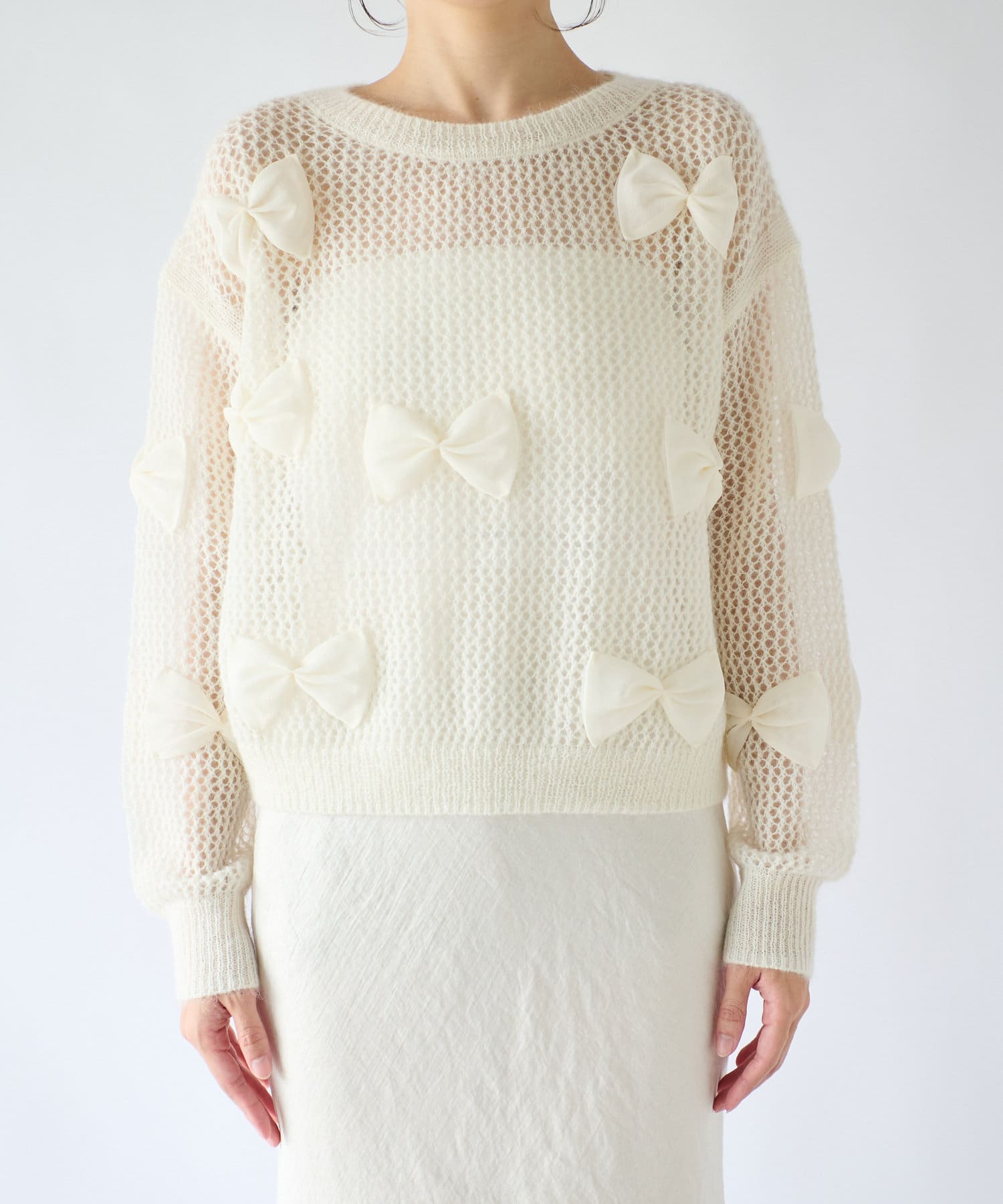 トレンドのリボンが散りばめられたオーバーサイズのメッシュニット。
