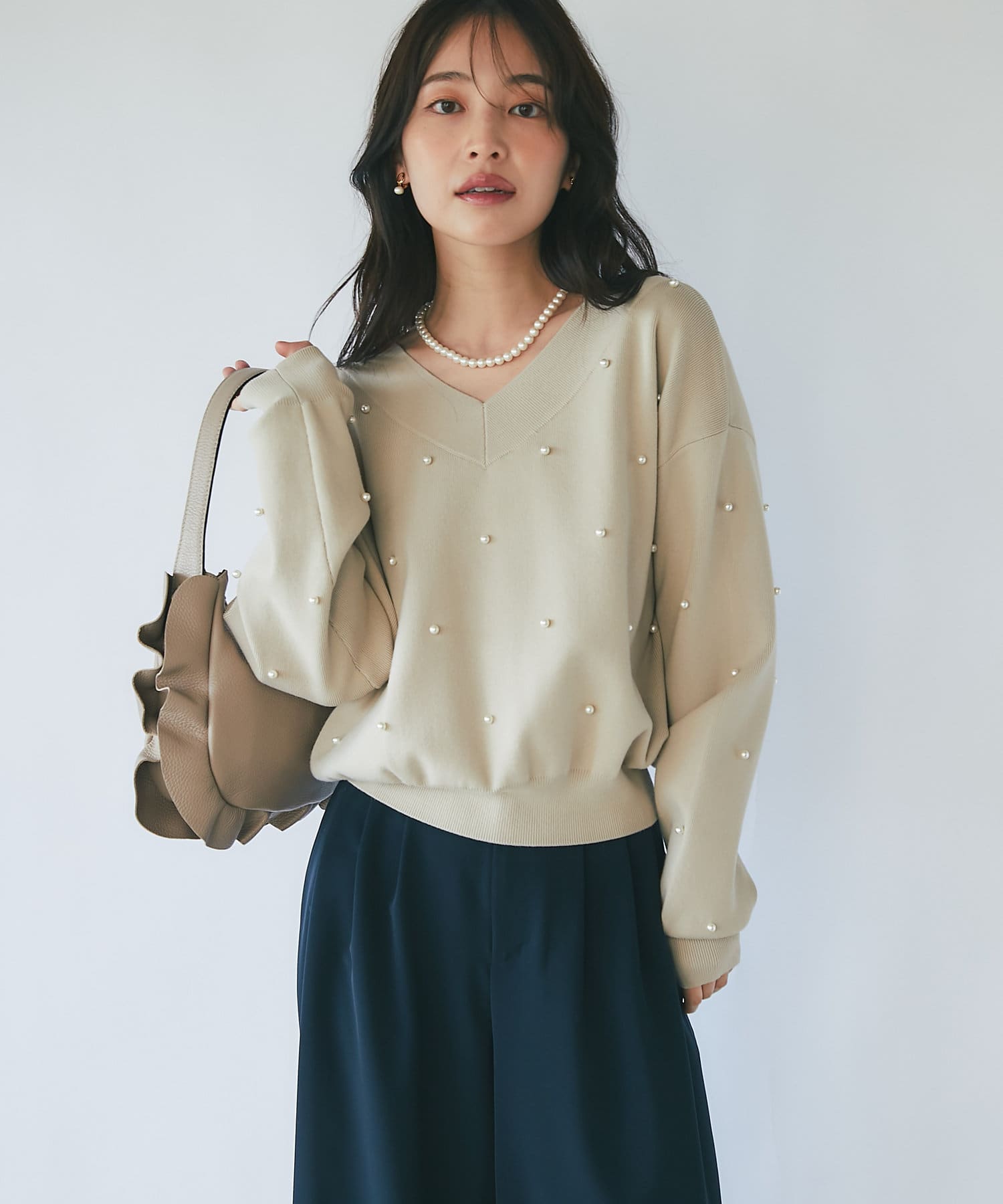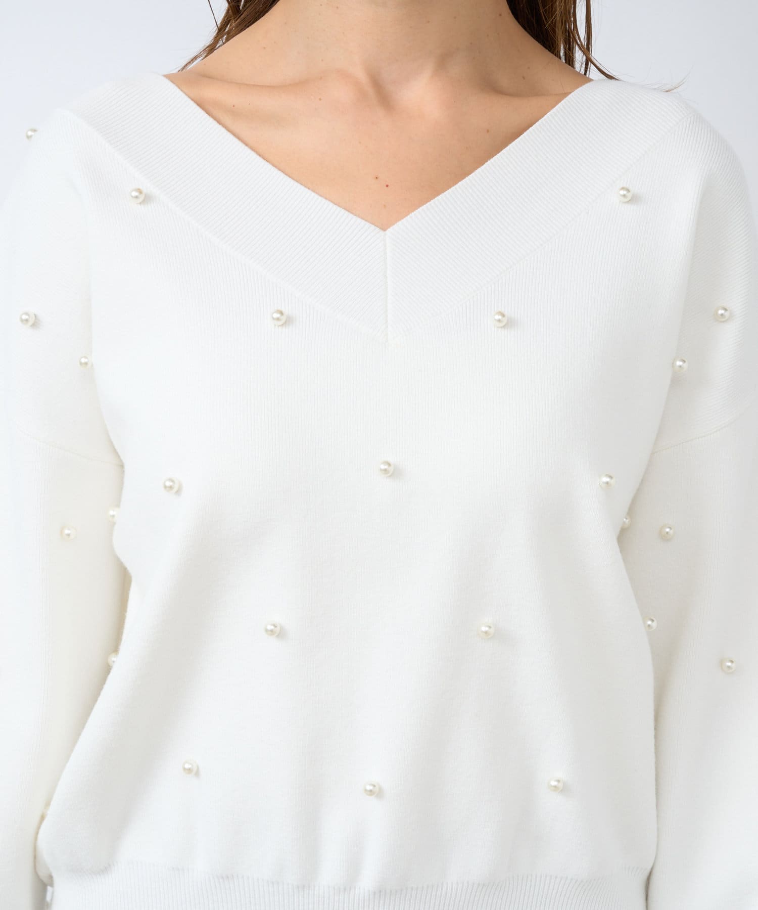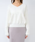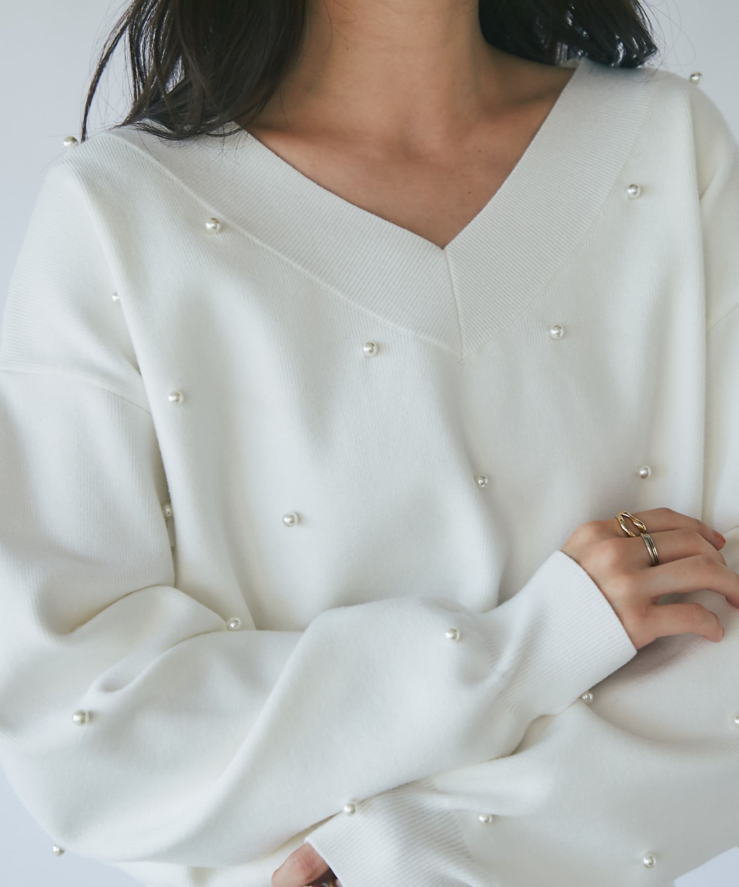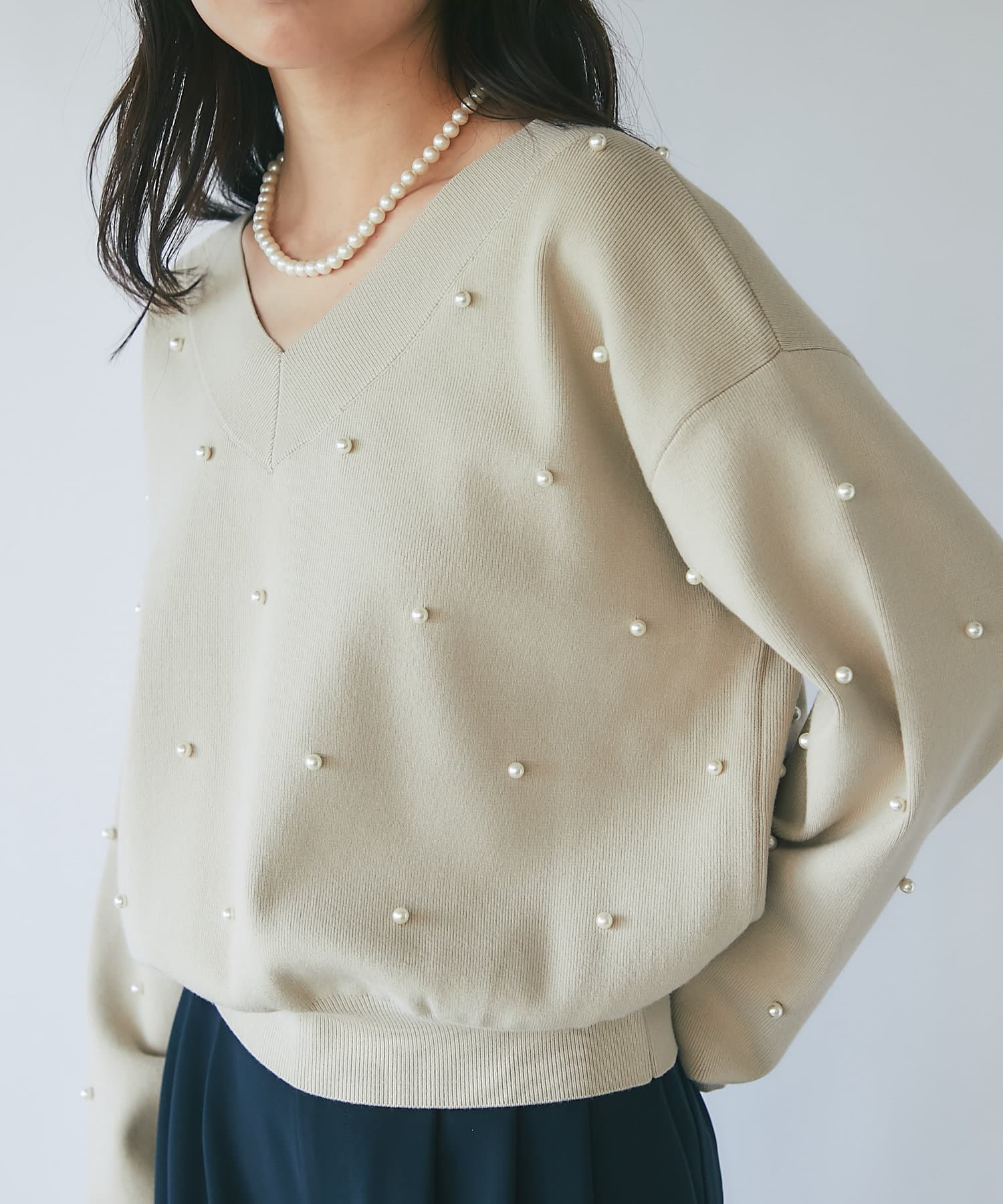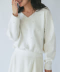 パールがポイントのVネックゆったりニット。