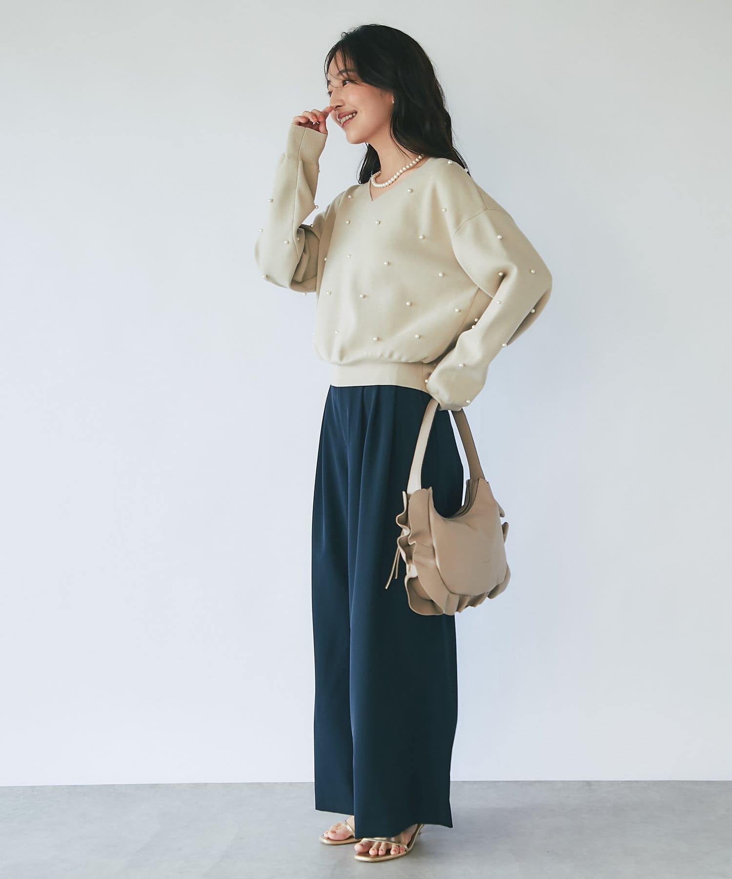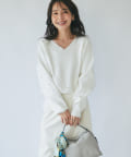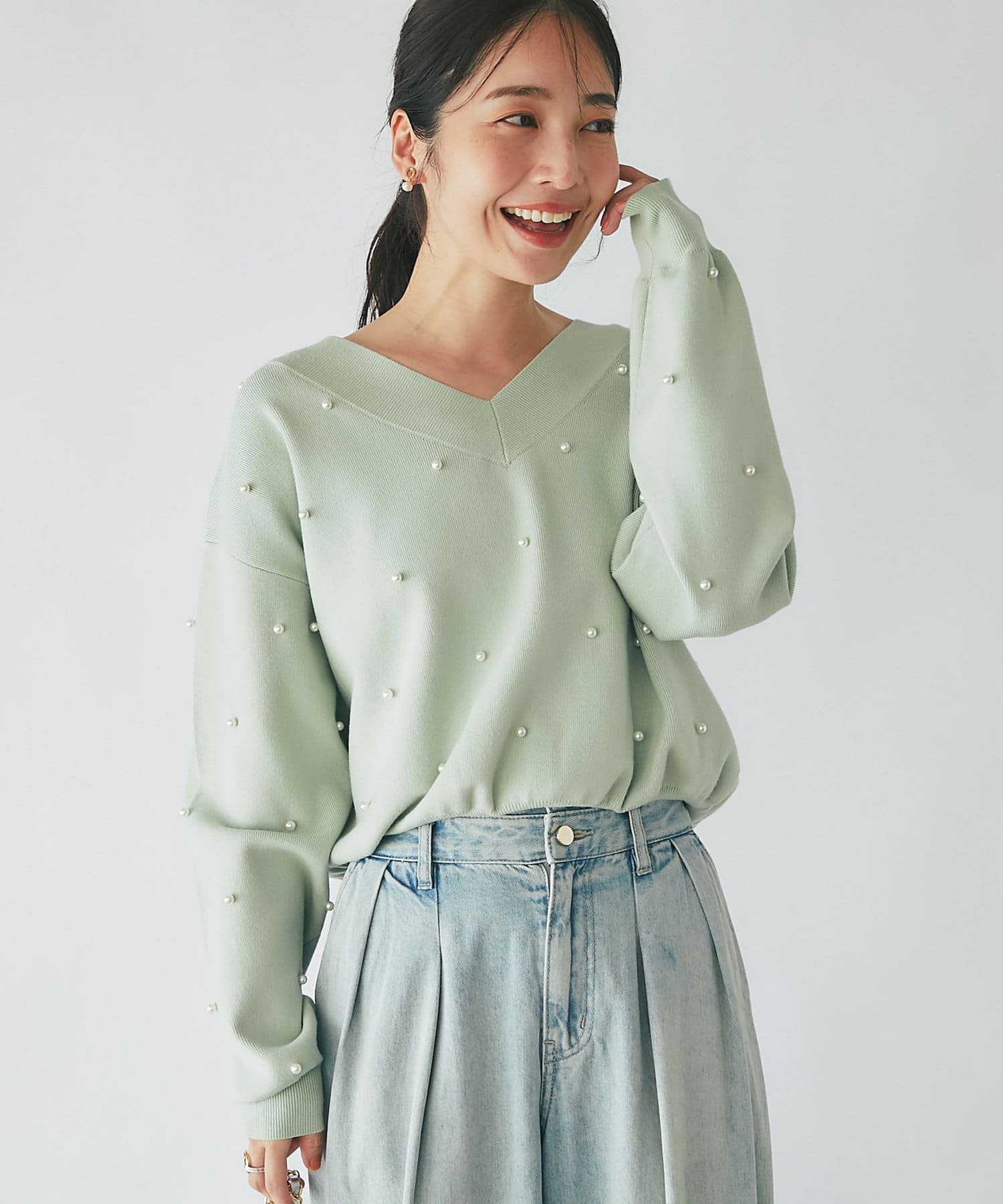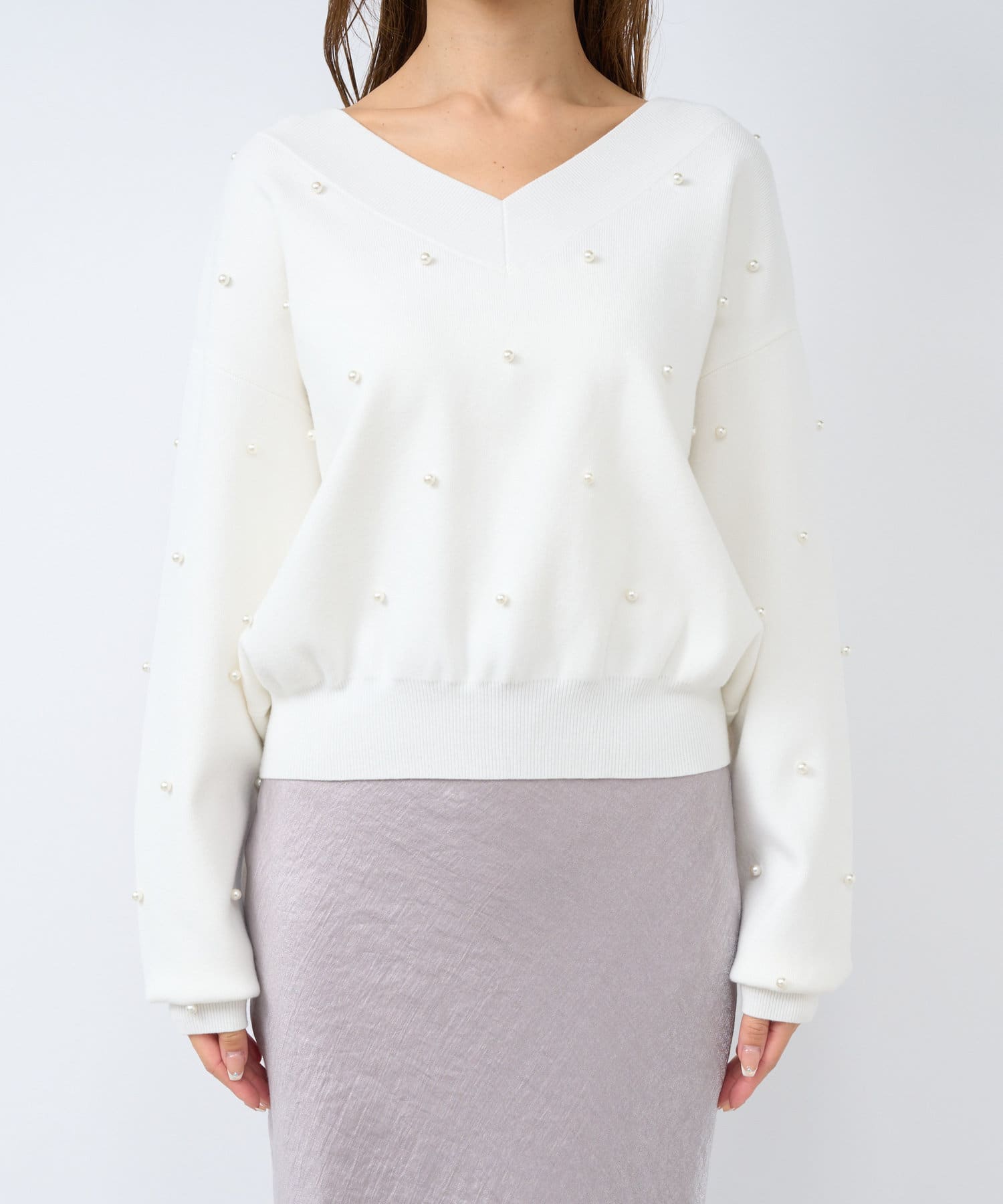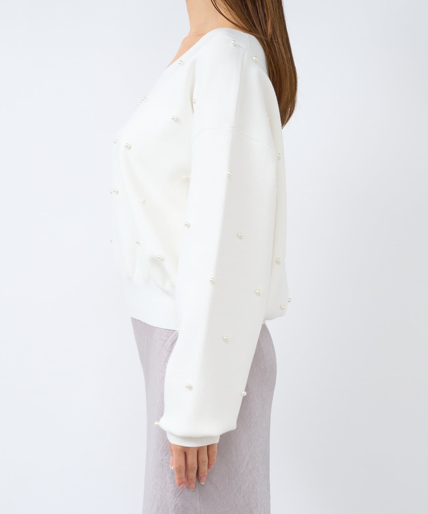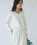 パールがポイントのVネックゆったりニット。