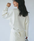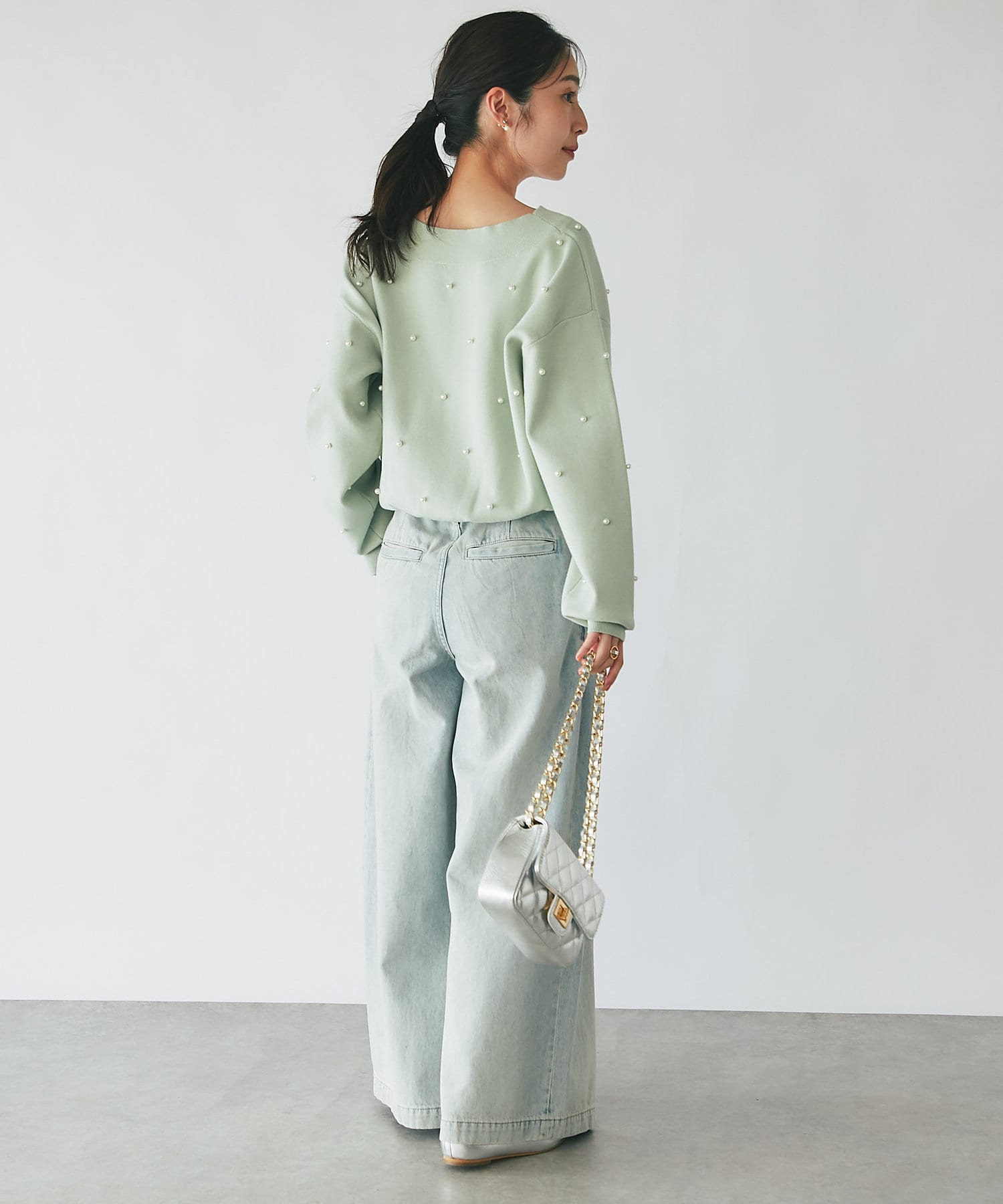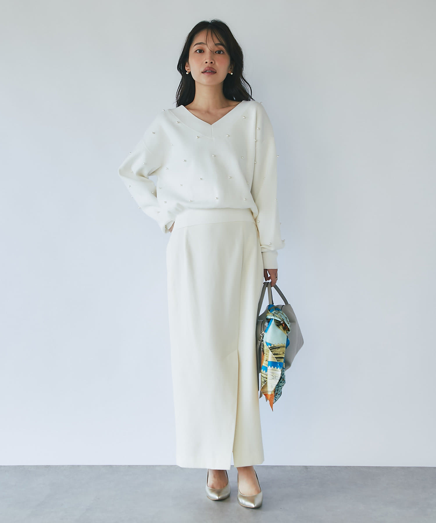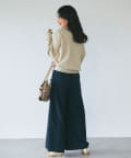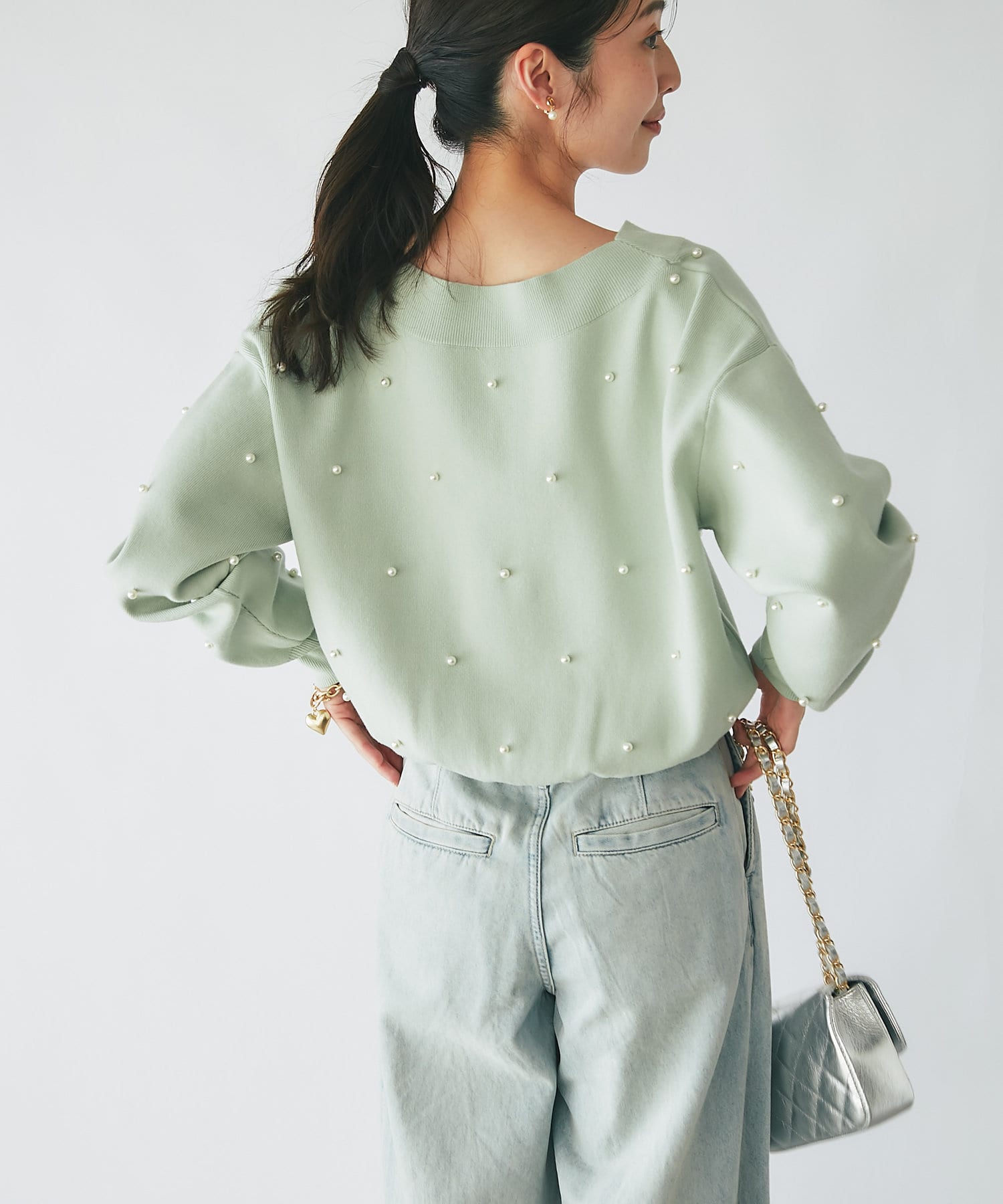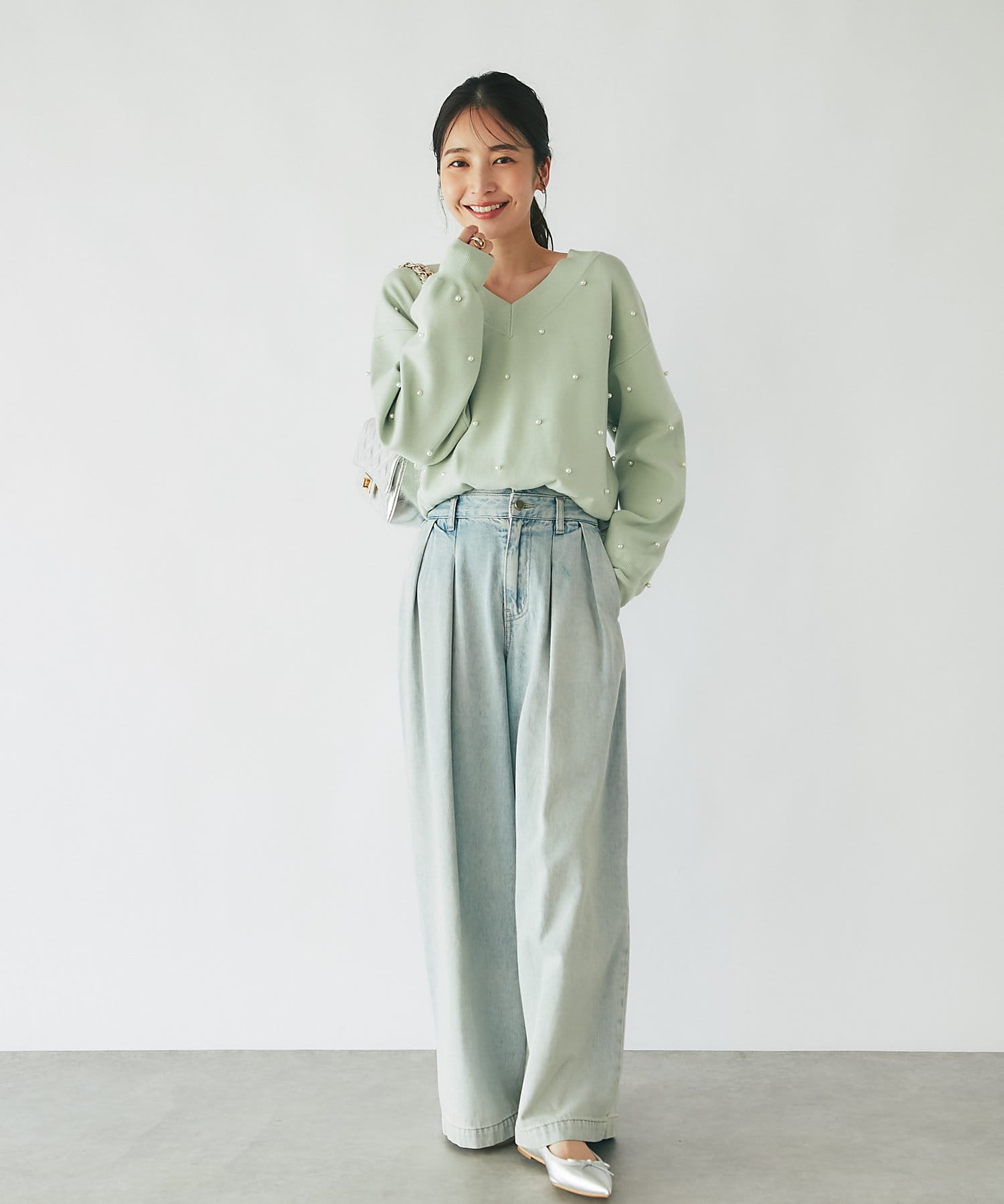 パールがポイントのVネックゆったりニット。