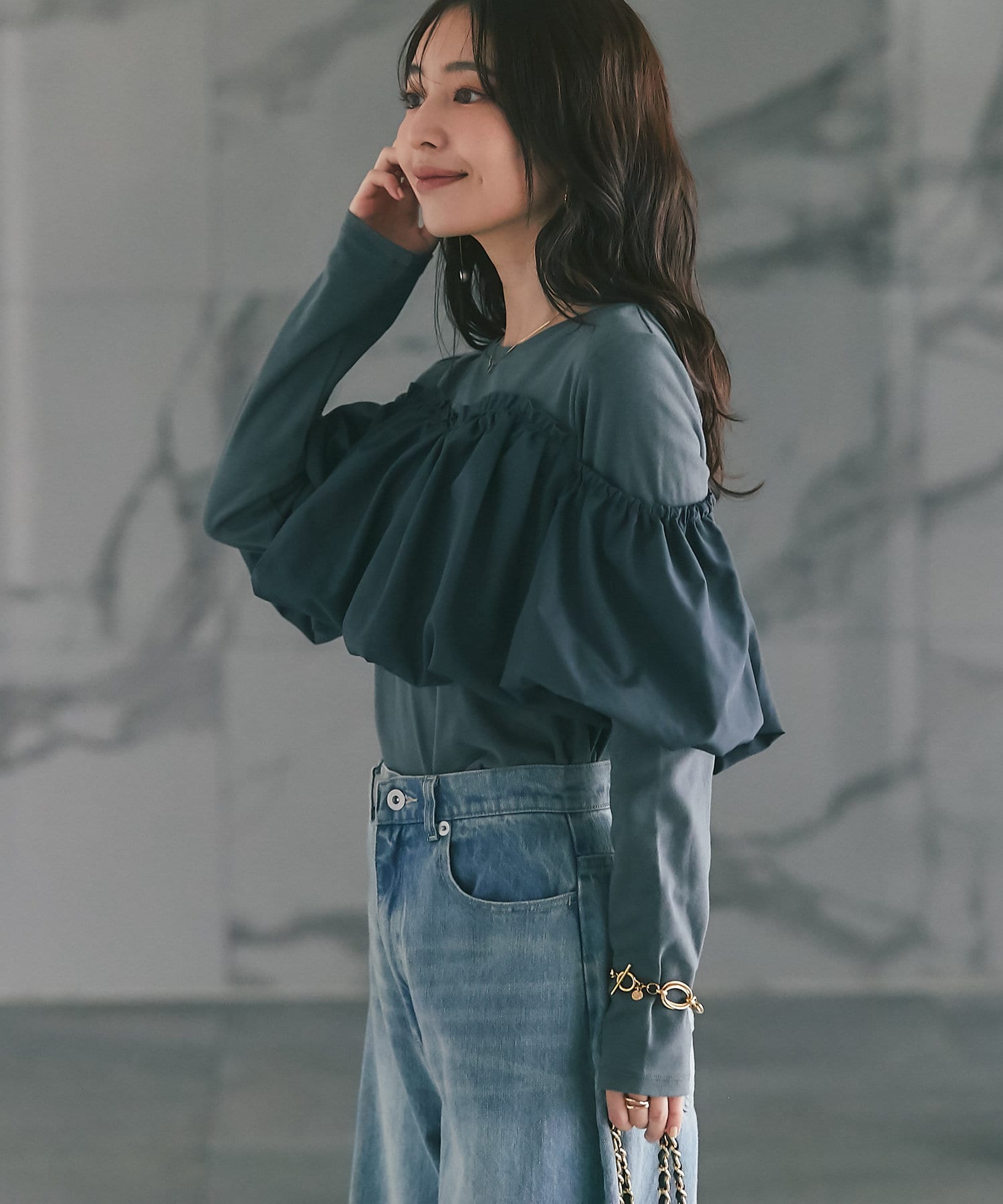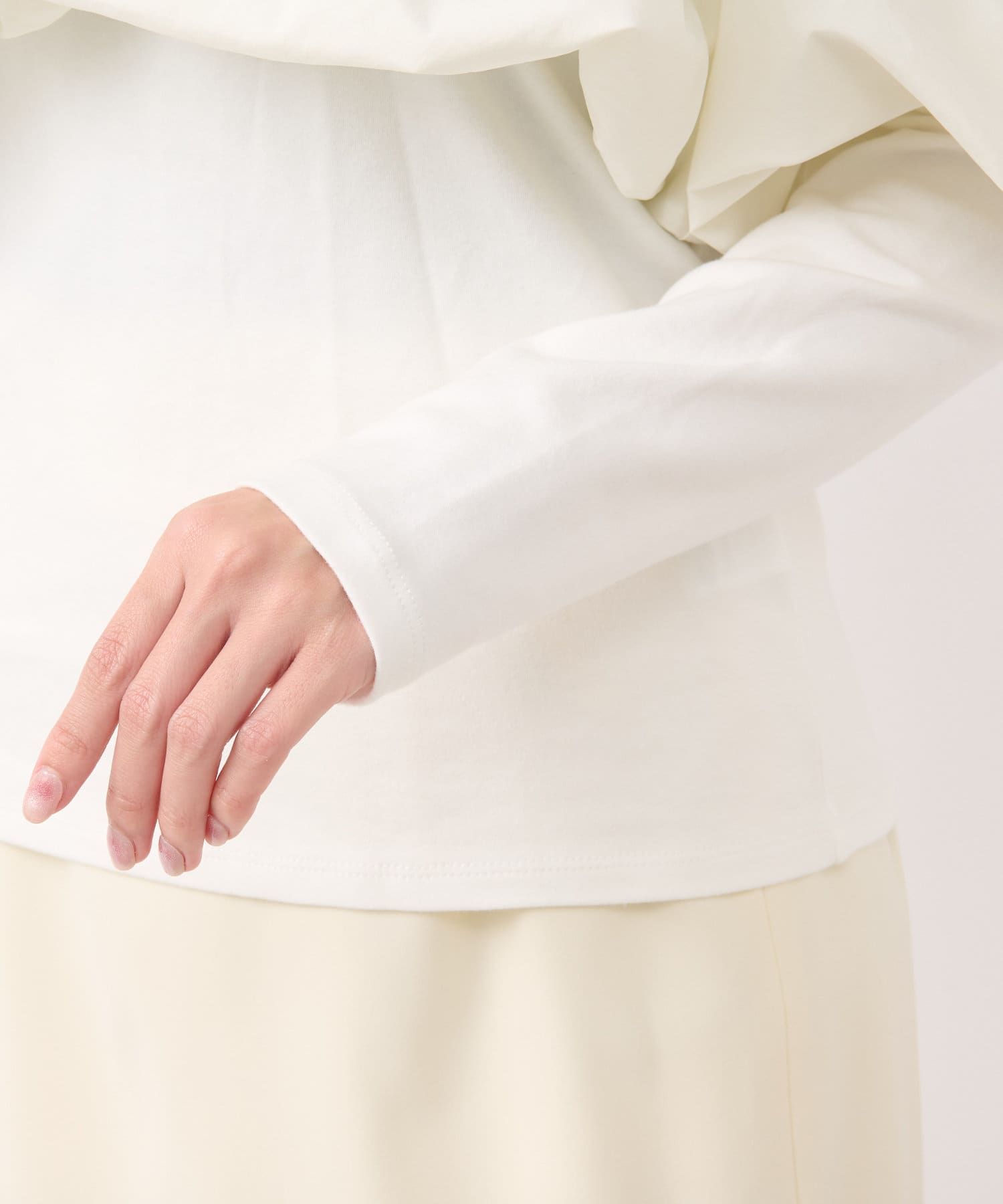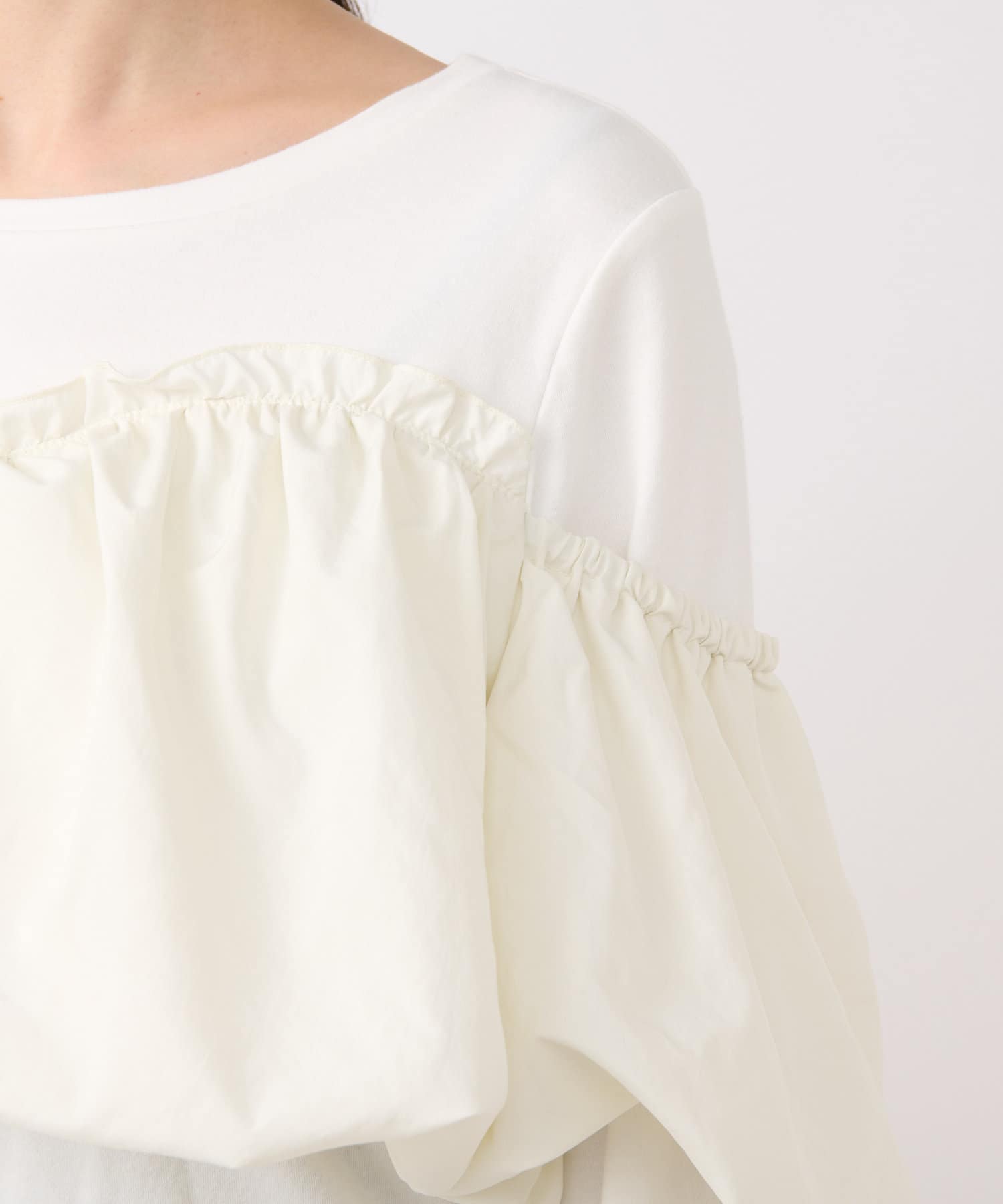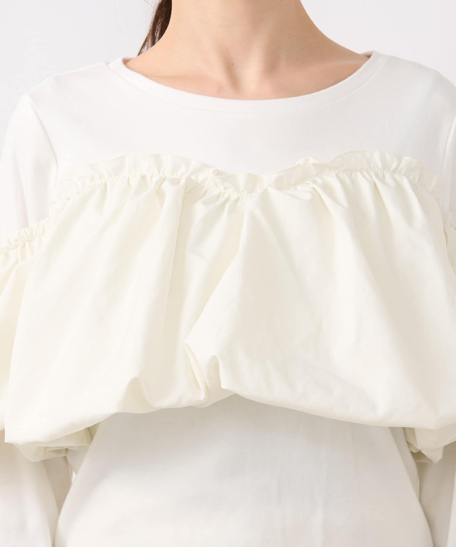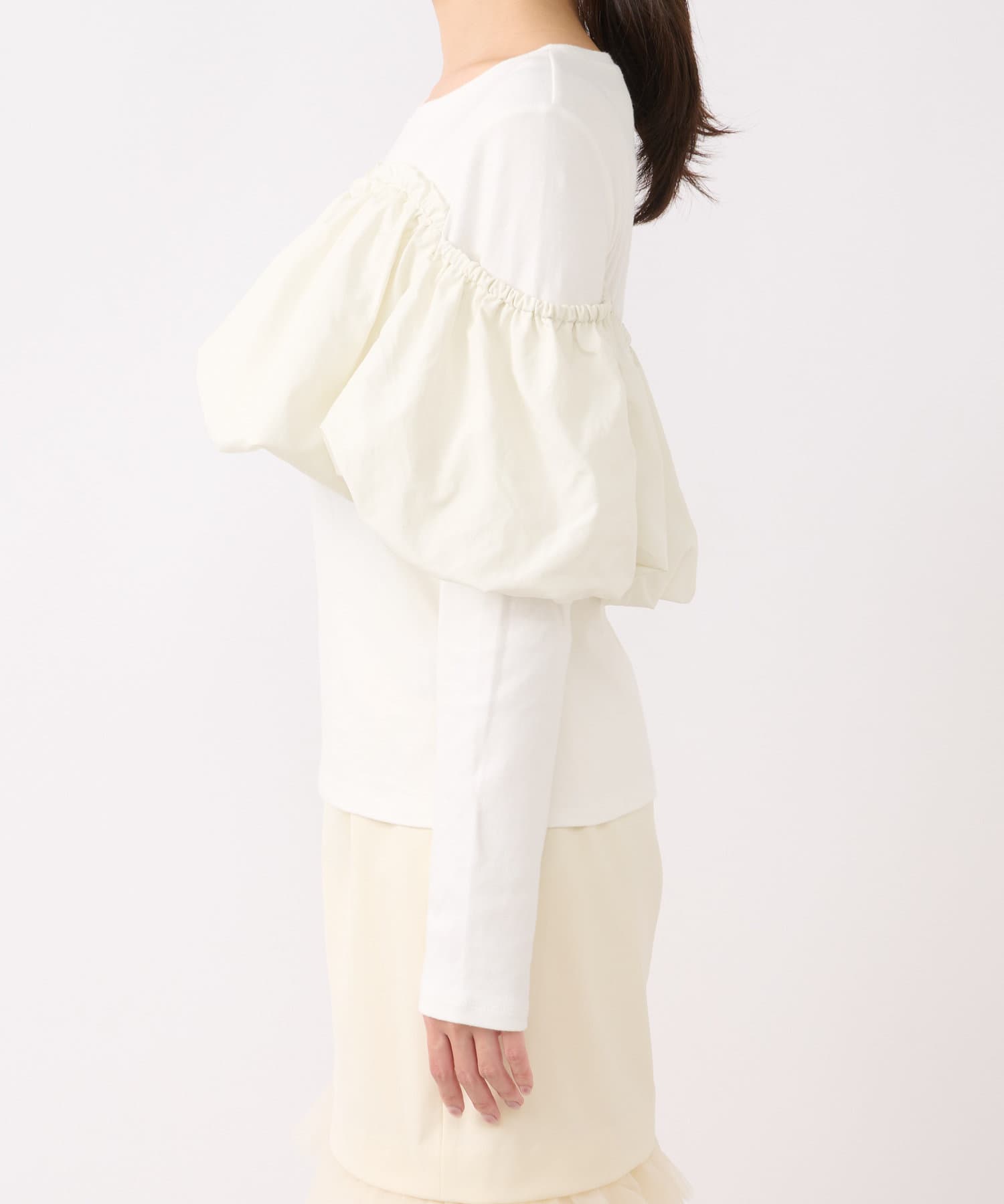 レイヤードしたような布帛ドッキングのバルーンモチーフがモダンなカットソー。