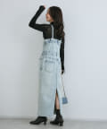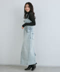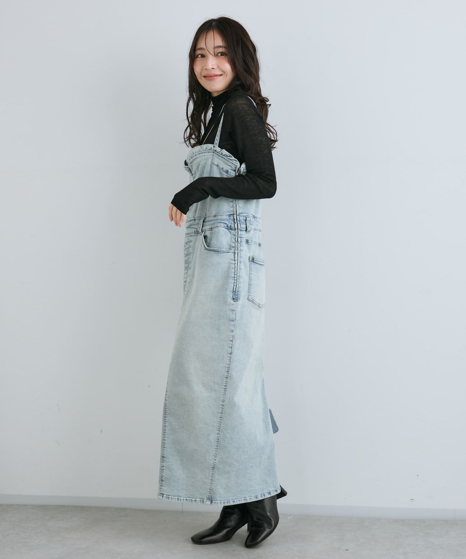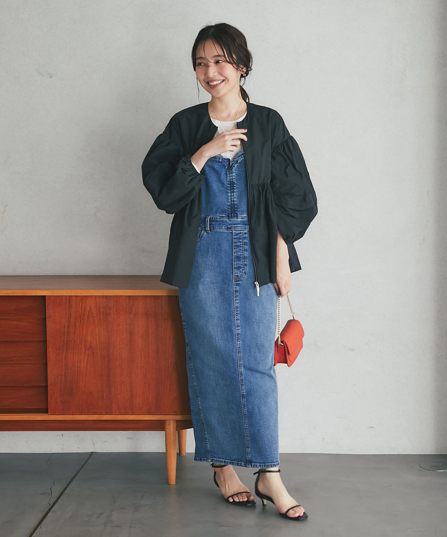 ストレッチの効いたデニムのなで体にフィットしたシルエットでも苦しくなくスタイルアップを叶えてくれます。