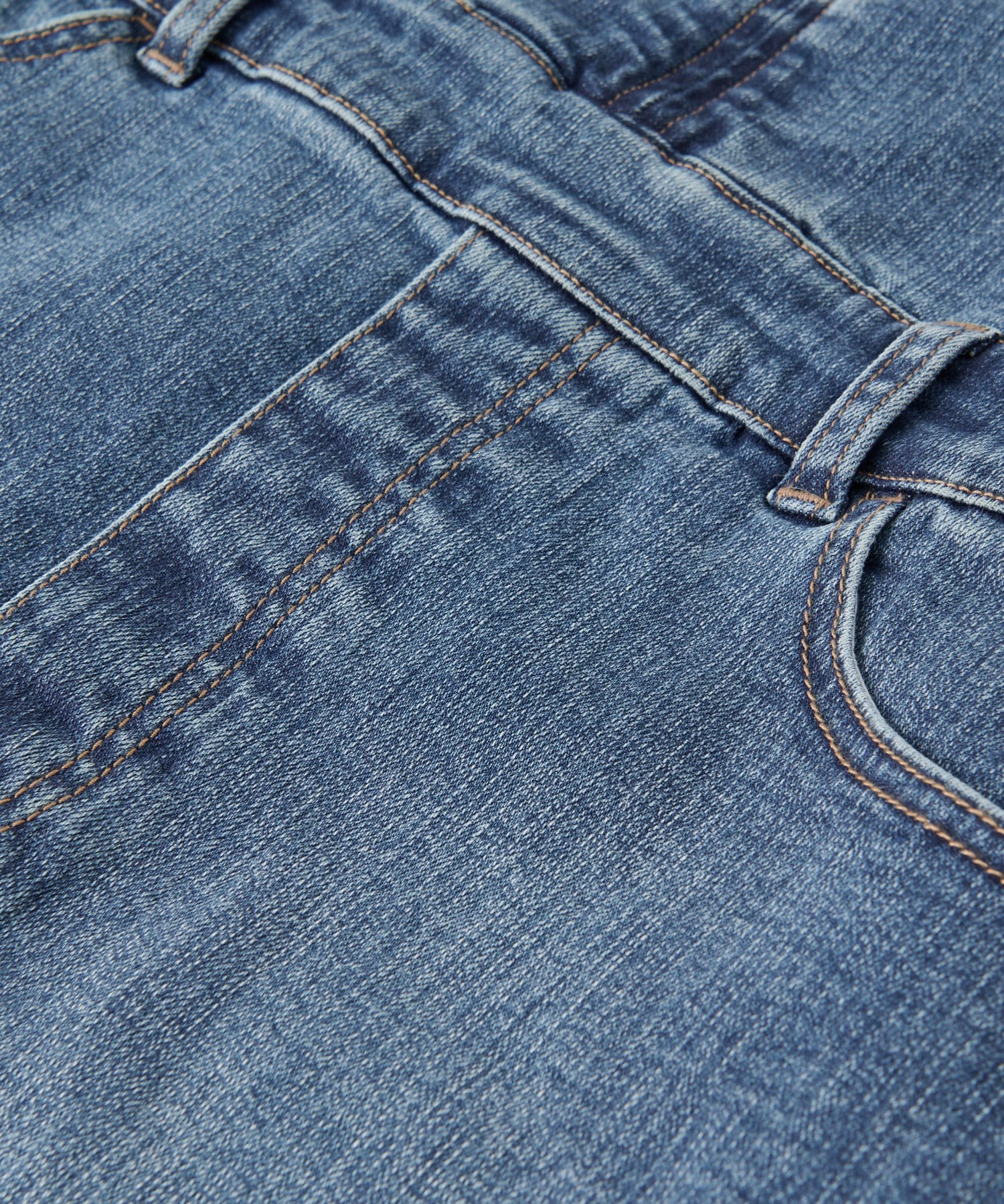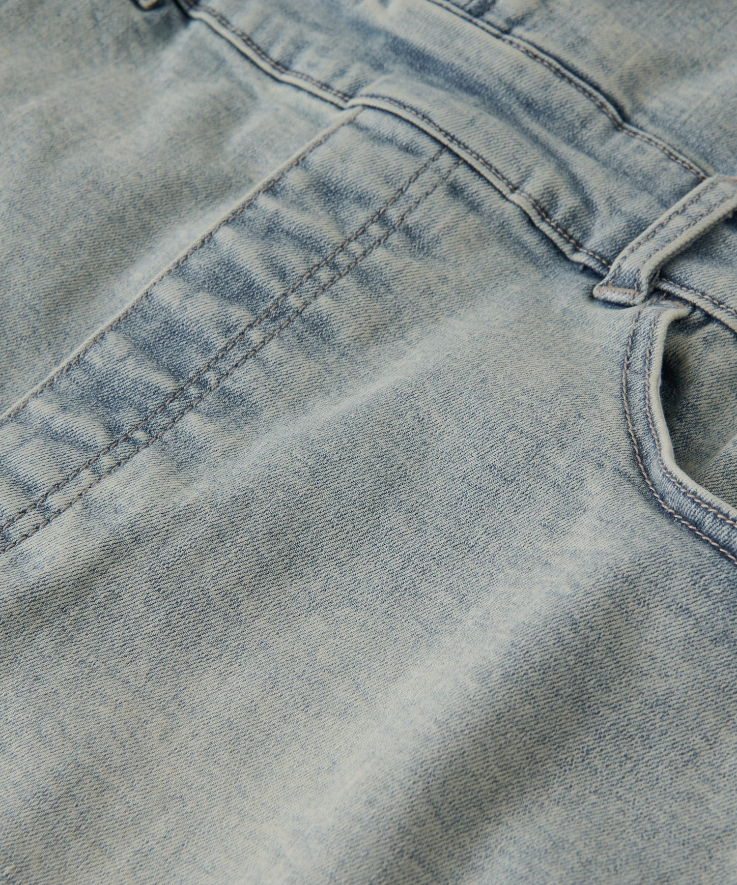 ストレッチデニムに製品加工(ブリーチ+バイオ+オーバーダイ)でヴィンテージ感を出しています。