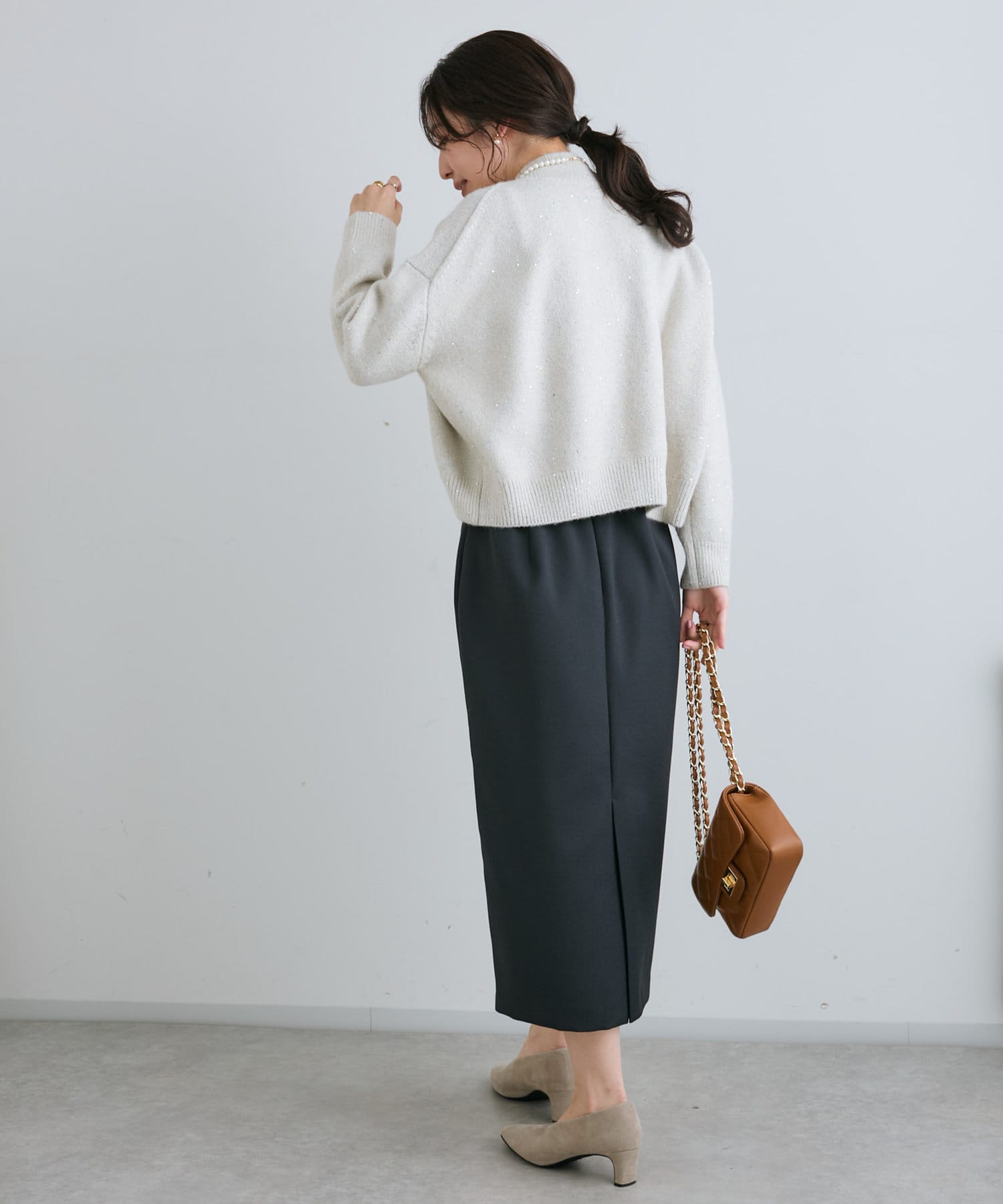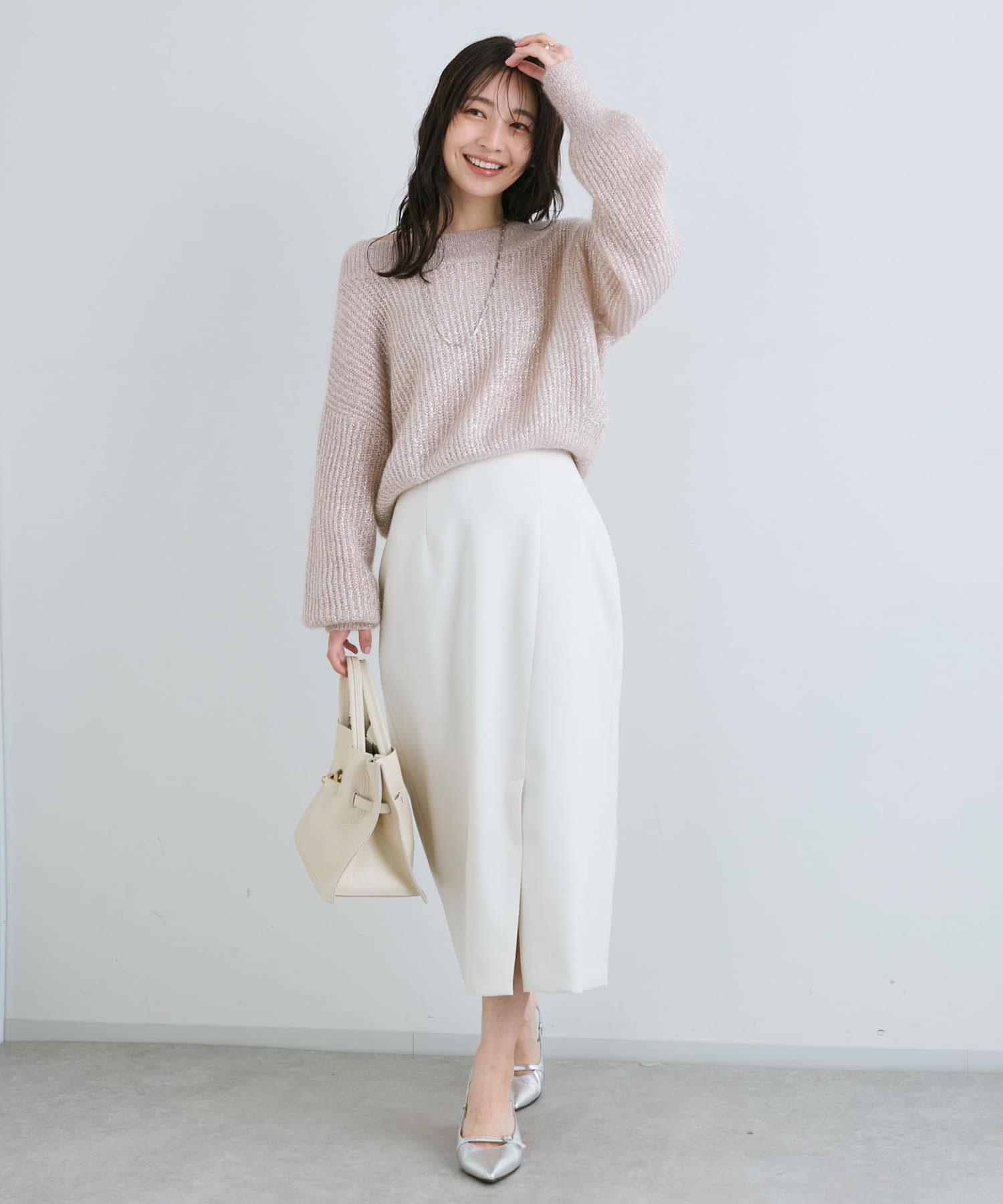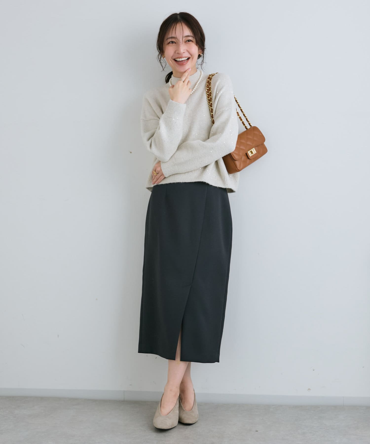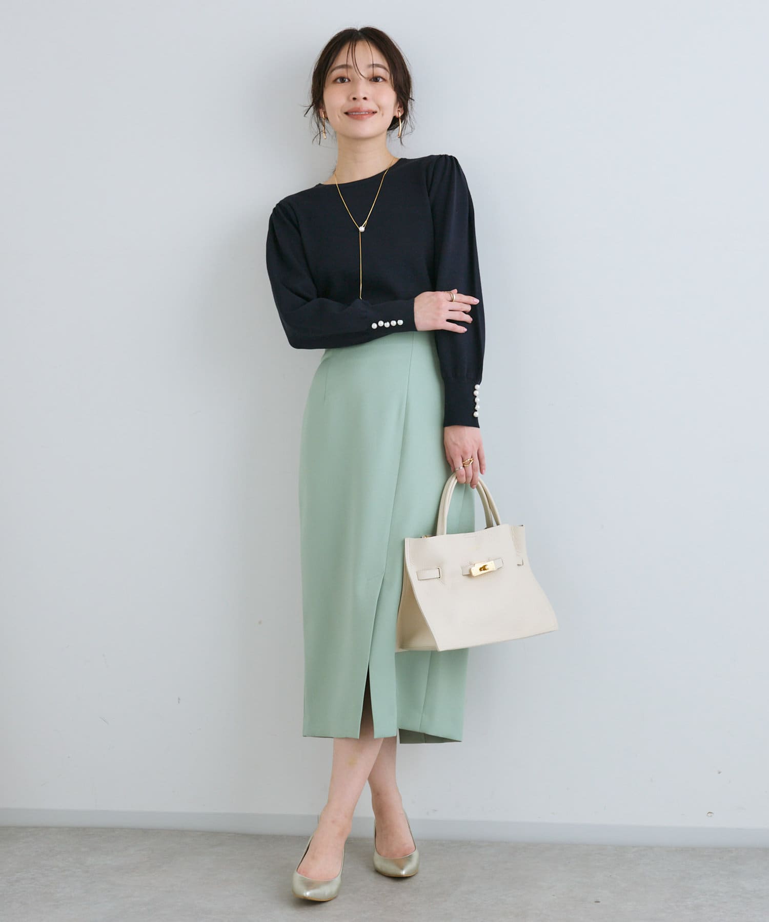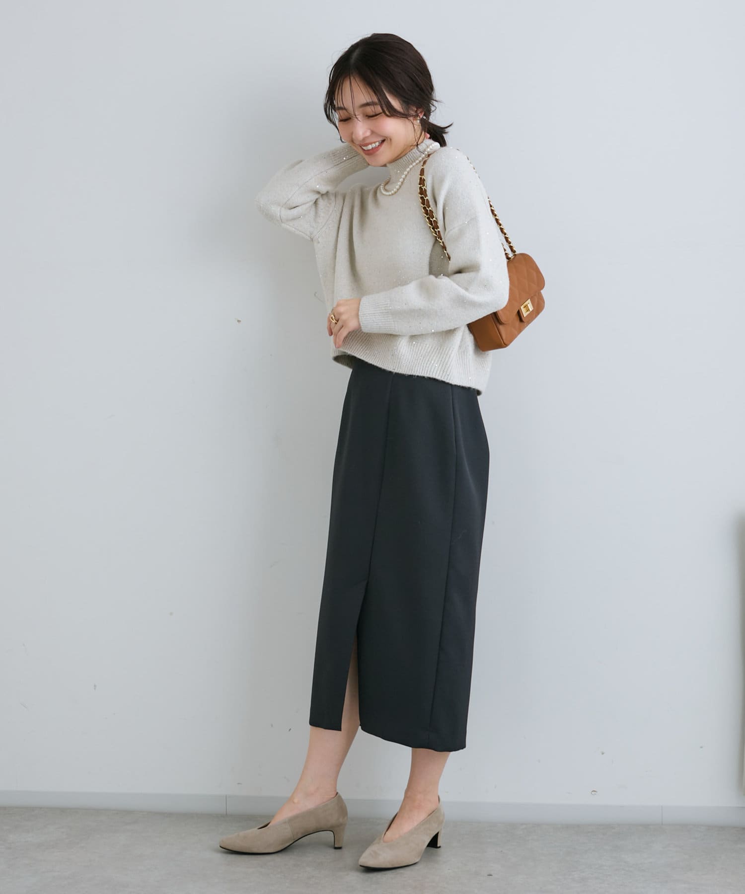 ウールのニット素材との合わせもすっきりとしたスタイリングに仕上げてくれます。