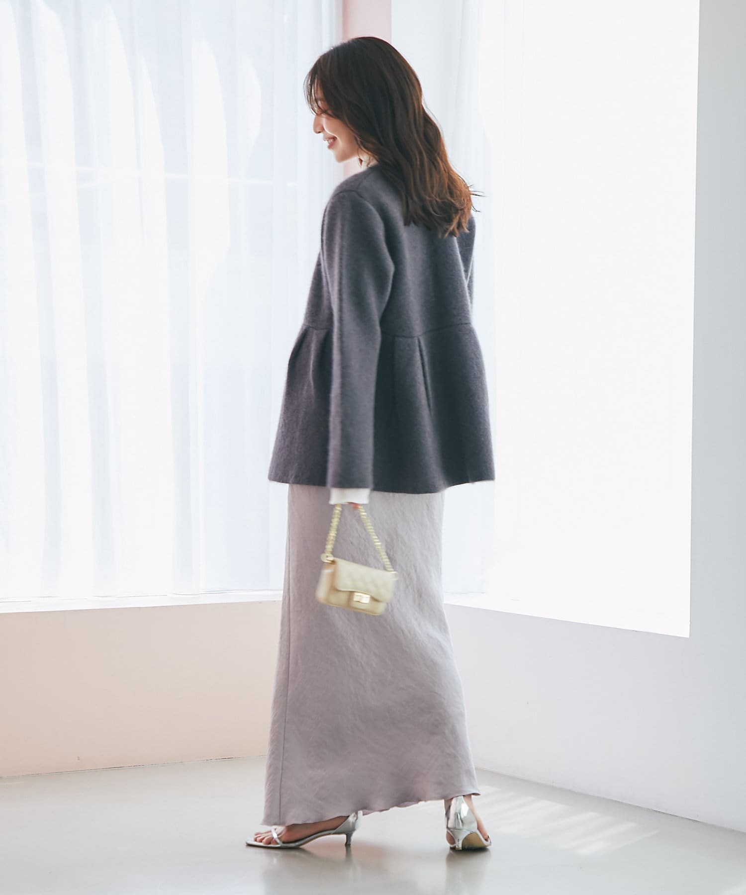 高級感溢れる生地感と、トレンドのペプラムのデザインが存在感のあるジャケット。