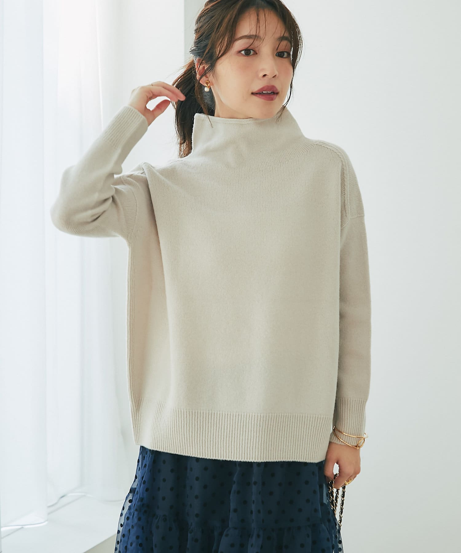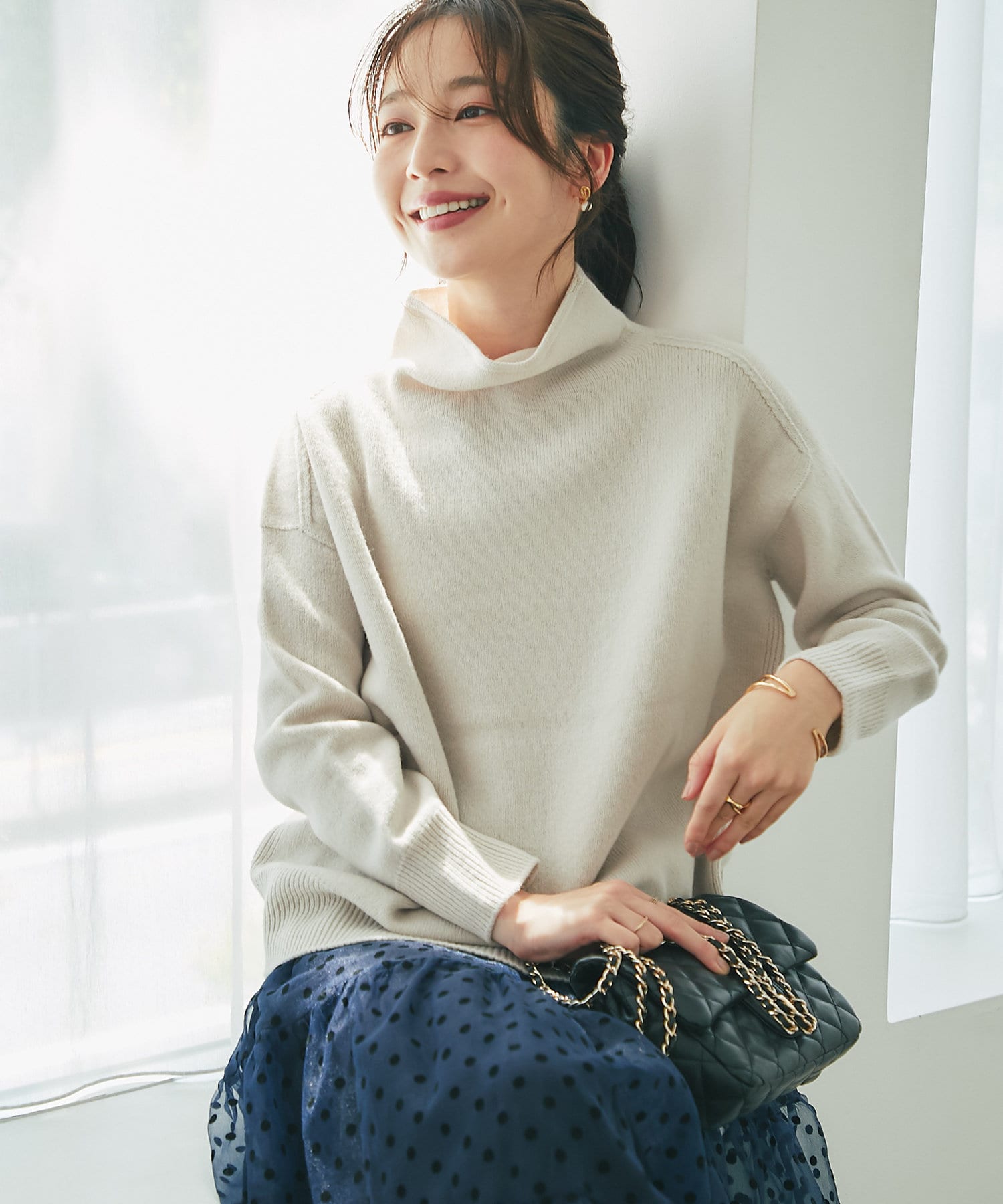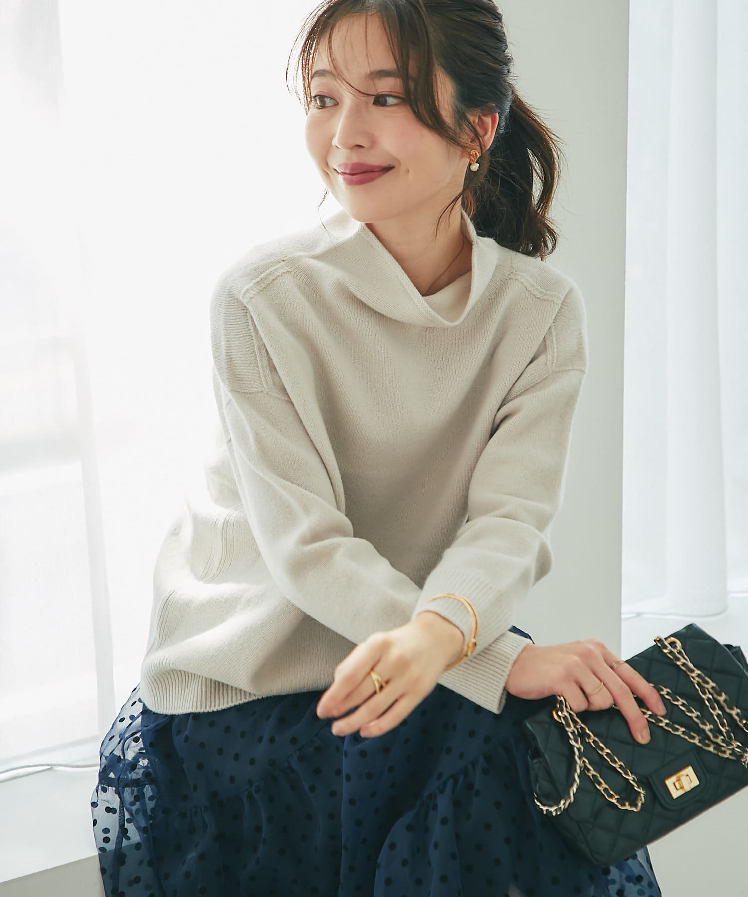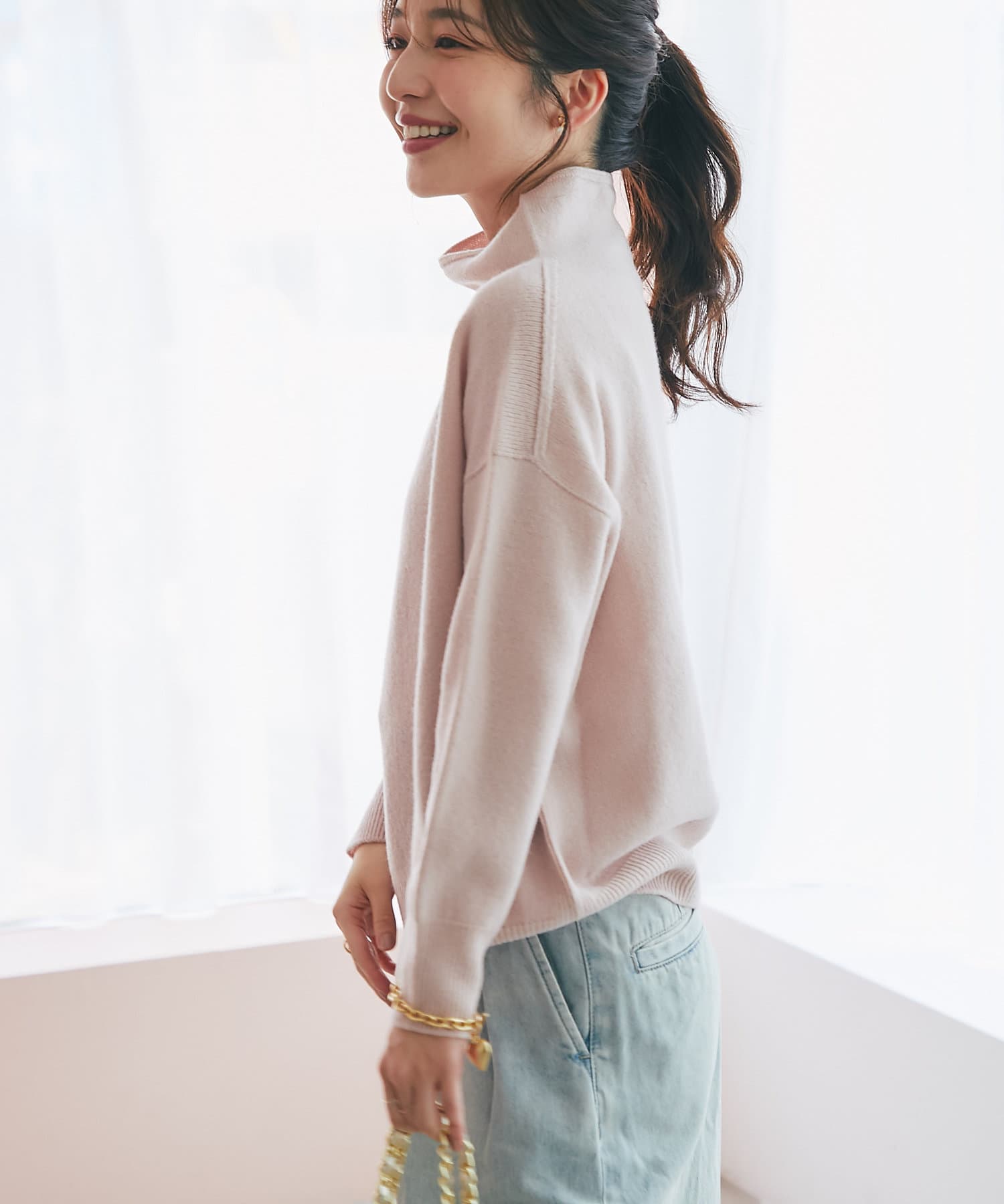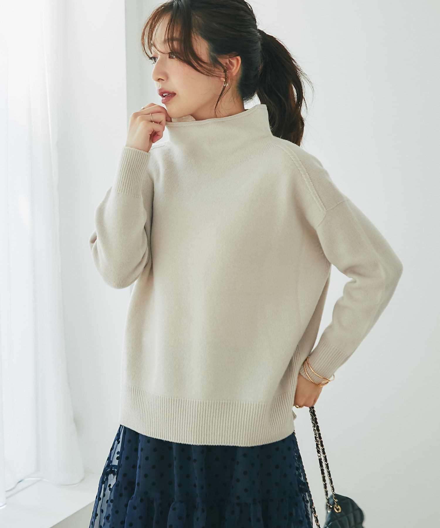 程よい開きのボトルネックが上品でメイクが擦れにくいニット