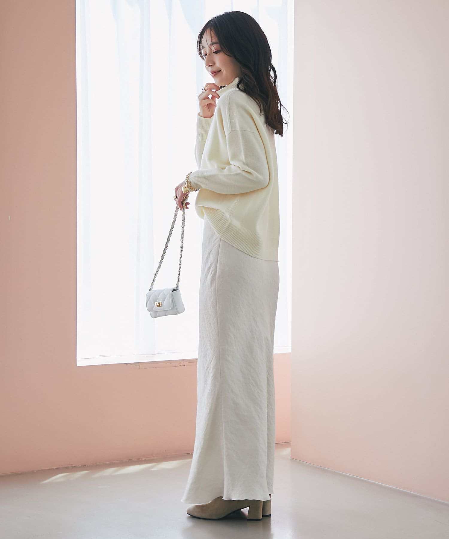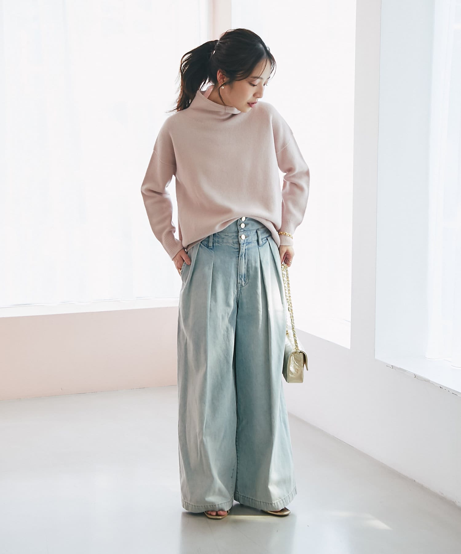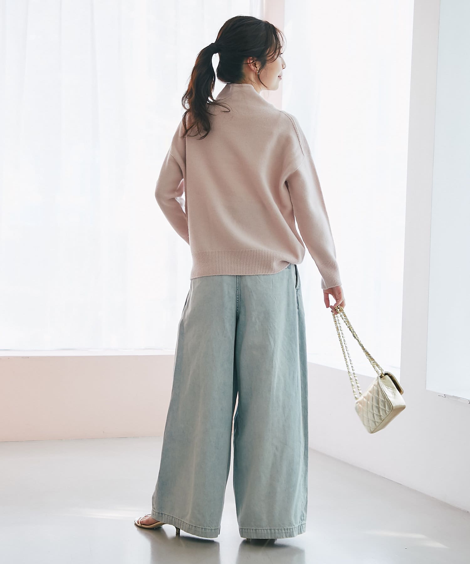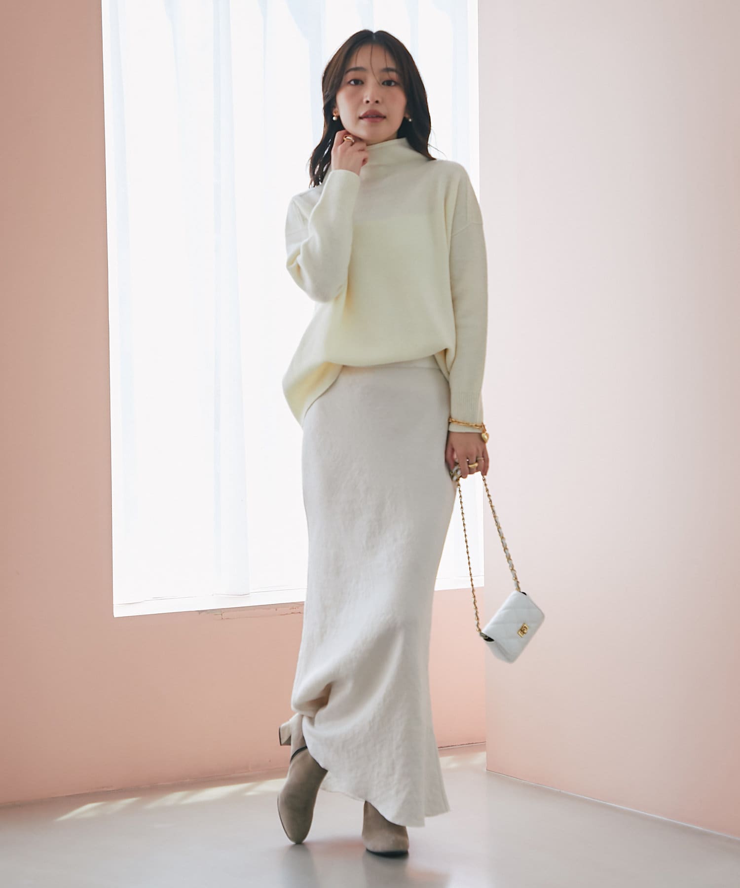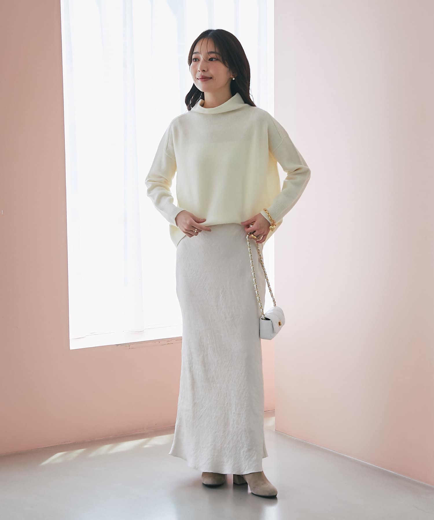 程よい開きのボトルネックが上品でメイクが擦れにくいニット