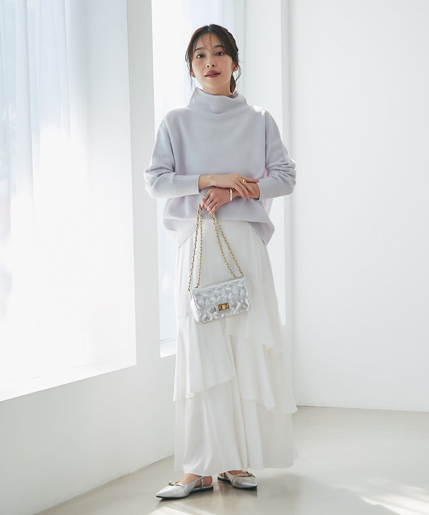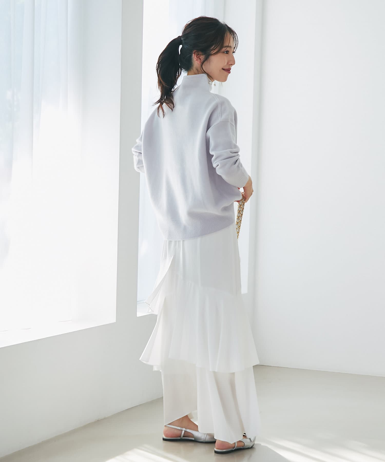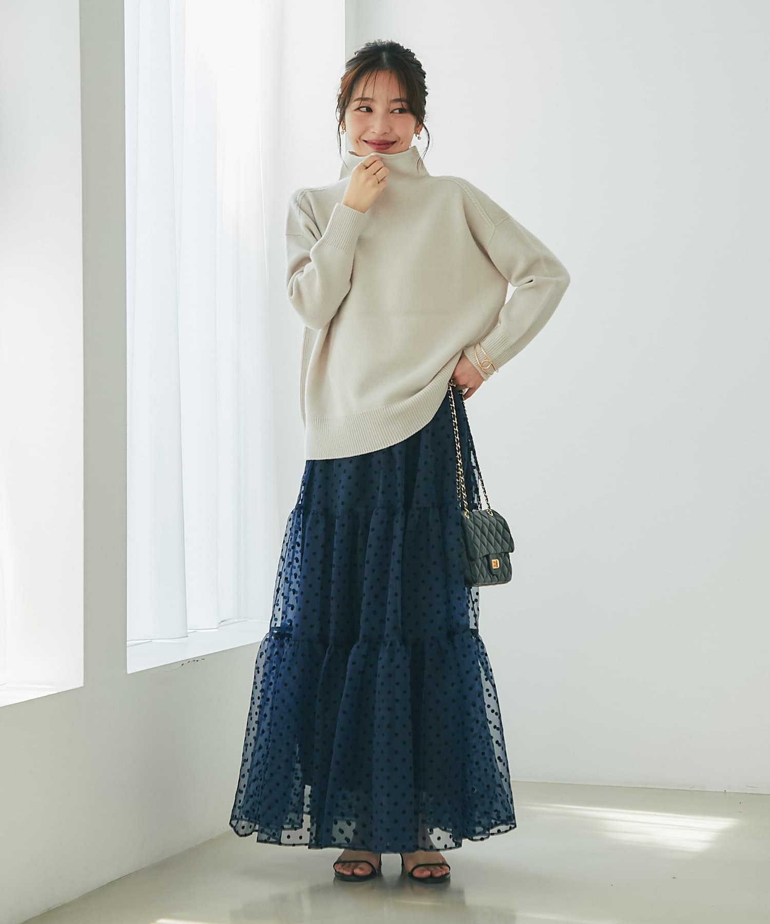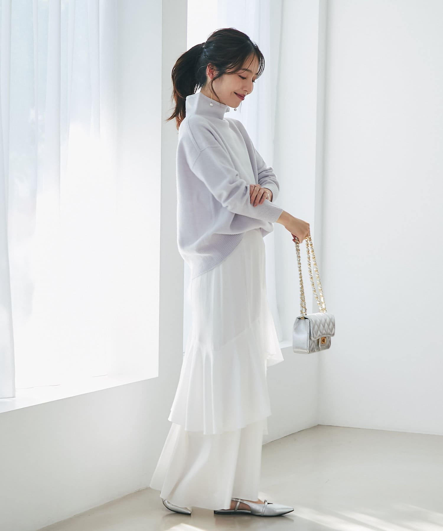 トレンドのチュールスカートなどボリューム感のあるボトムはもちろん、ナロースカートなどすっきりとしたシルエットのボトムとも好相性。