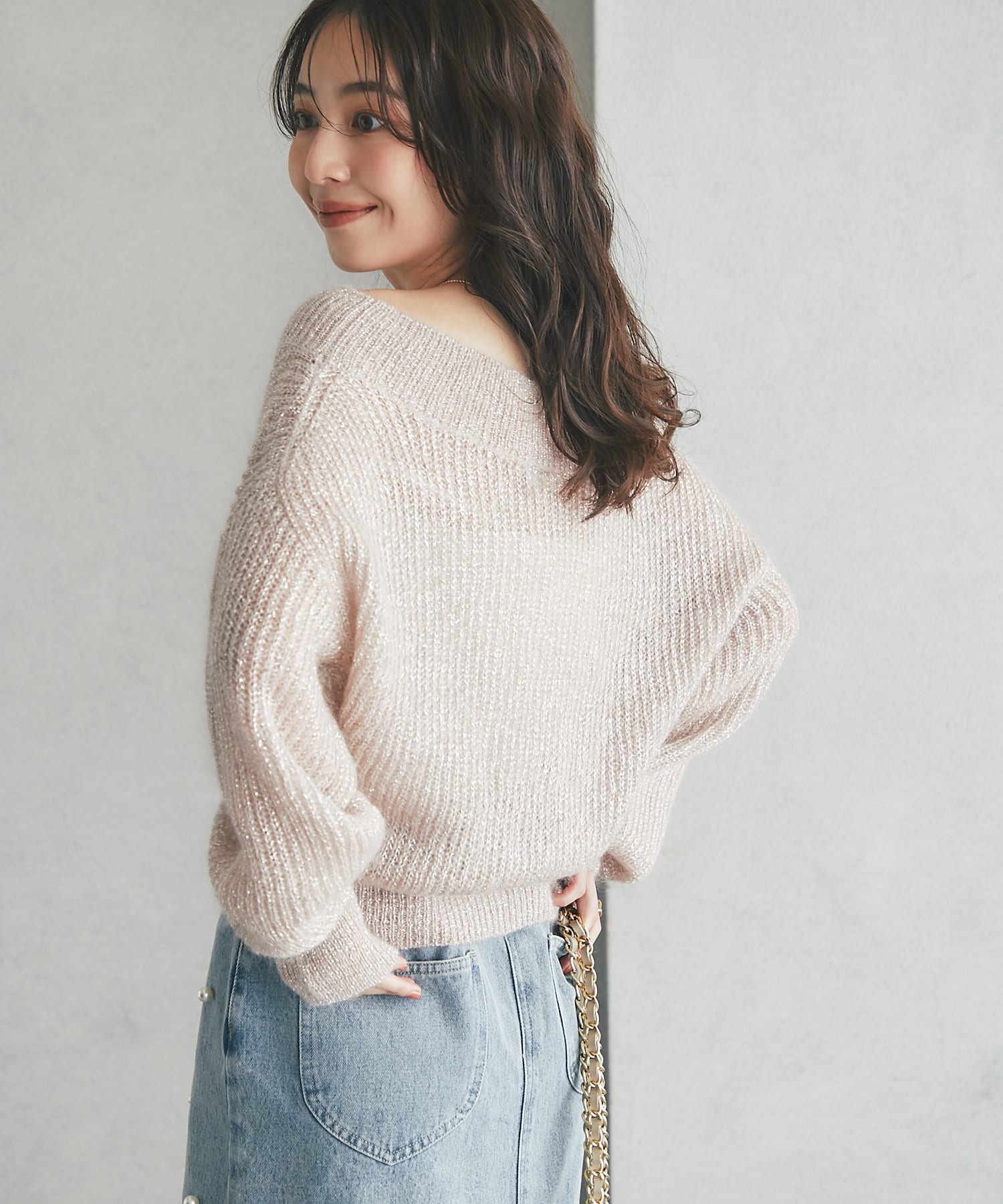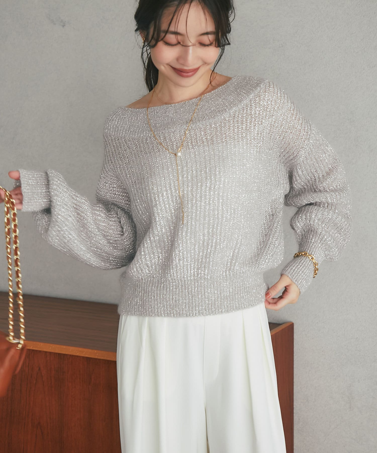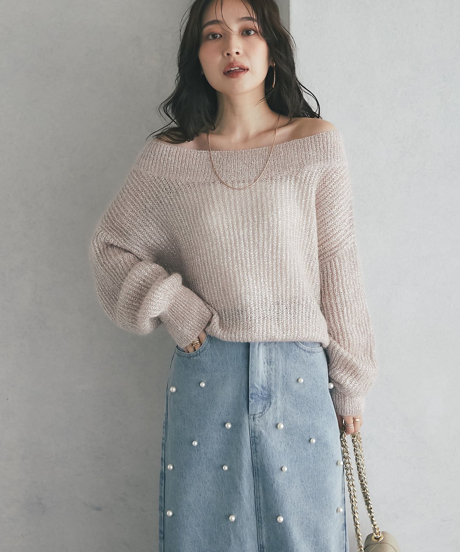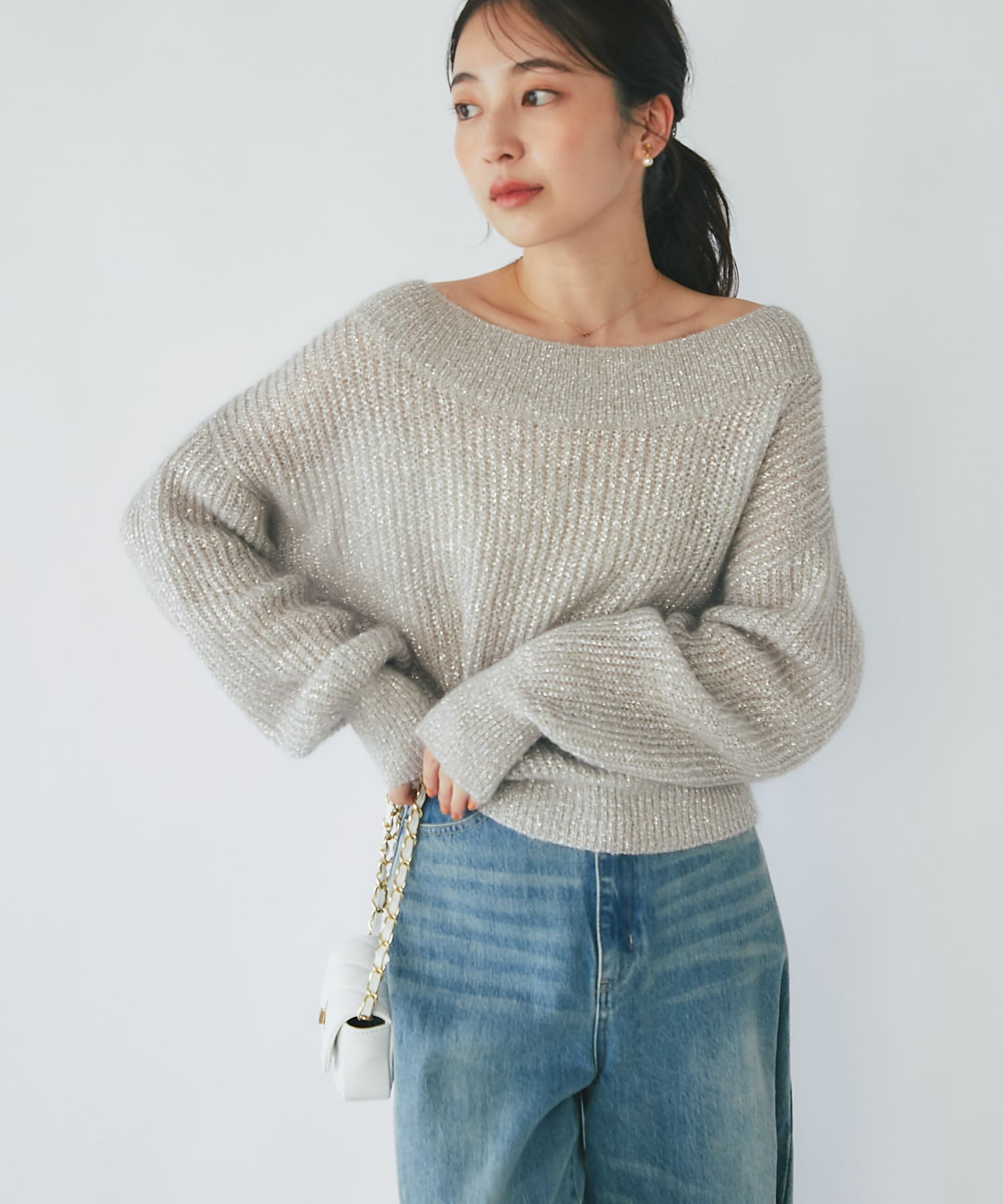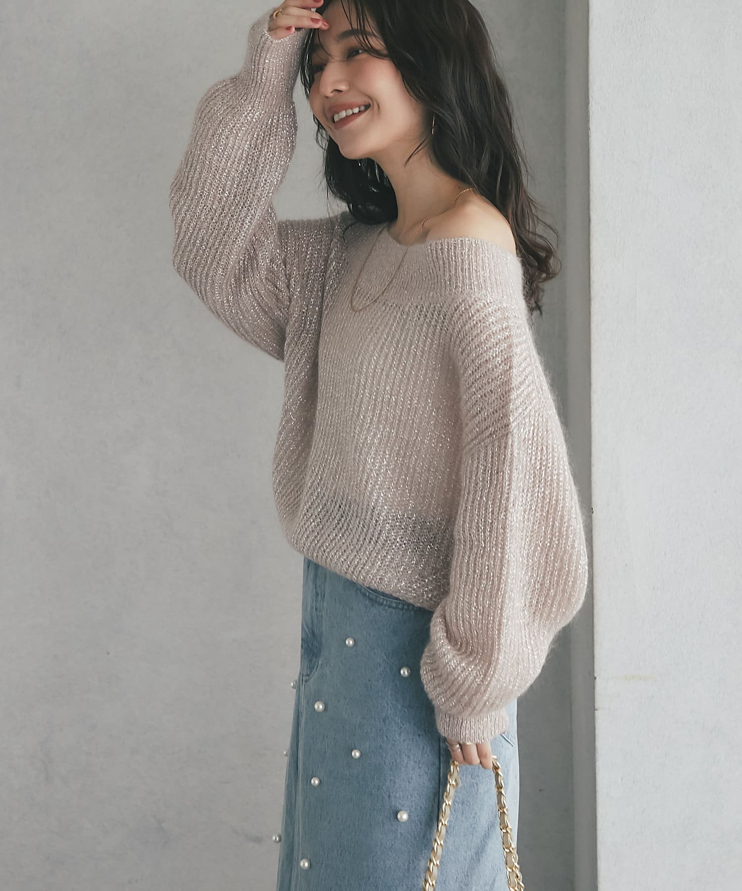 上品ラメとオフショルで女子力UPが叶うモヘアニット
