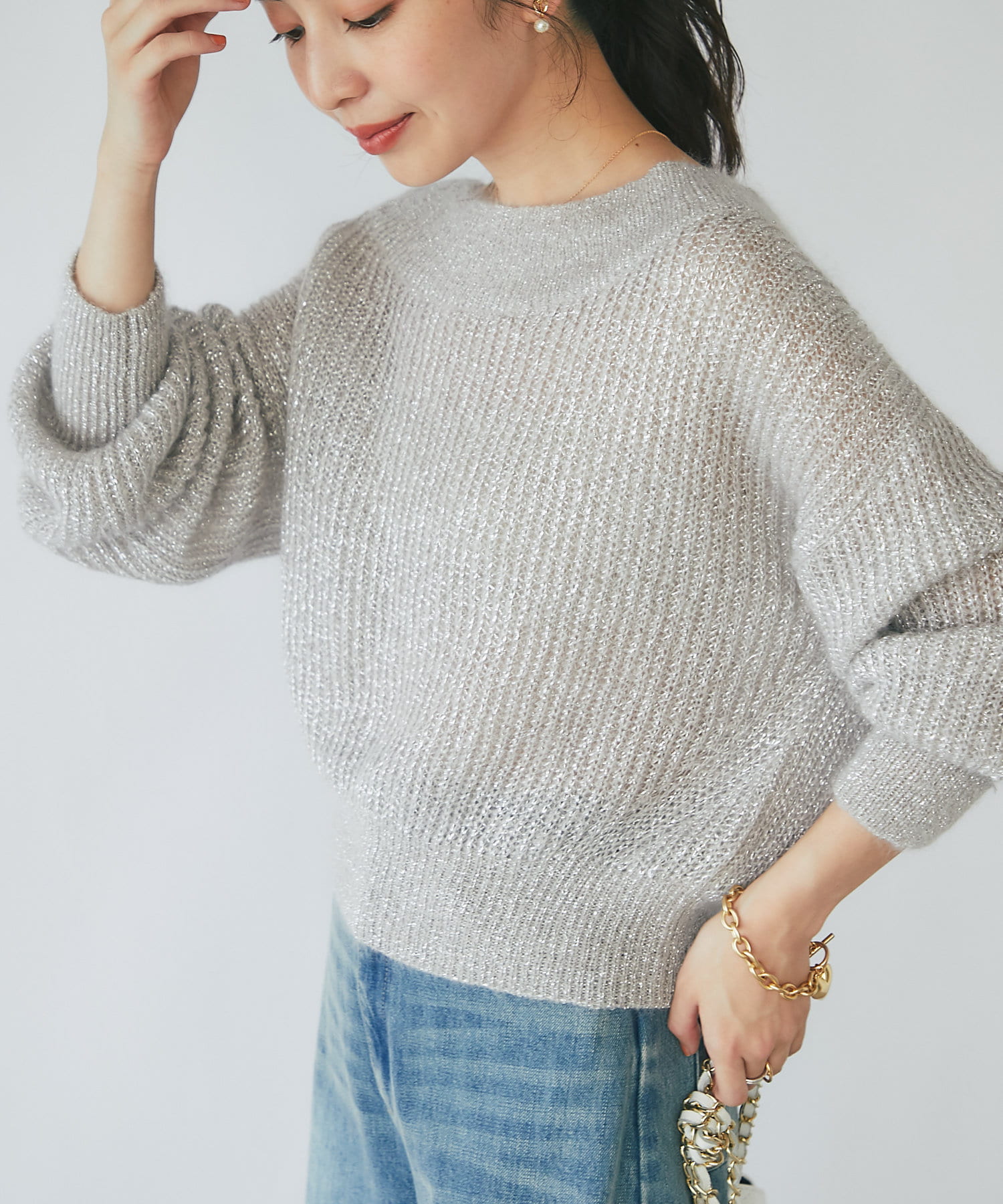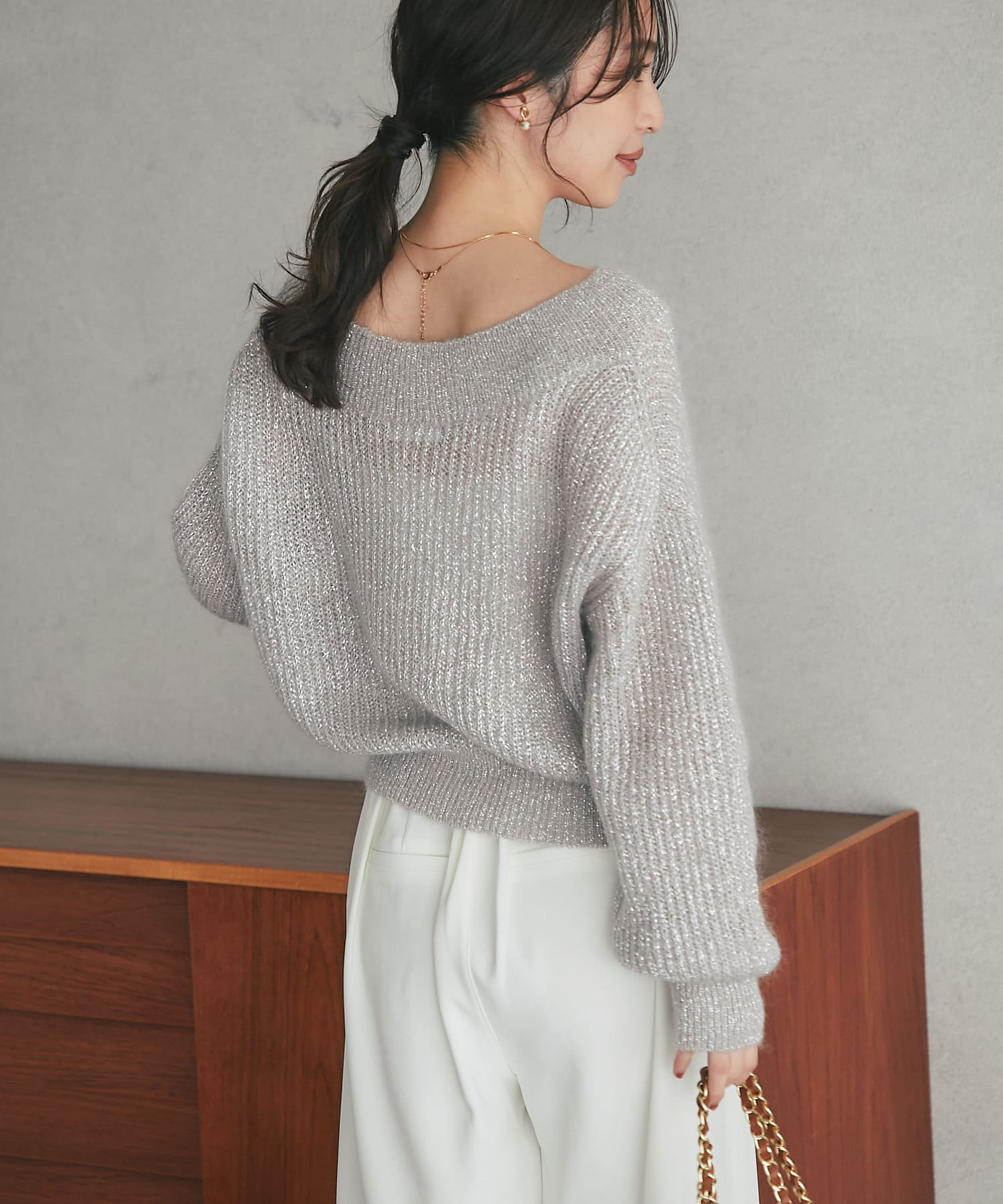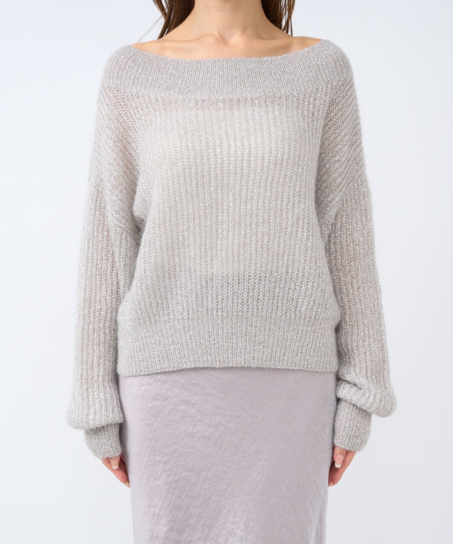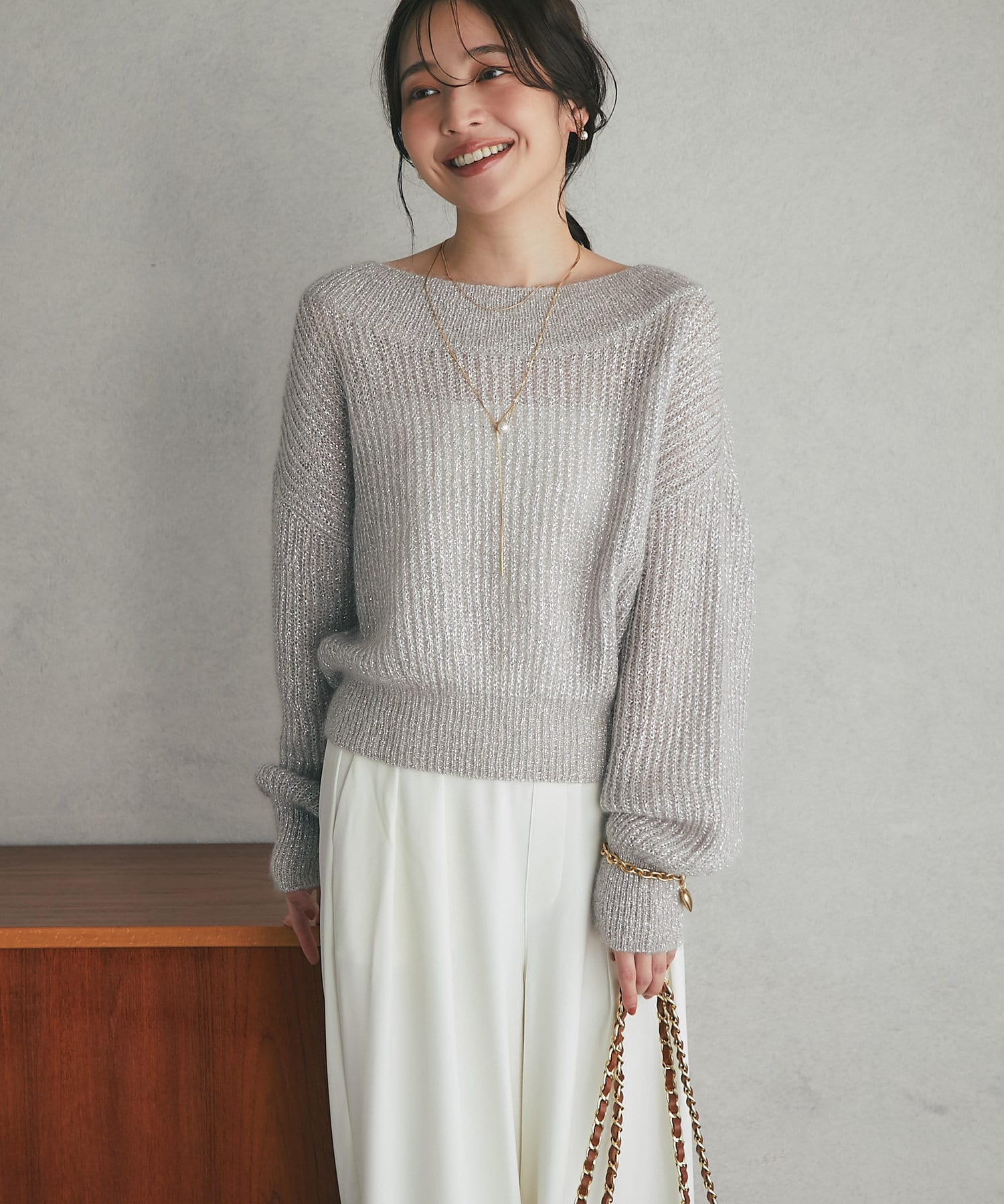 上品ラメとオフショルで女子力UPが叶うモヘアニット