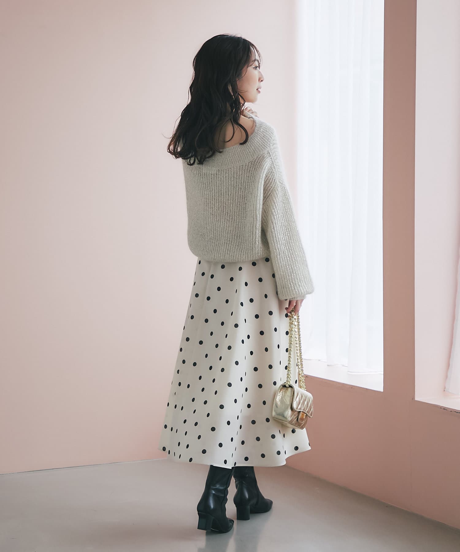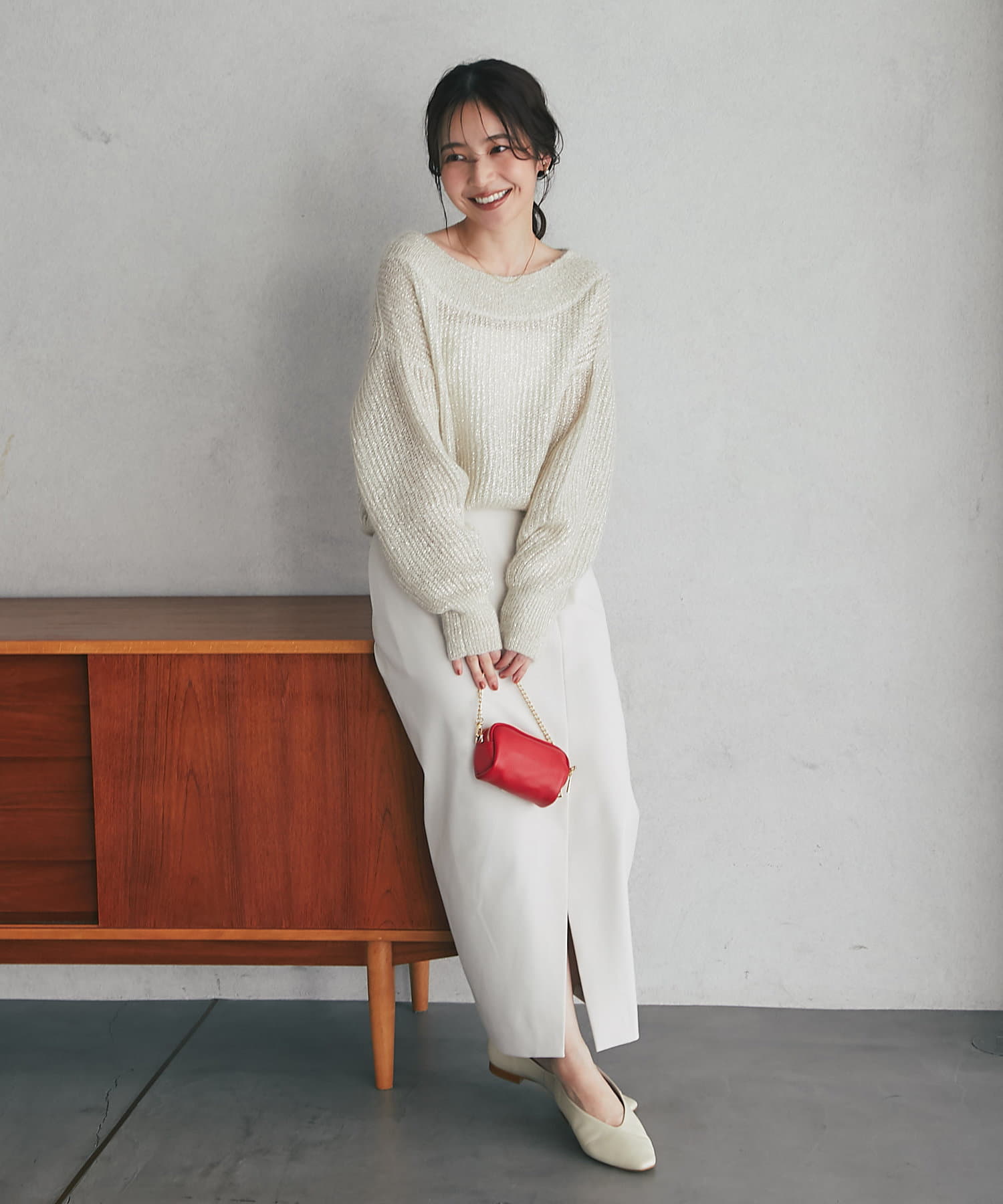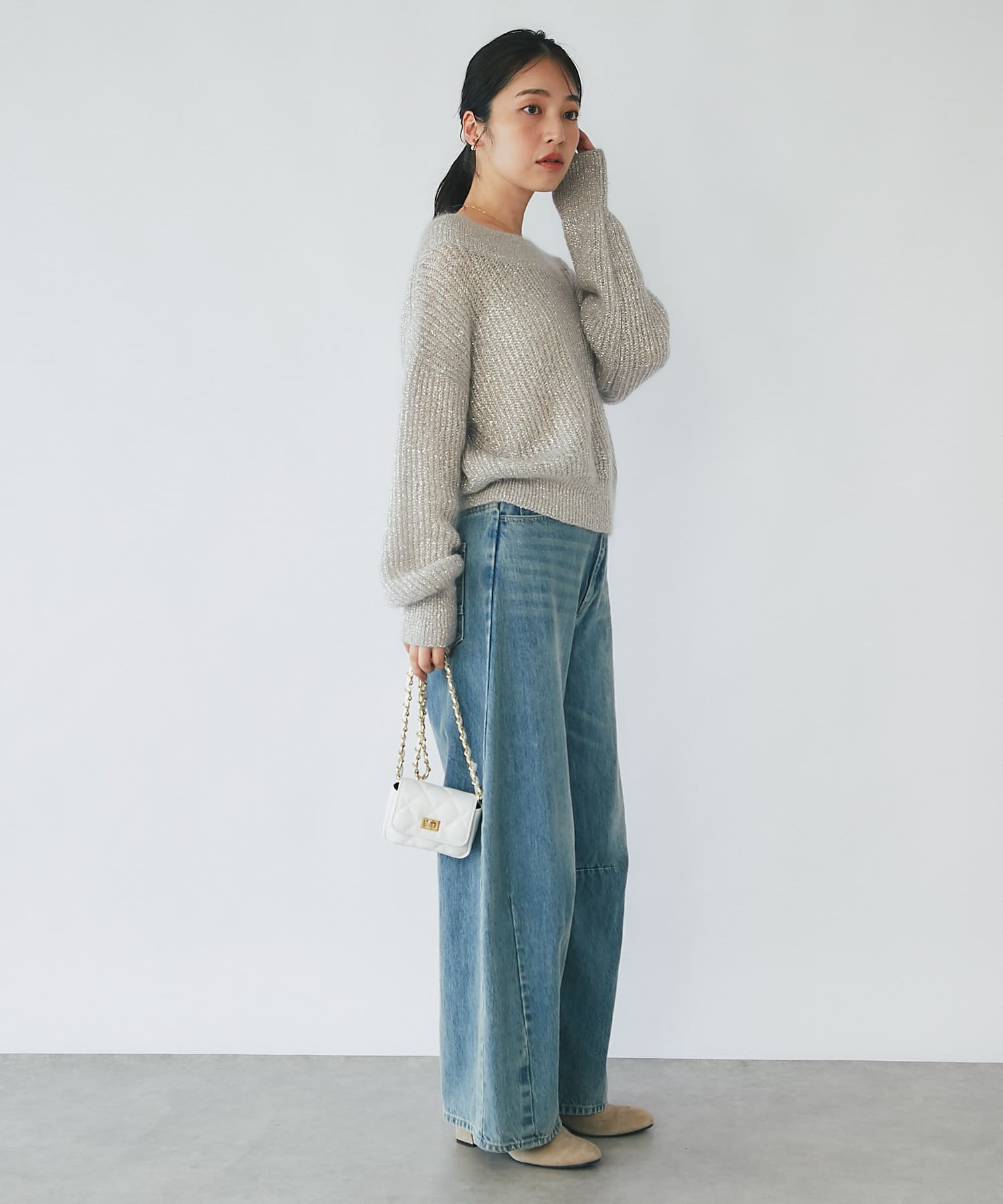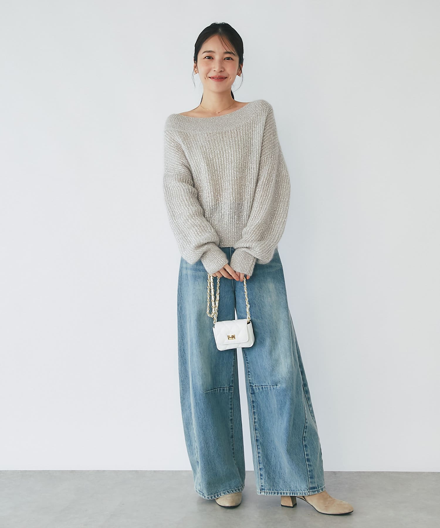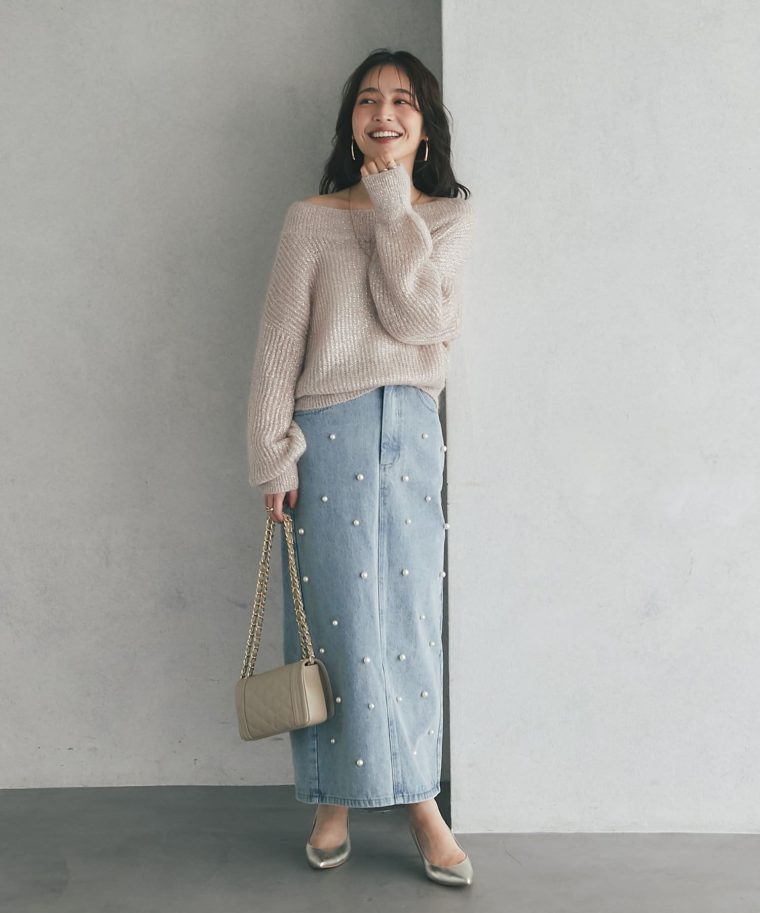 上品ラメとオフショルで女子力UPが叶うモヘアニット