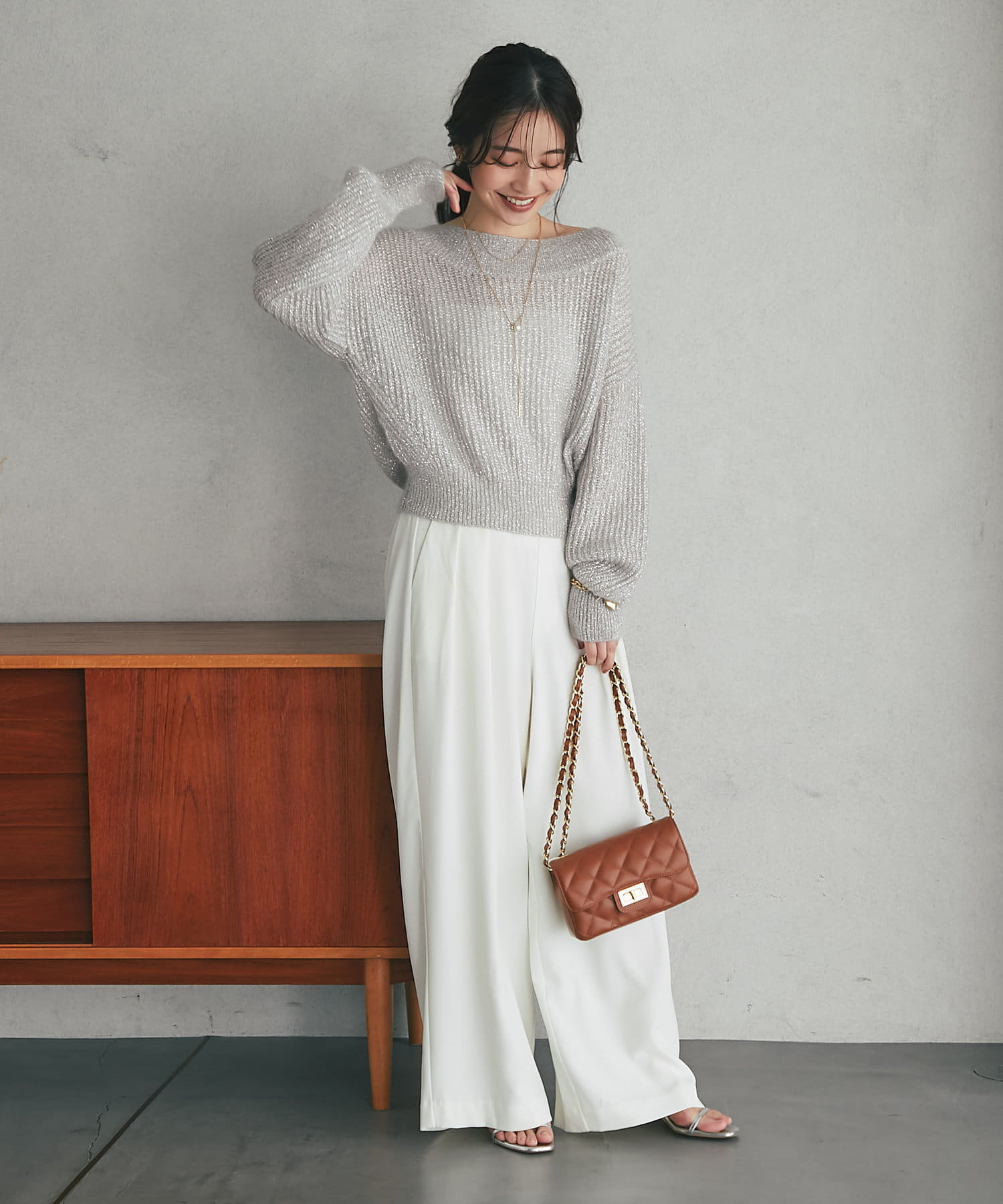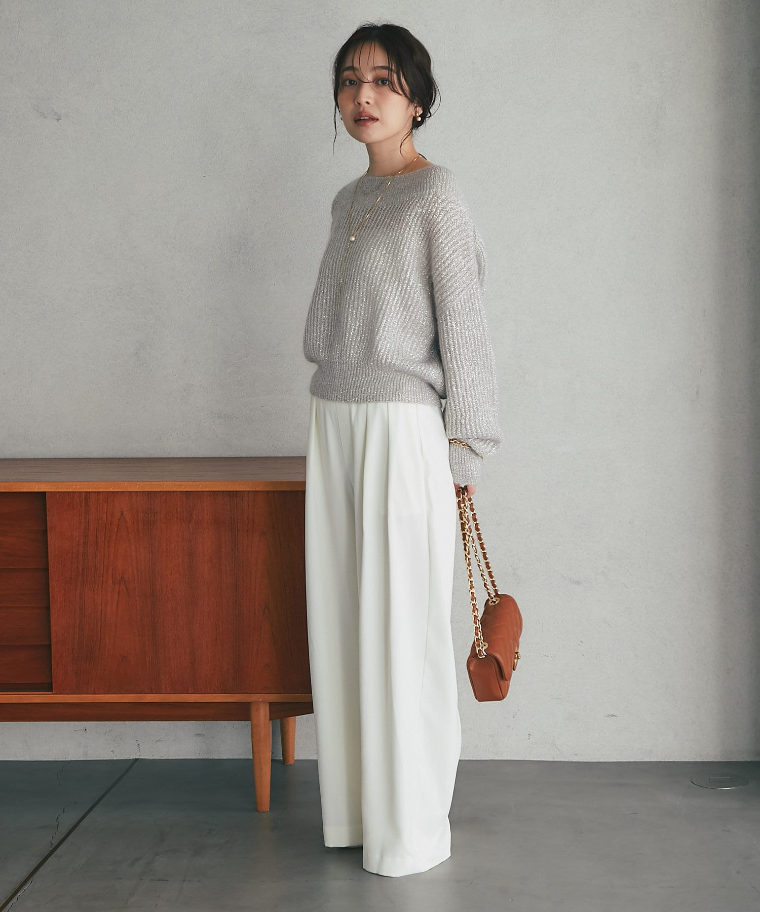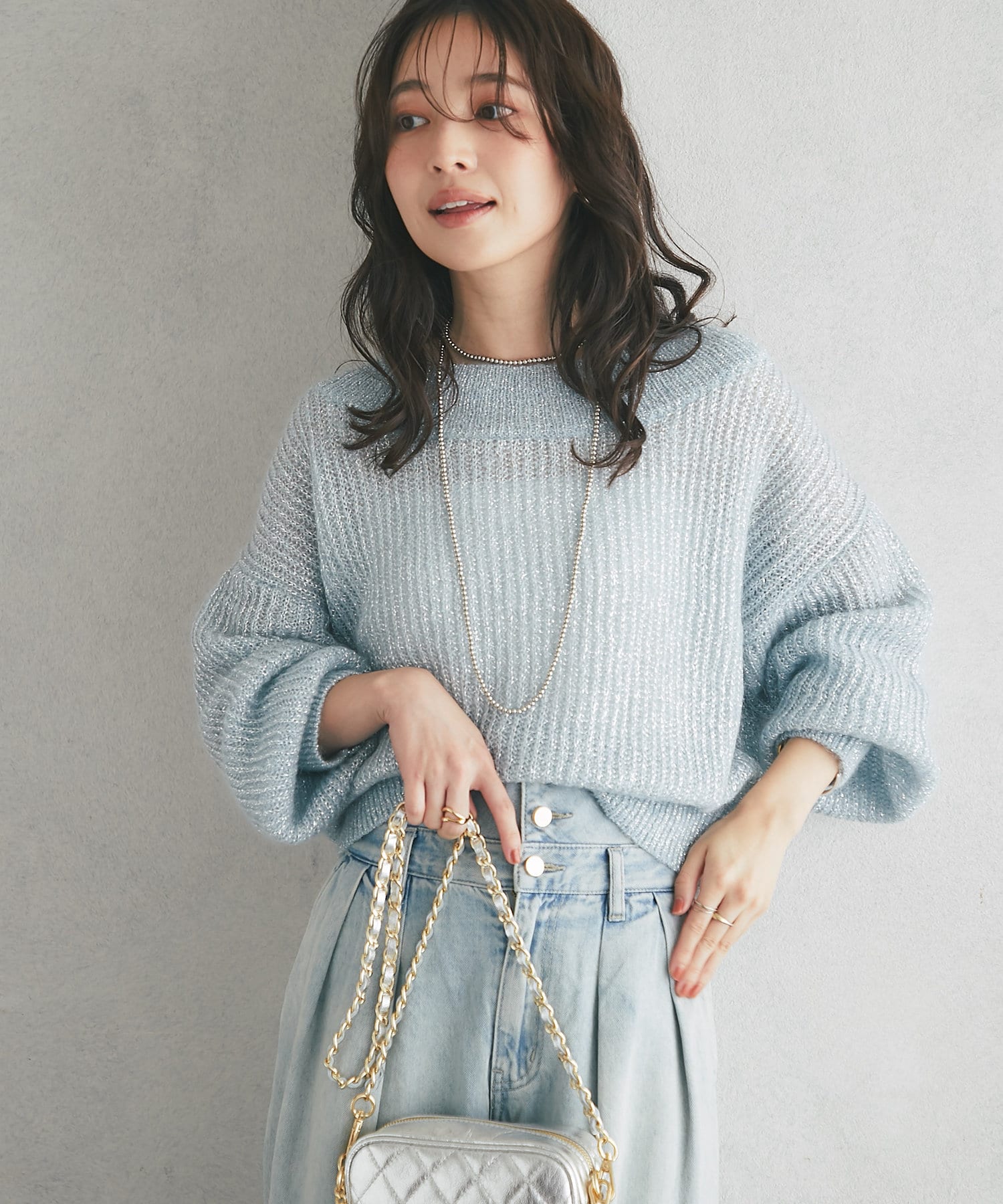 着るだけで華やかなラメニットなので、シンプルなボトムに合わせるだけでコーデが決まります。
