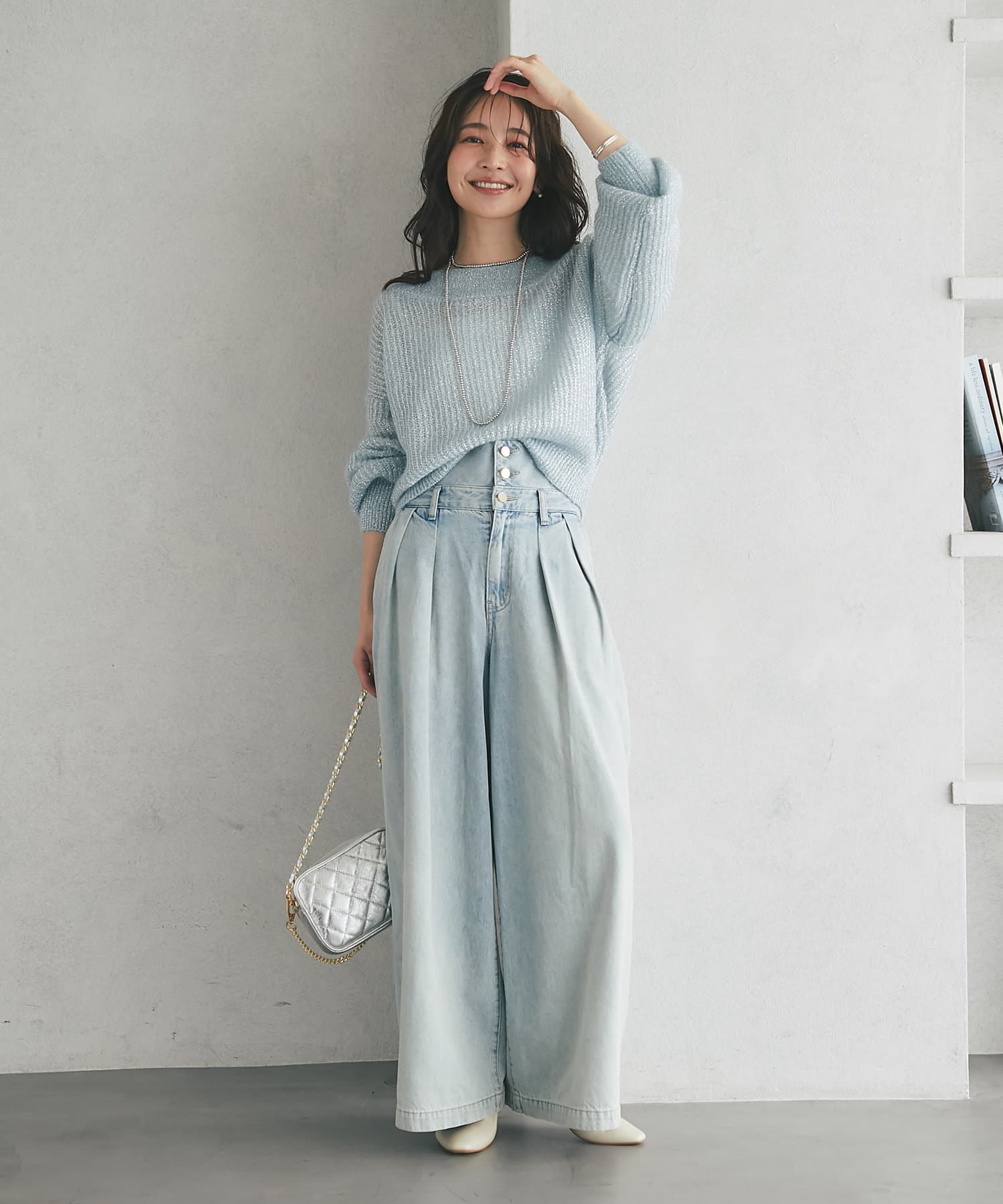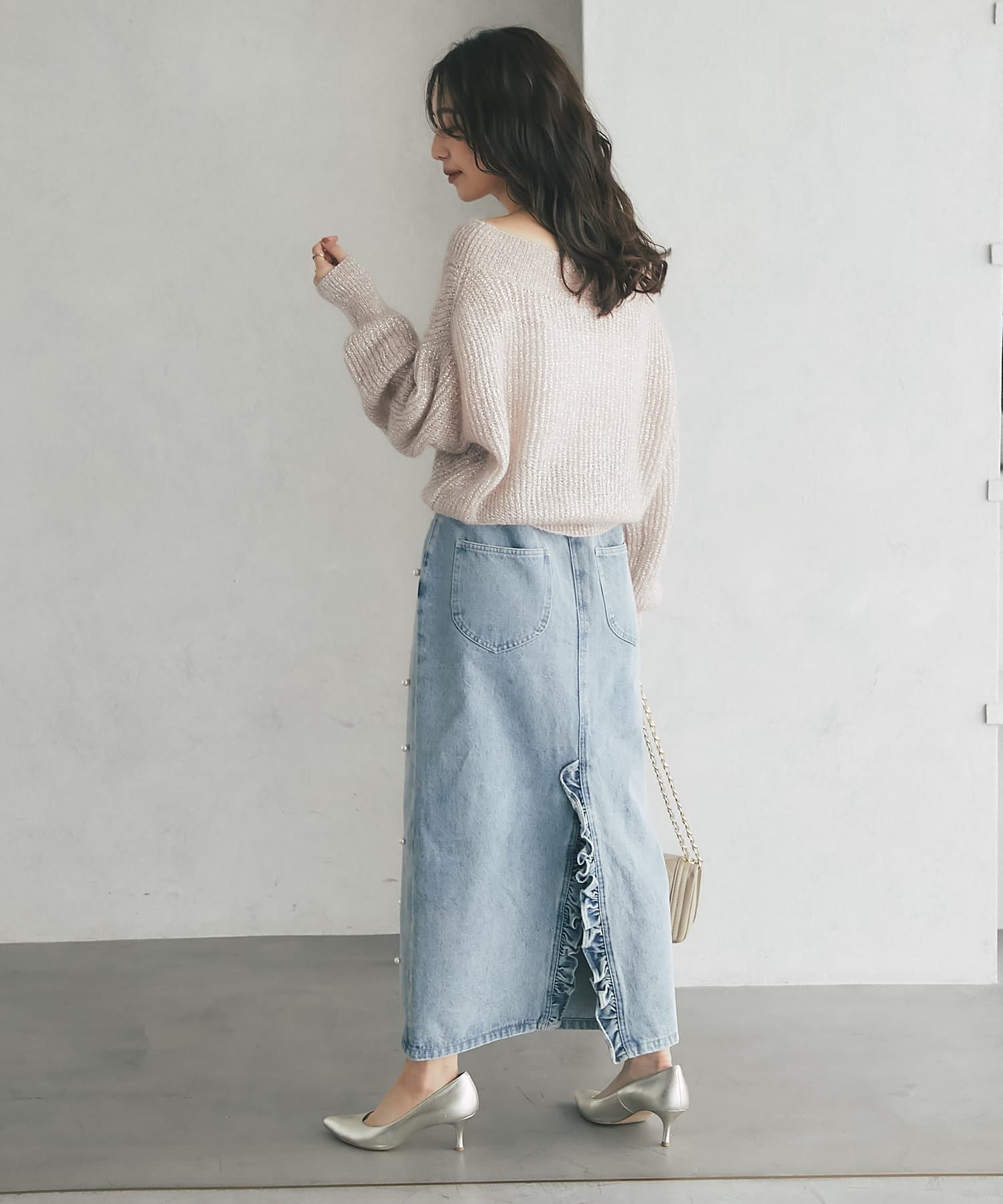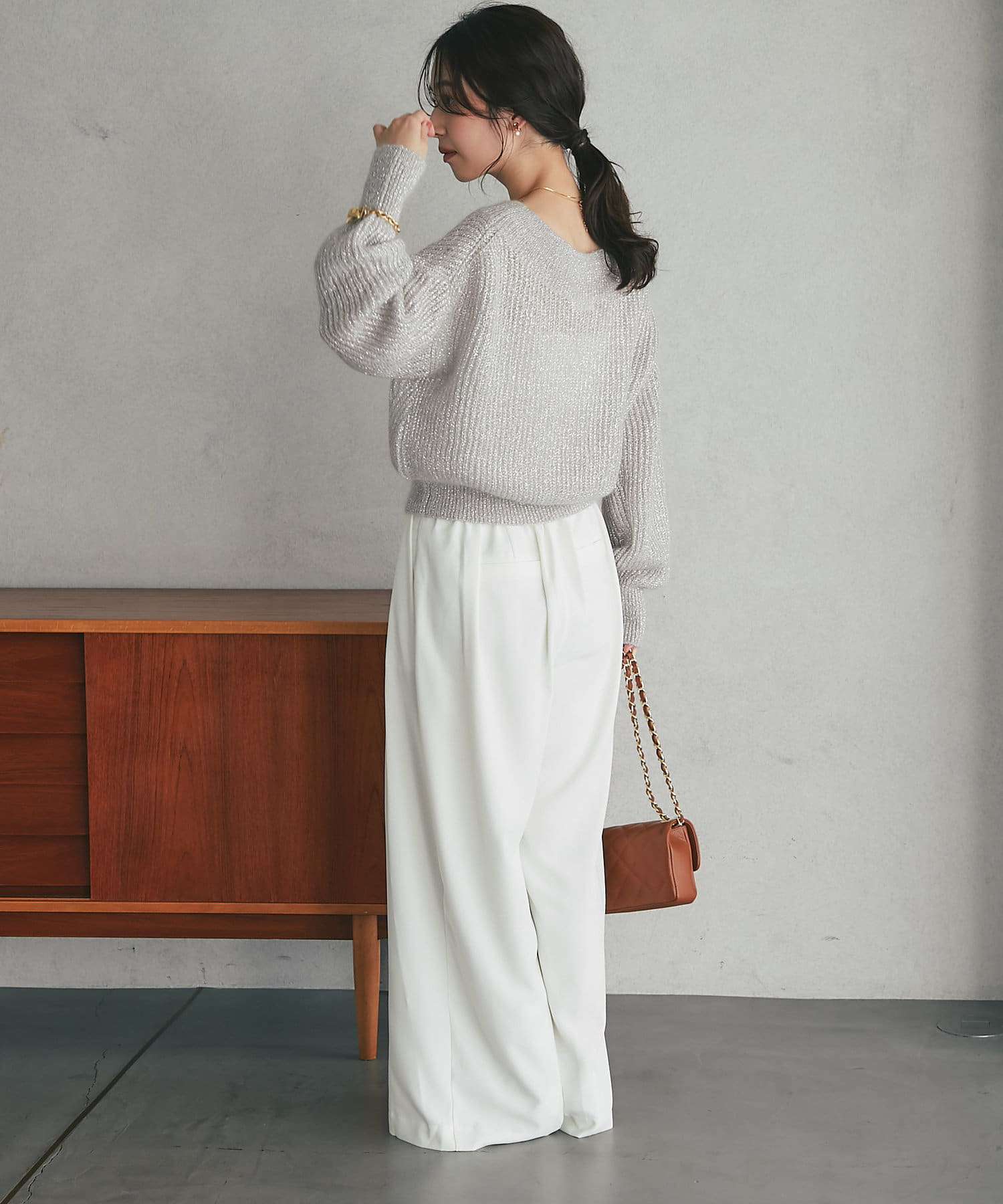 着るだけで華やかなラメニットなので、シンプルなボトムに合わせるだけでコーデが決まります。