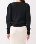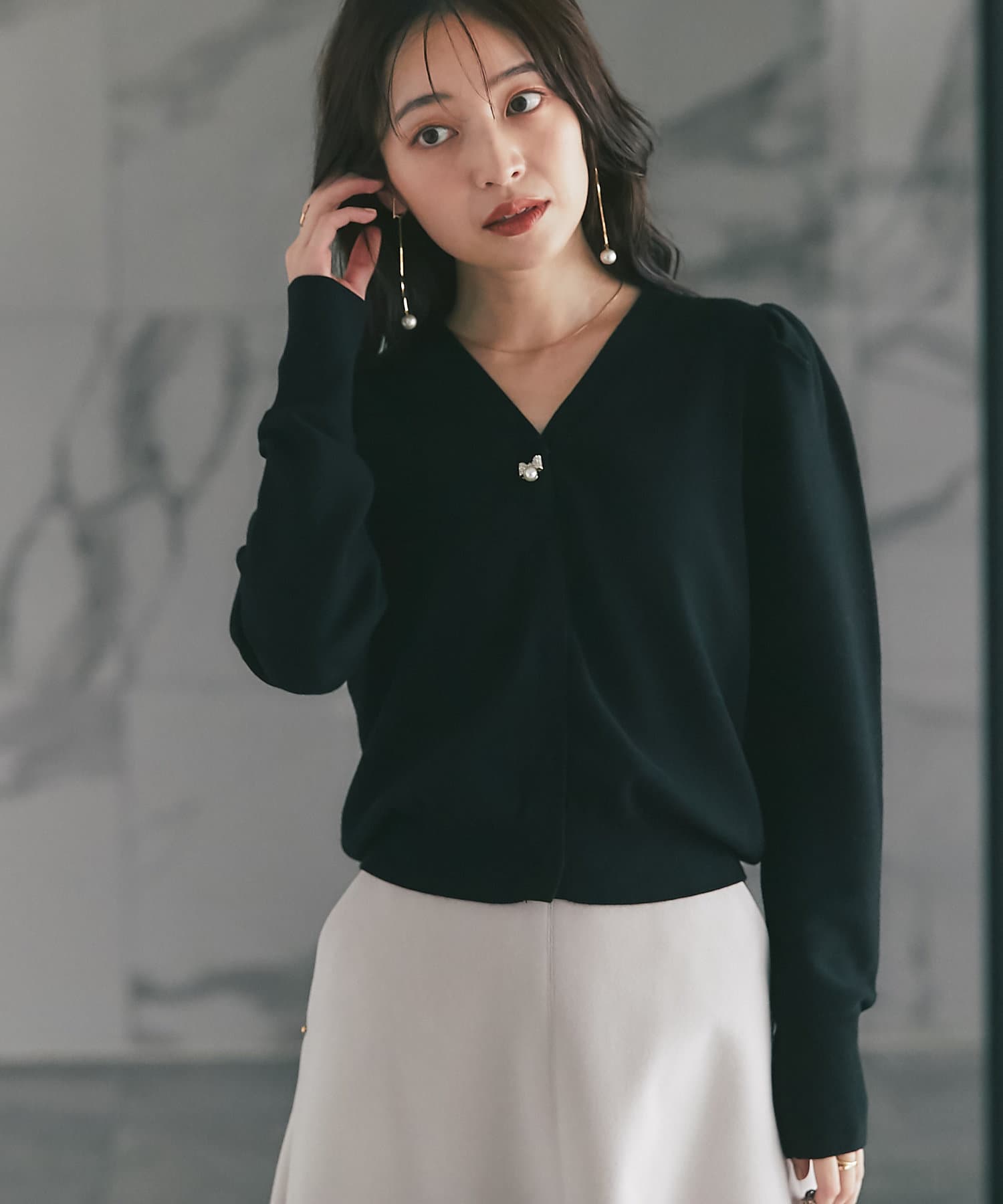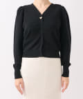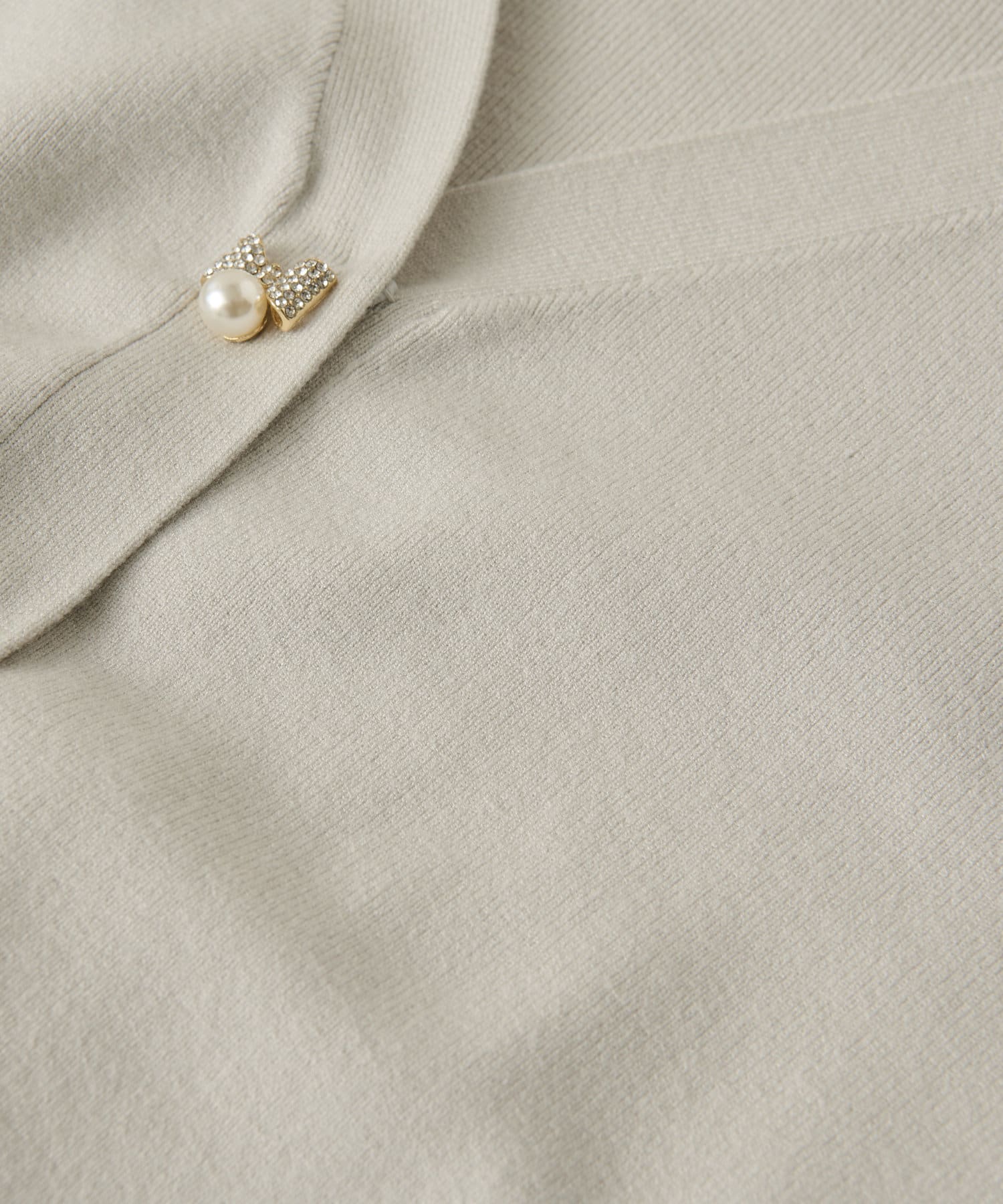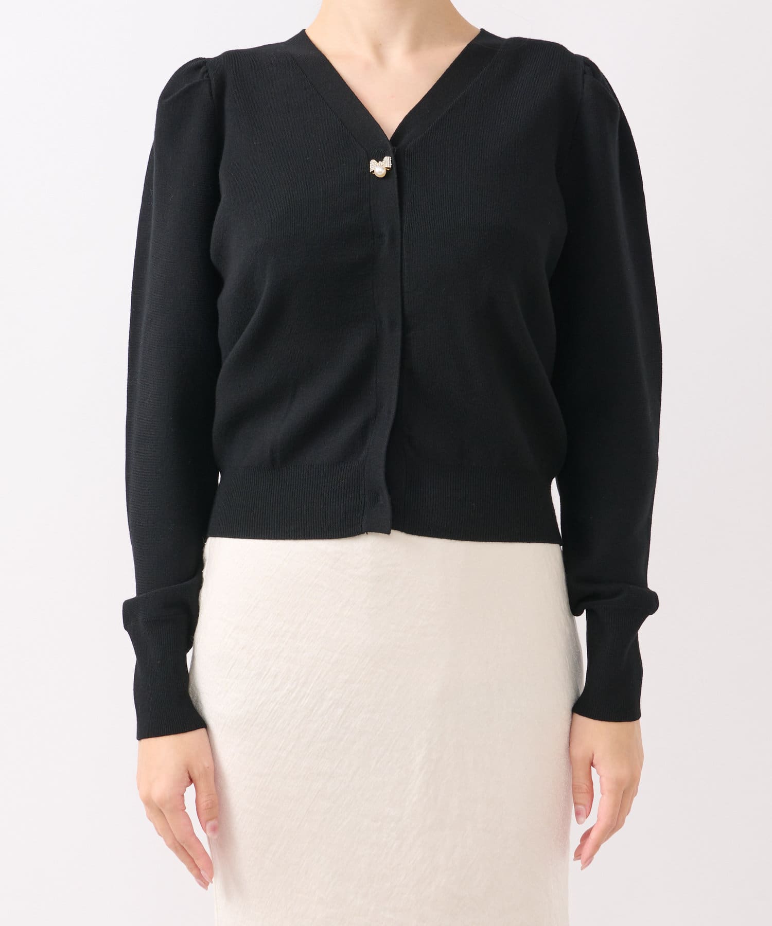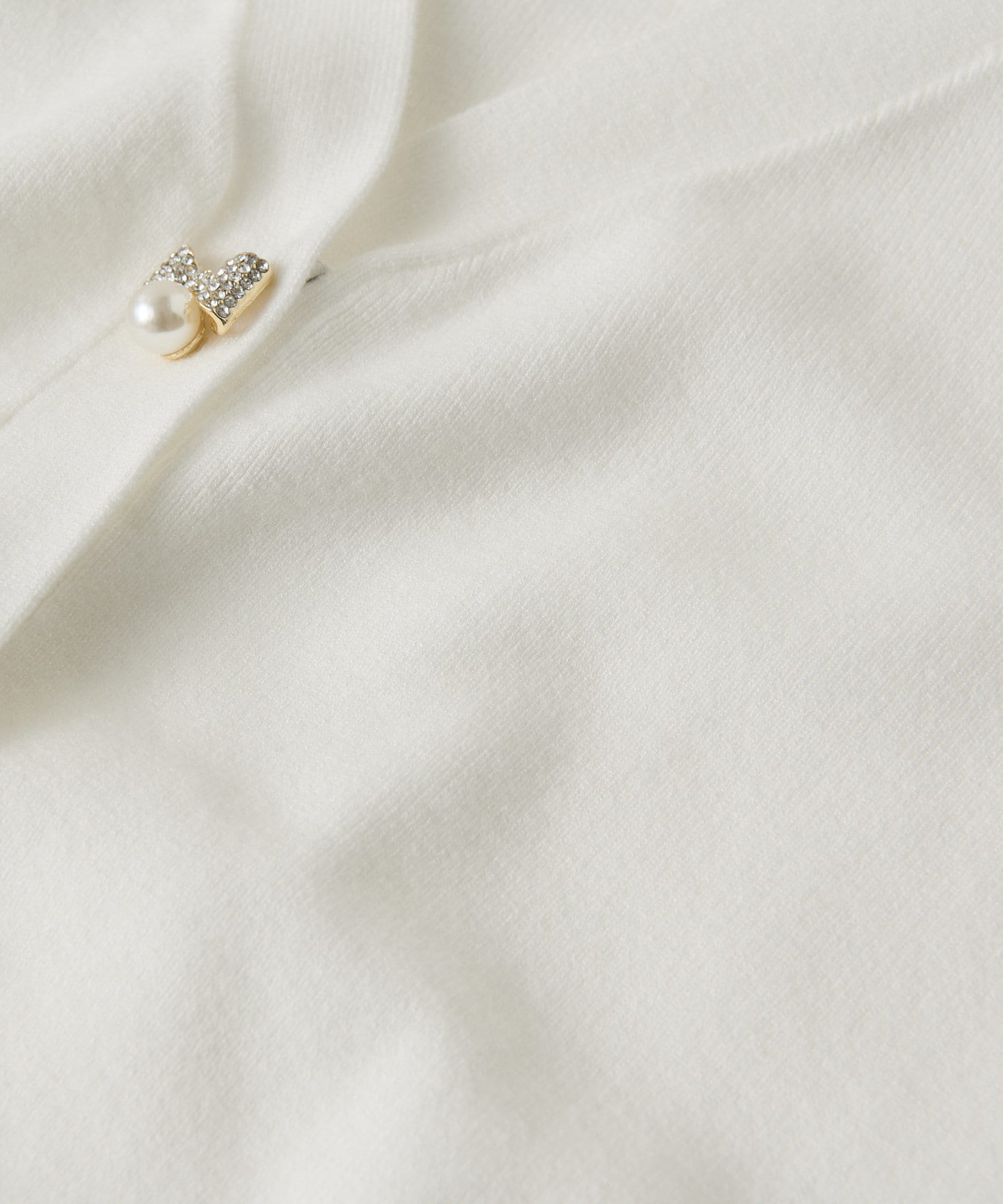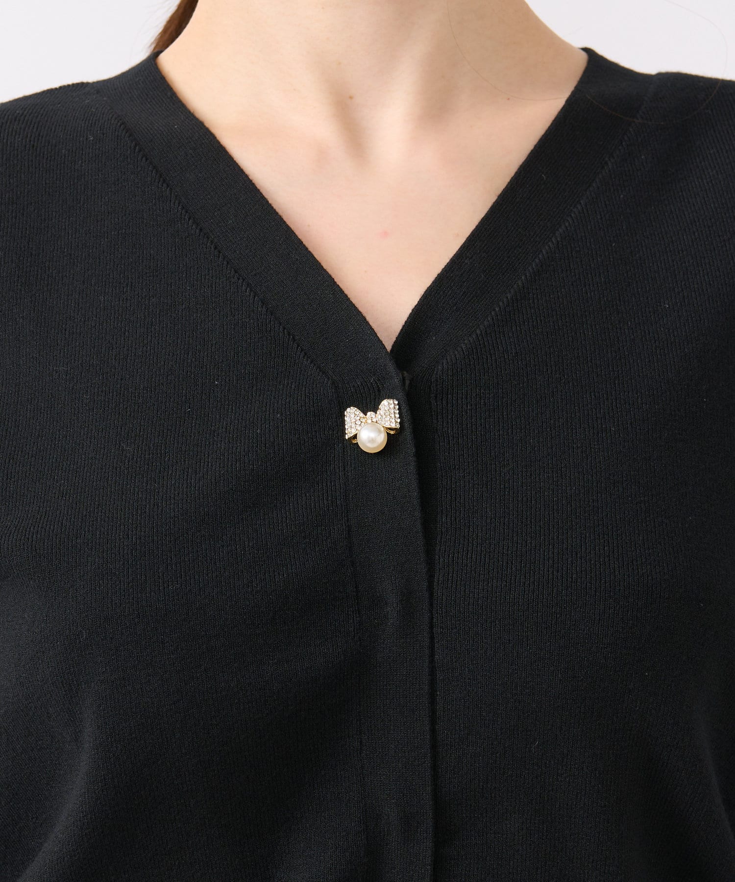 きらきらビジューリボンとパールが目を引くかわいい釦がポイントのカーディガン。