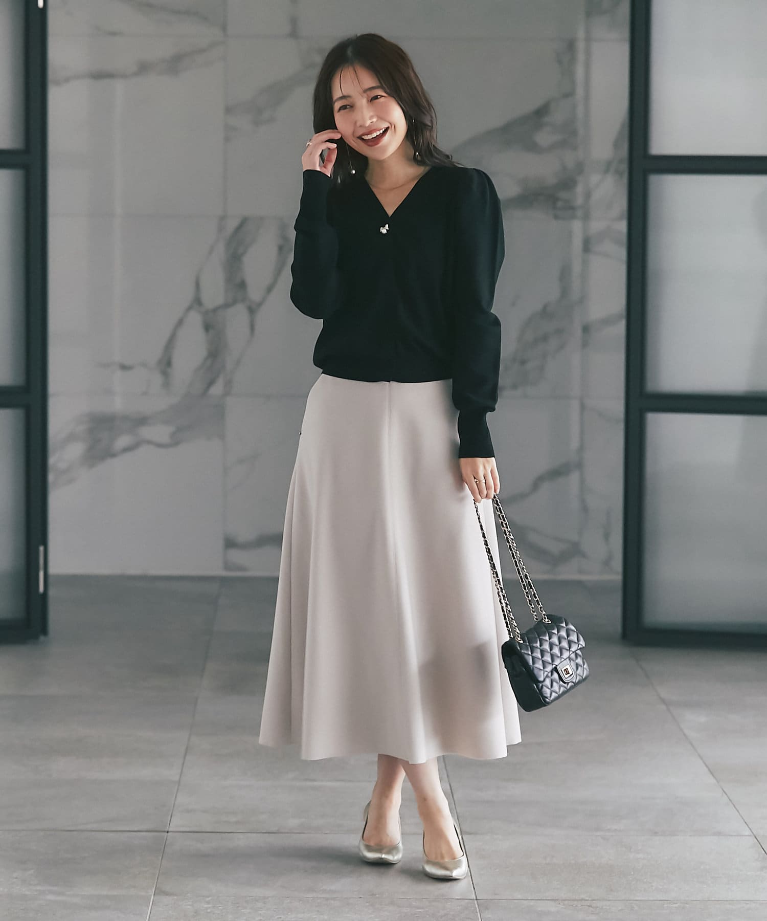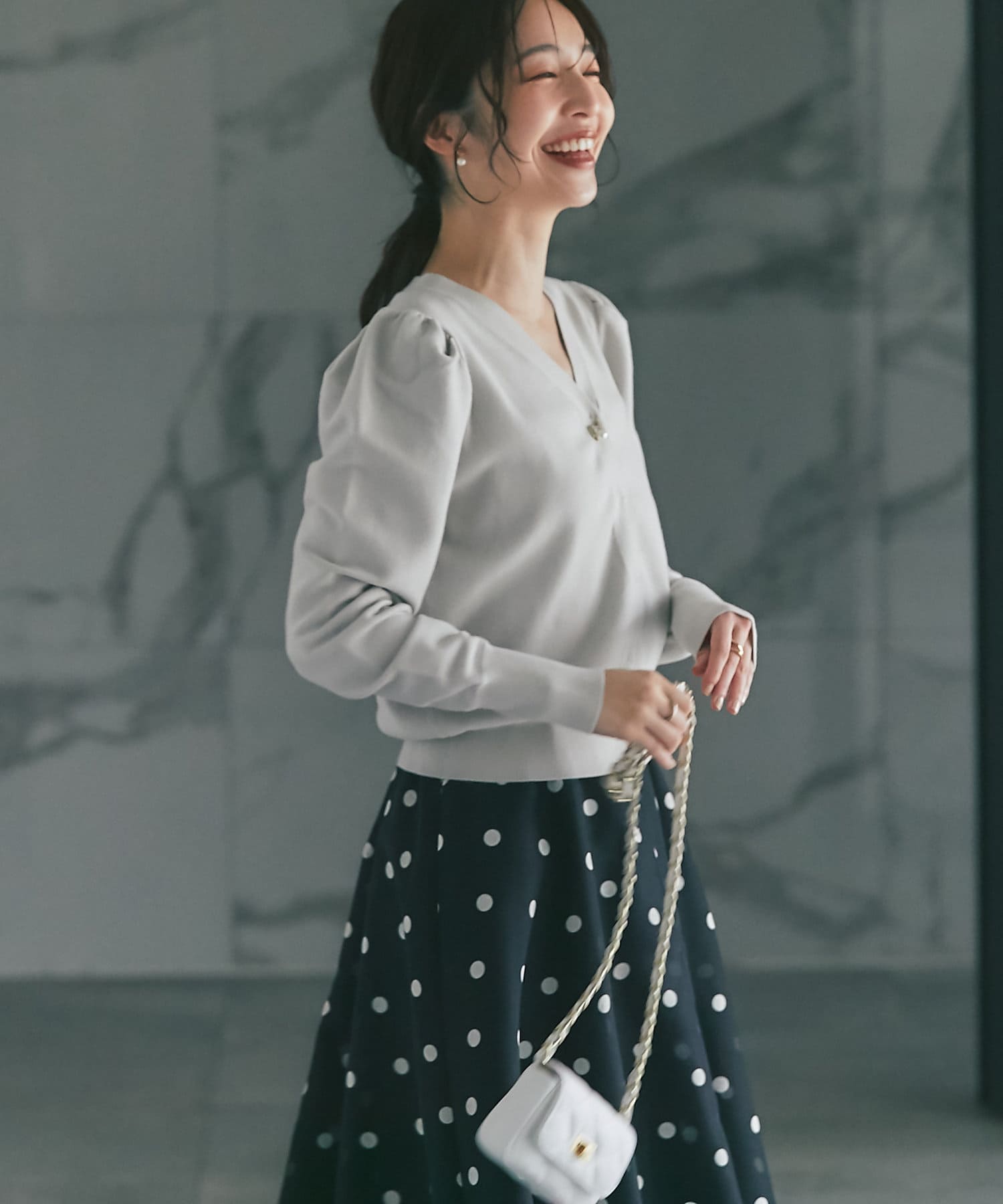 Vネックで首回りもすっきりと抜け感ある印象に。