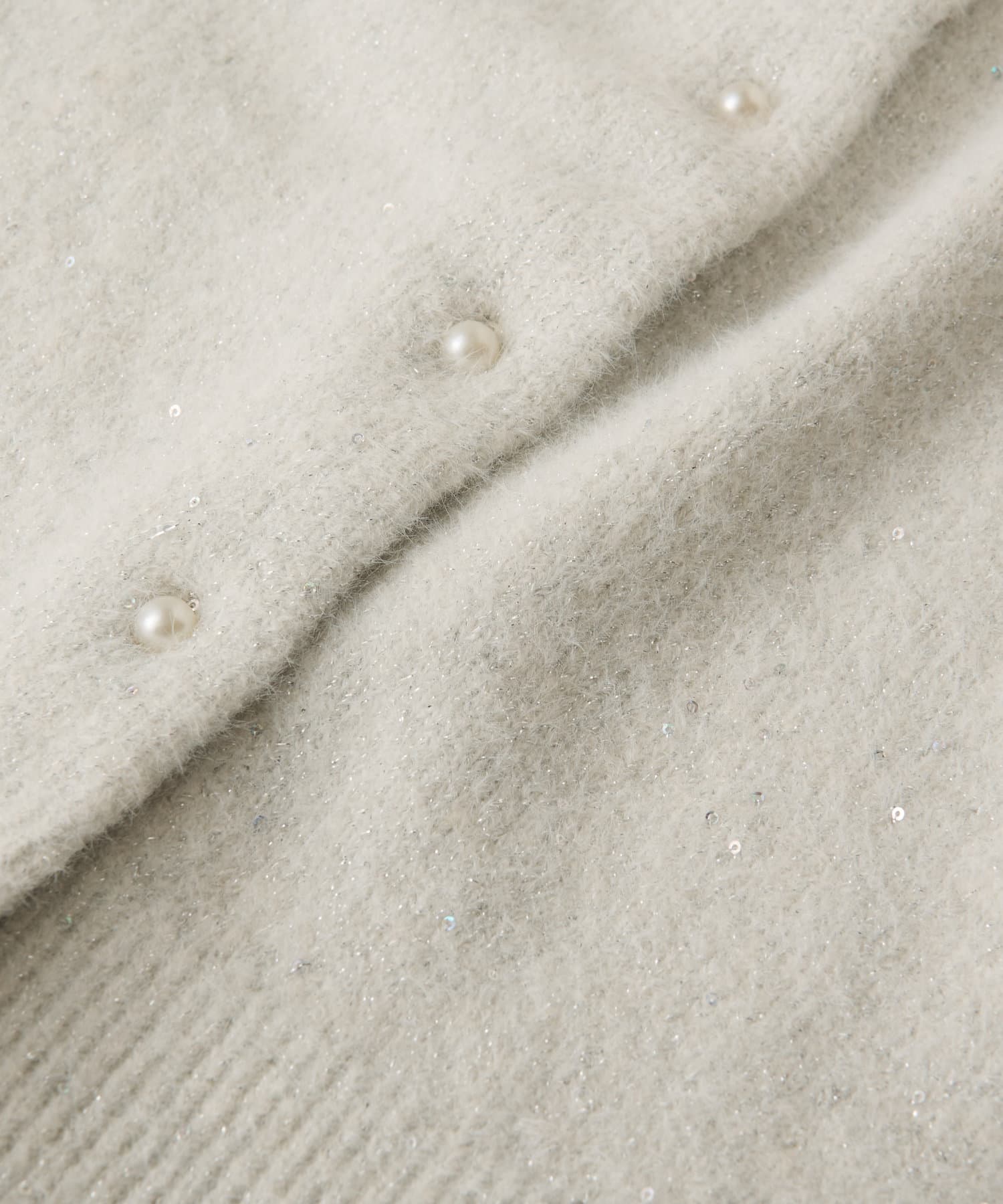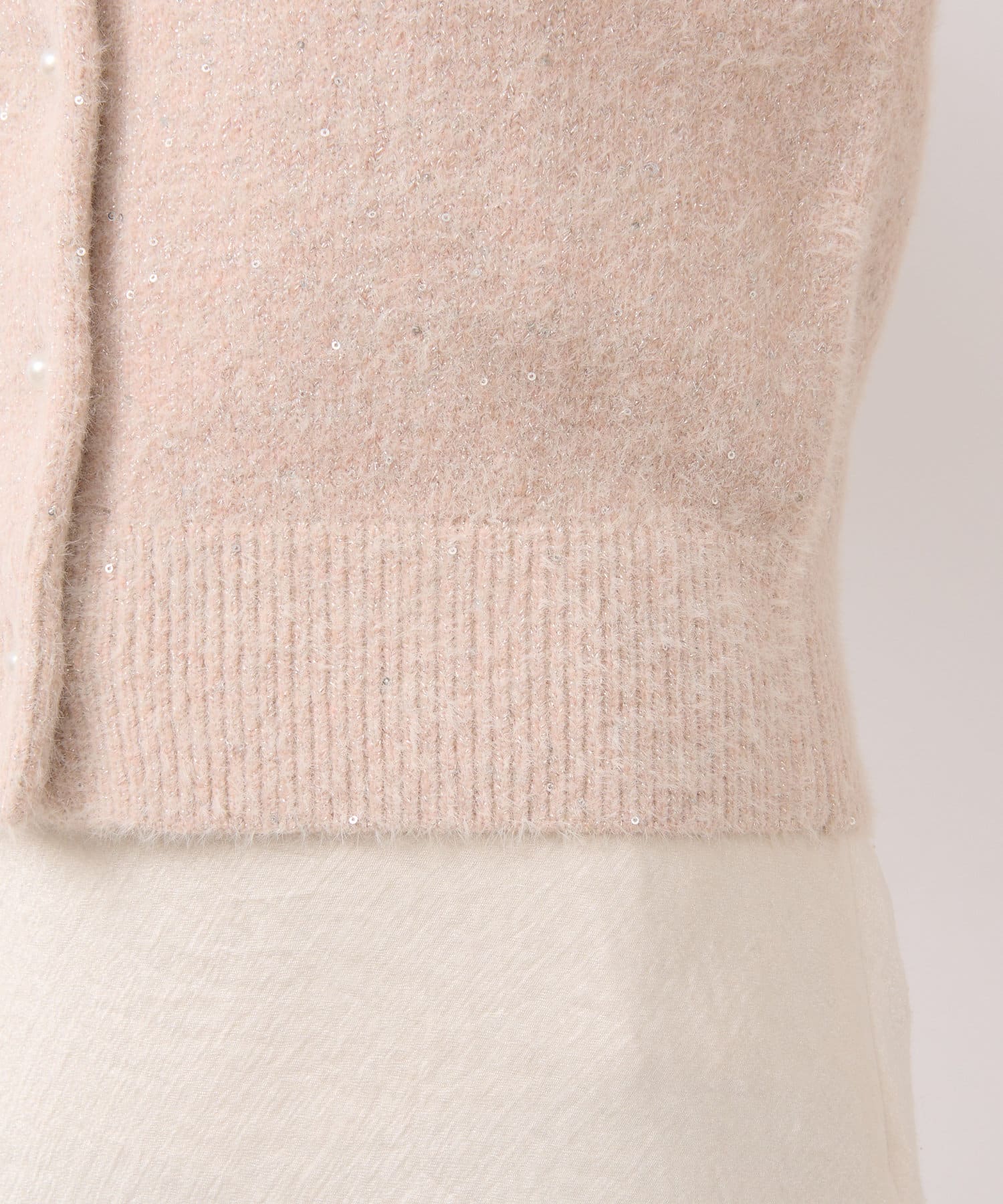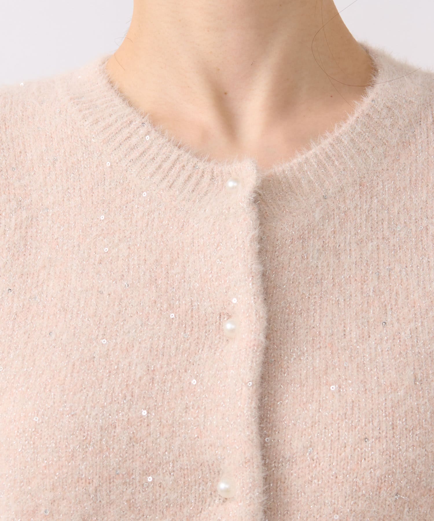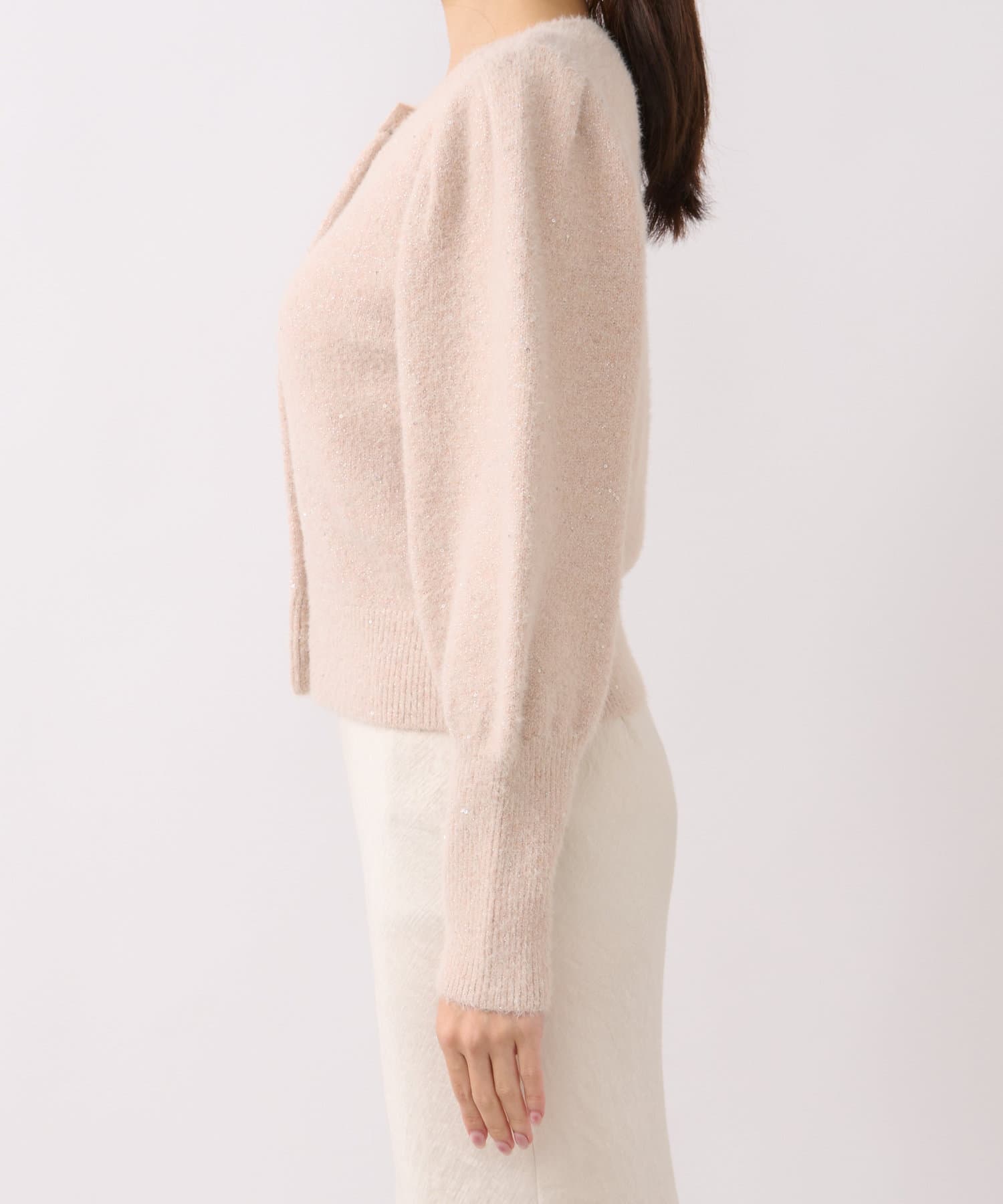 フワフワと毛足のある糸に小さなスパンコールがきらきらと輝くカーディガン。