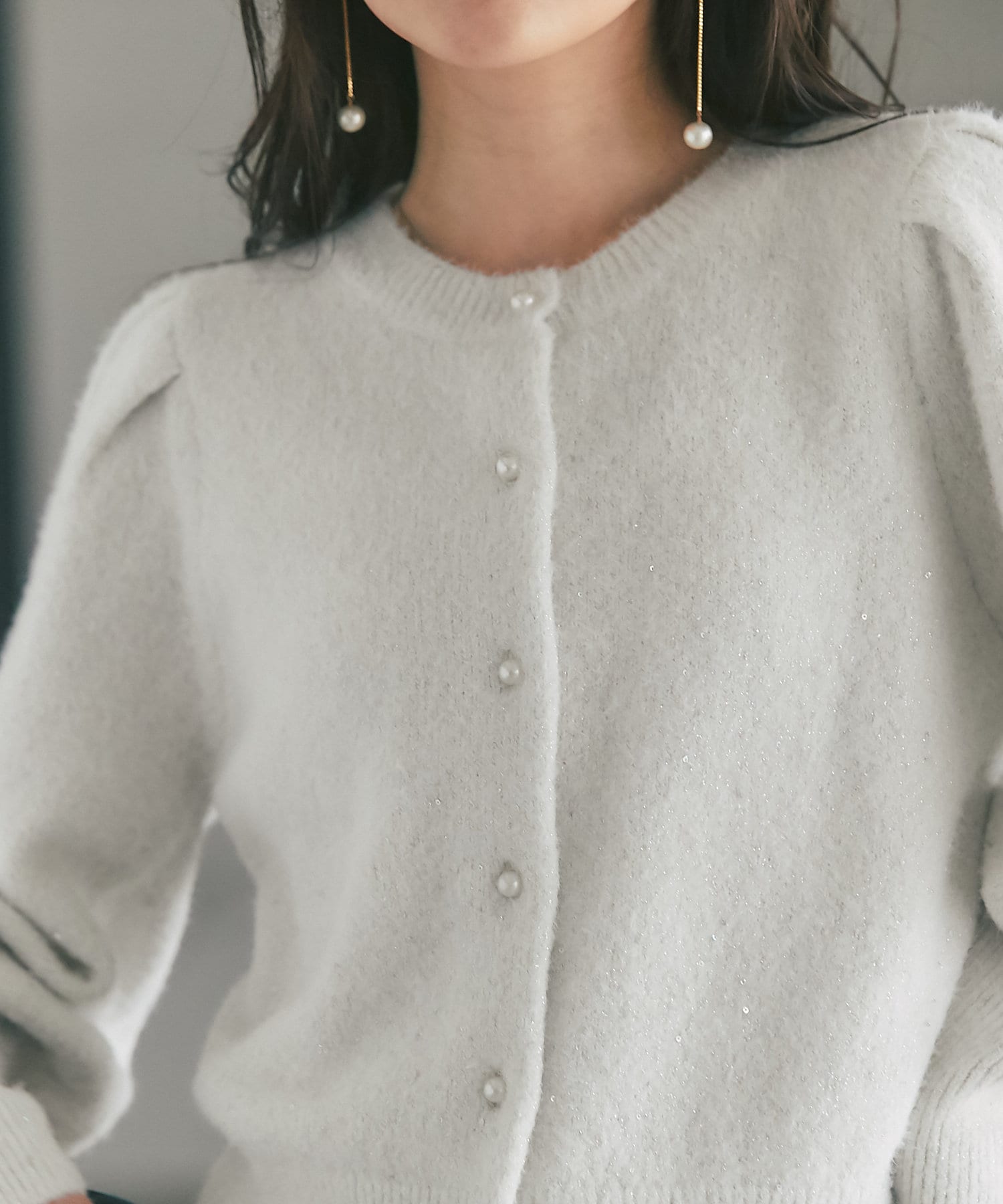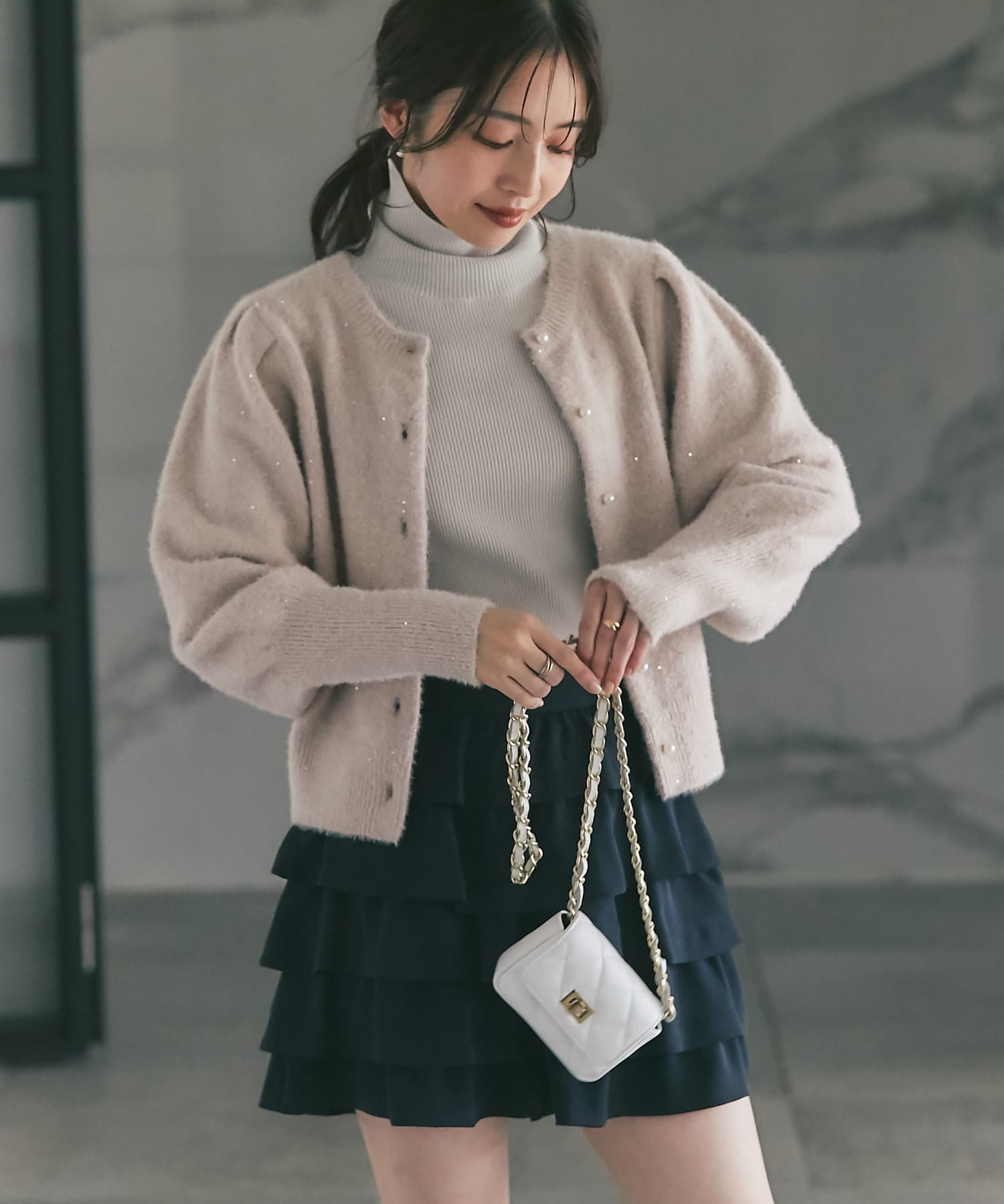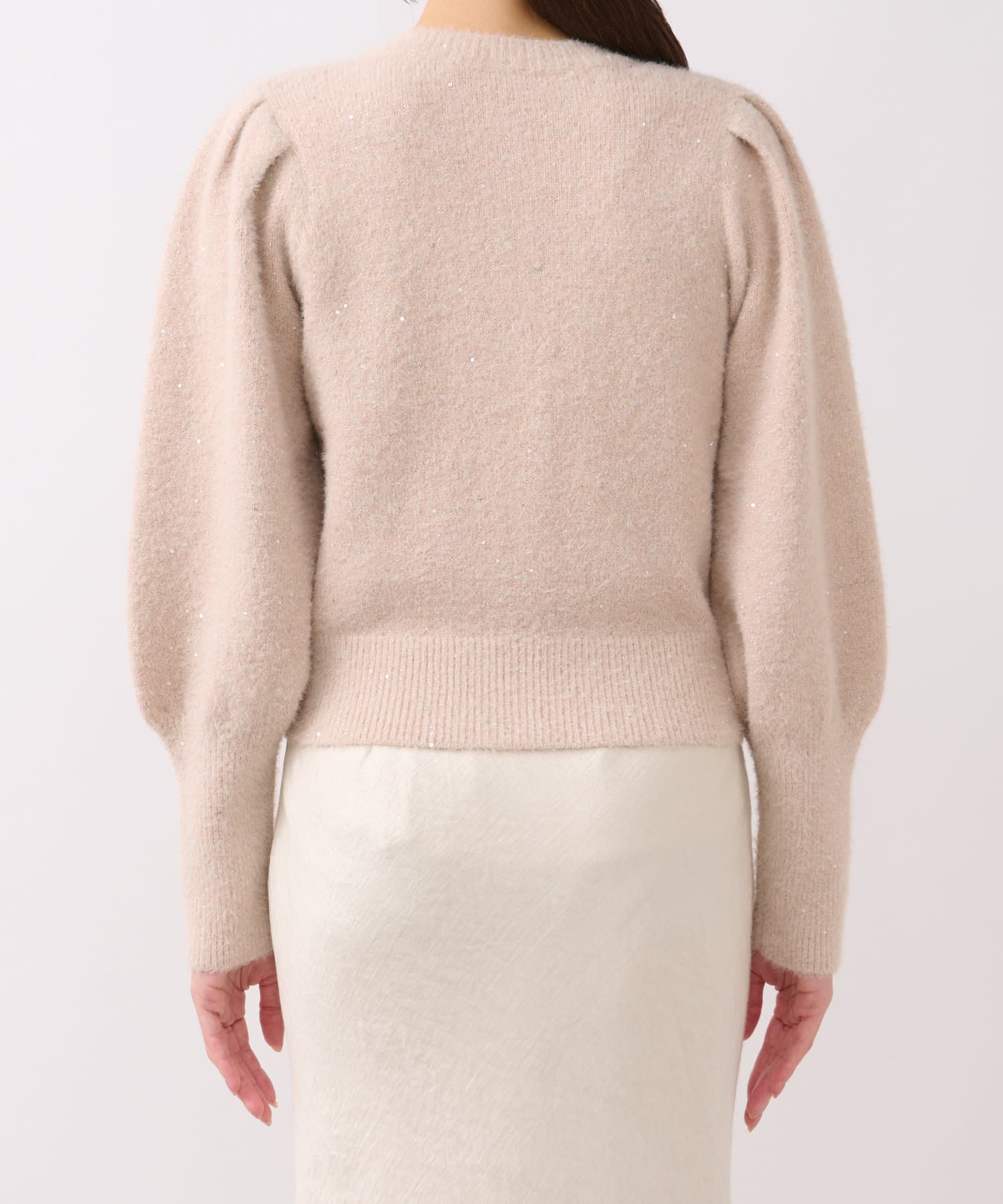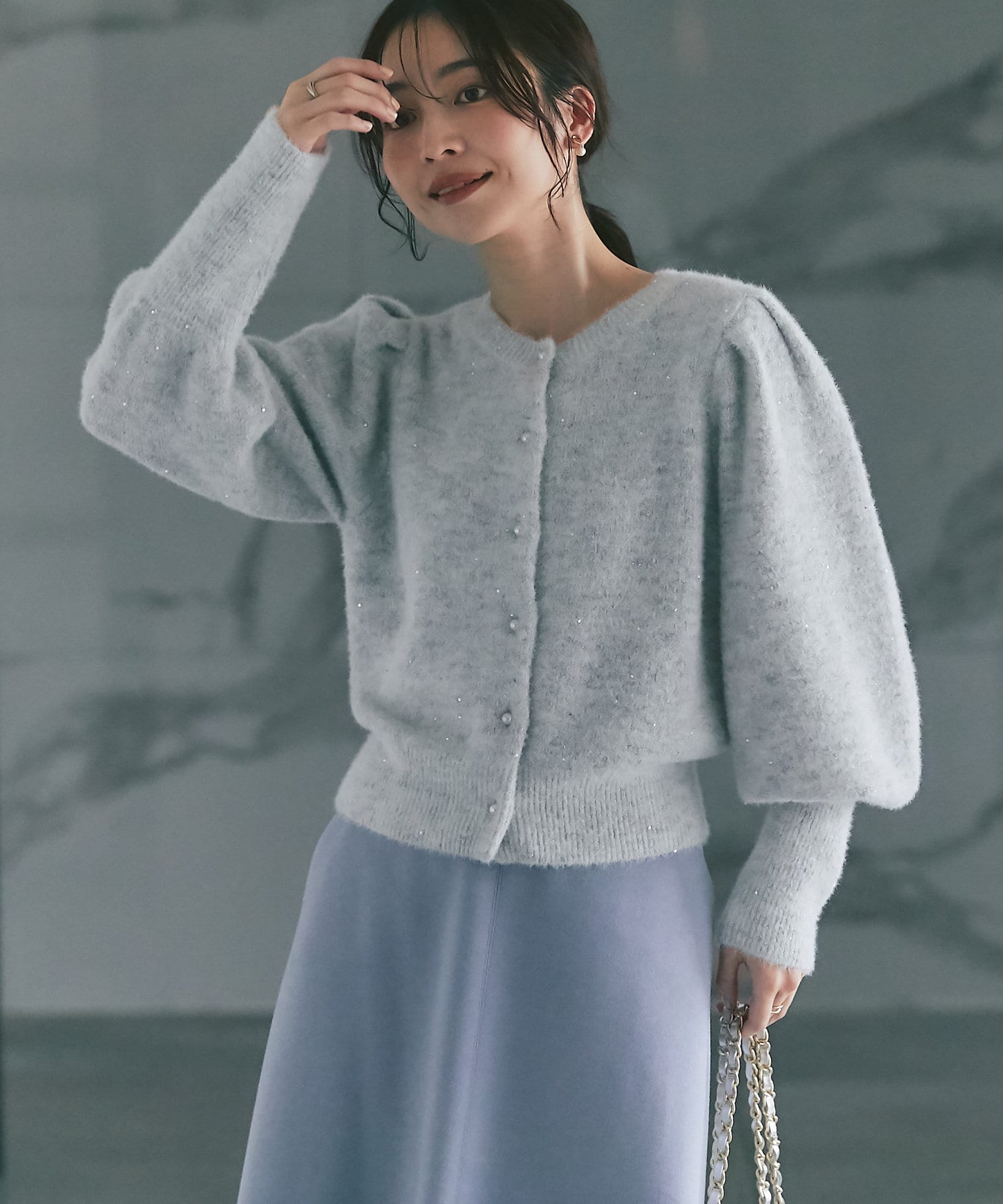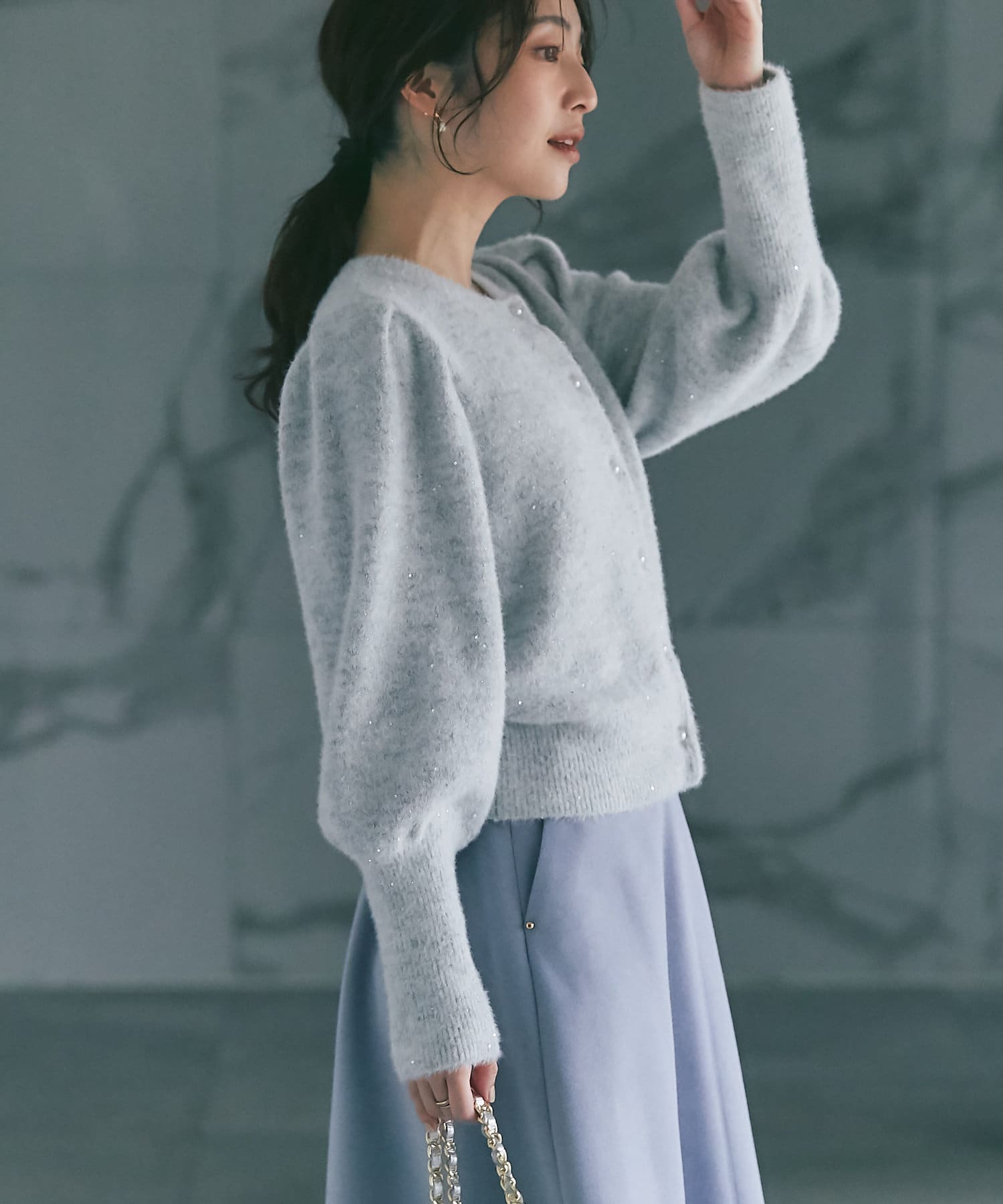 フワフワと毛足のある糸に小さなスパンコールがきらきらと輝くカーディガン。