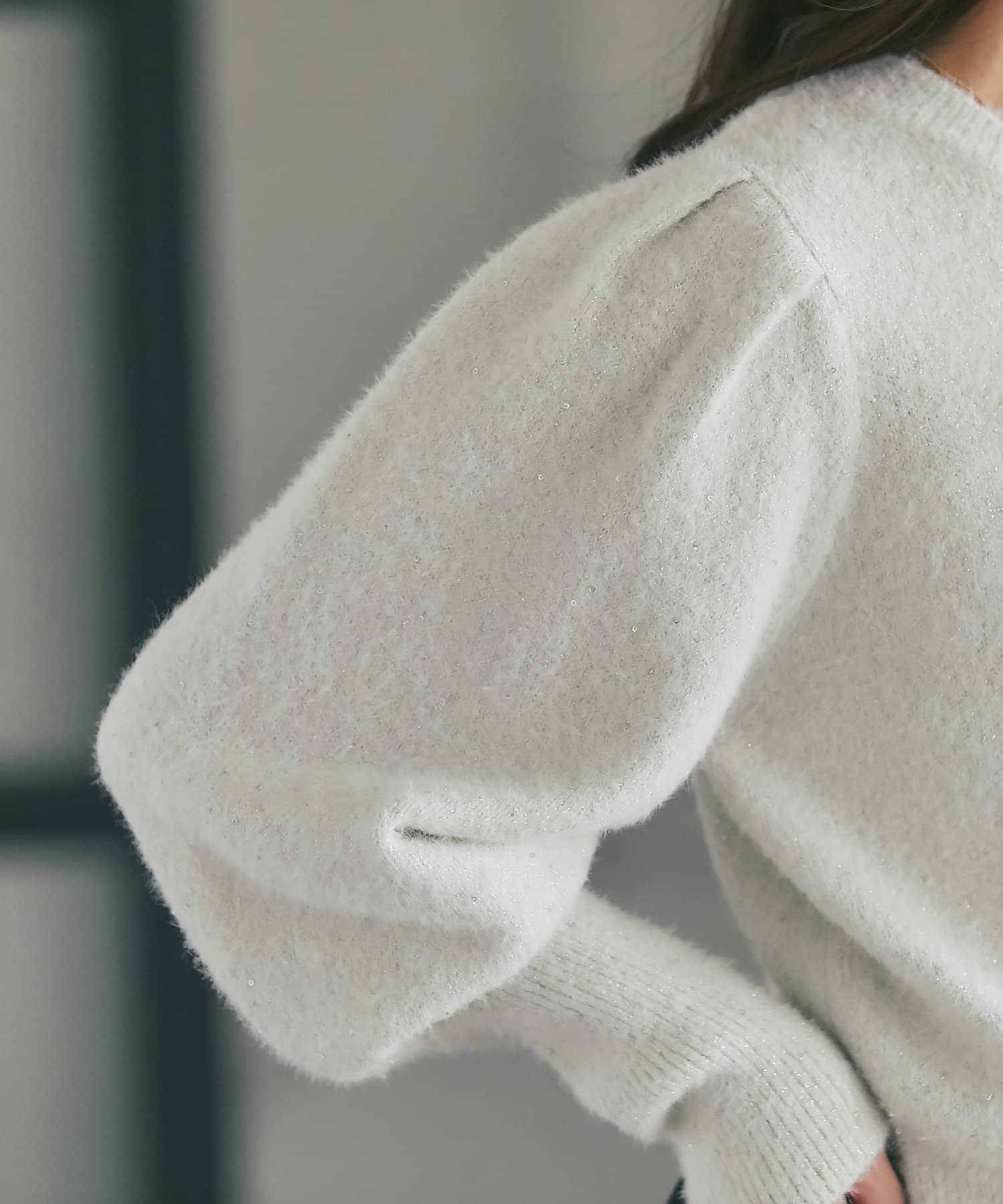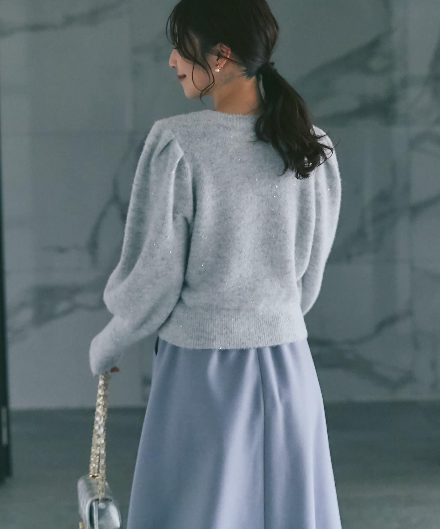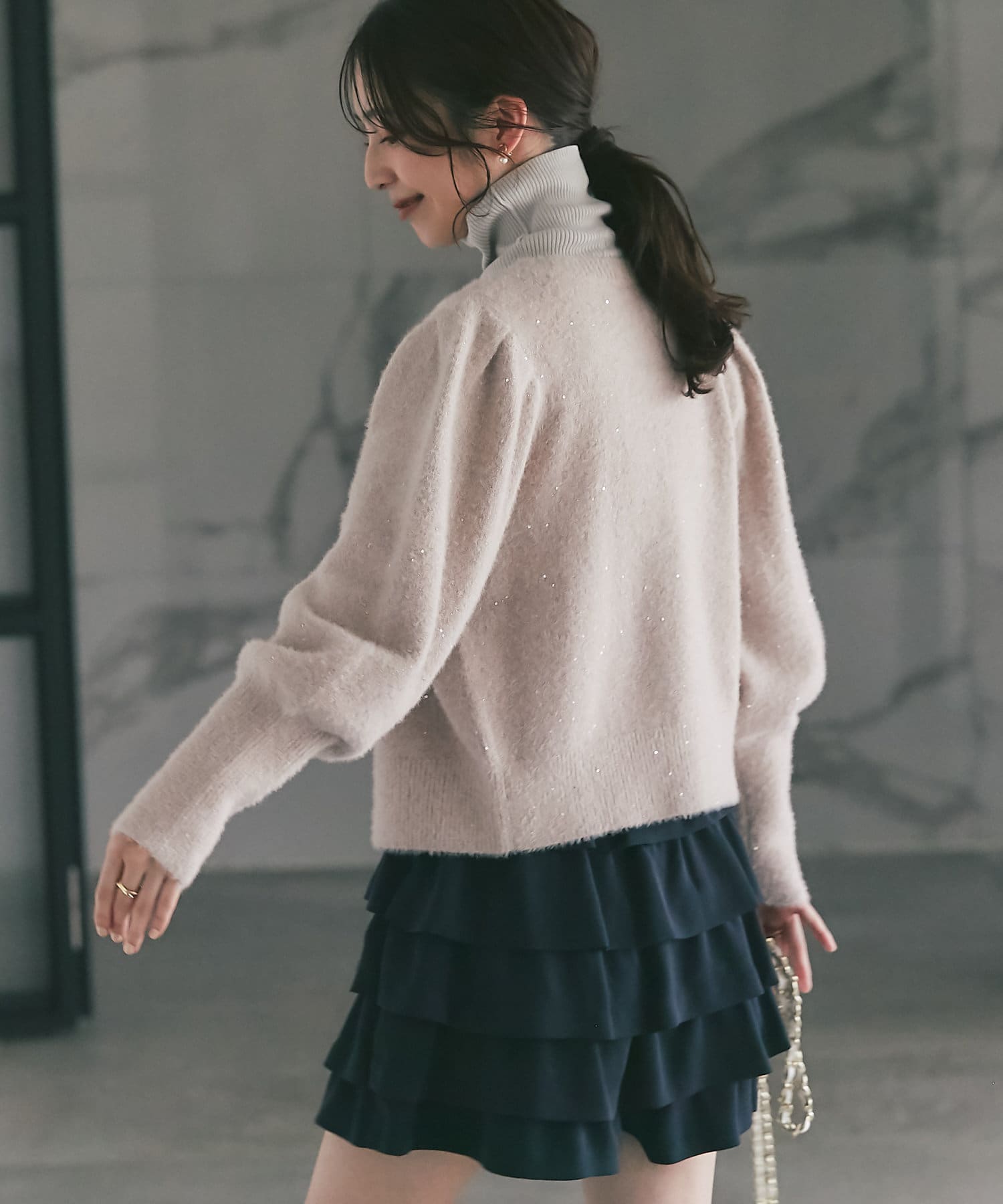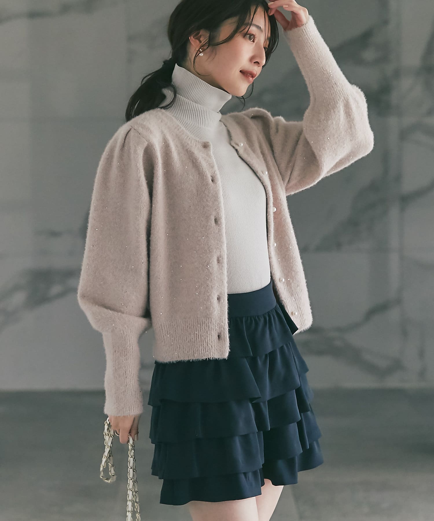 フワフワと毛足のある糸に小さなスパンコールがきらきらと輝くカーディガン。