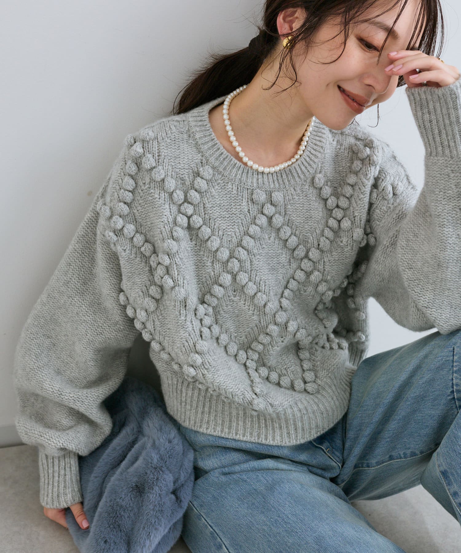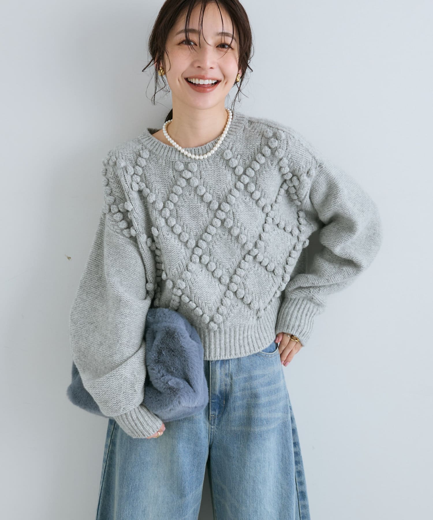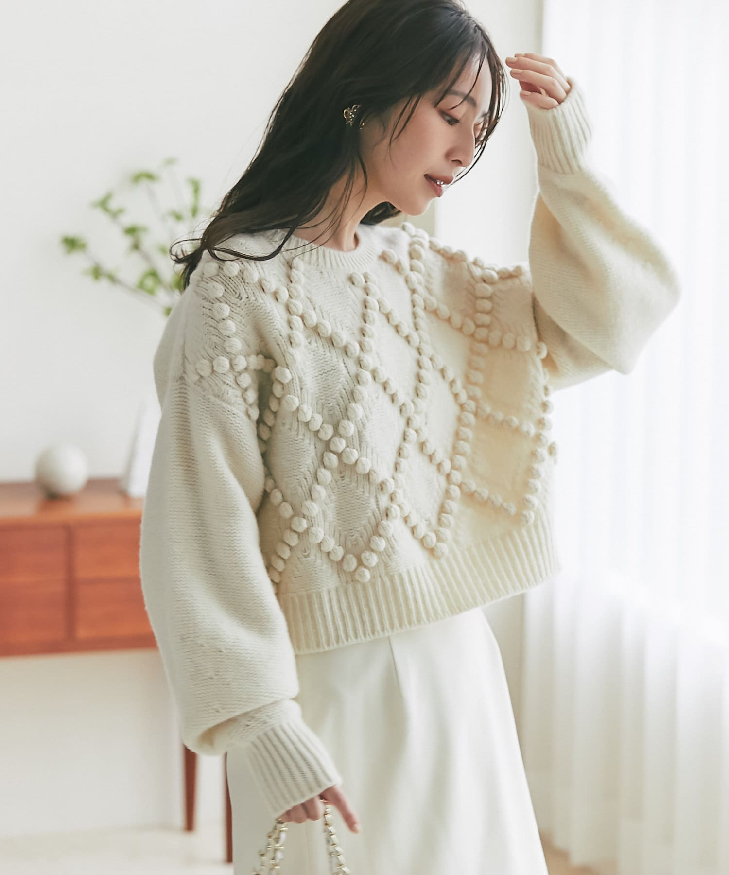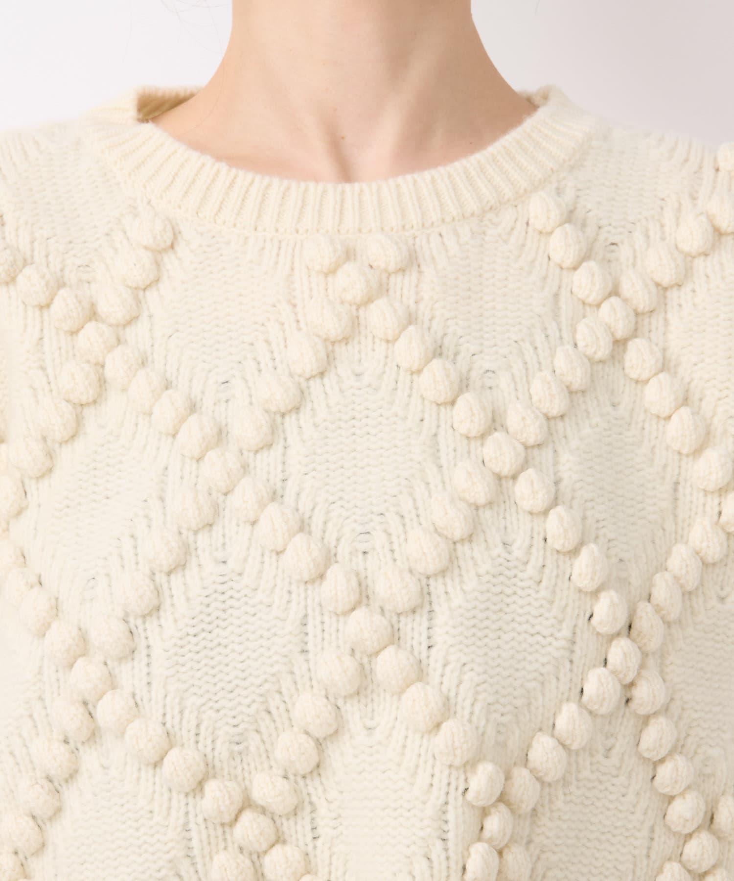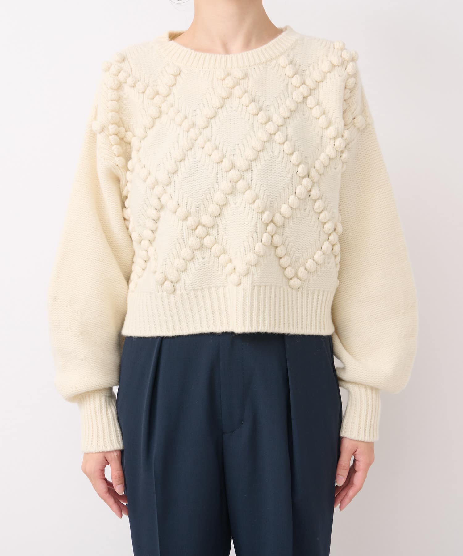 トレンドのクロップド丈に施したダイヤ柄のポップコーンがポイントのニットプルオーバー。