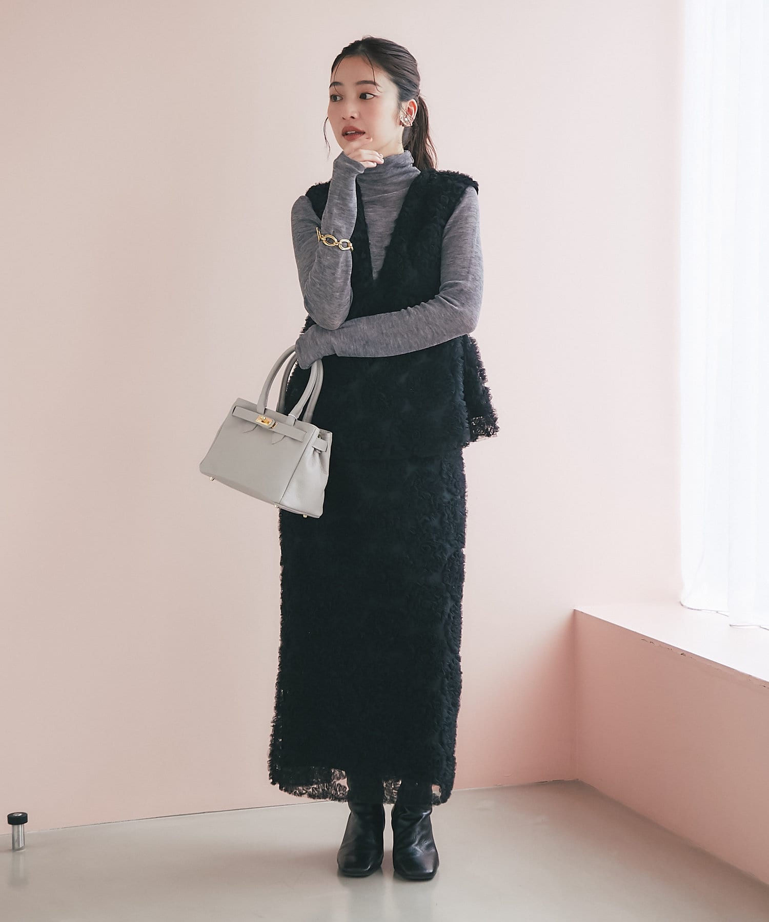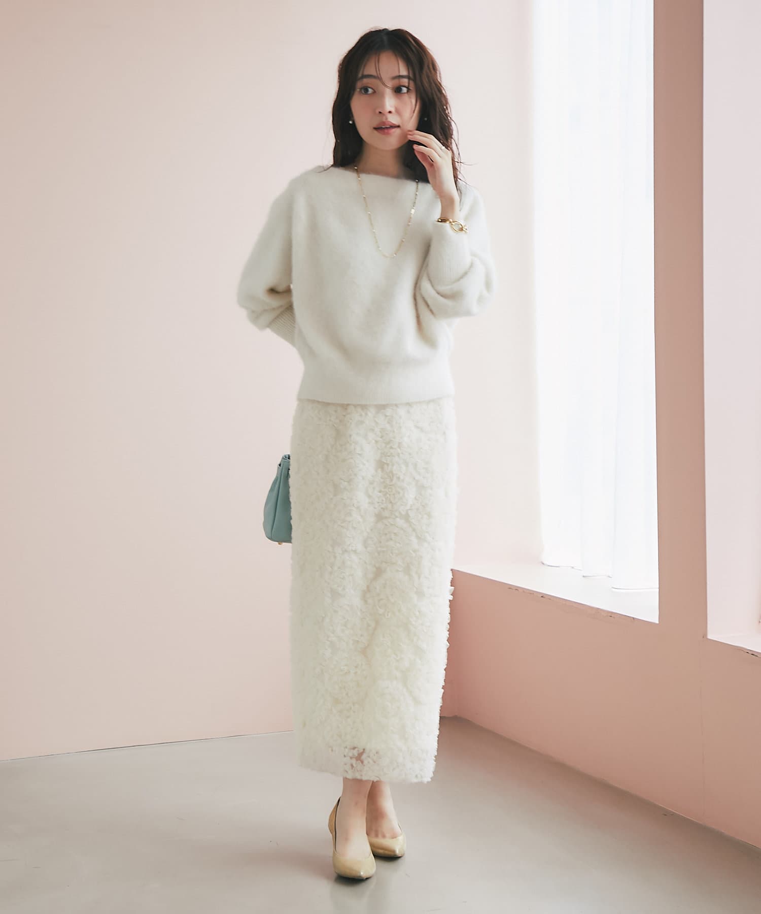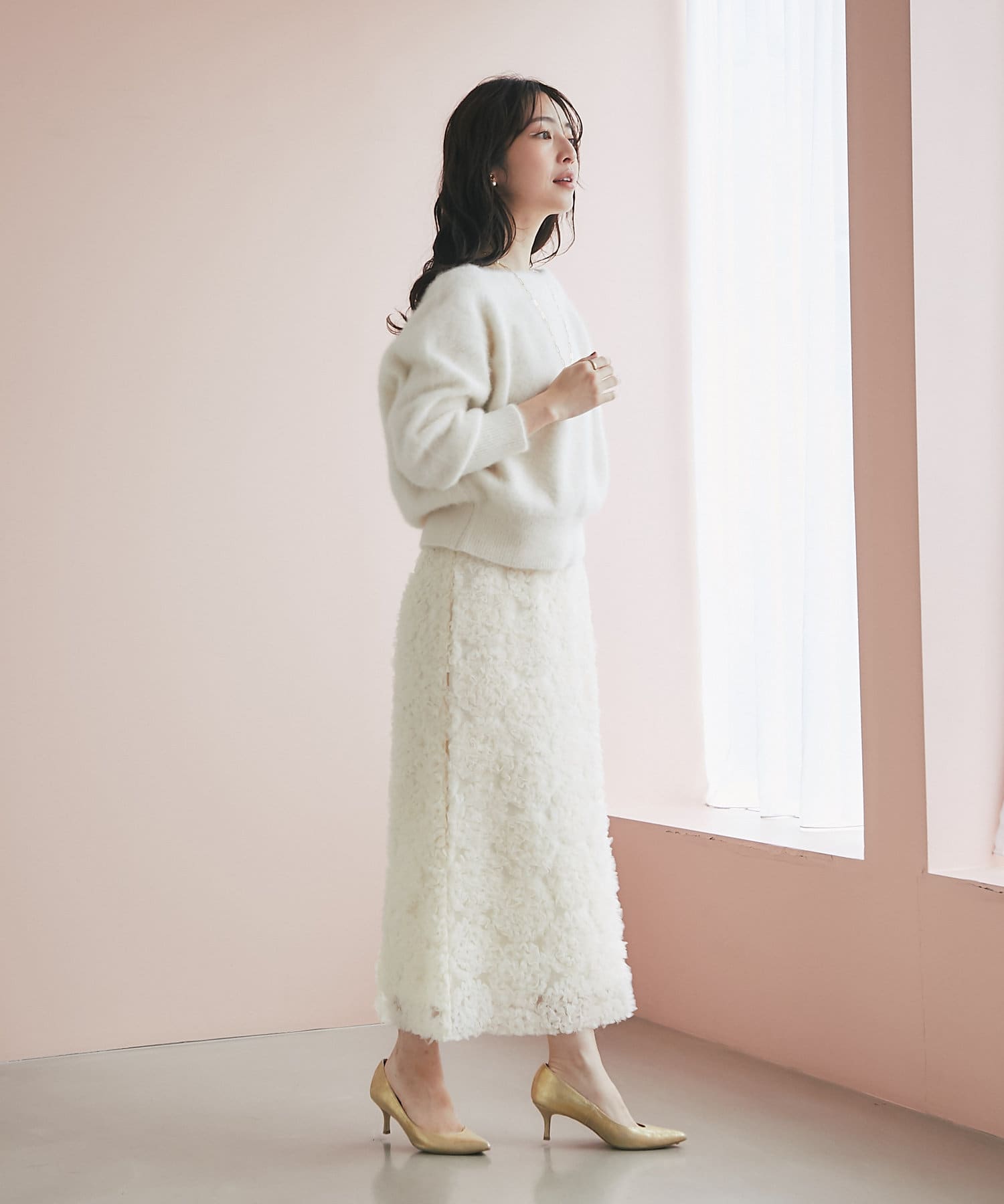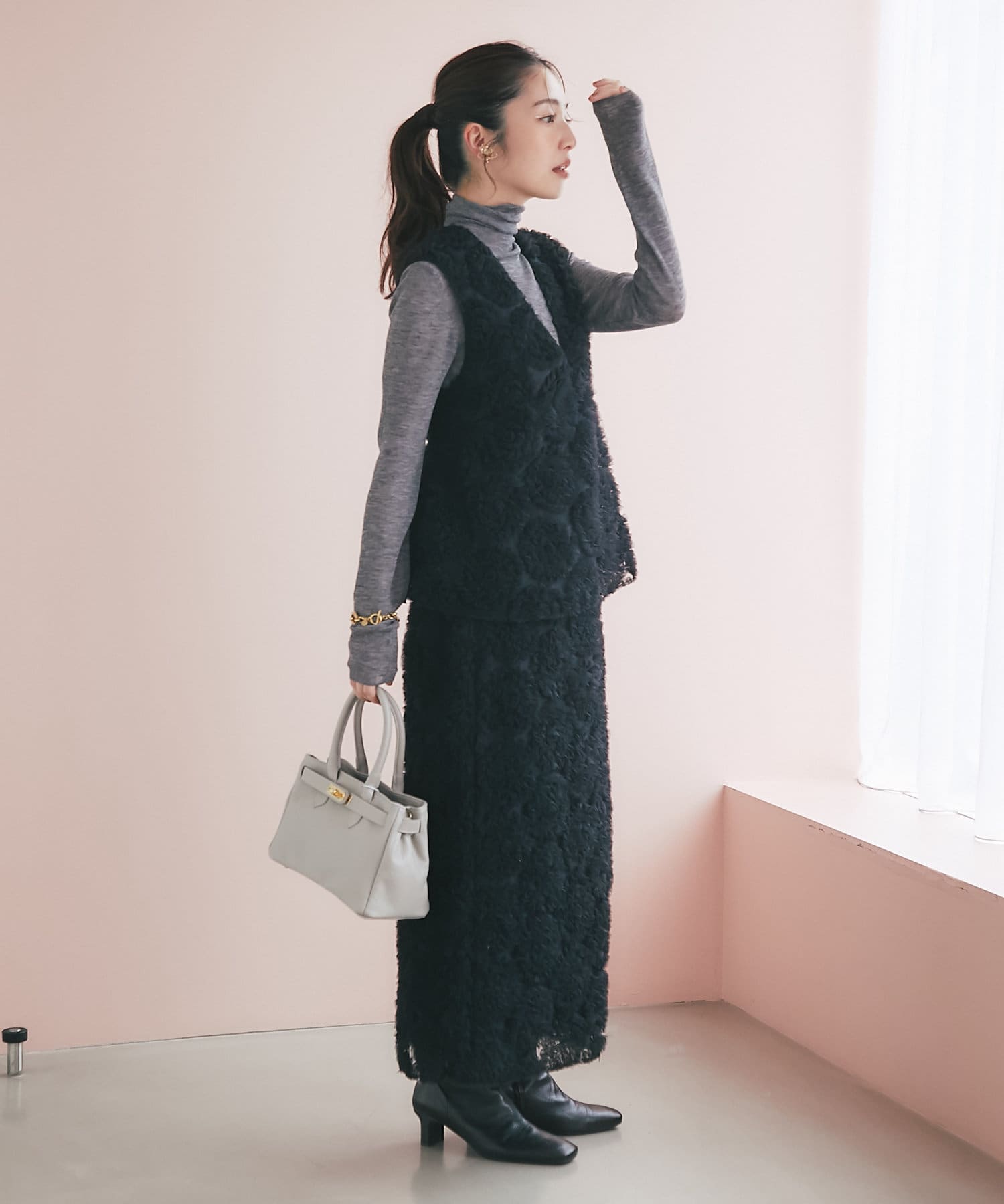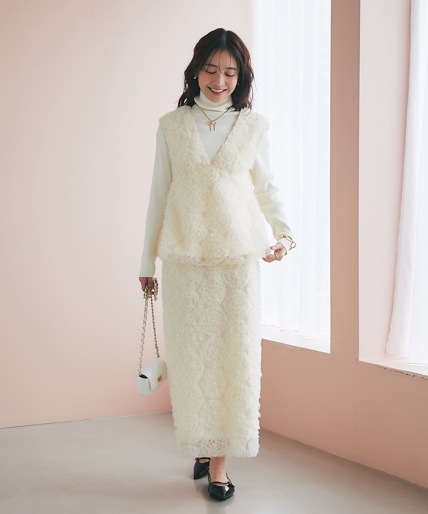 これ一枚で上品なお出かけスタイルに。セットアップの着用もおすすめです。