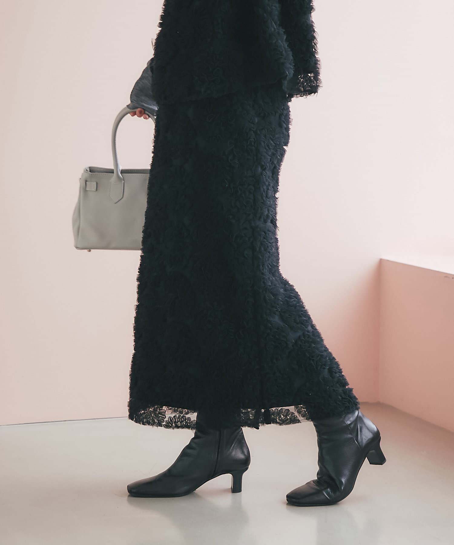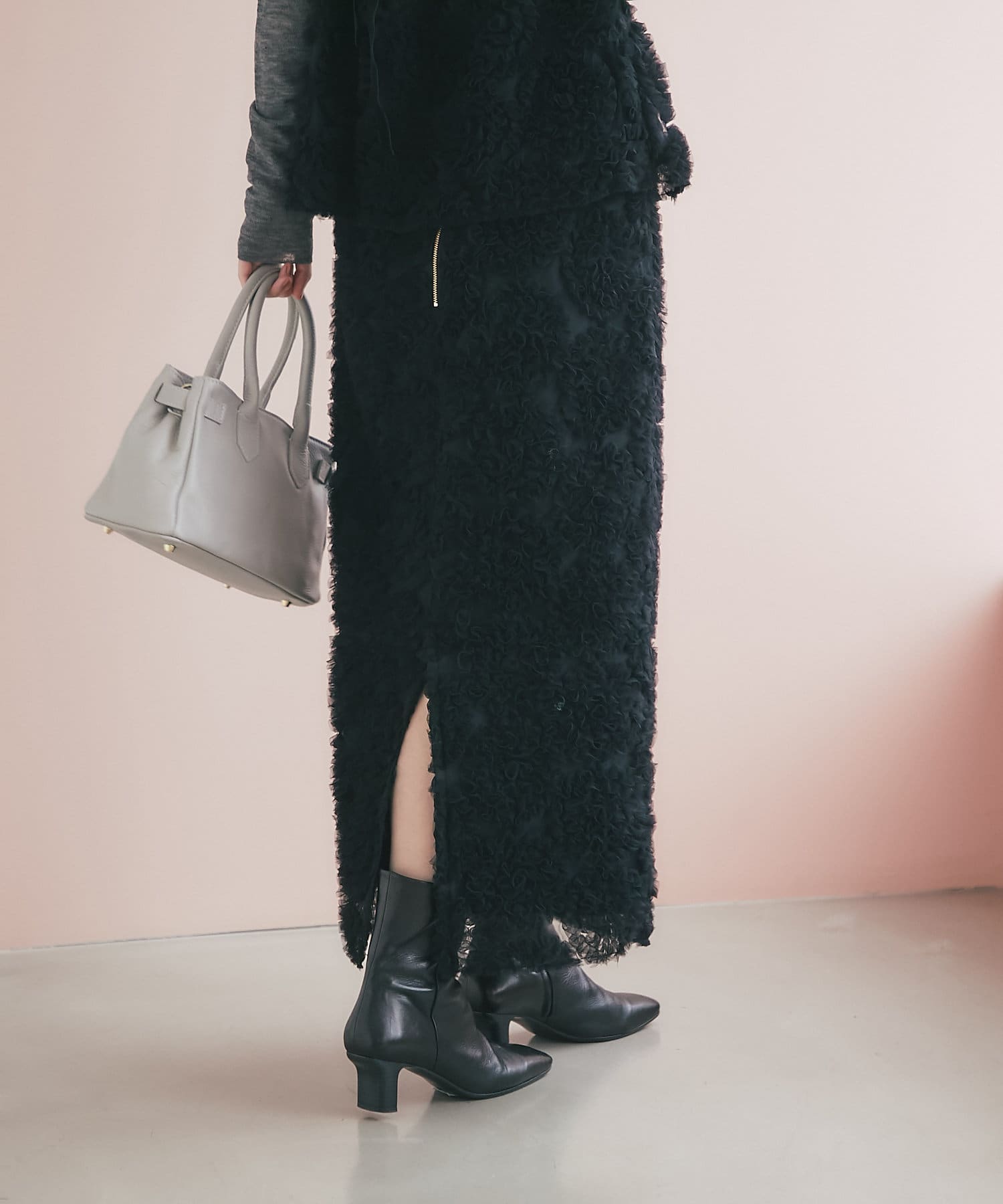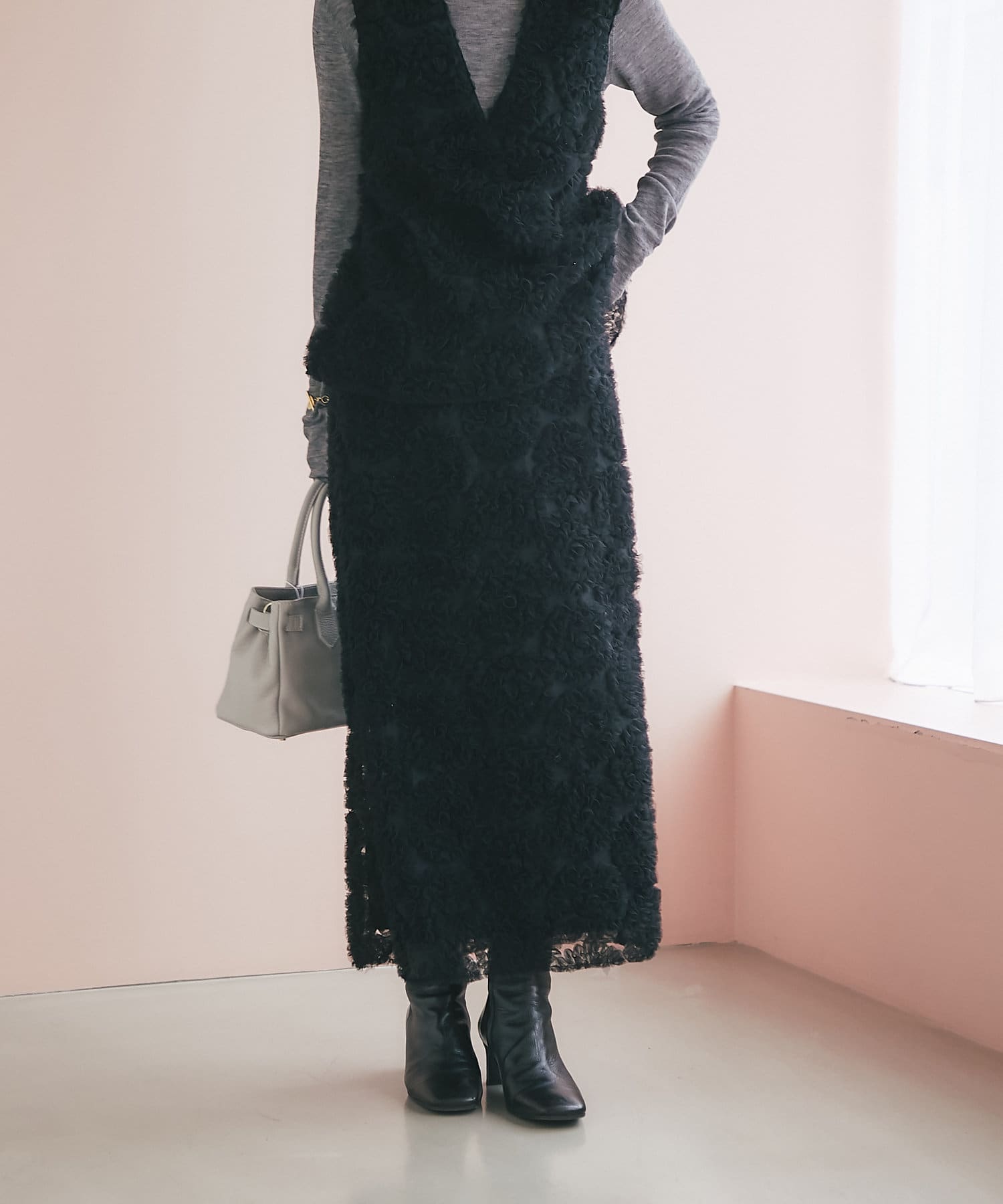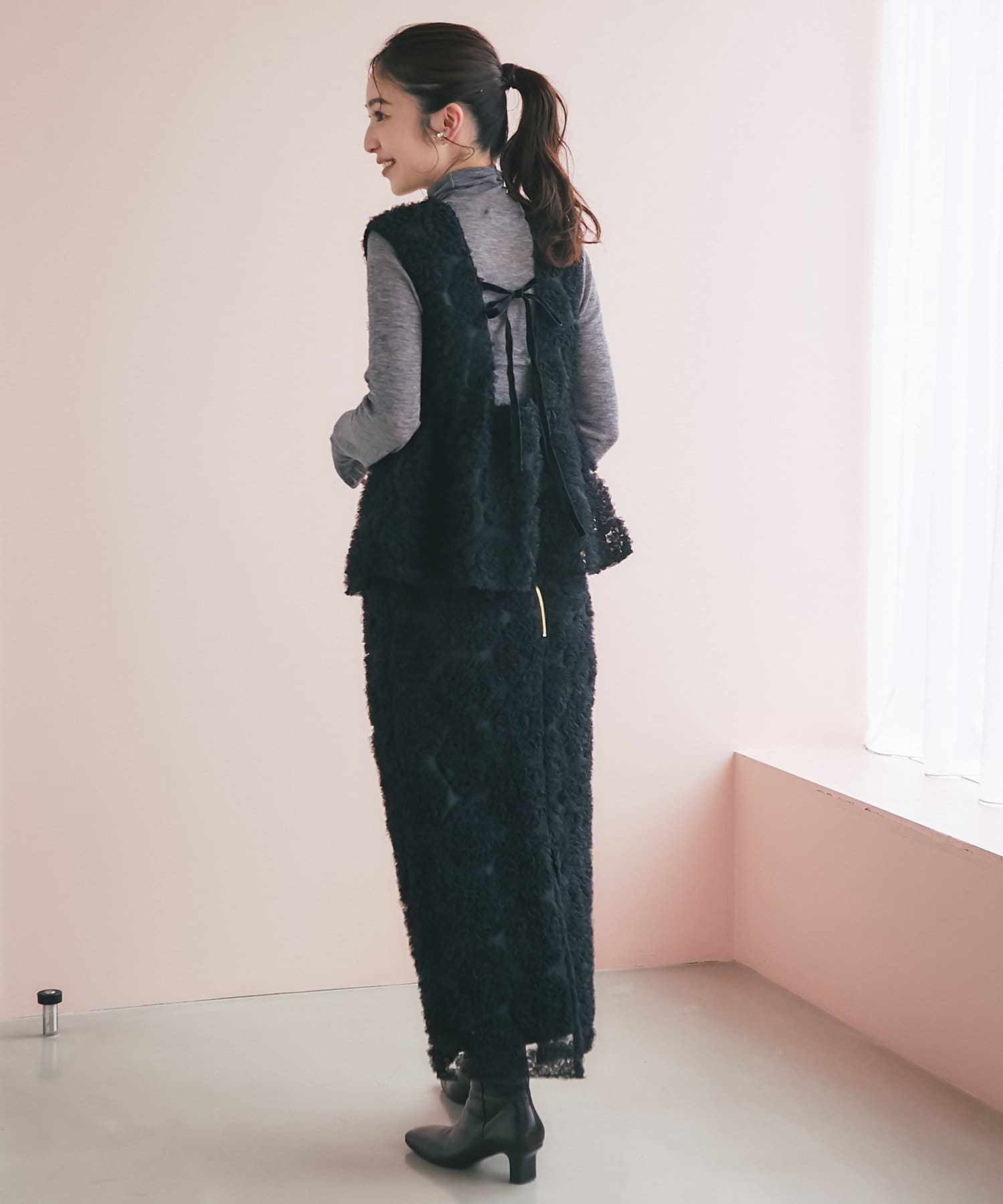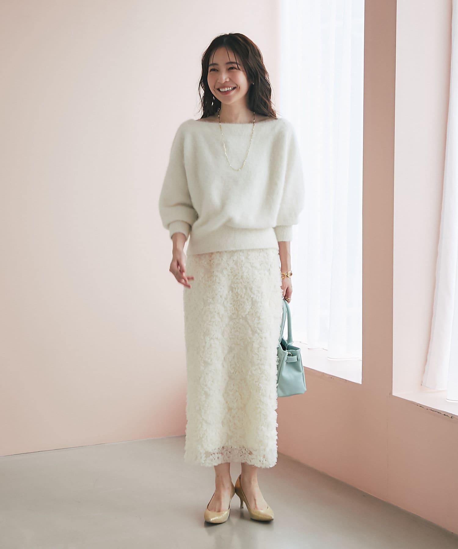 これ一枚で上品なお出かけスタイルに。セットアップの着用もおすすめです。