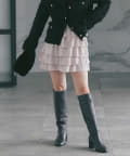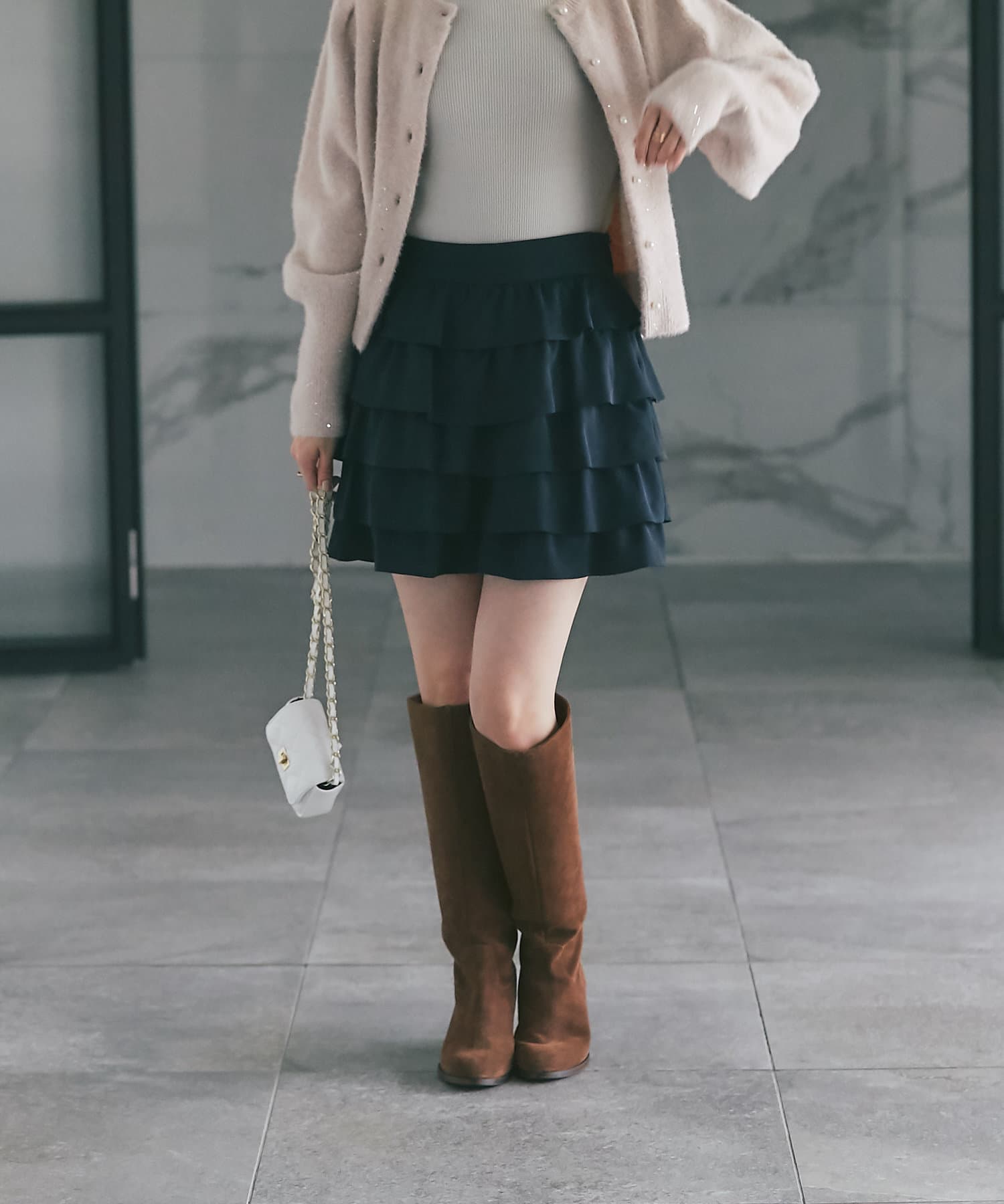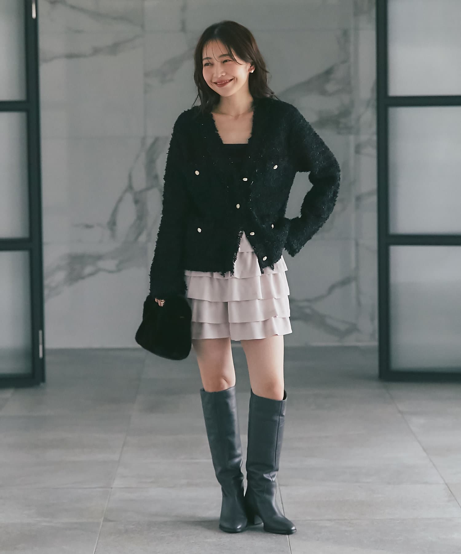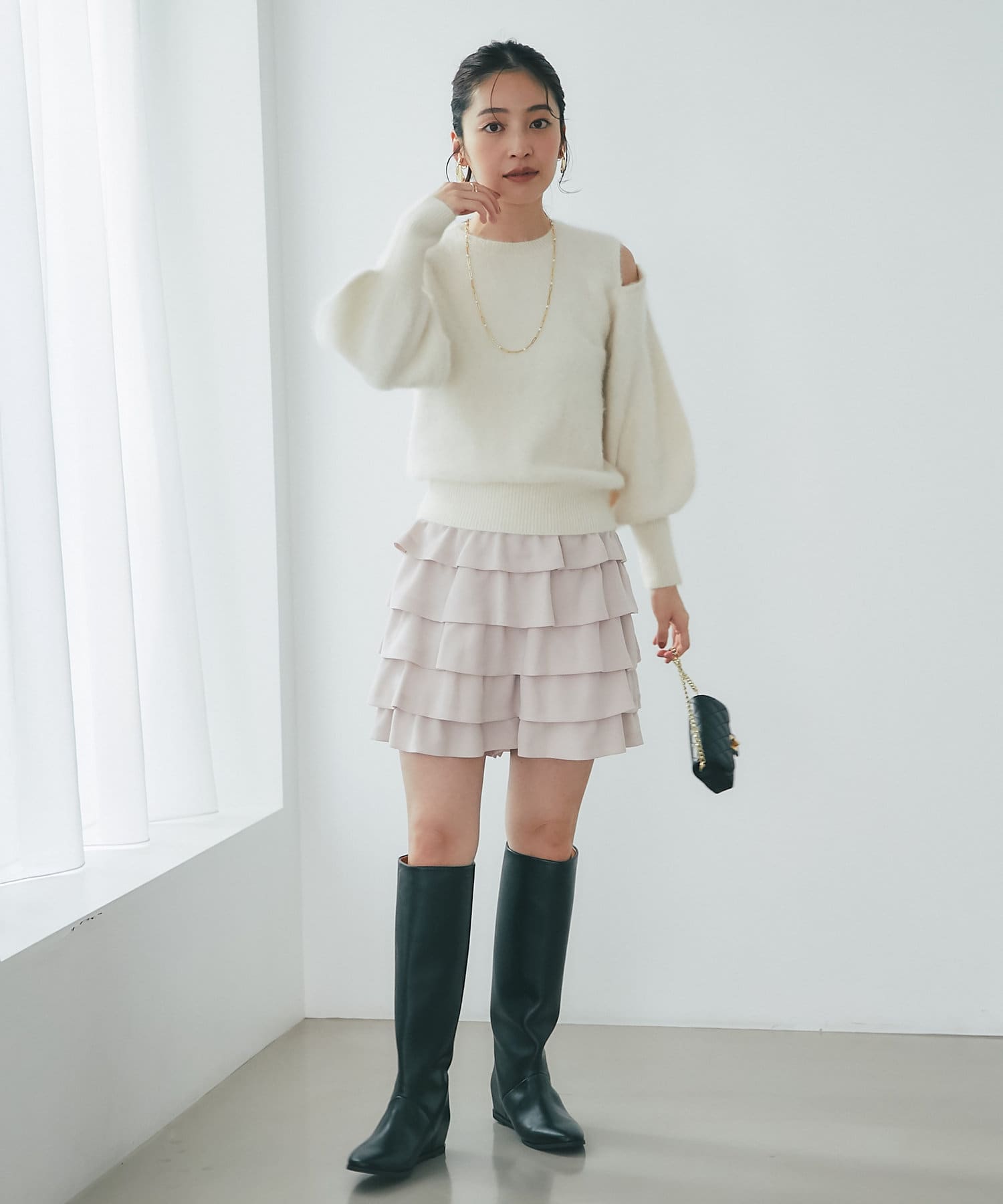 毛足のあるニットや着丈が長めのトップスの下からフリルが出るようなスタイリングがお勧めです。