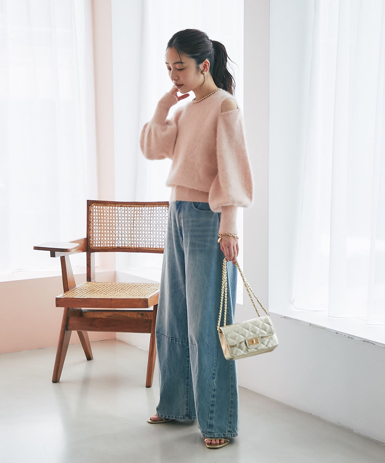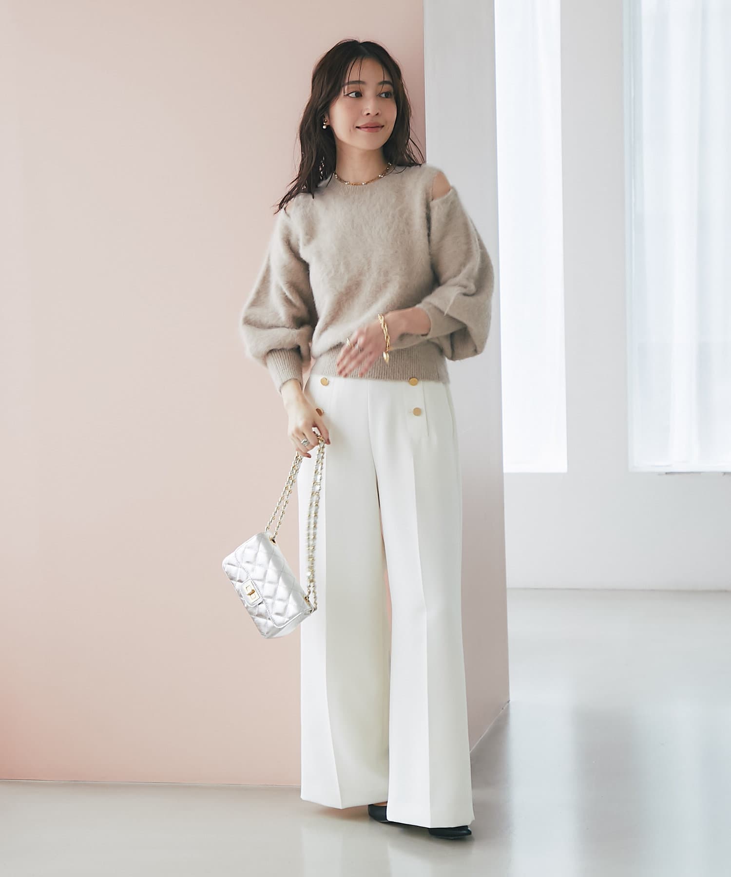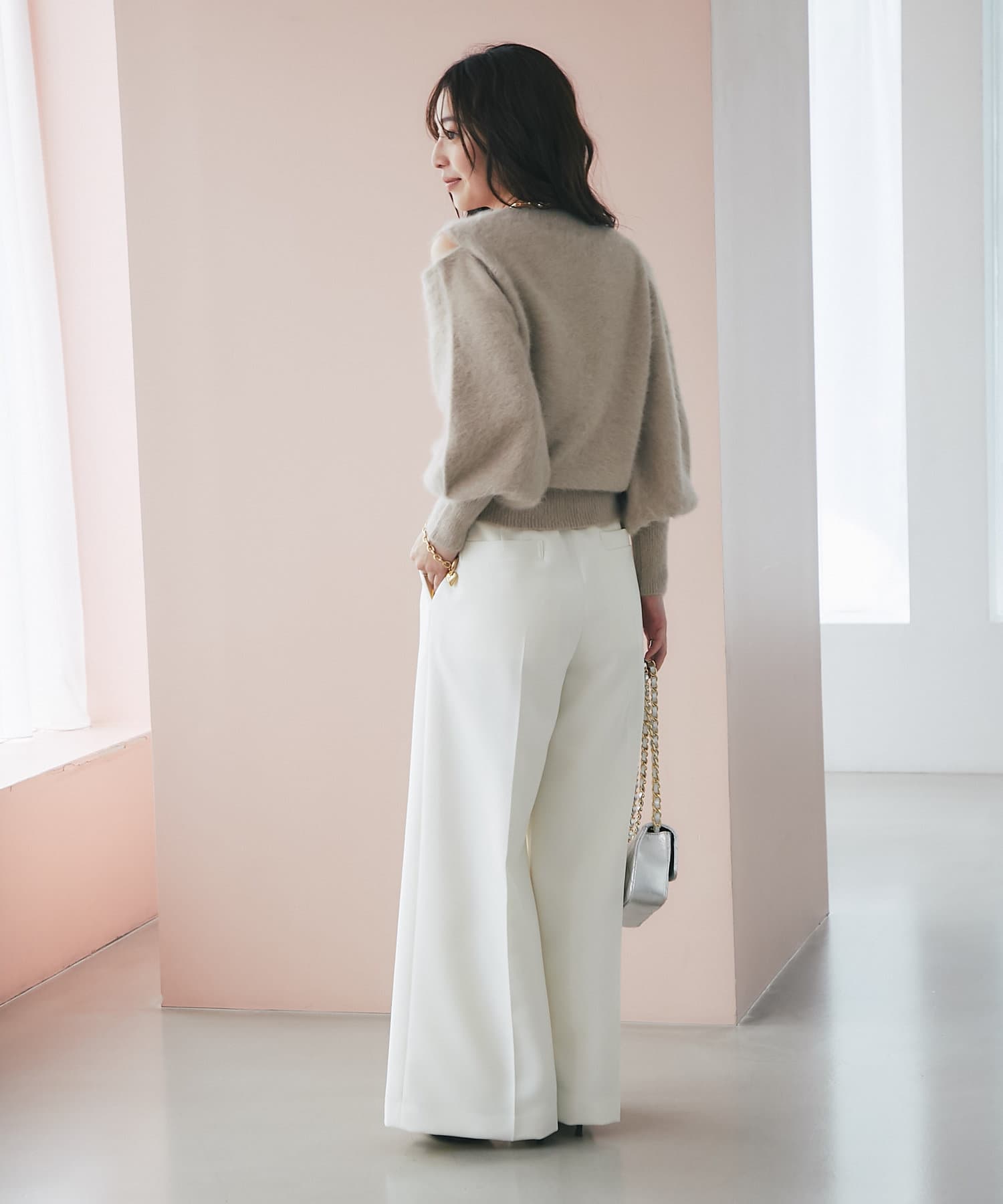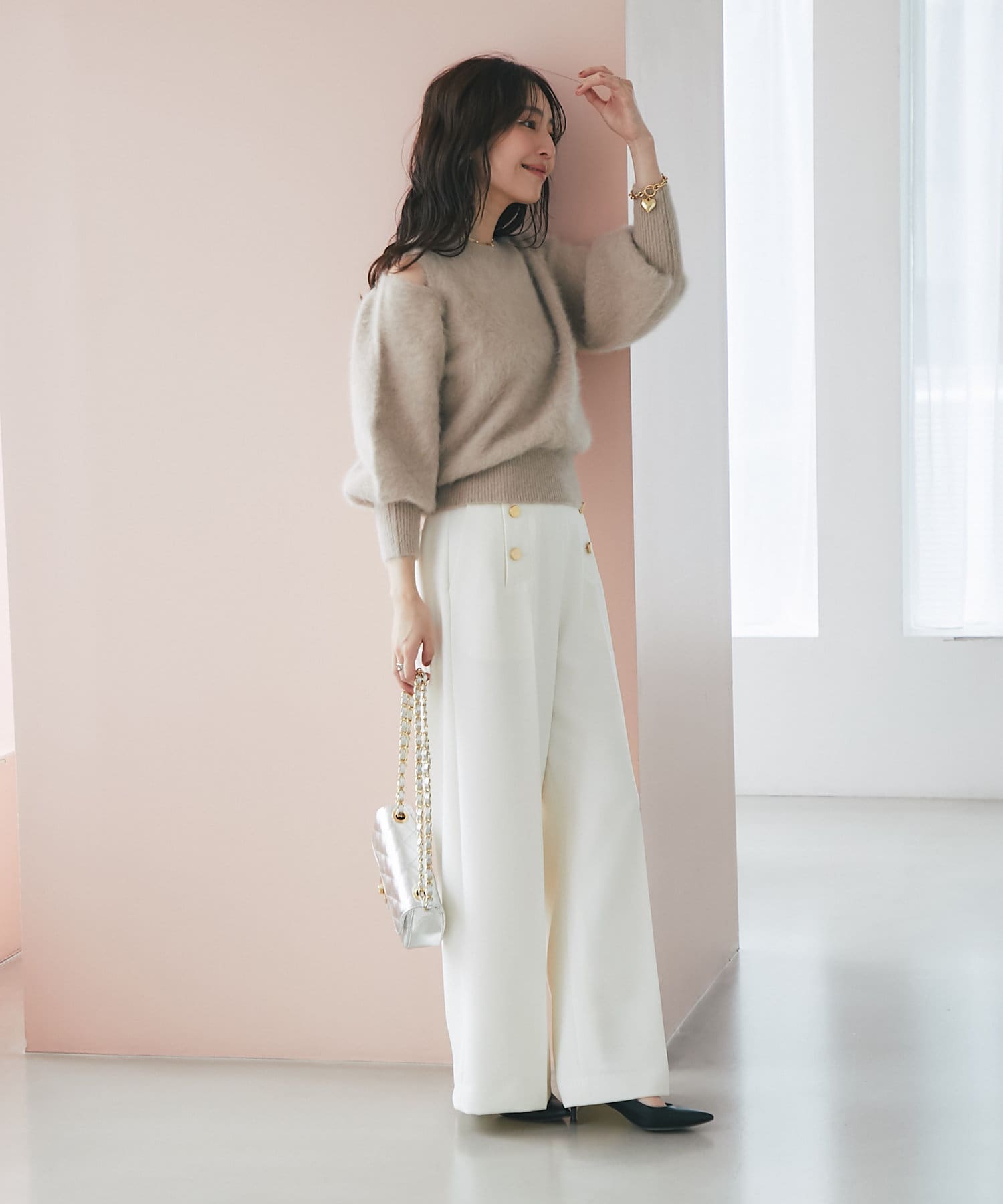 詰まった襟ぐりに肩の開いた抜け感のあるデザイン。
