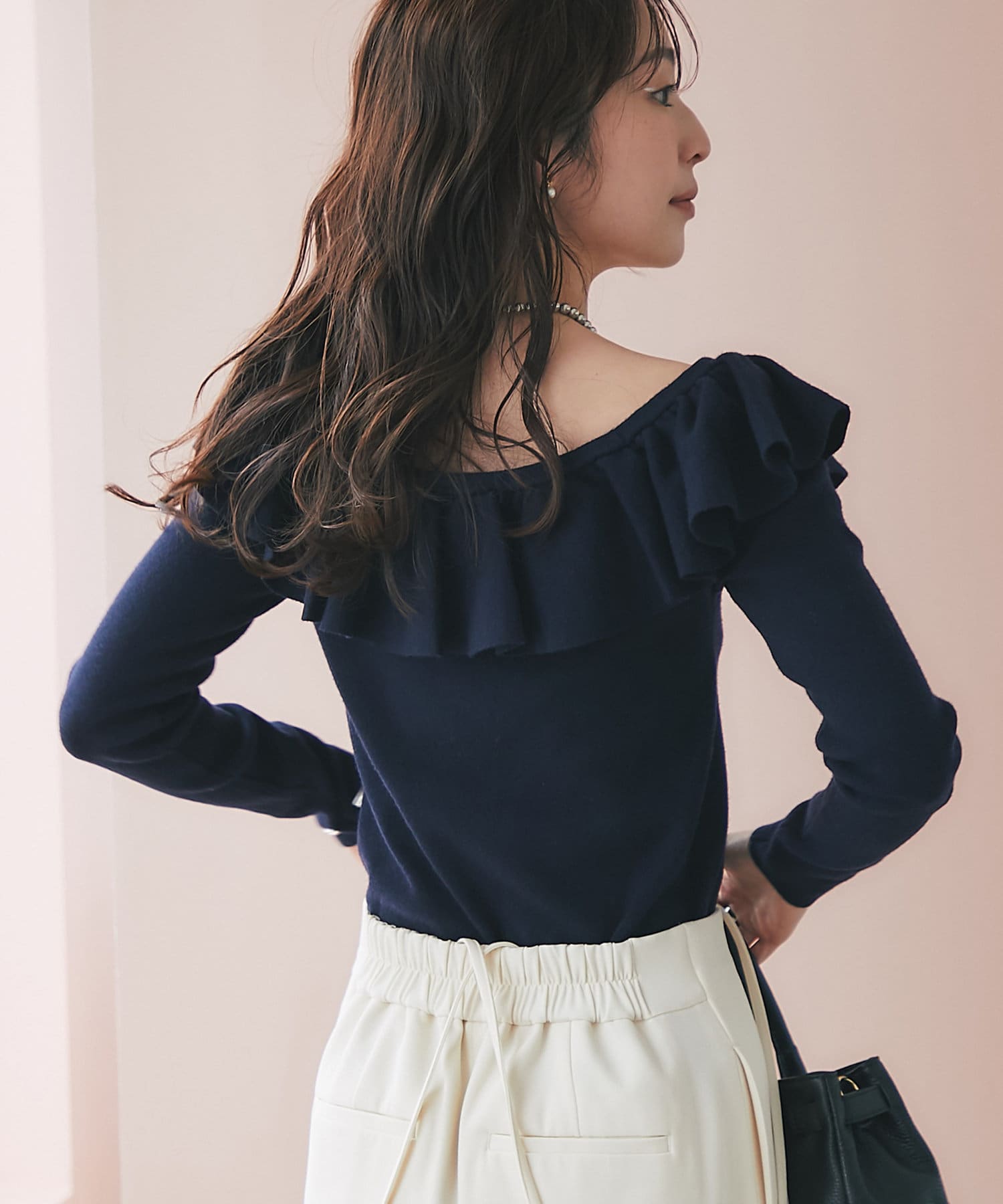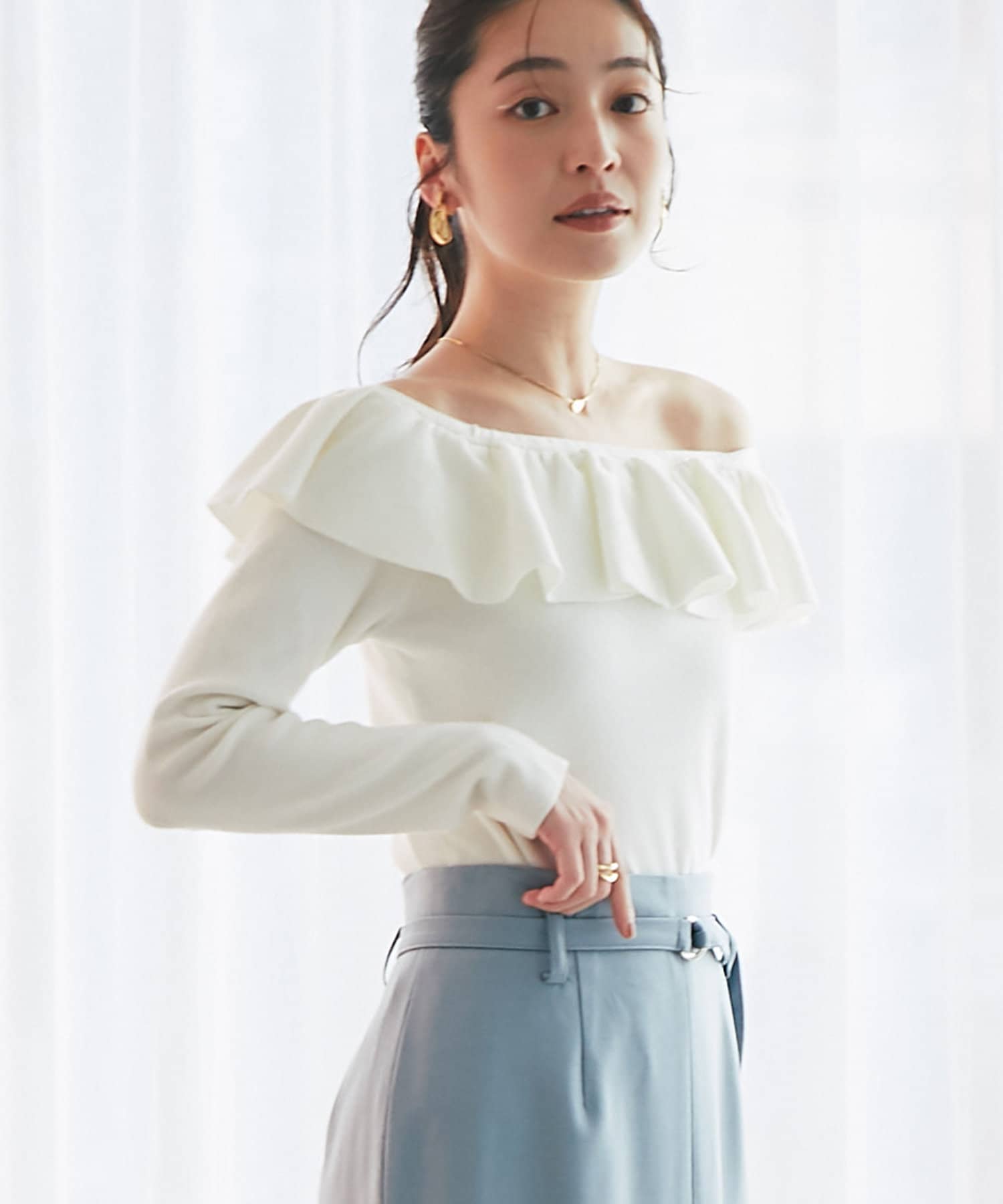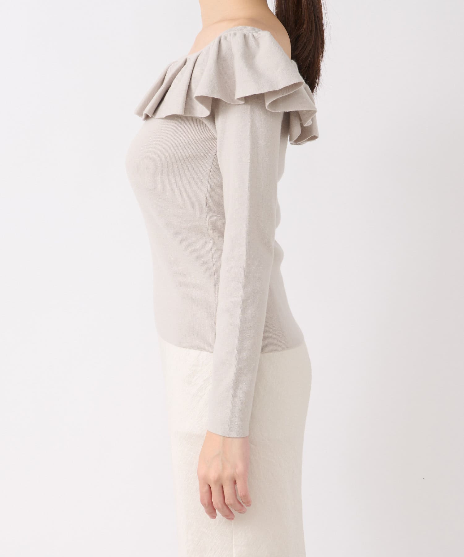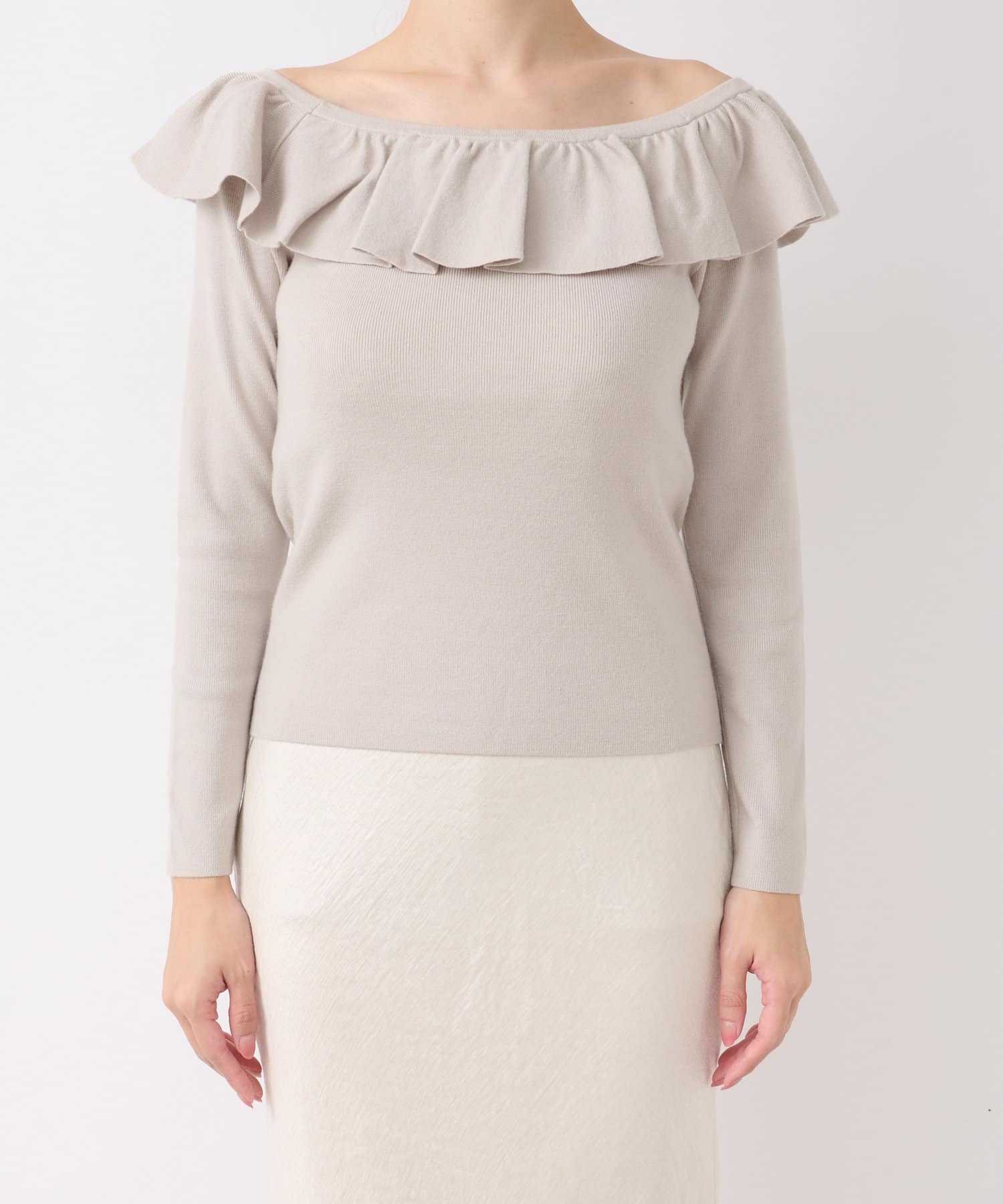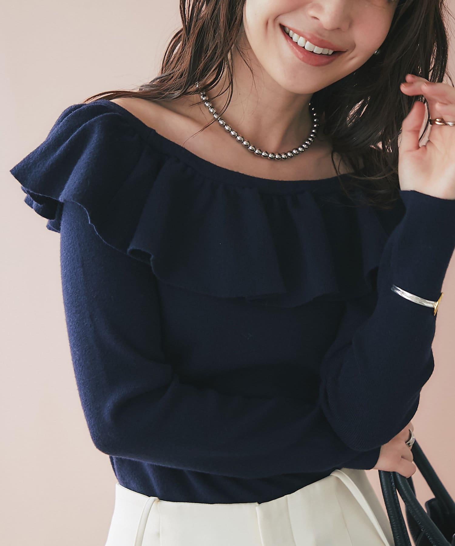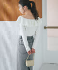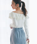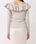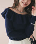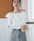 ラッフルが華やかなアクセントをプラスしてくれるオフショルニット。