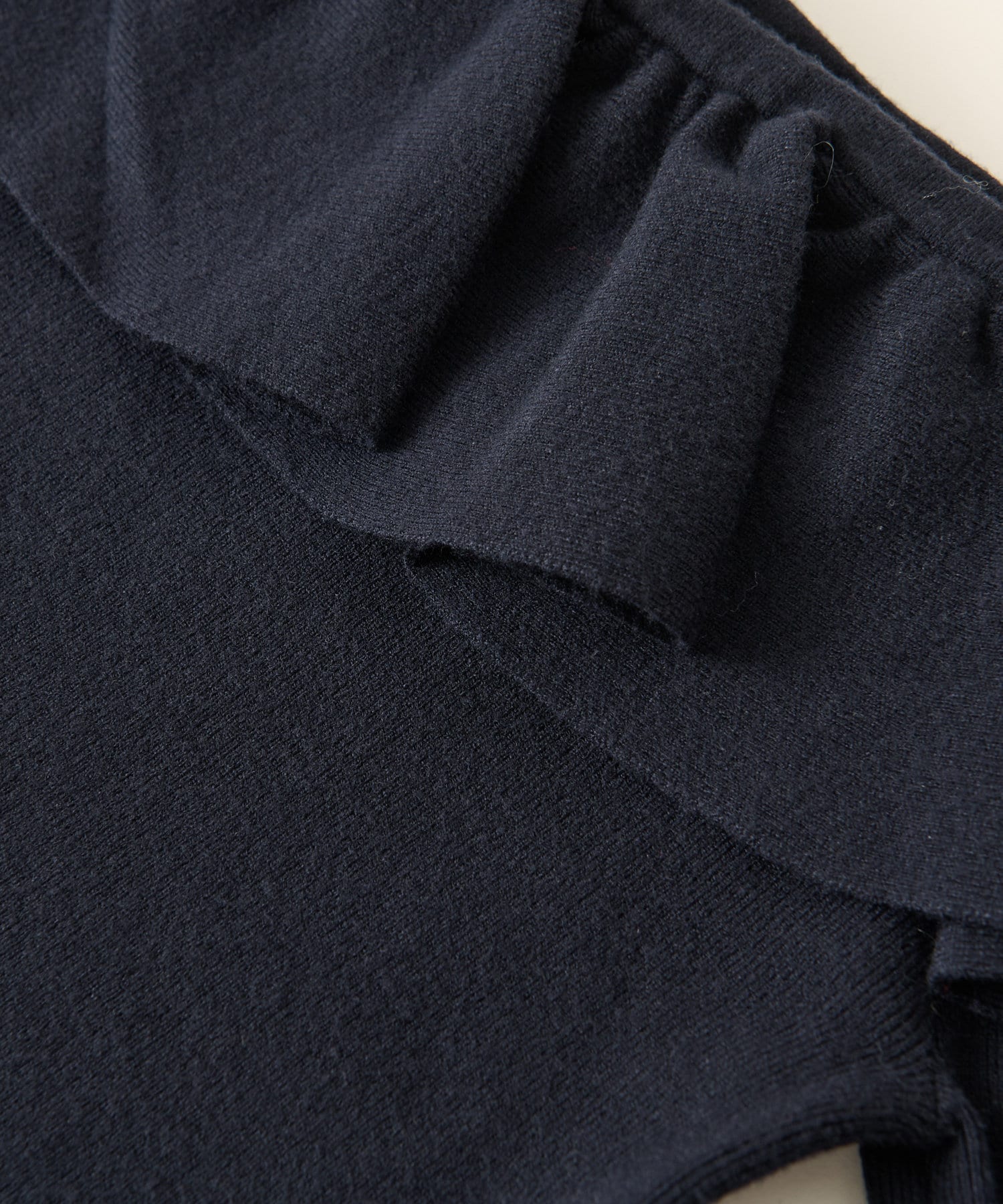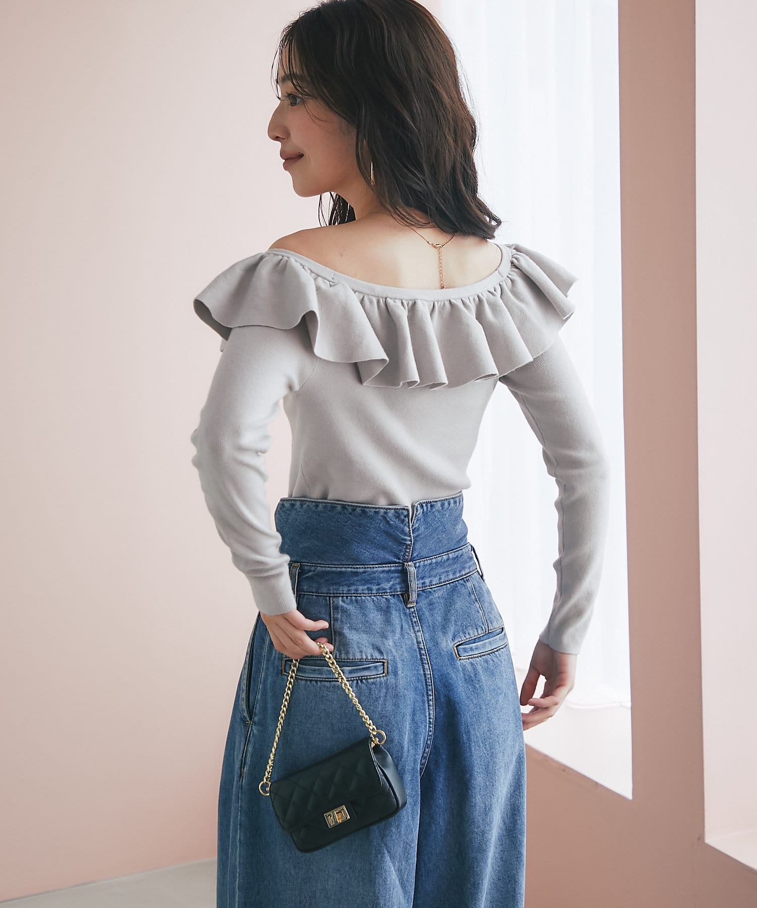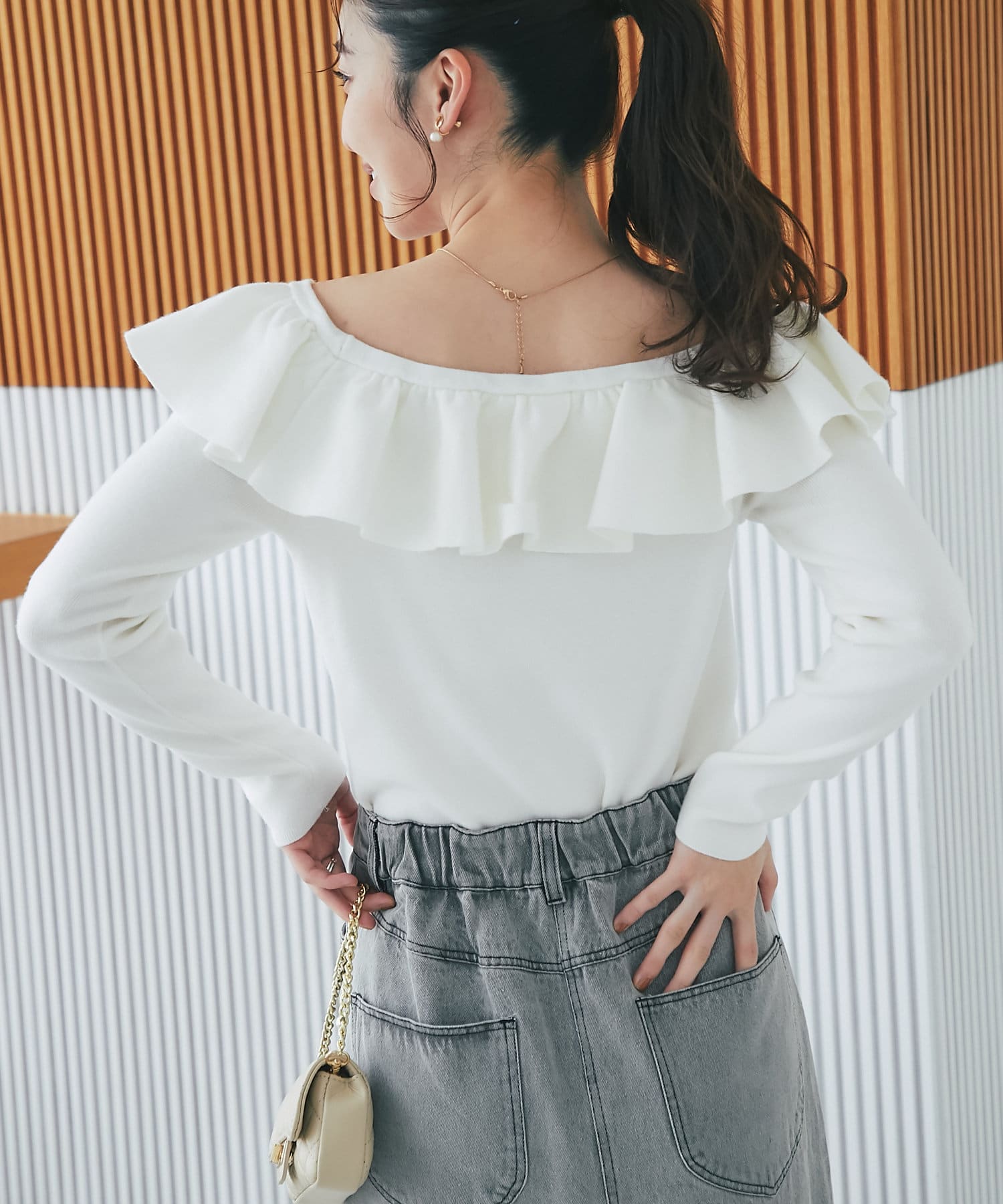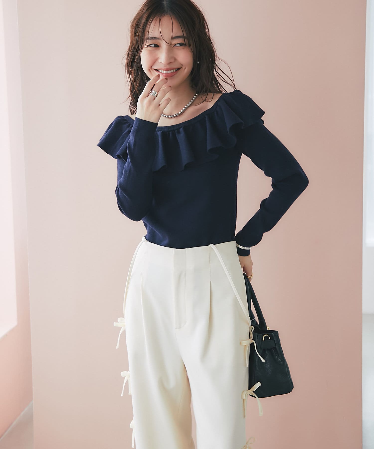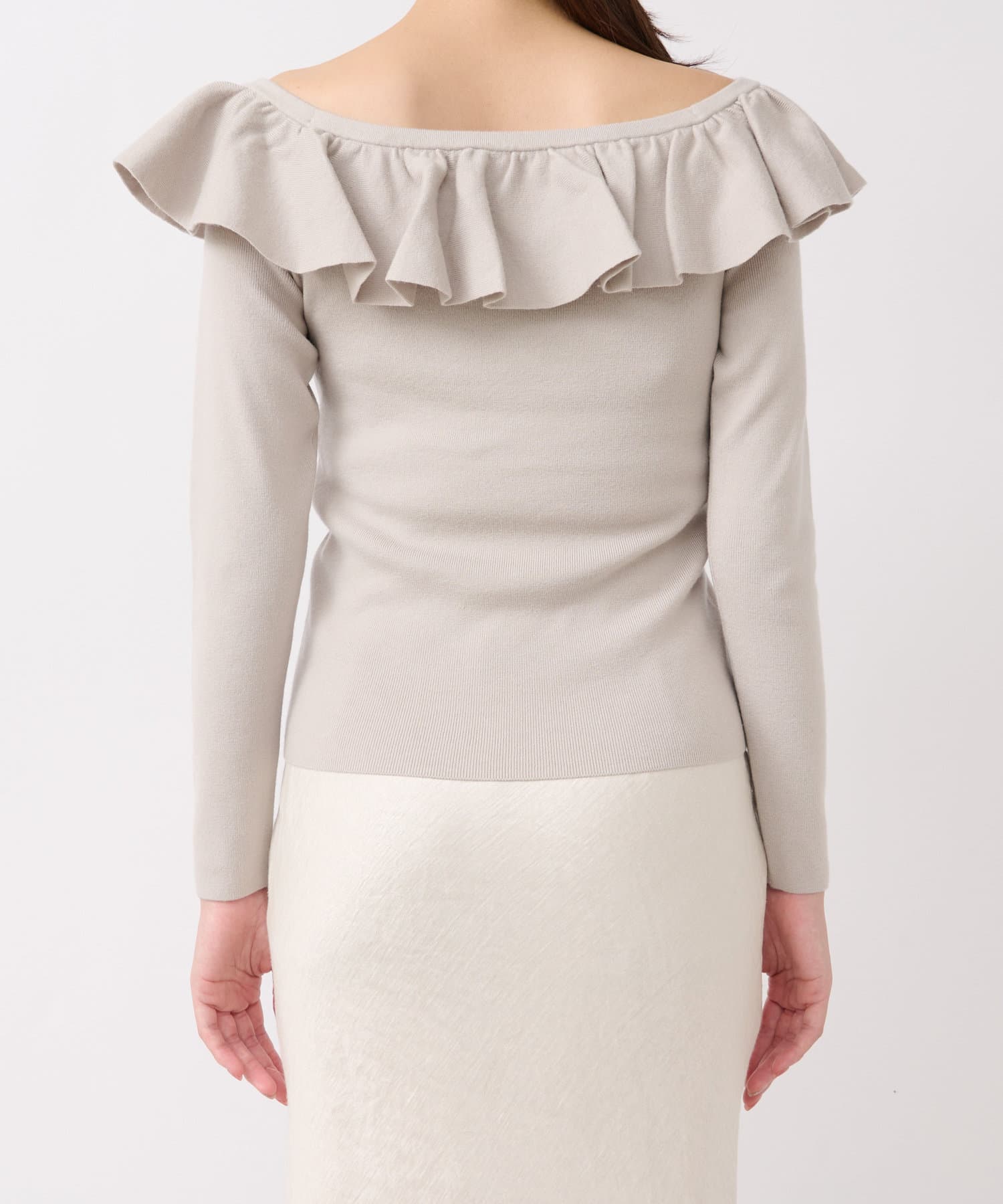 ラッフルが華やかなアクセントをプラスしてくれるオフショルニット。