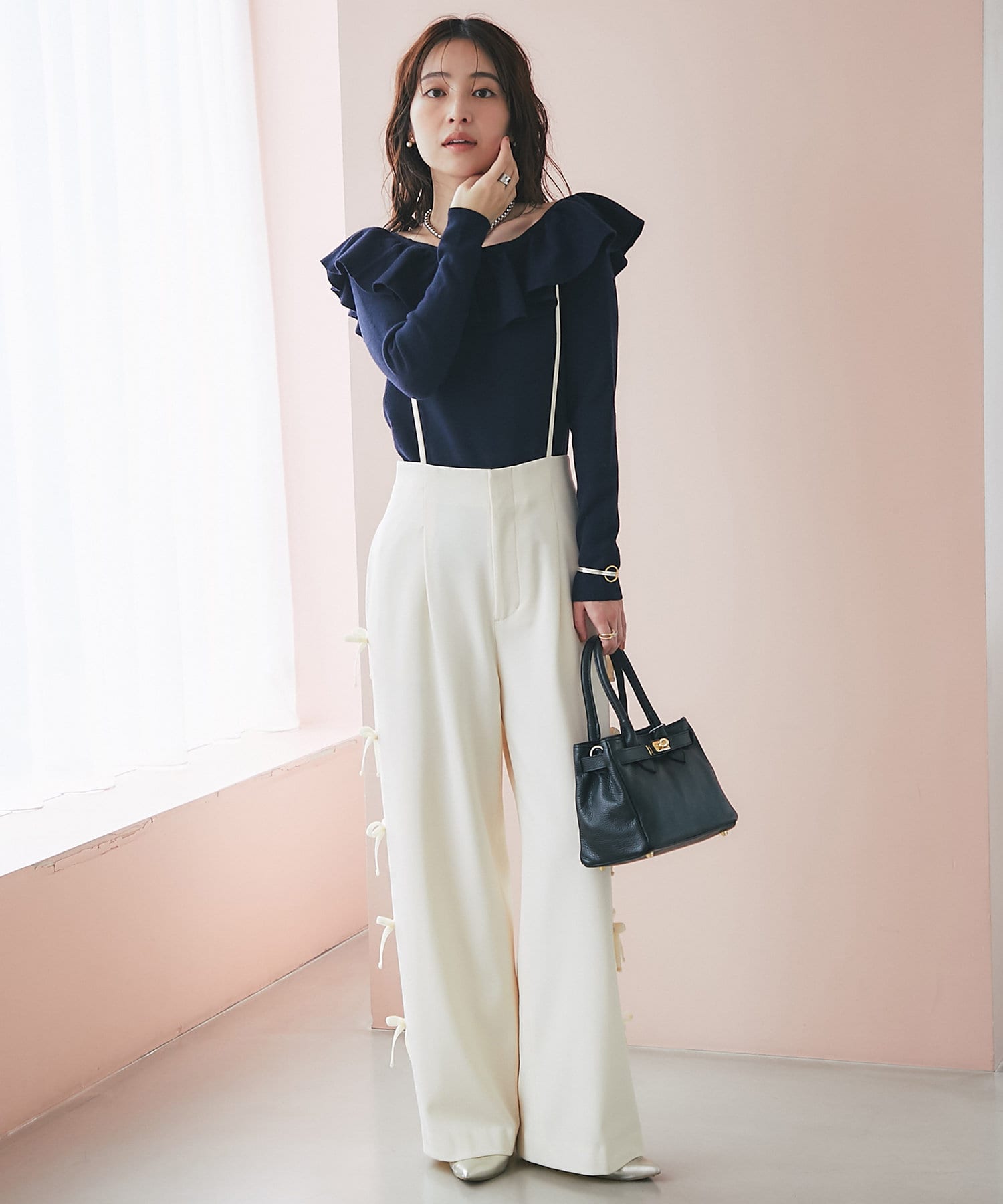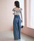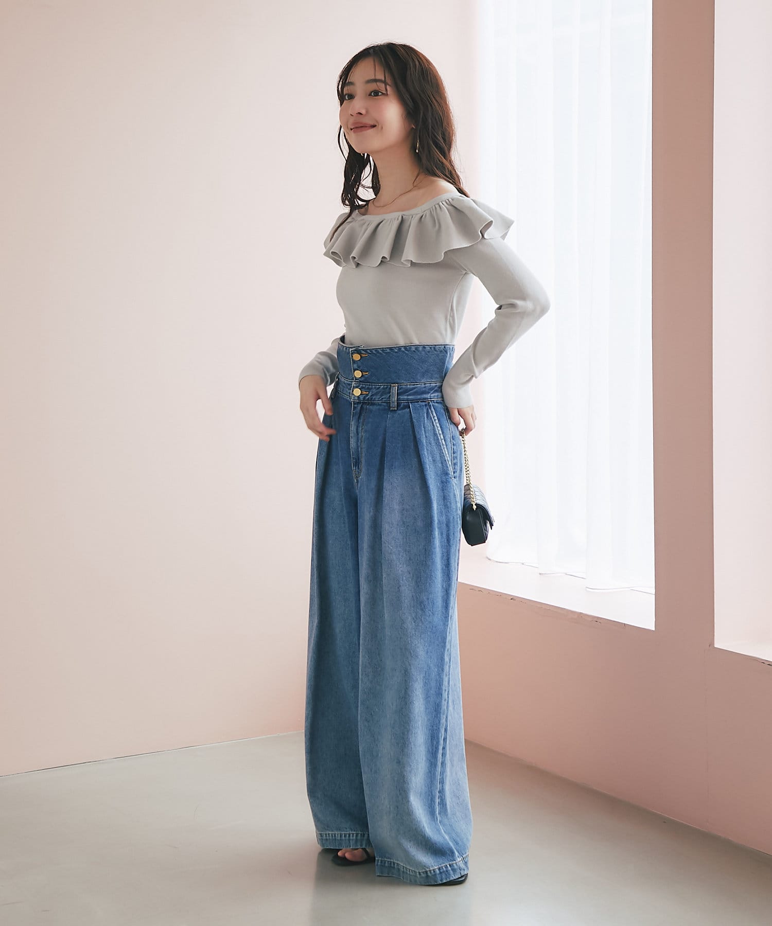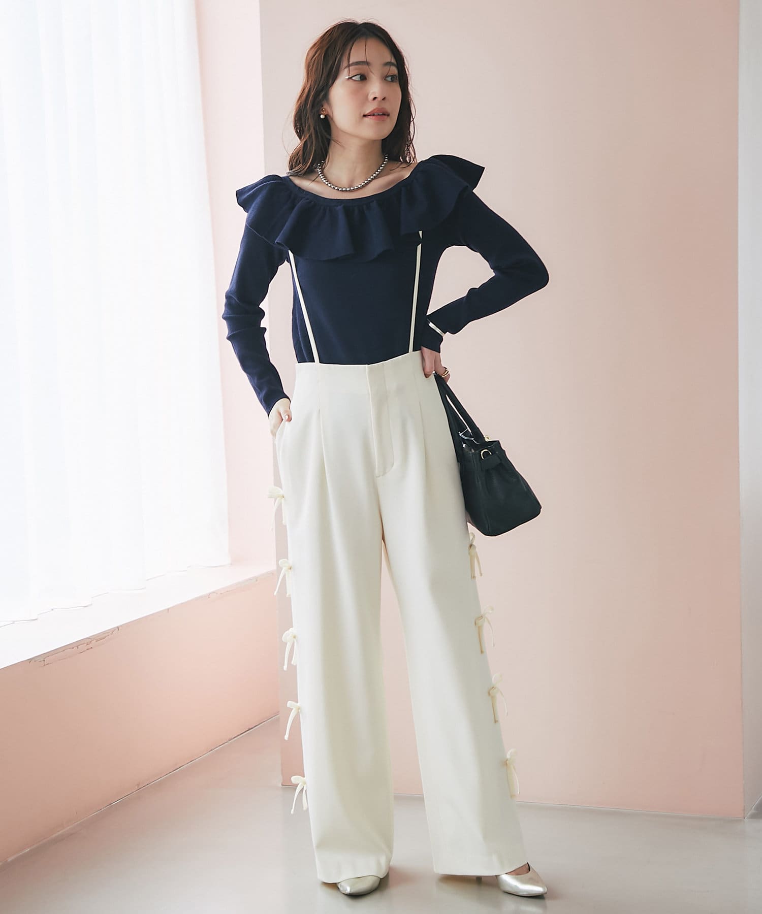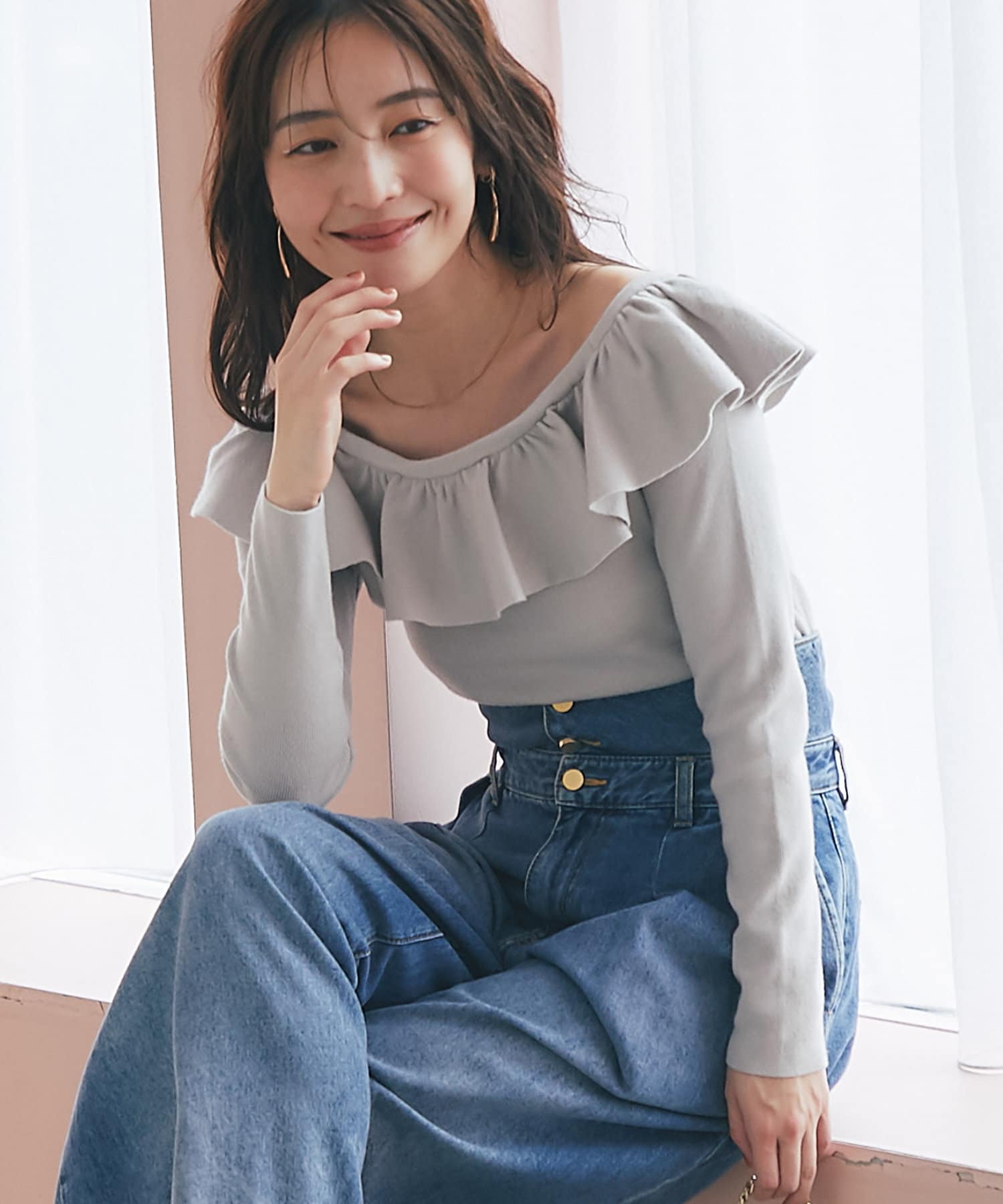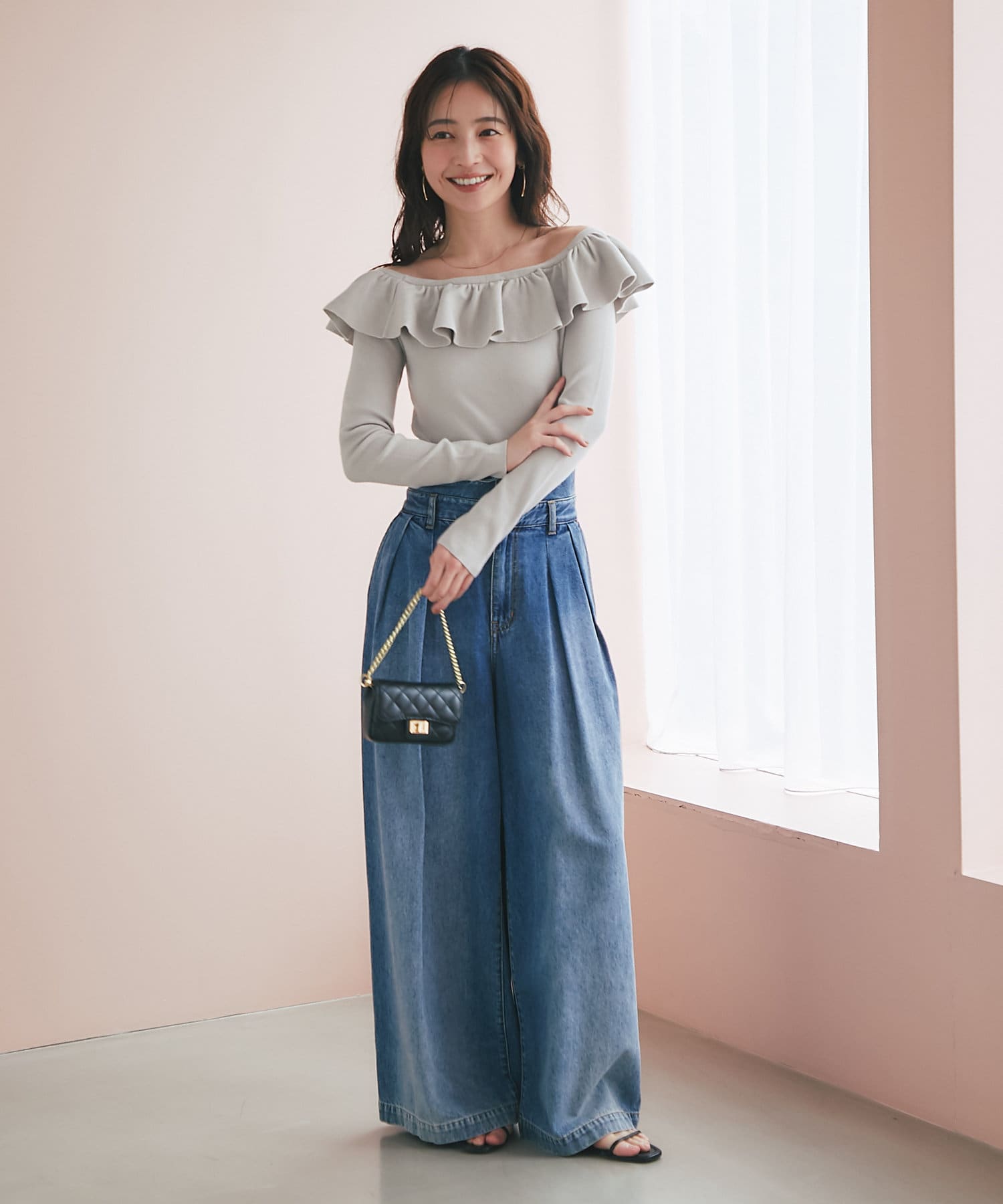 ラッフルが華やかなアクセントをプラスしてくれるオフショルニット。