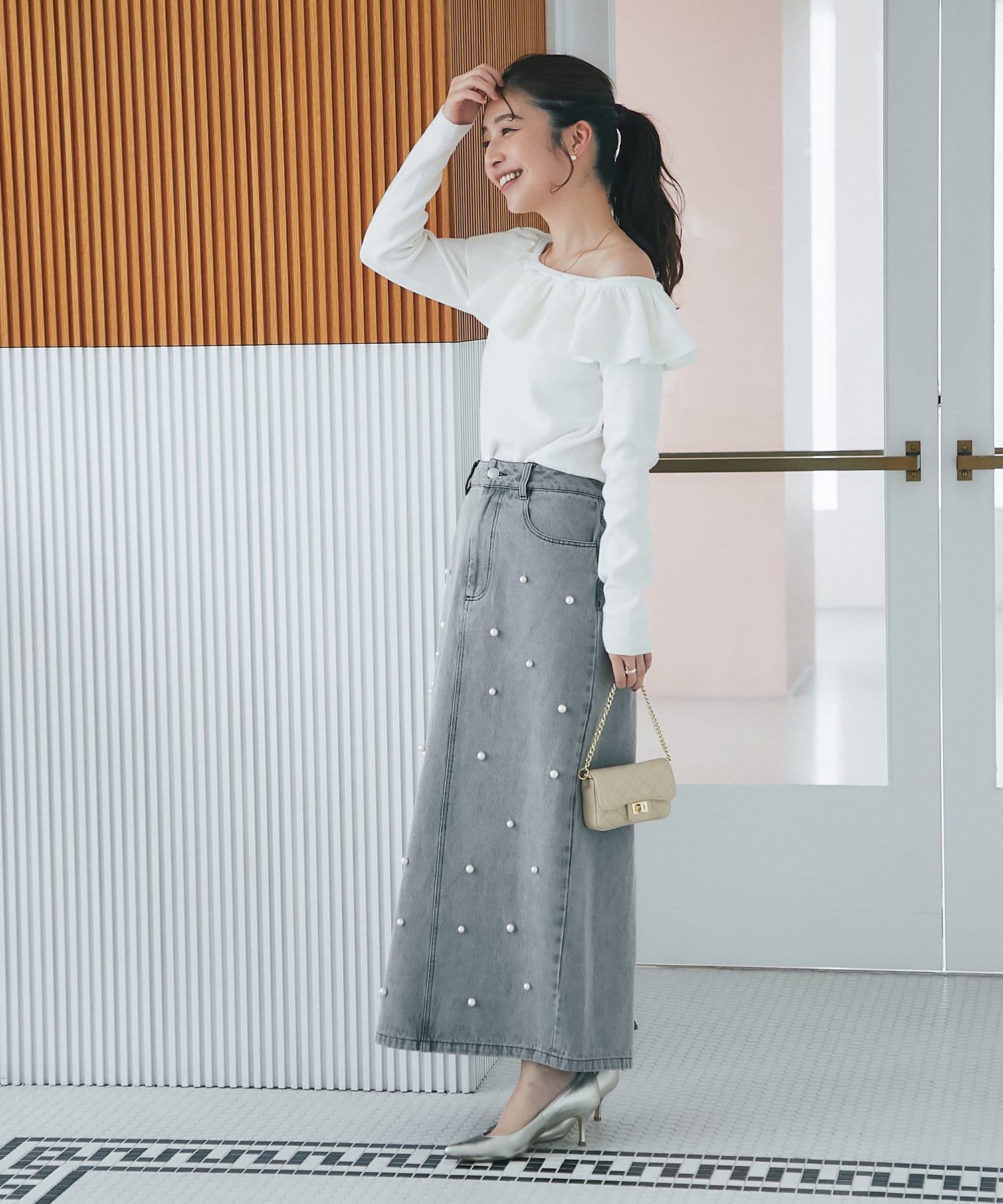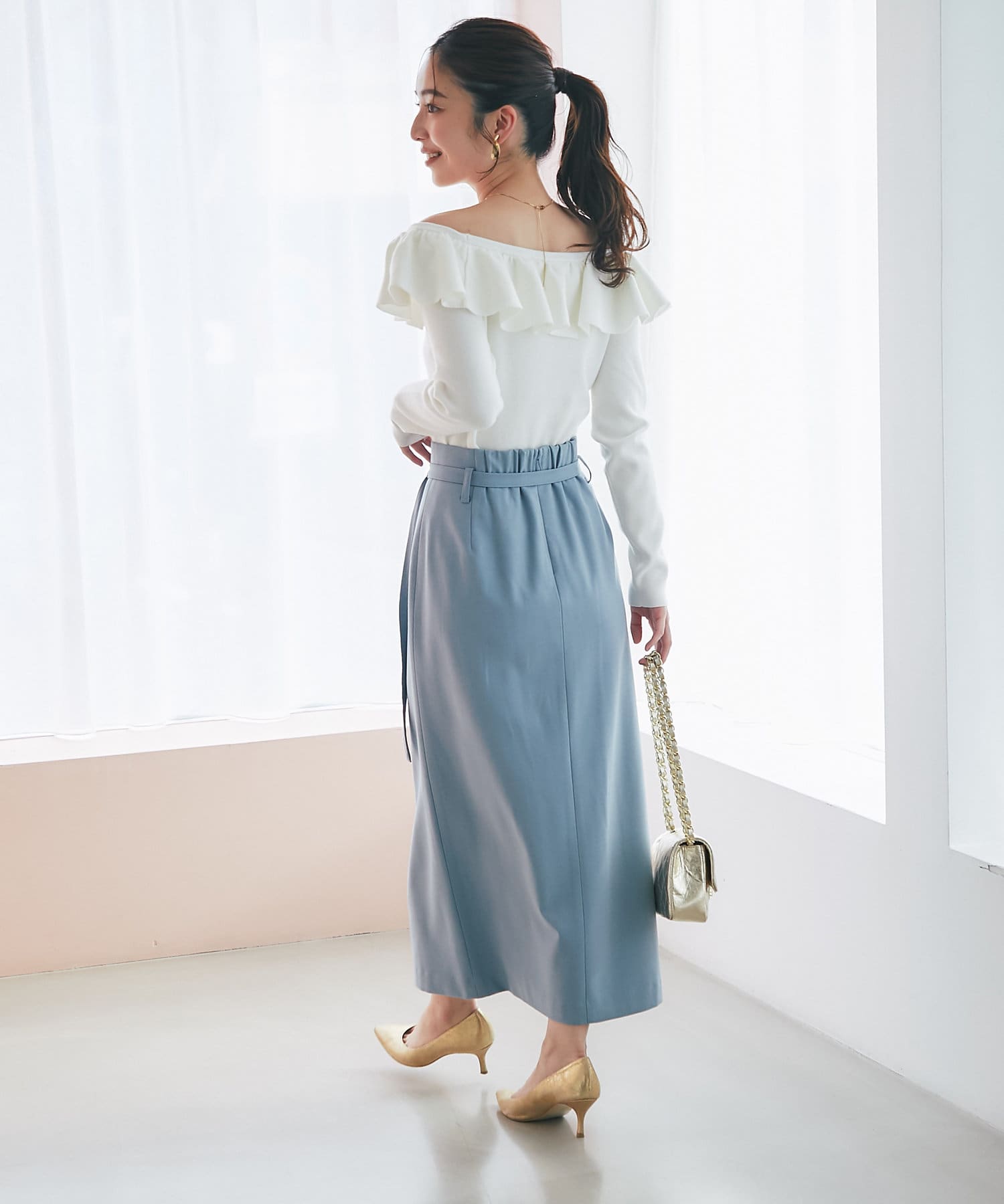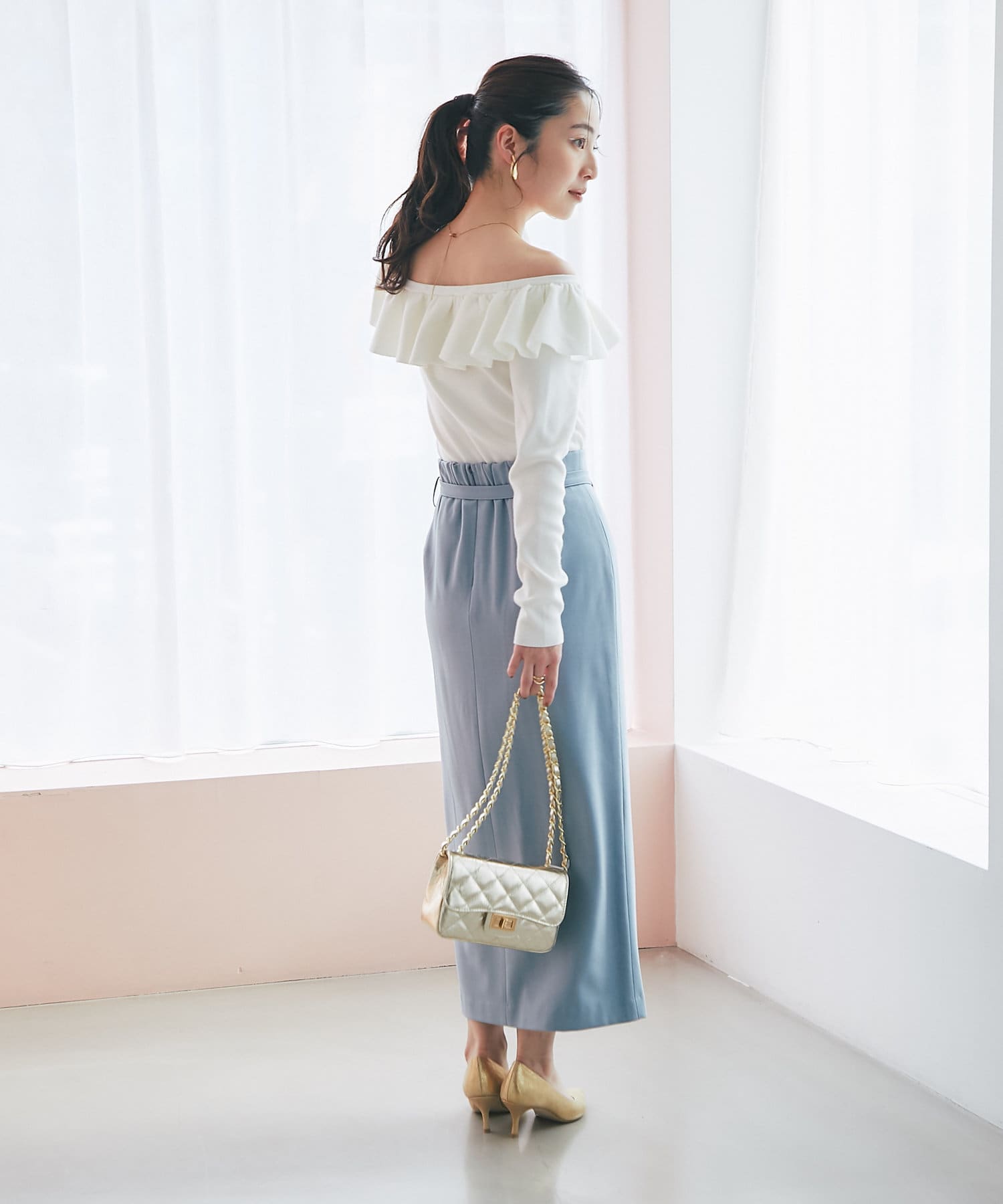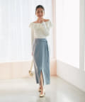 スカートと合わせてフェミニンな印象にまとめるのがおすすめ。