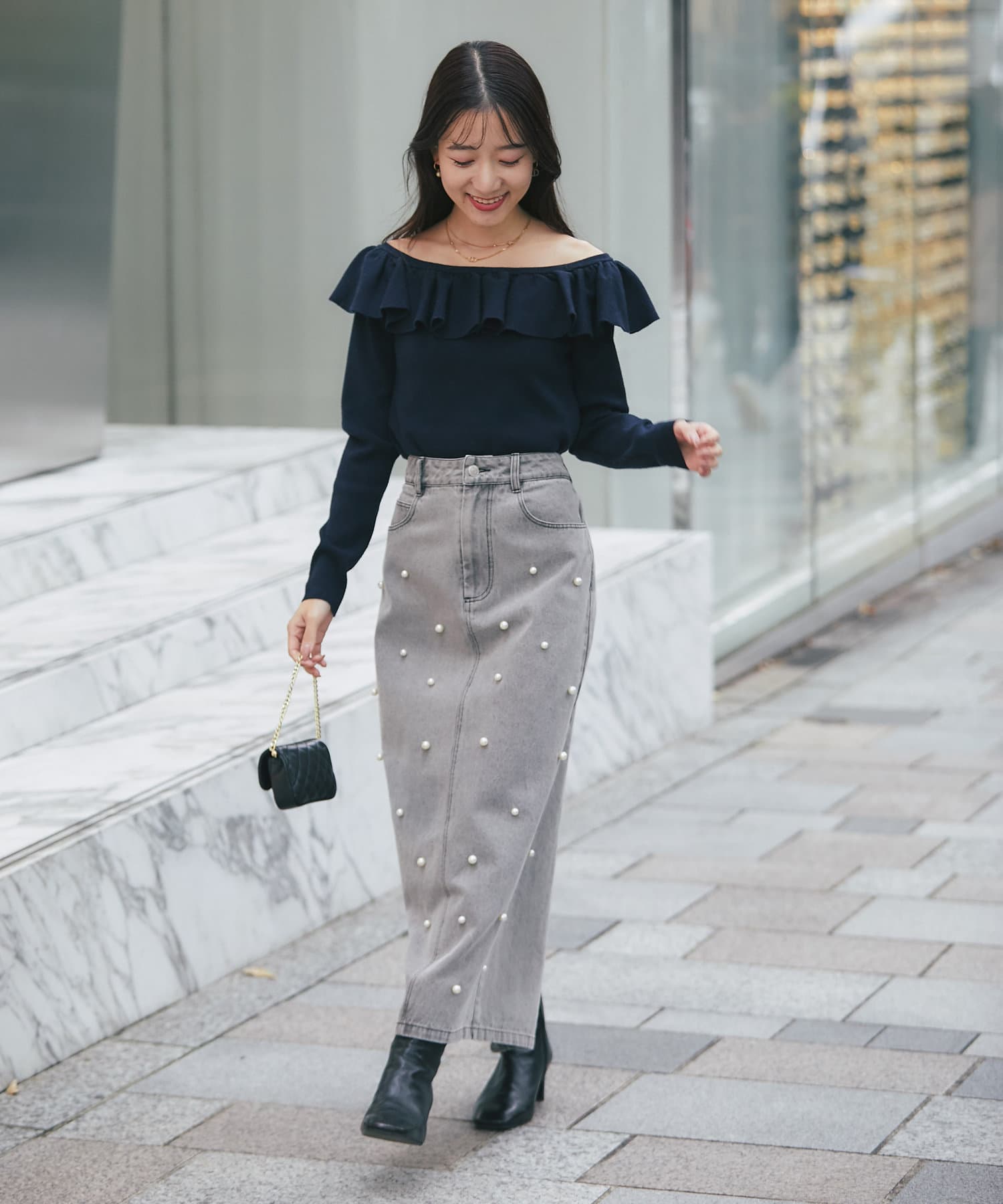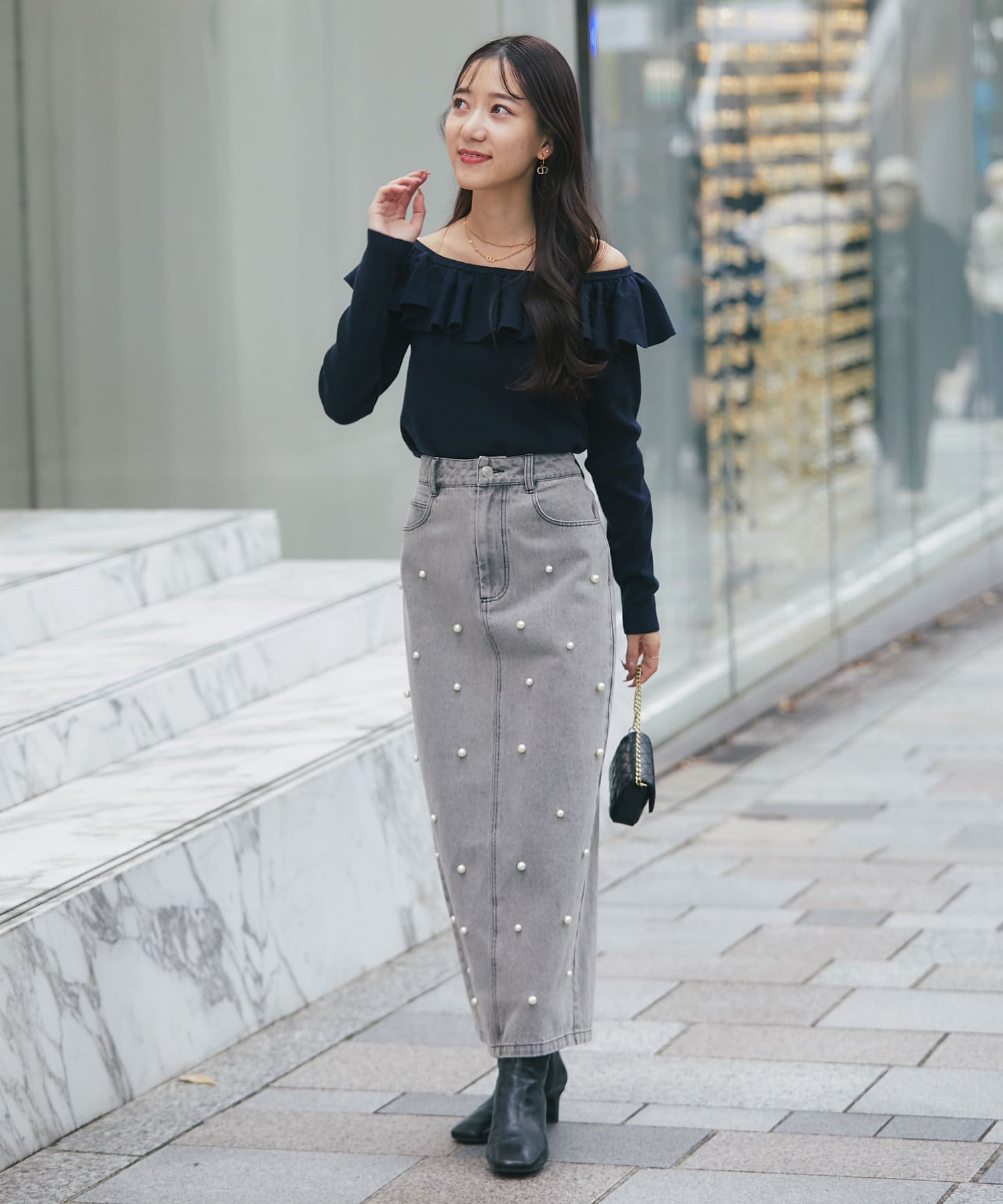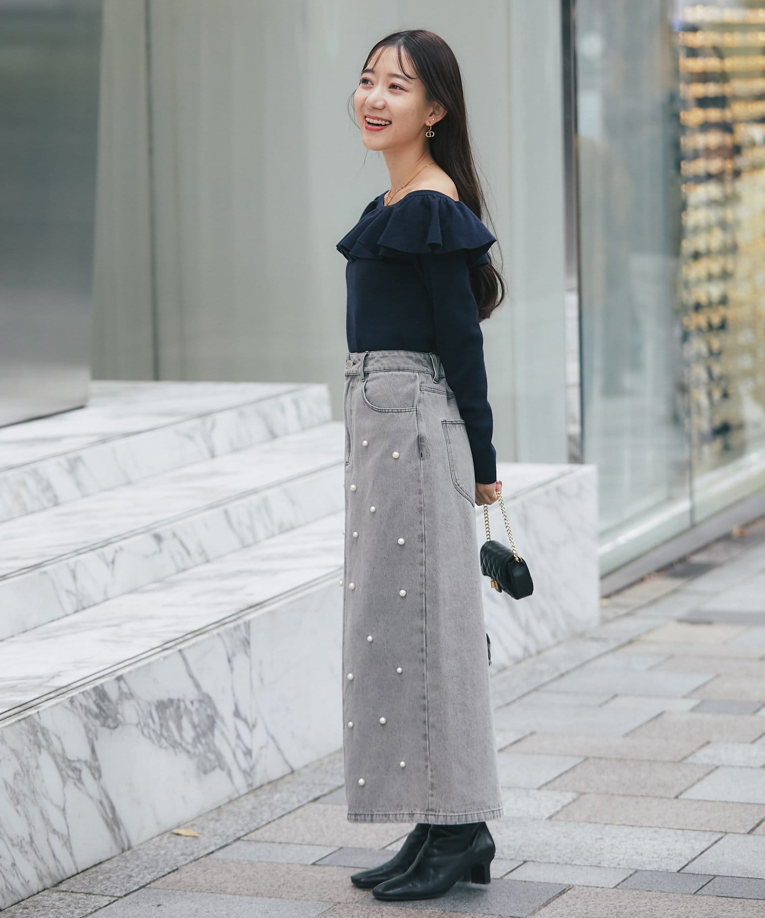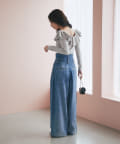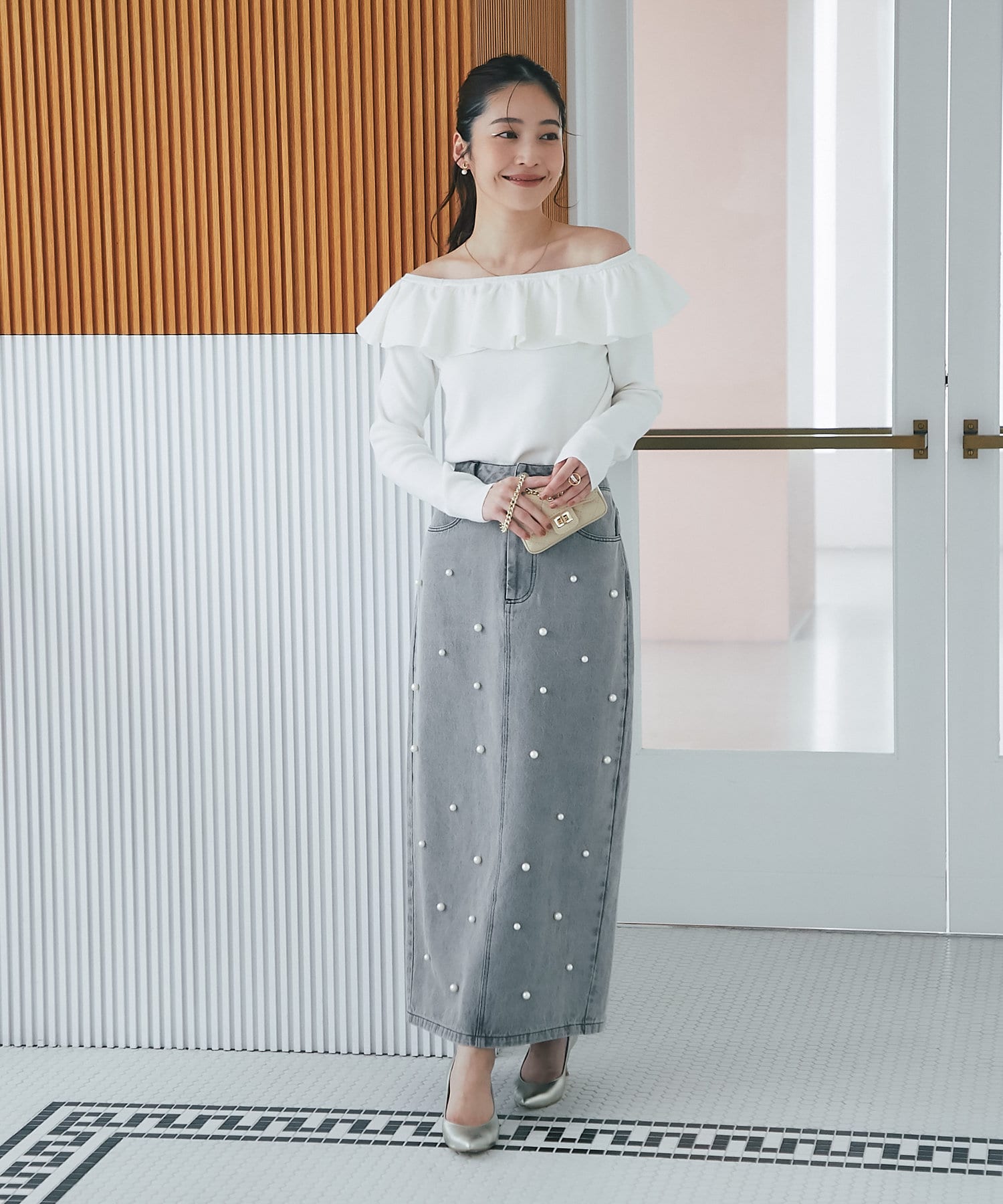 スカートと合わせてフェミニンな印象にまとめるのがおすすめ。