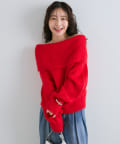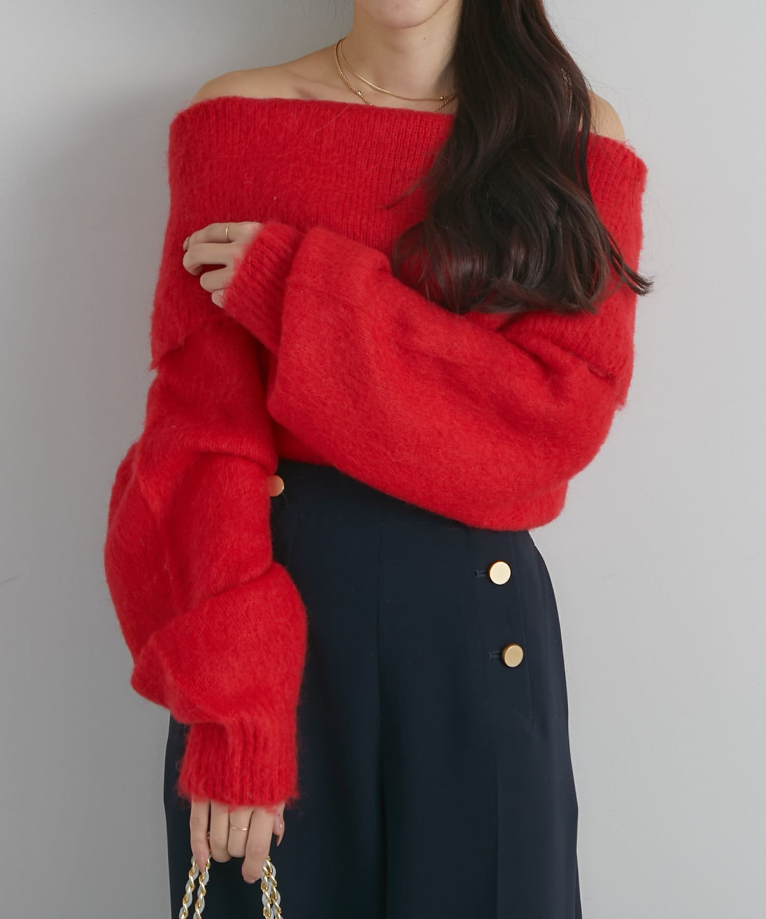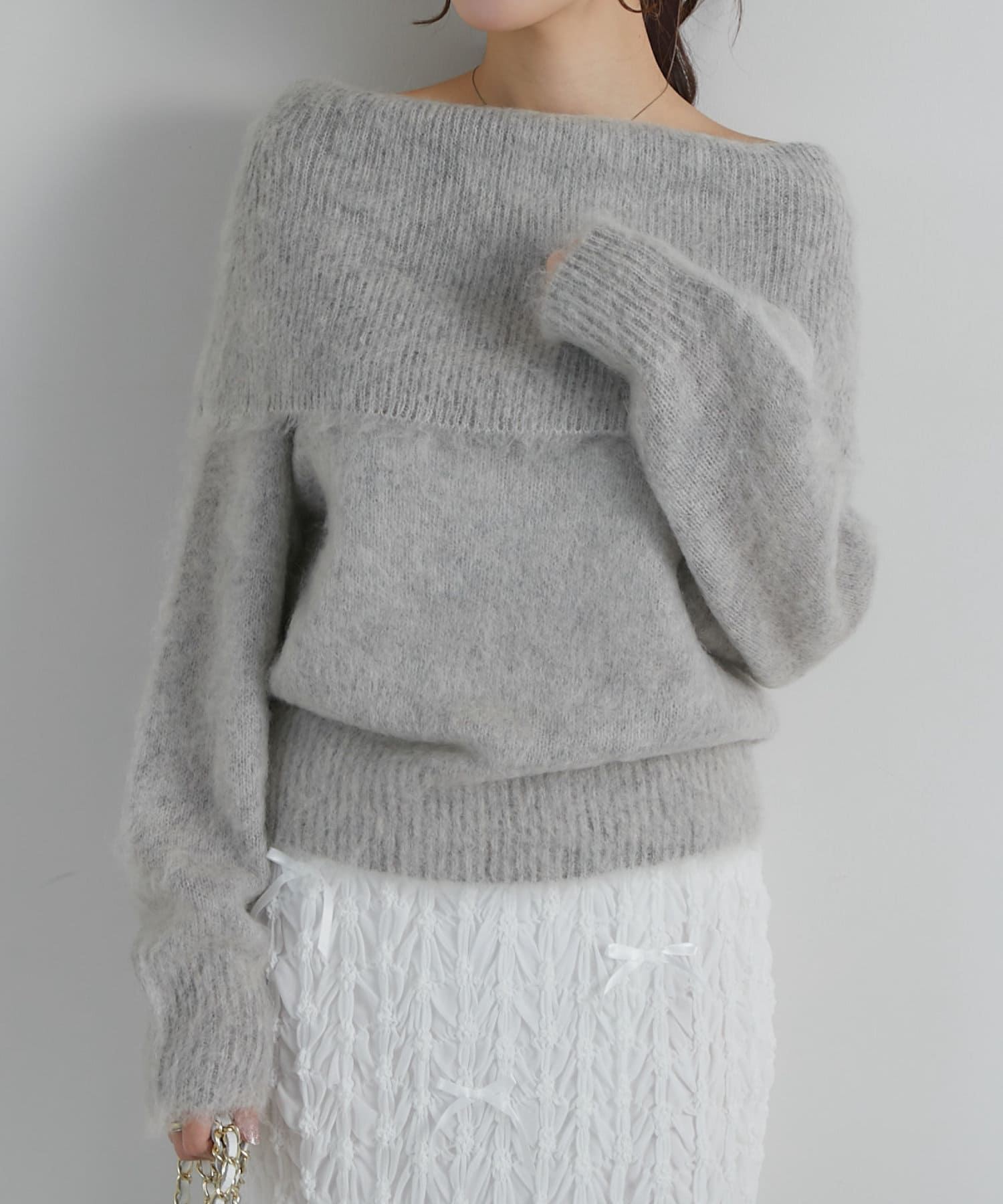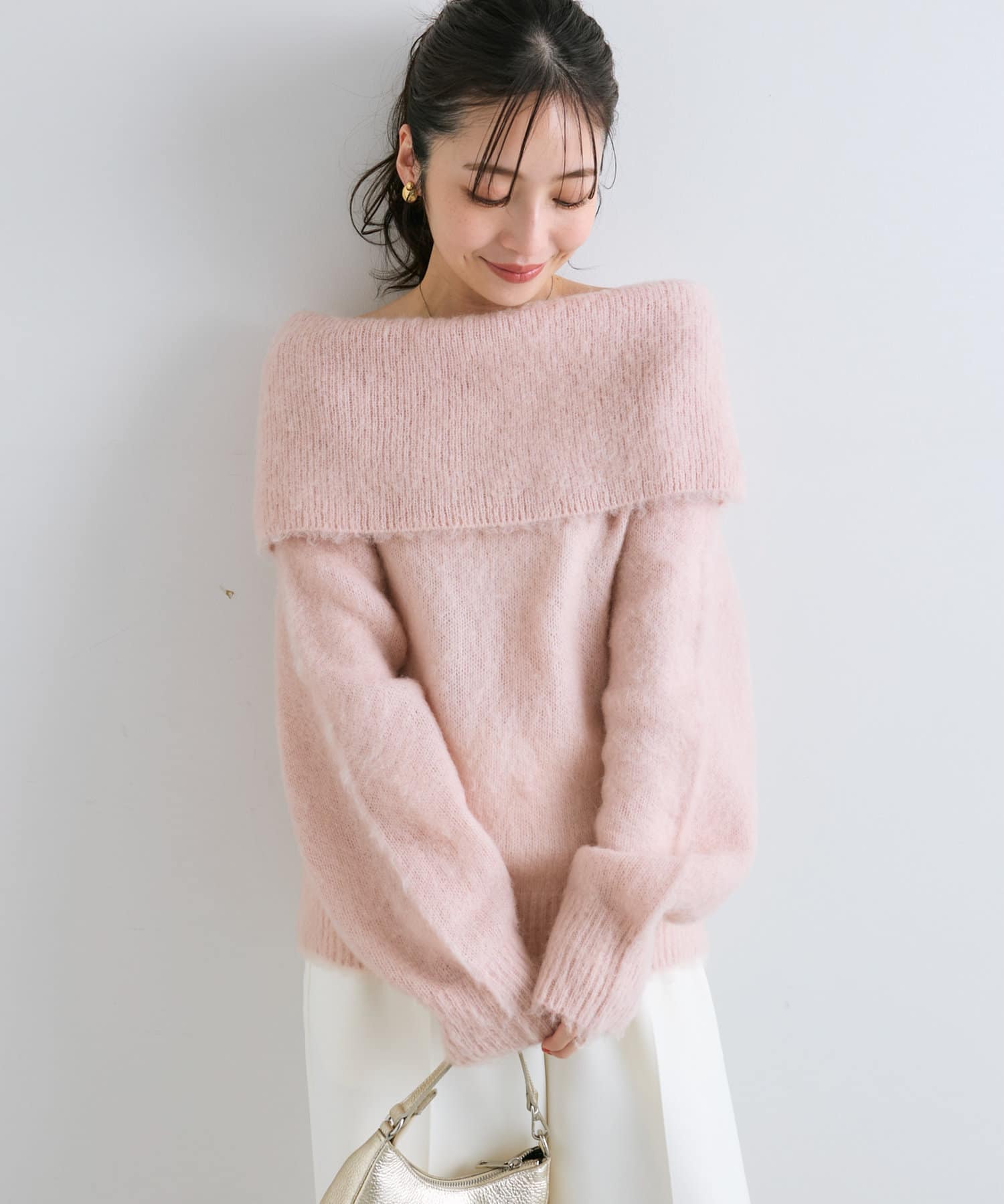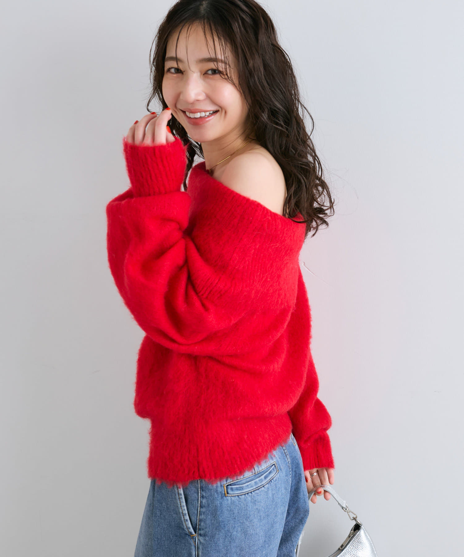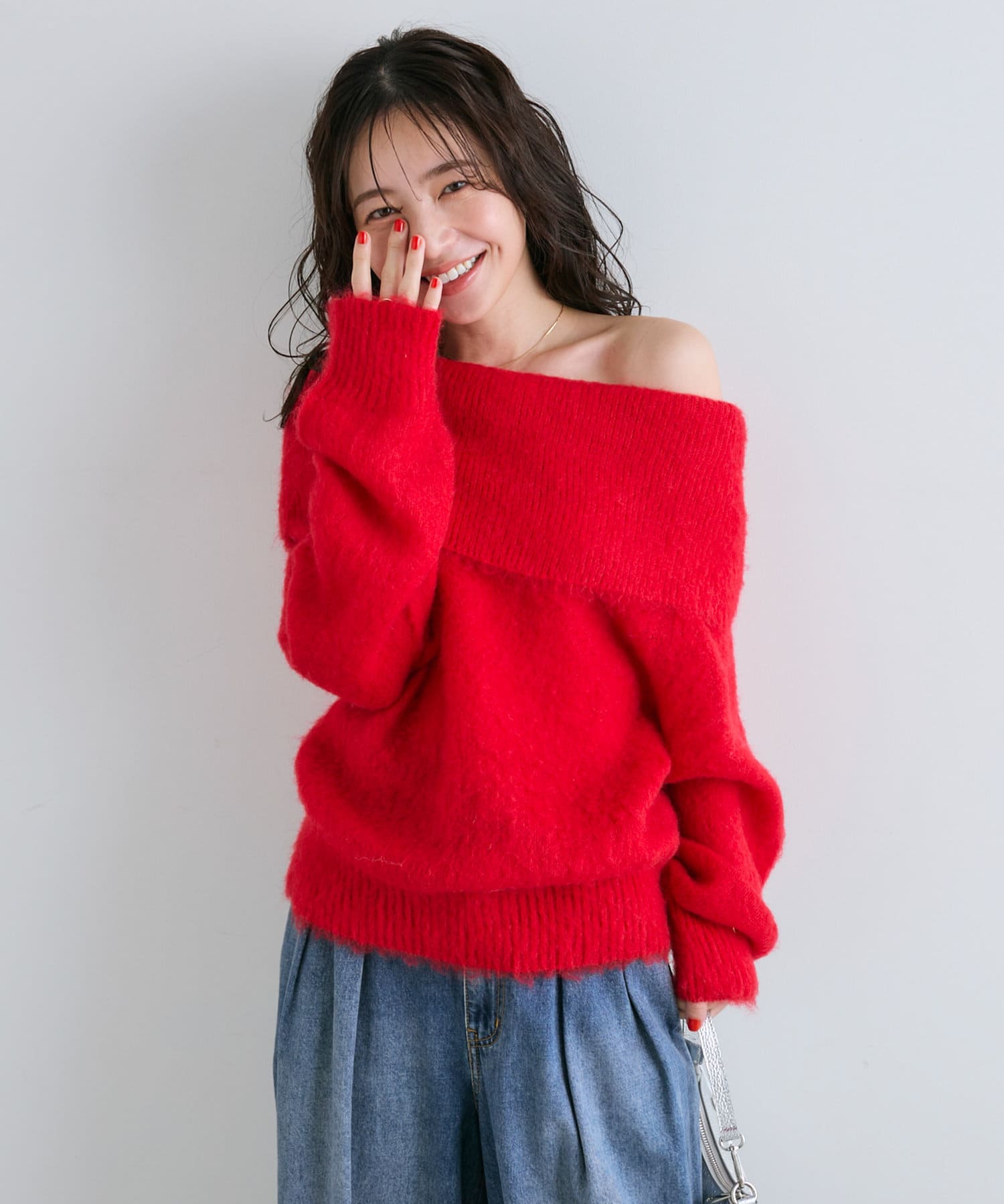 毛足長めのふんわり素材で女性らしさが詰まったオフショルニット。