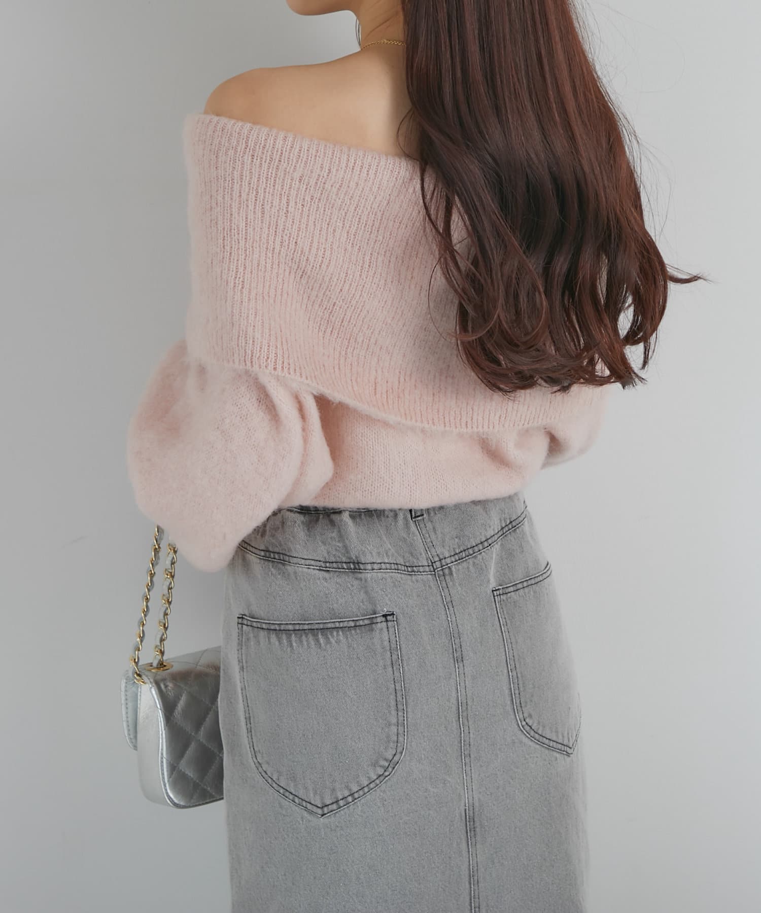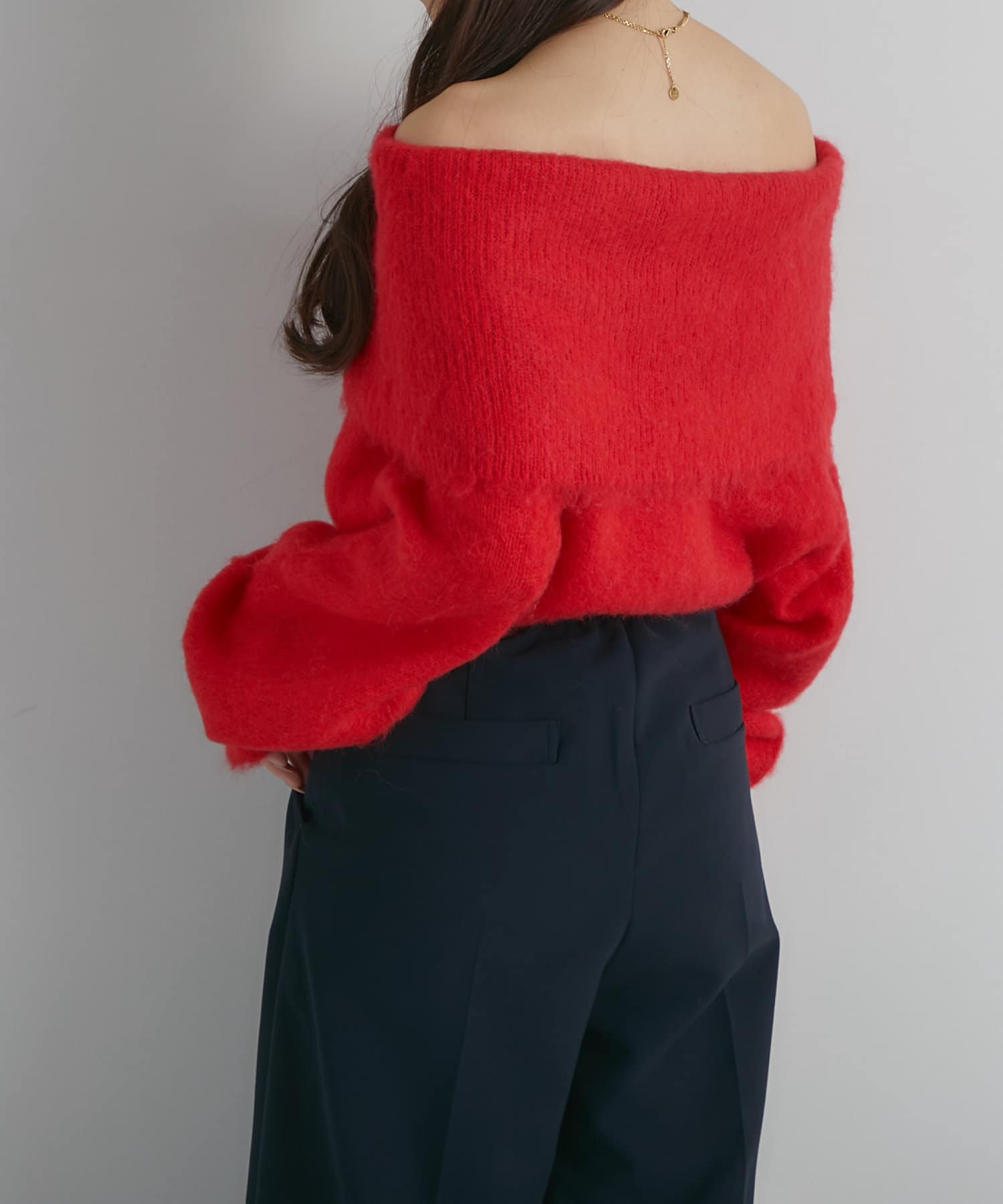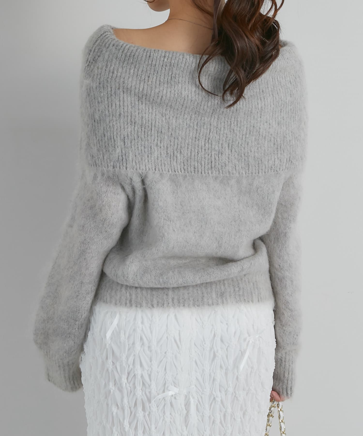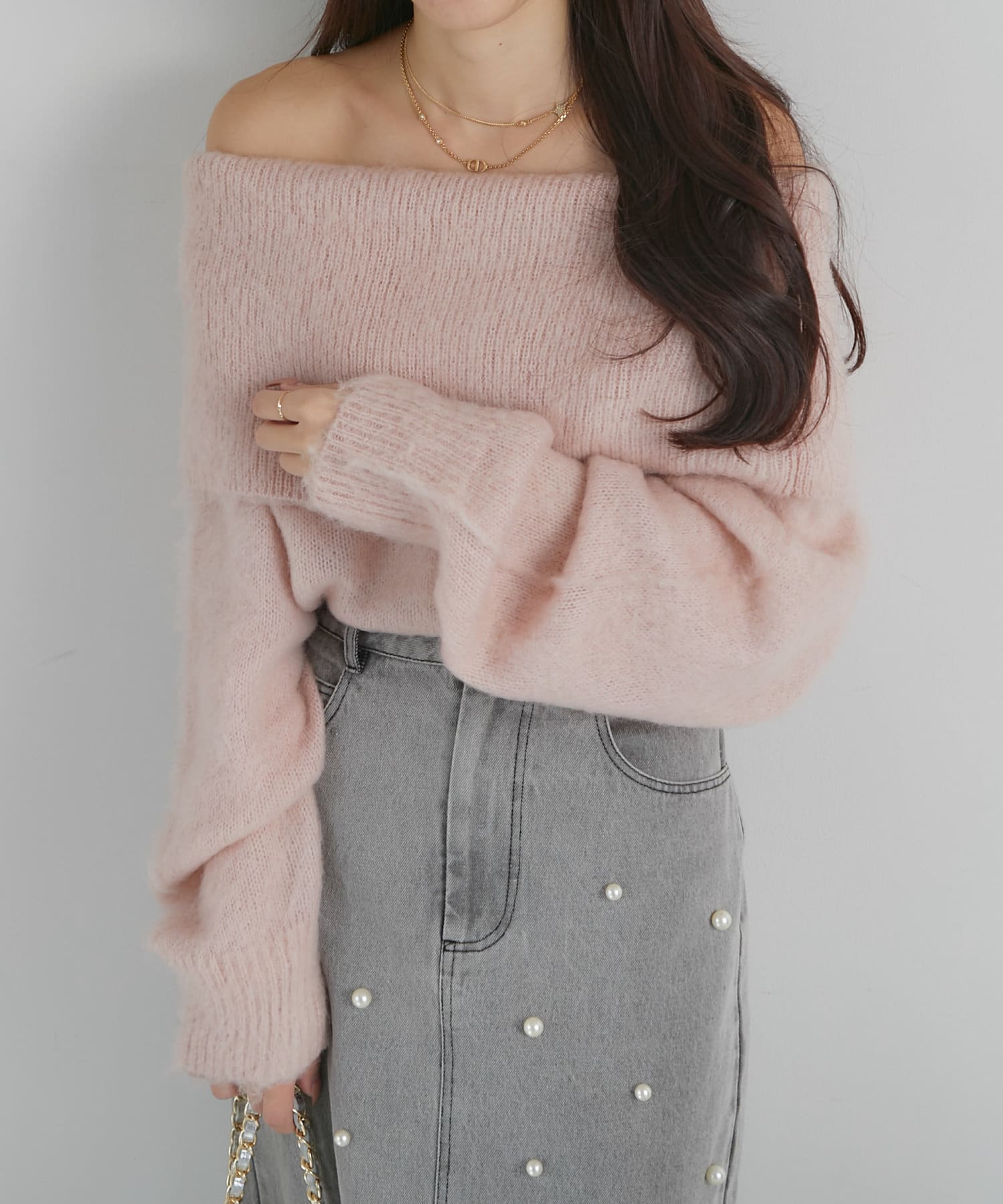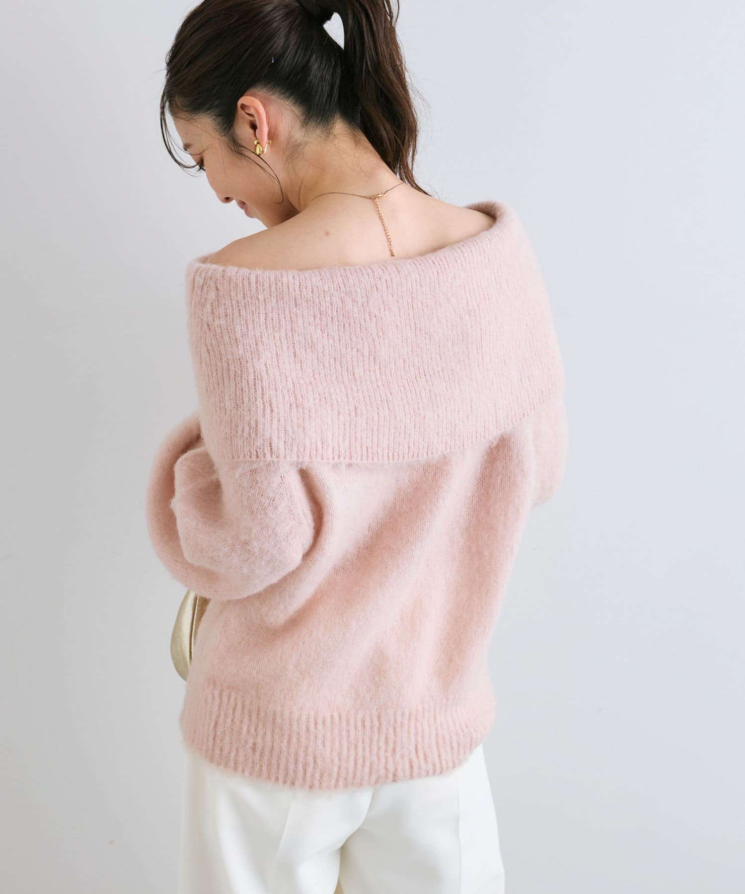毛足長めのふんわり素材で女性らしさが詰まったオフショルニット。