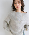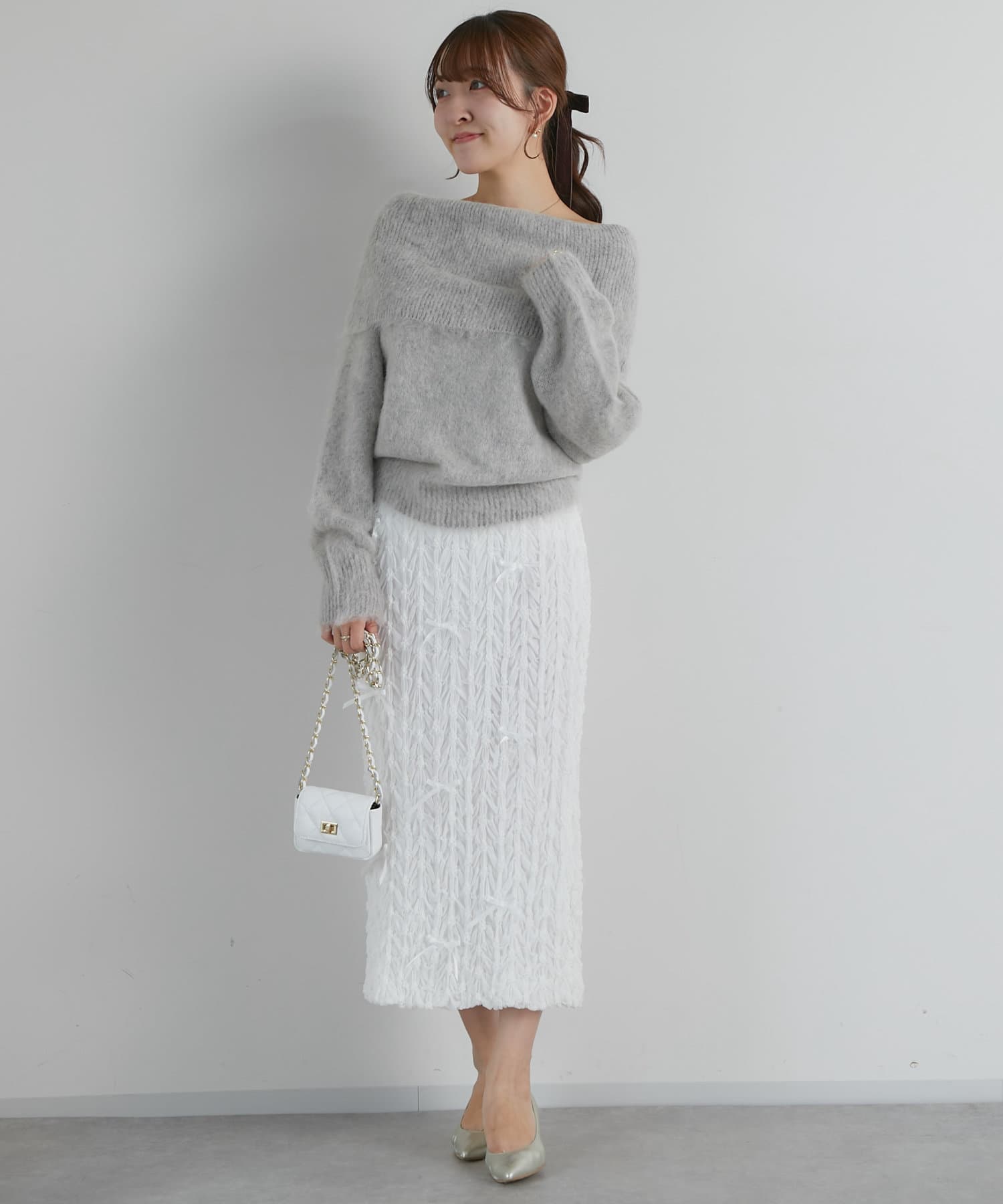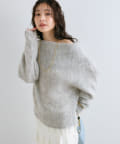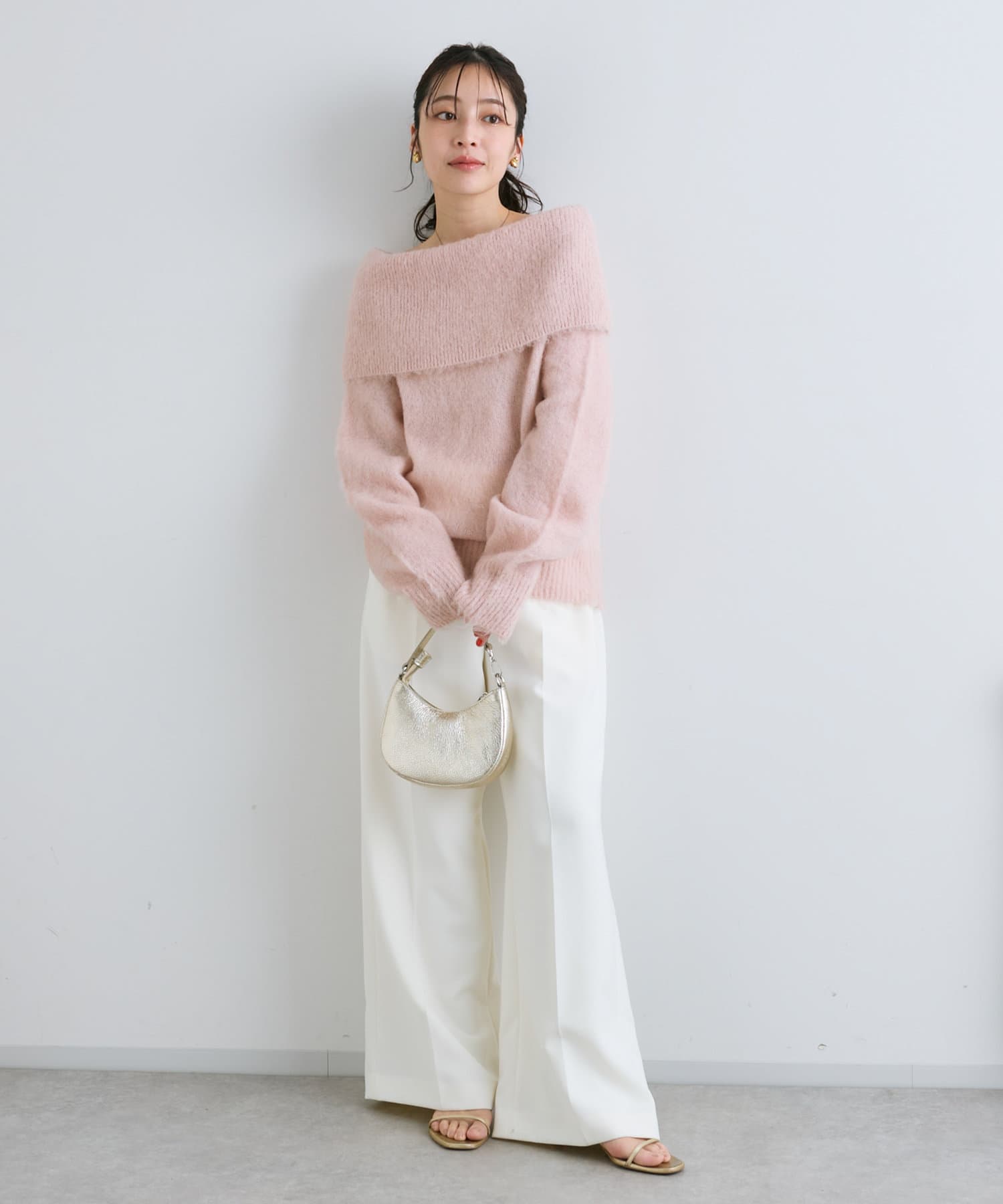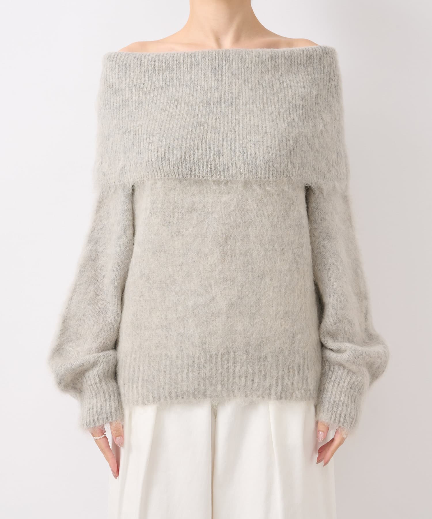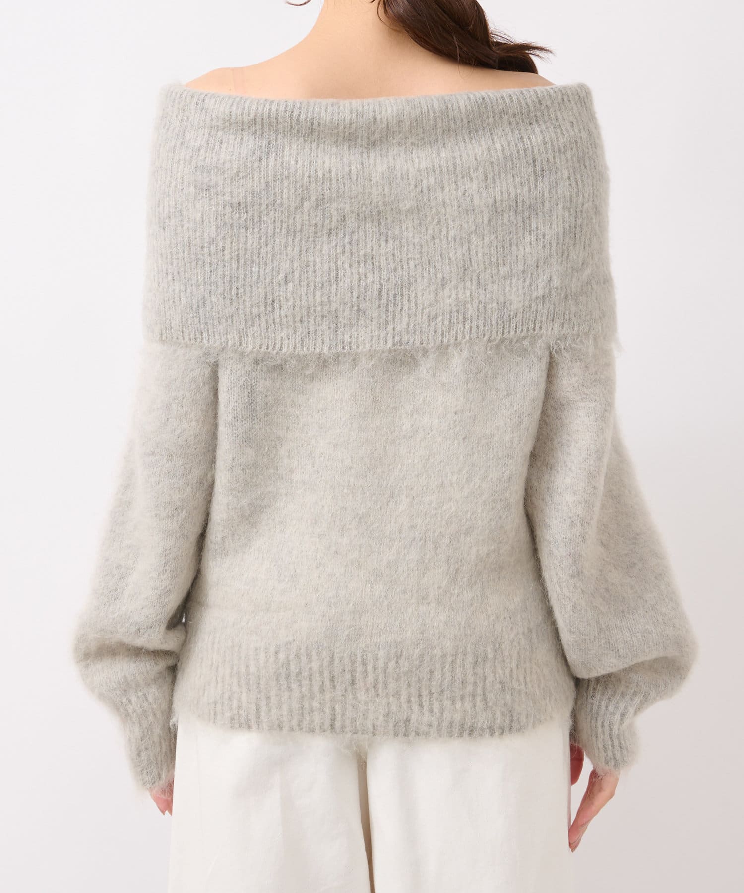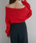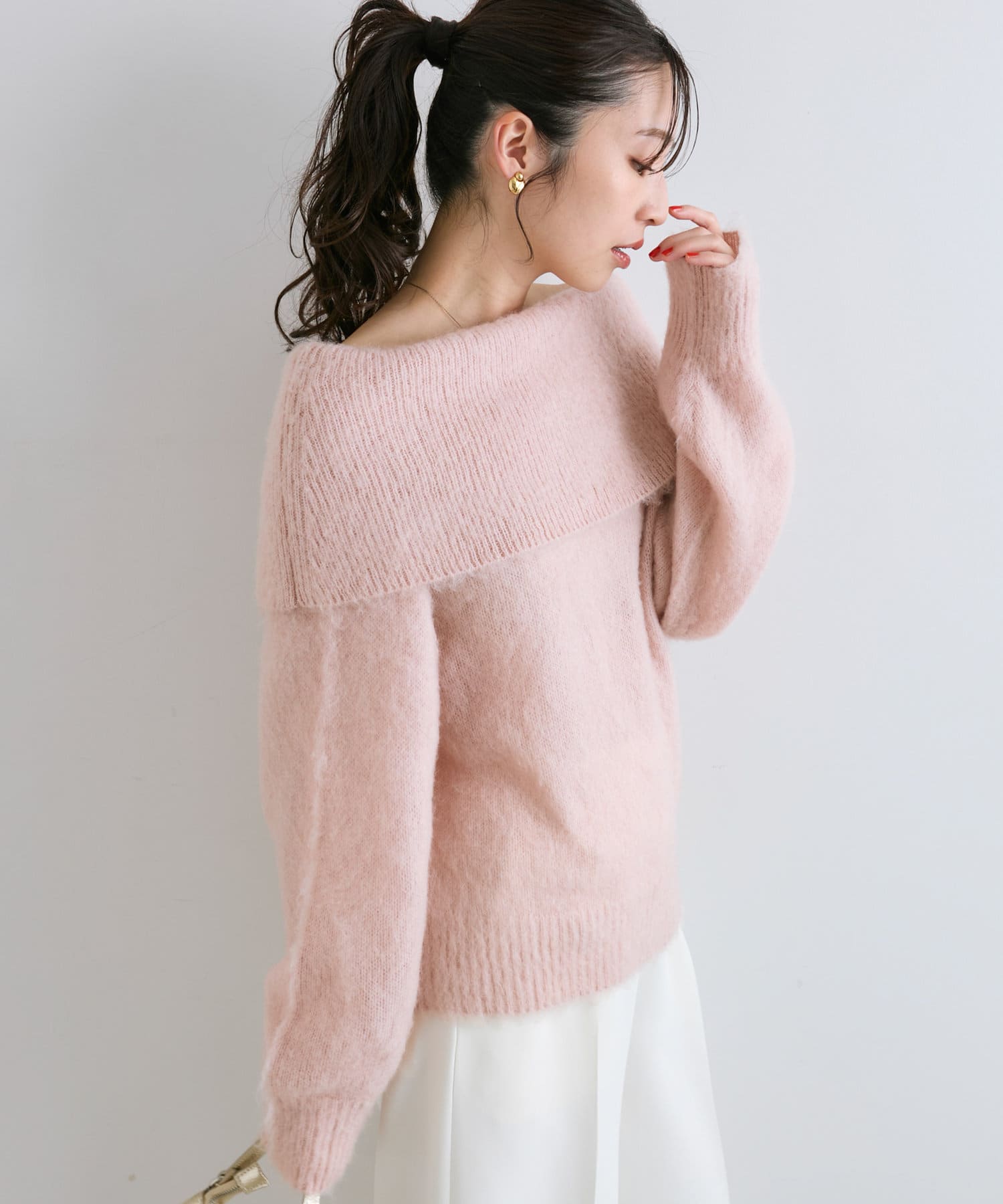 毛足長めのふんわり素材で女性らしさが詰まったオフショルニット。