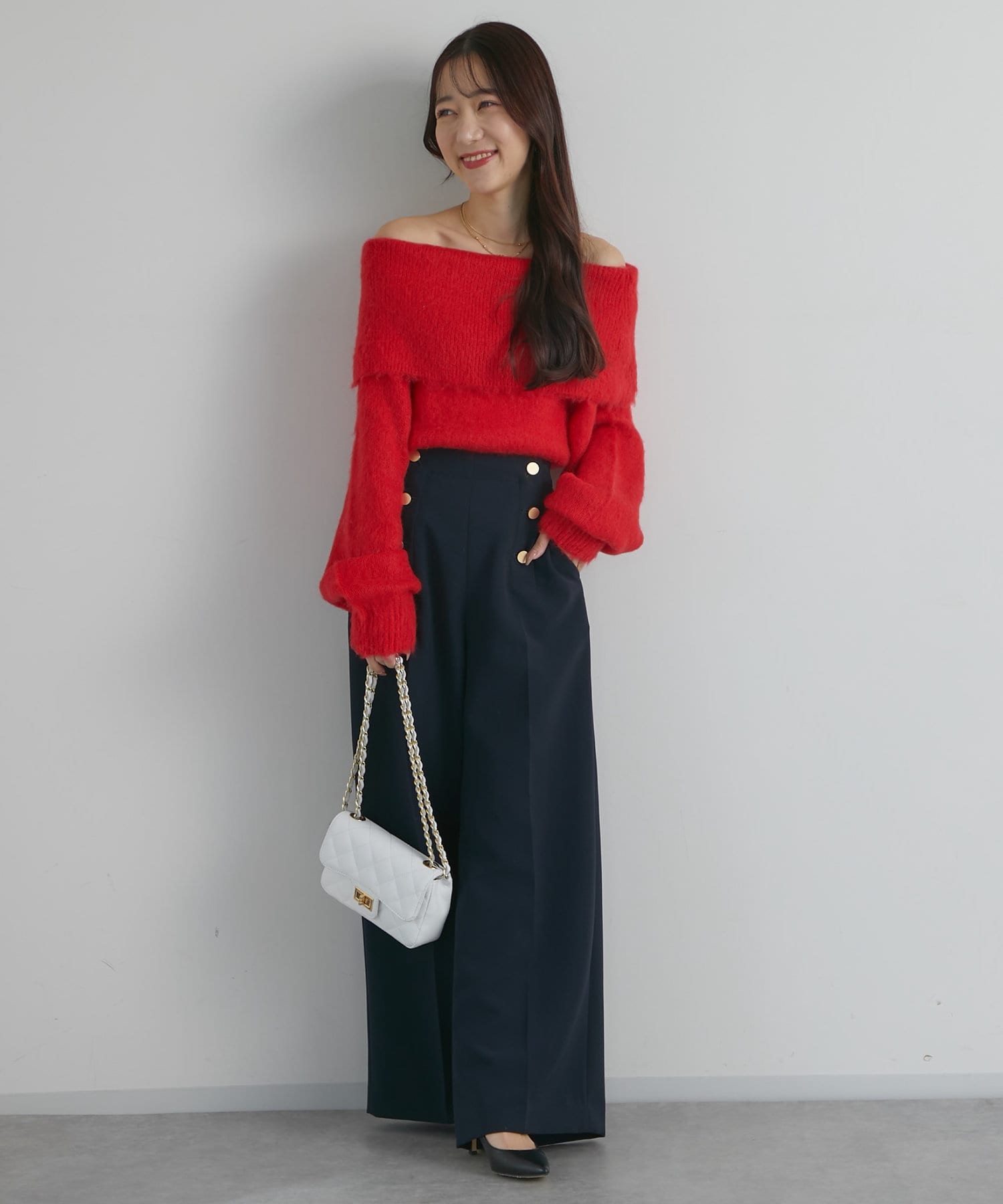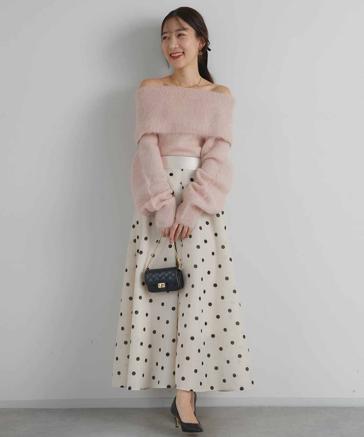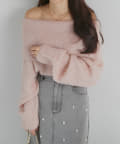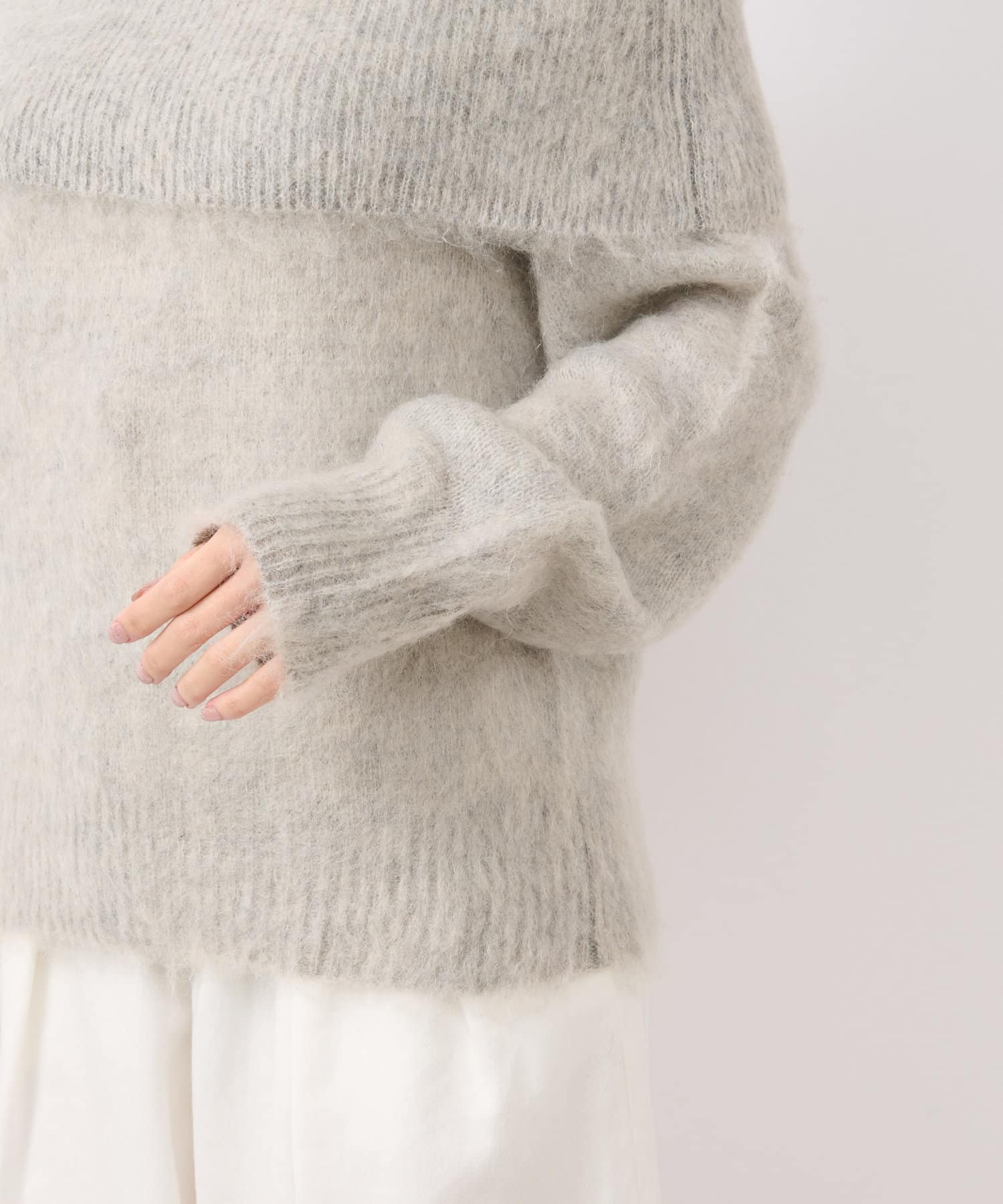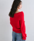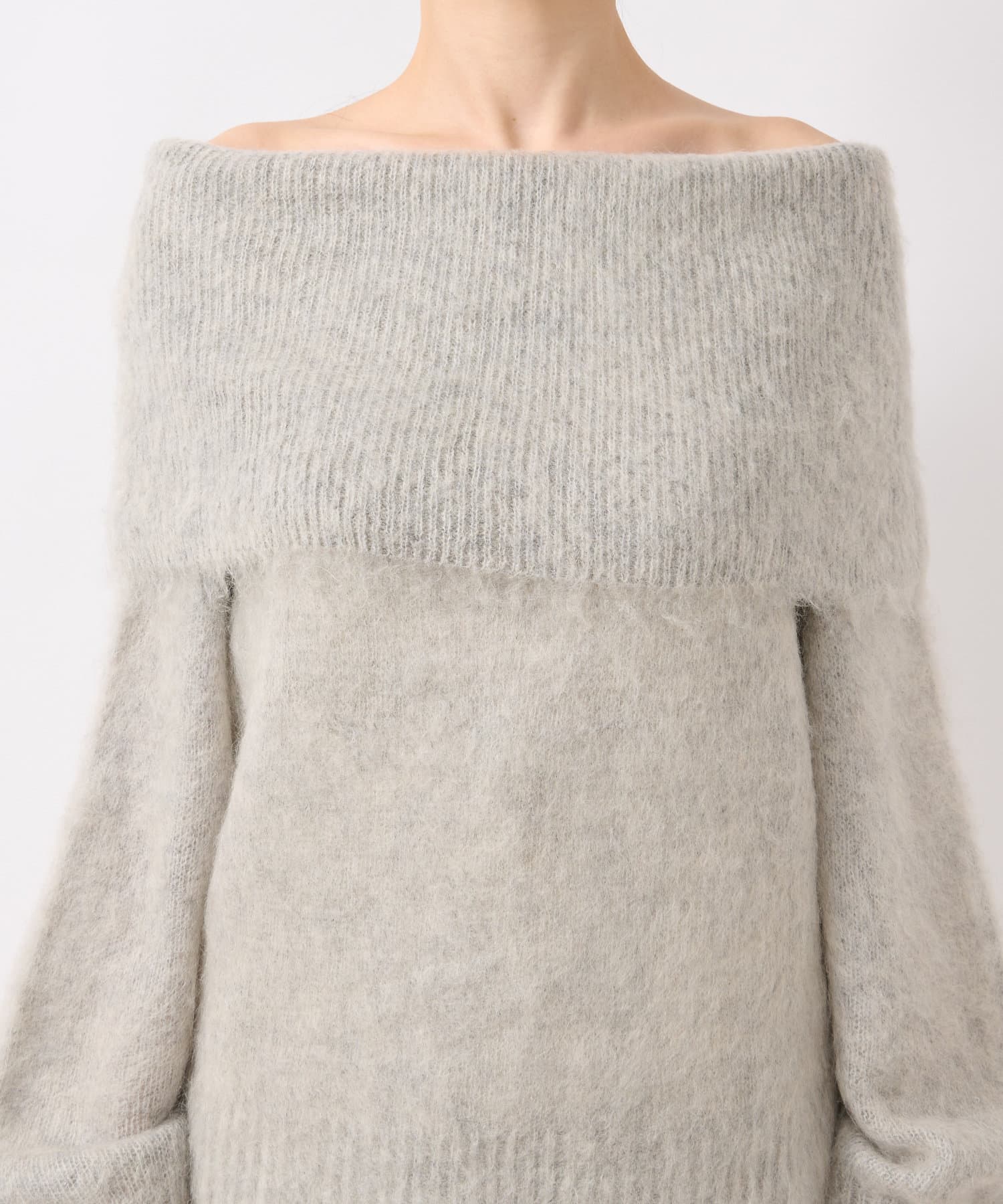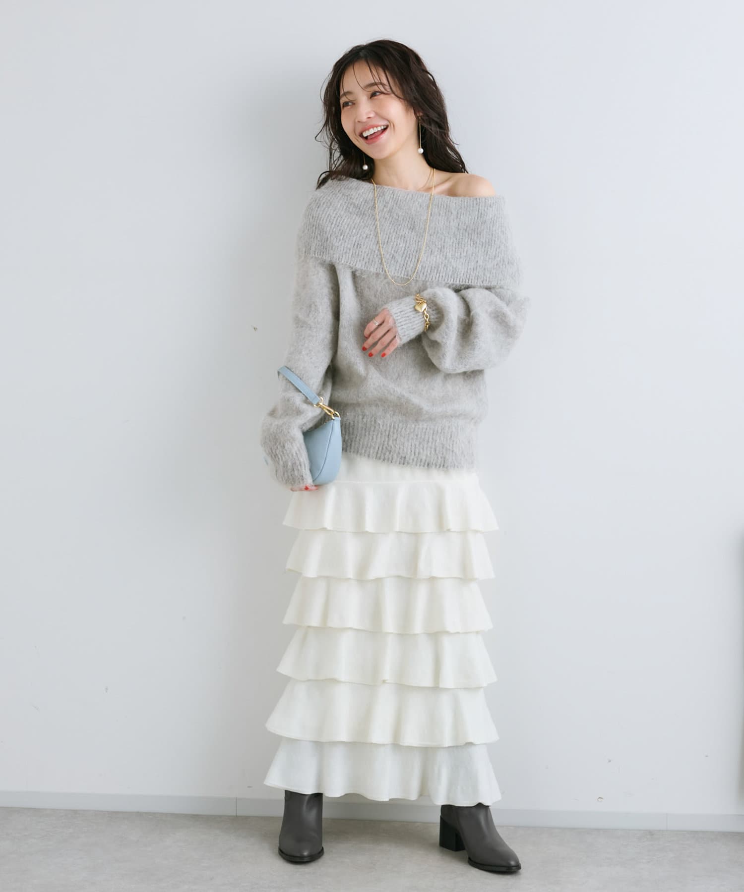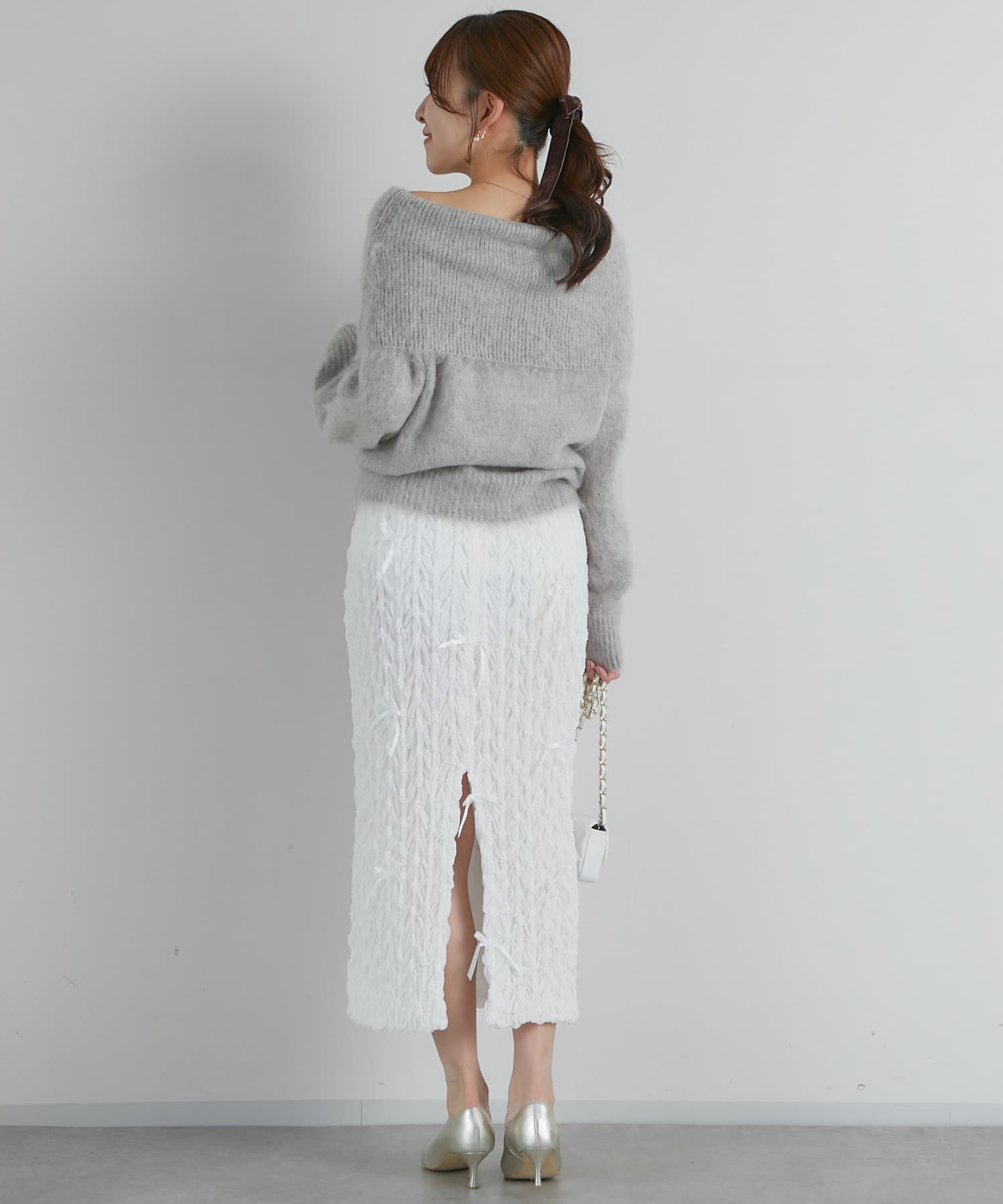毛足長めのふんわり素材で女性らしさが詰まったオフショルニット。