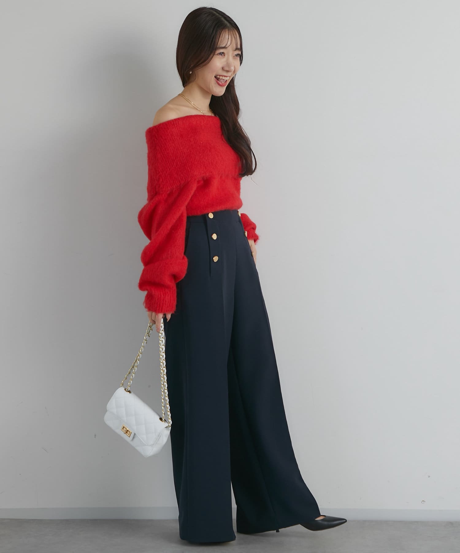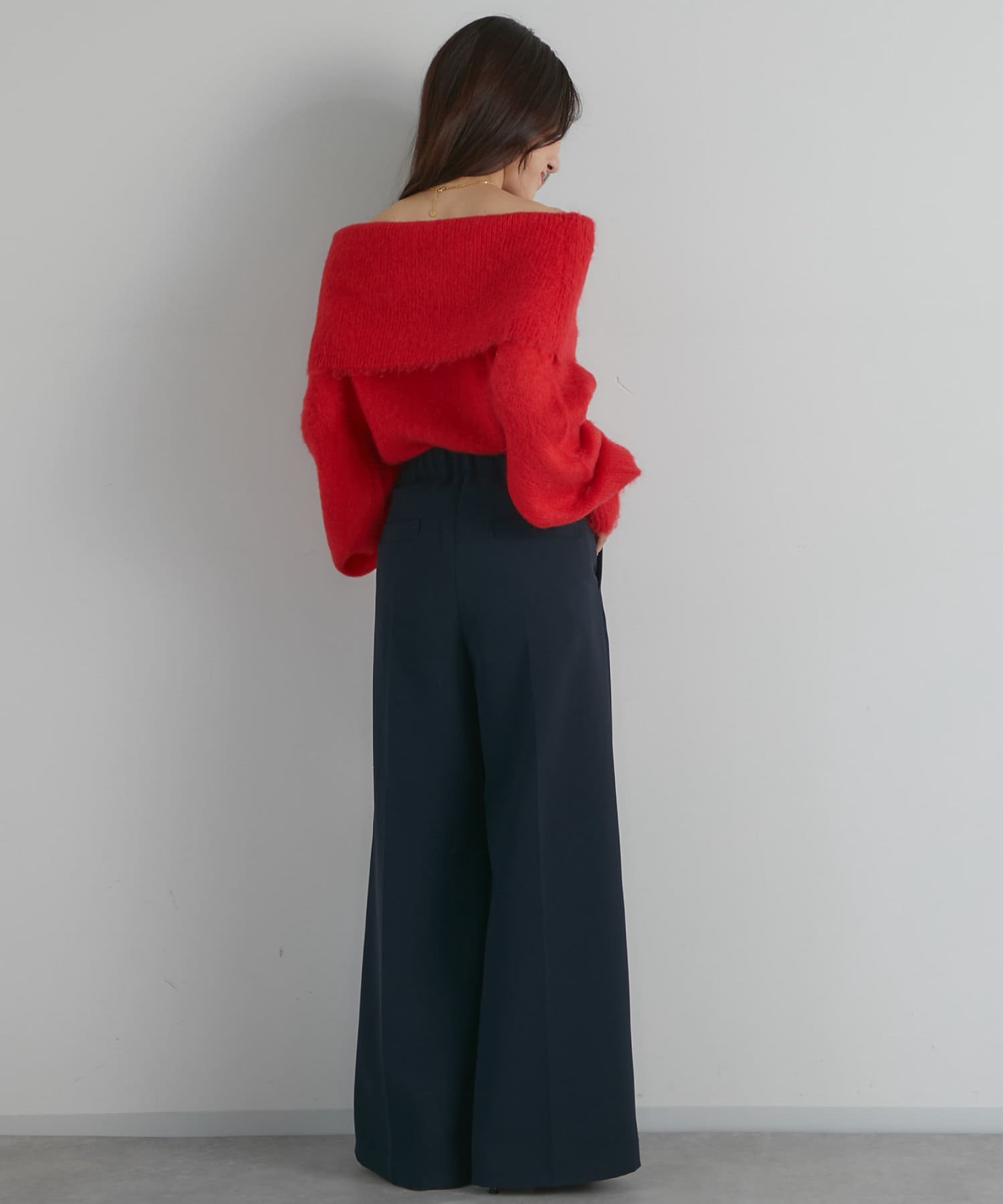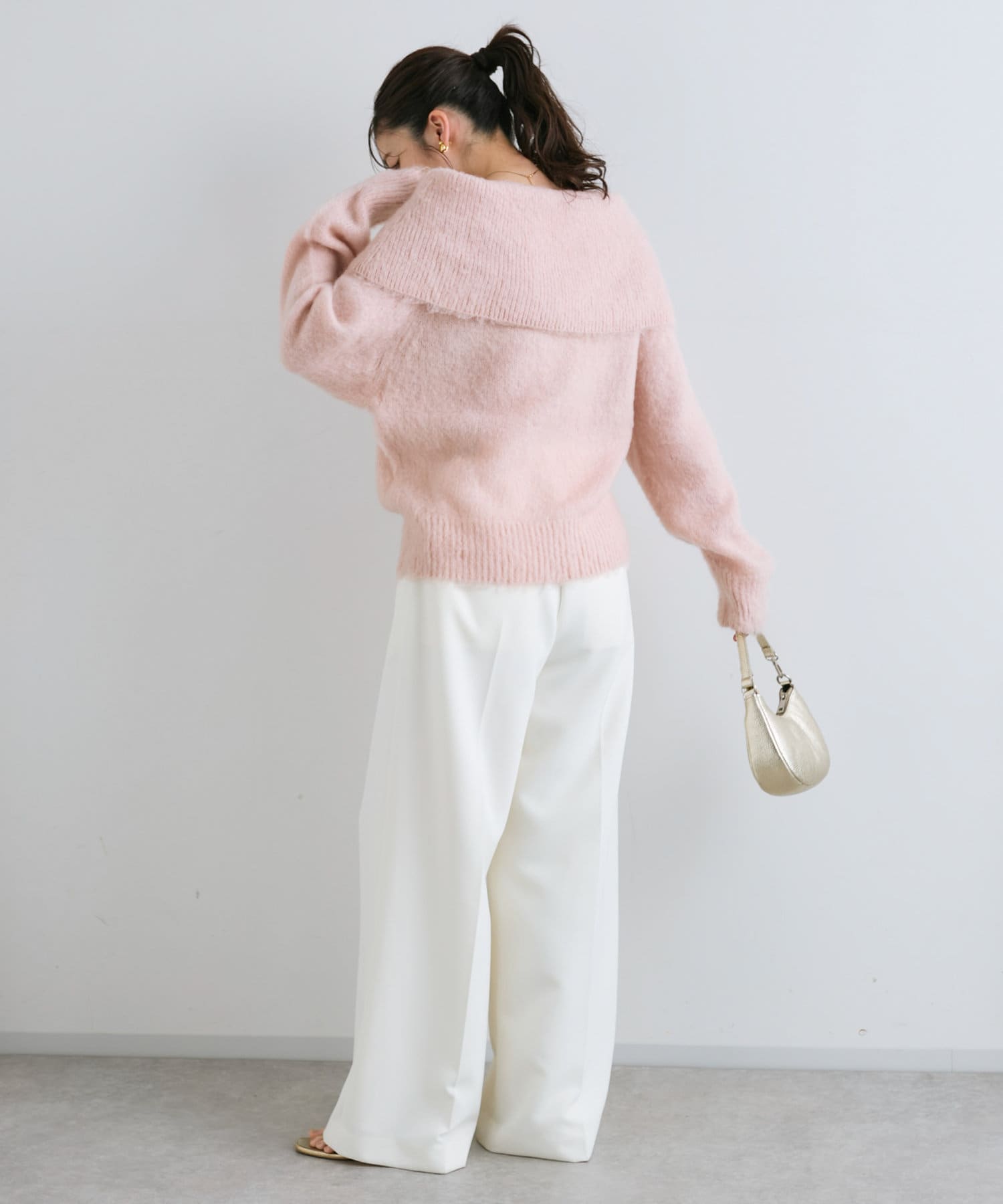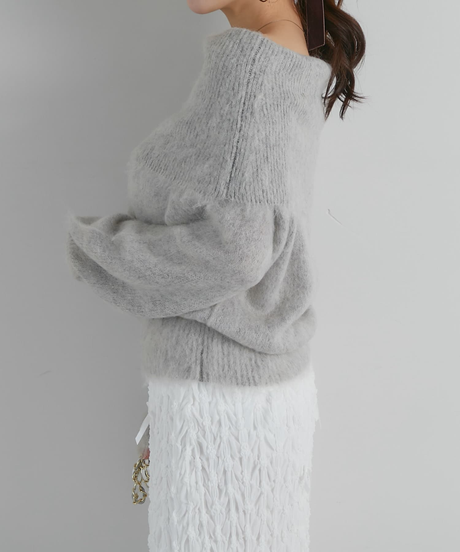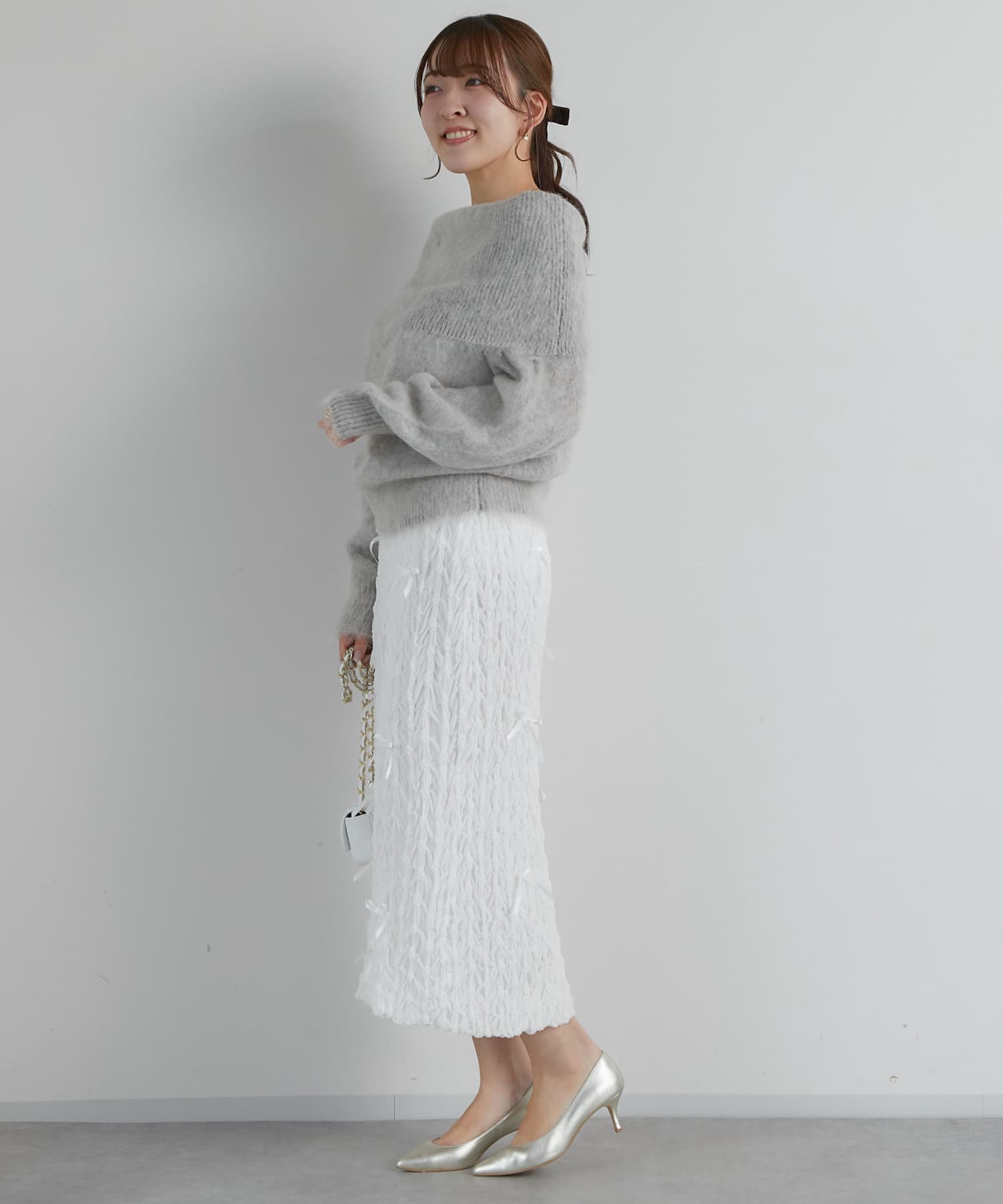 毛足長めのふんわり素材で女性らしさが詰まったオフショルニット。
