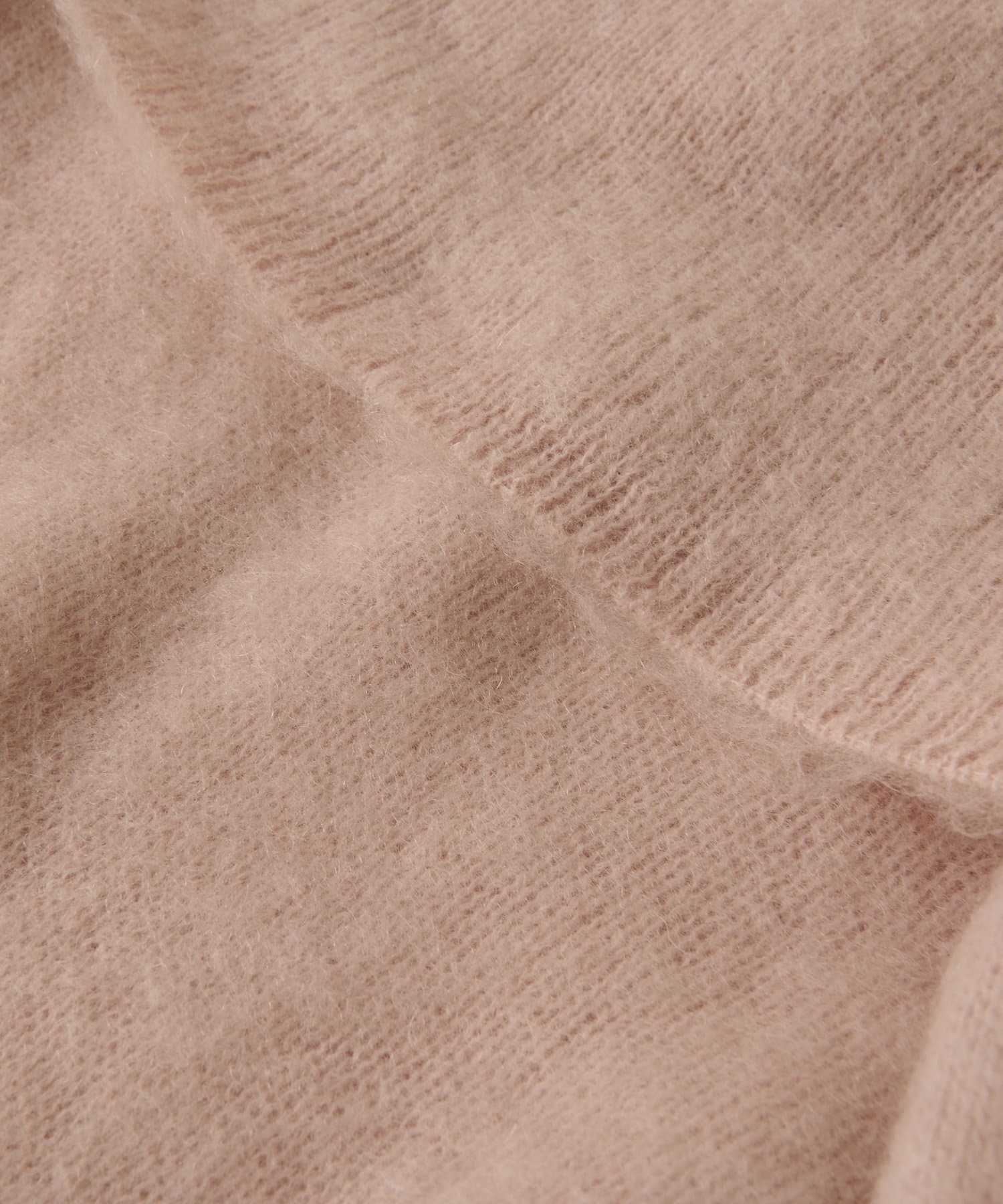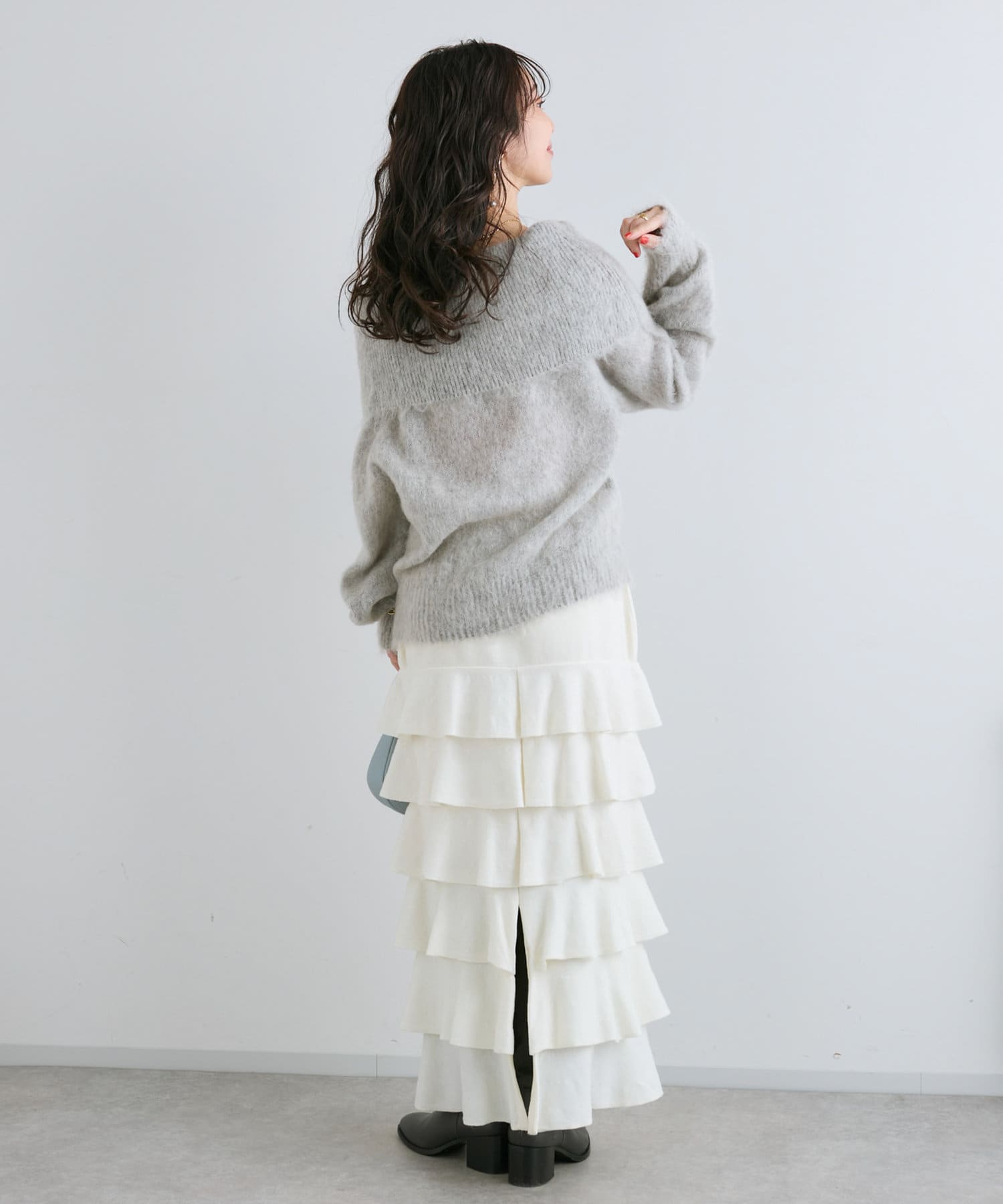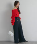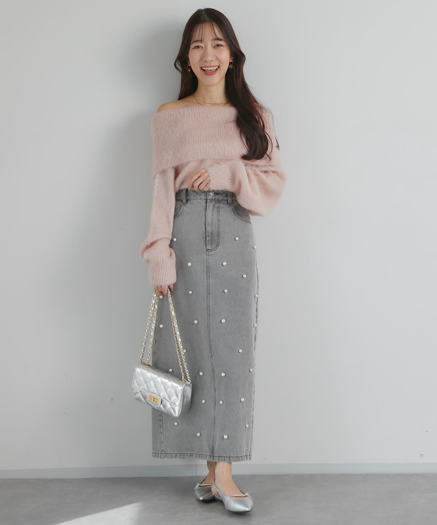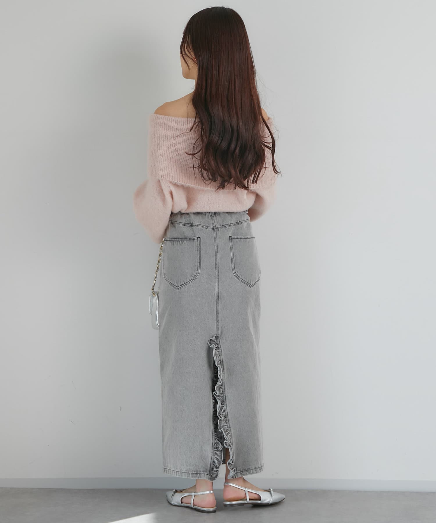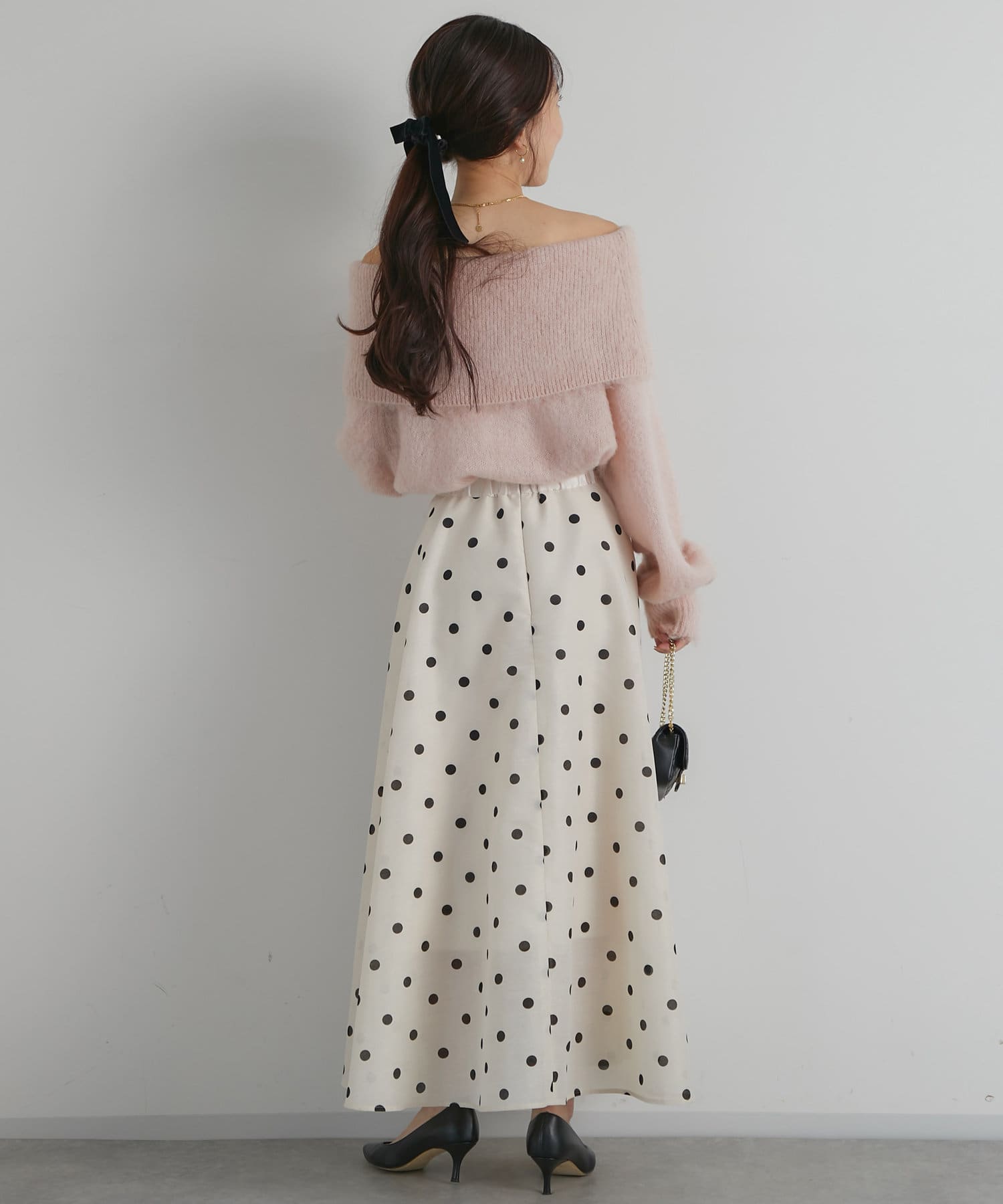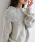 毛足長めのふんわり素材で女性らしさが詰まったオフショルニット。