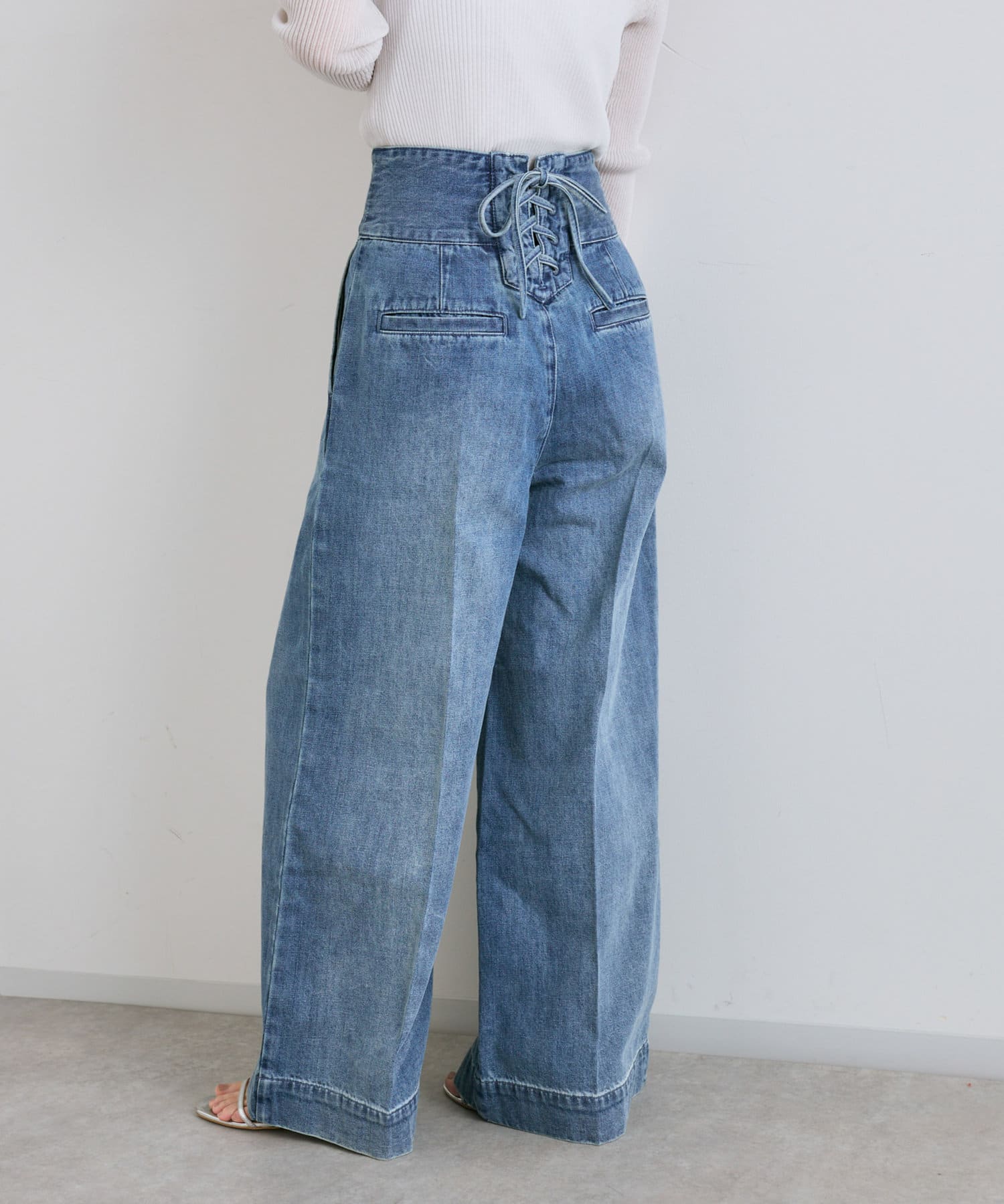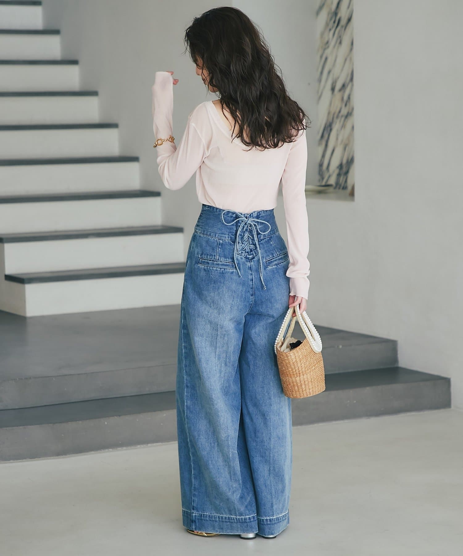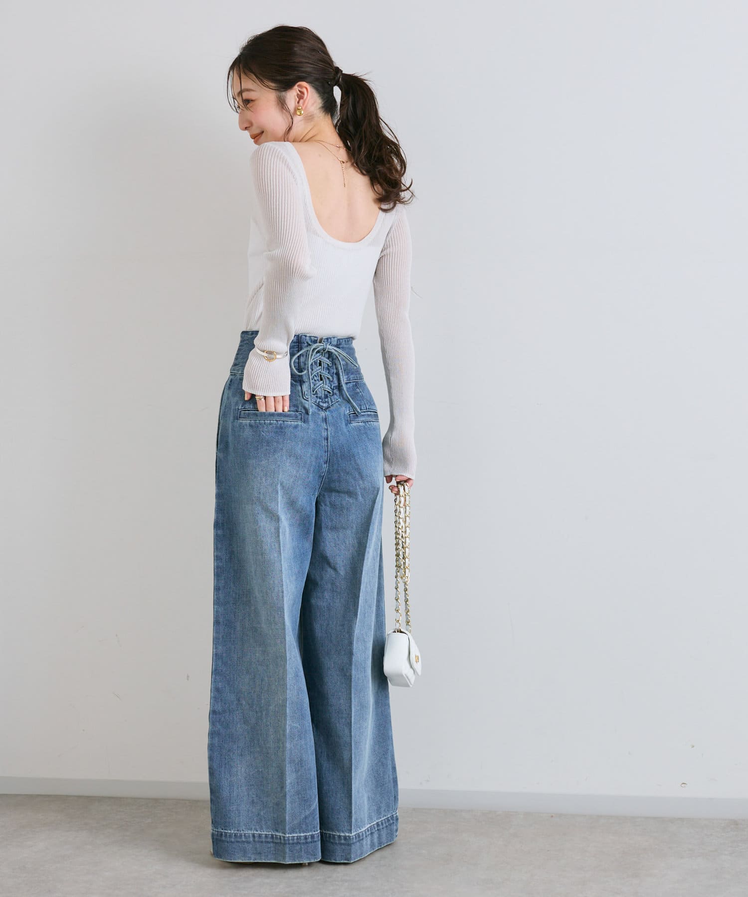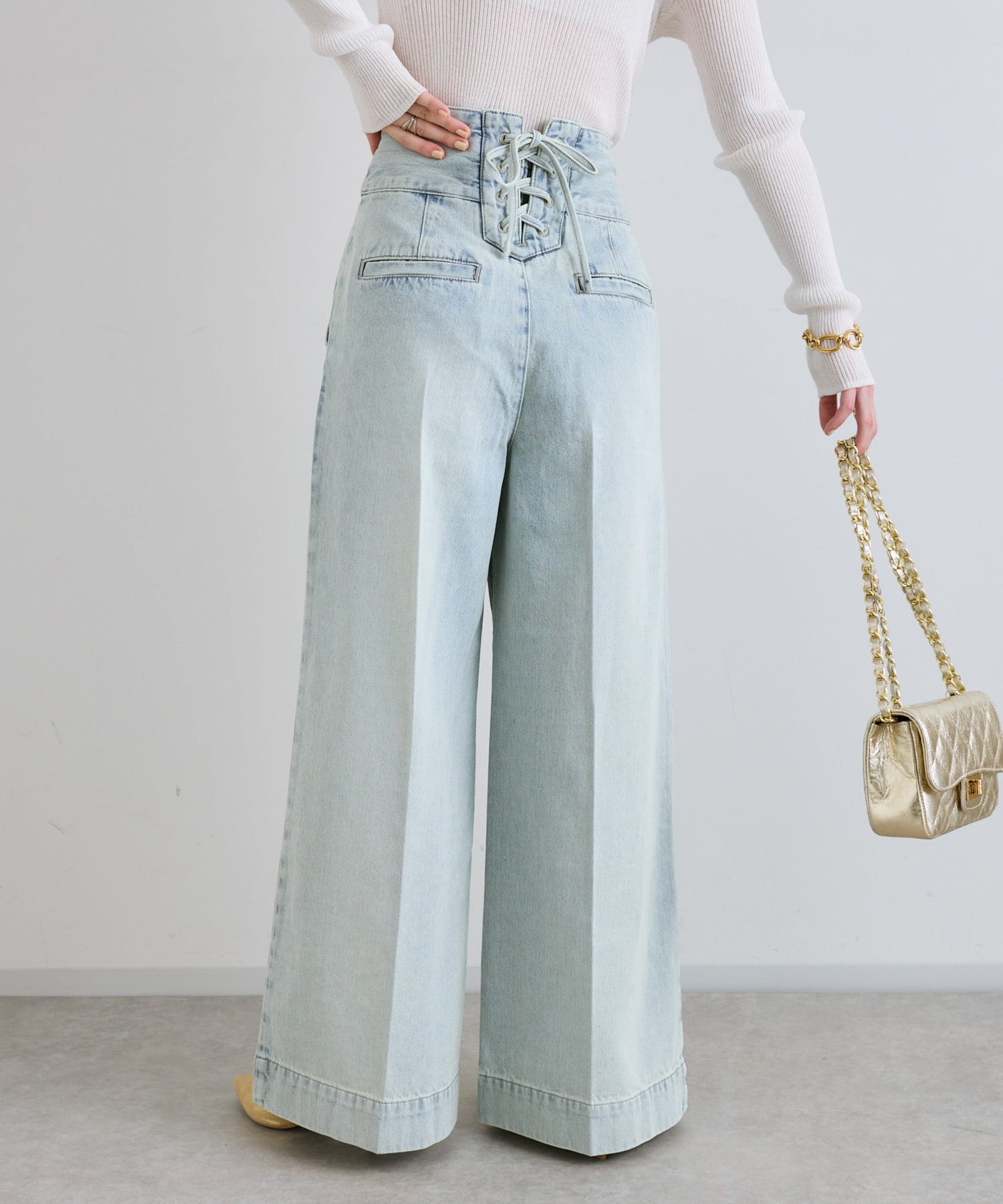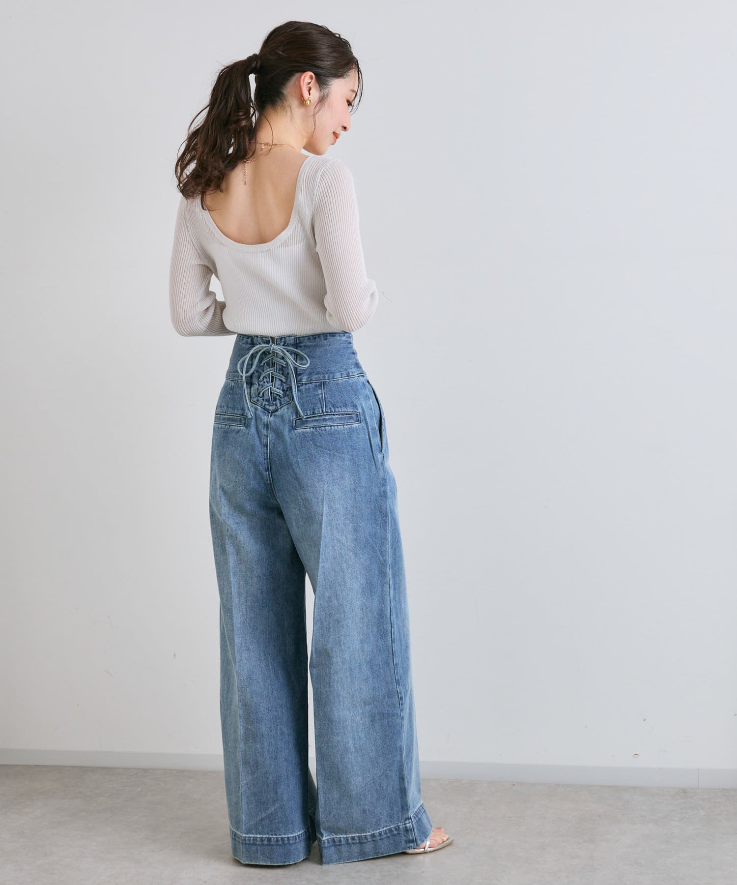 バックレースが目を引く、大人かわいいデニムワイドパンツ。