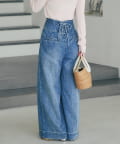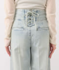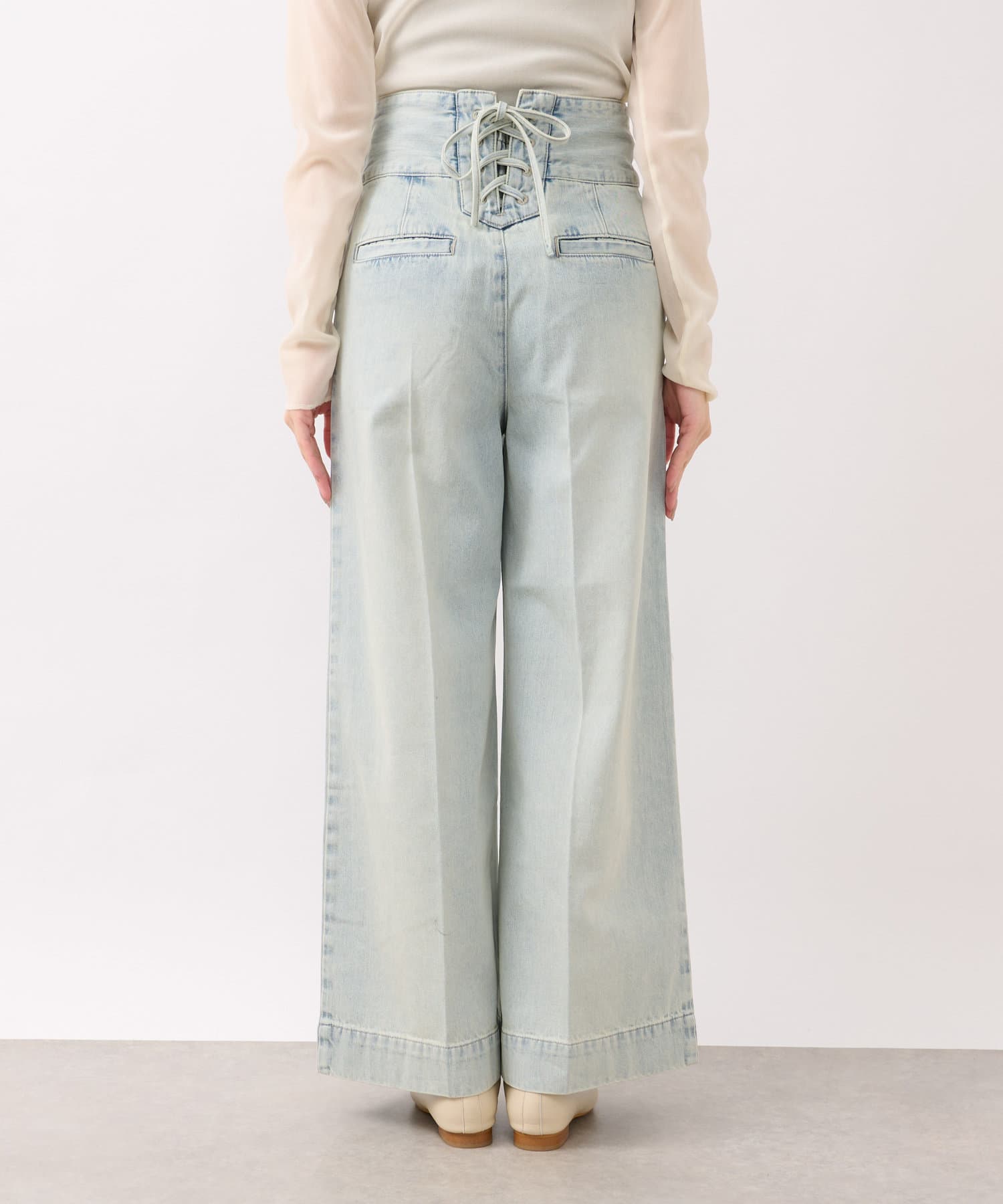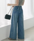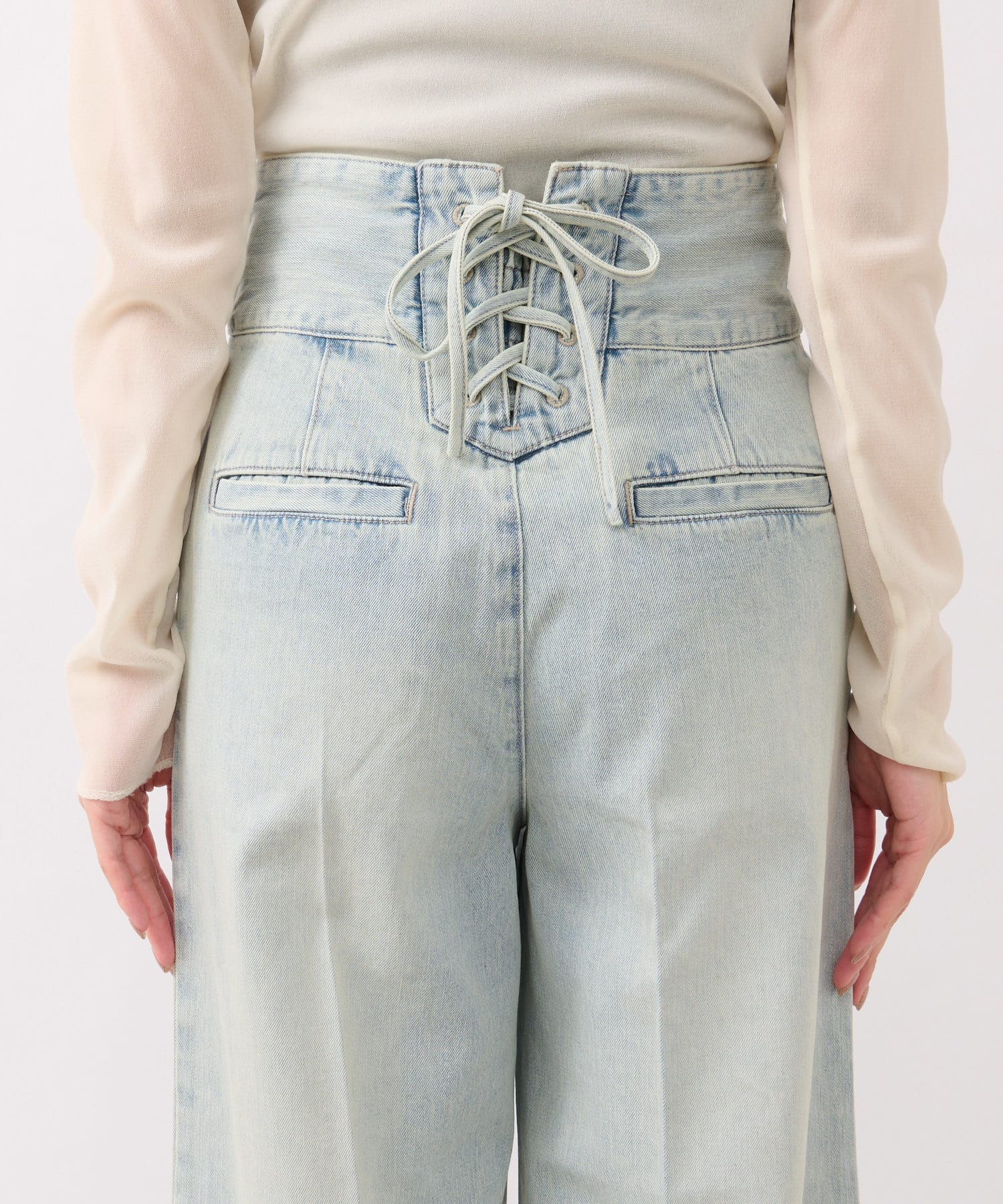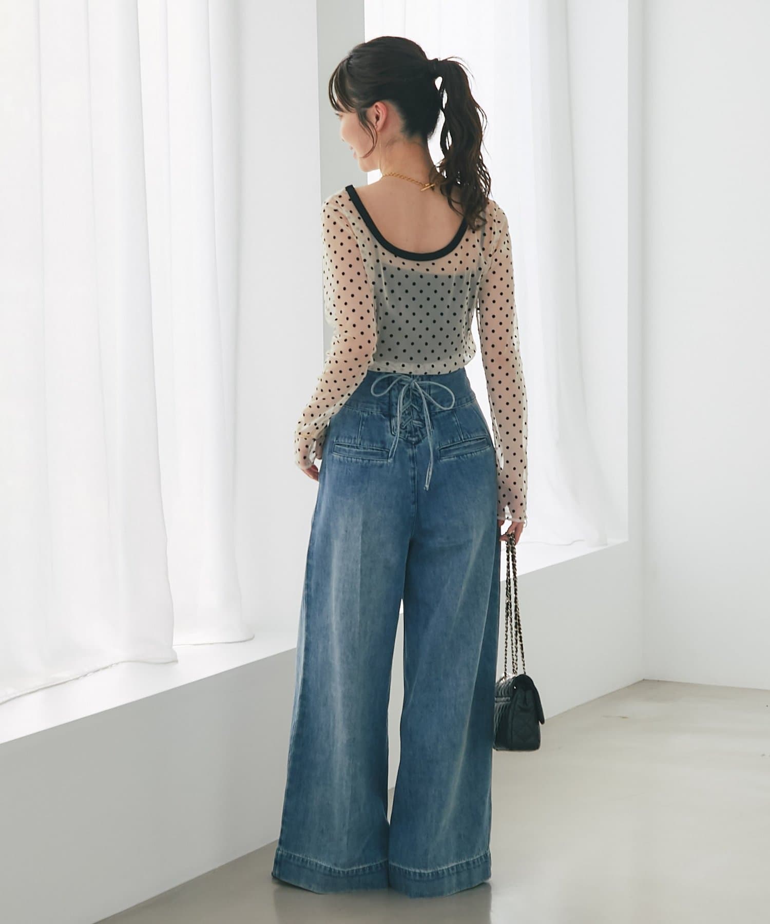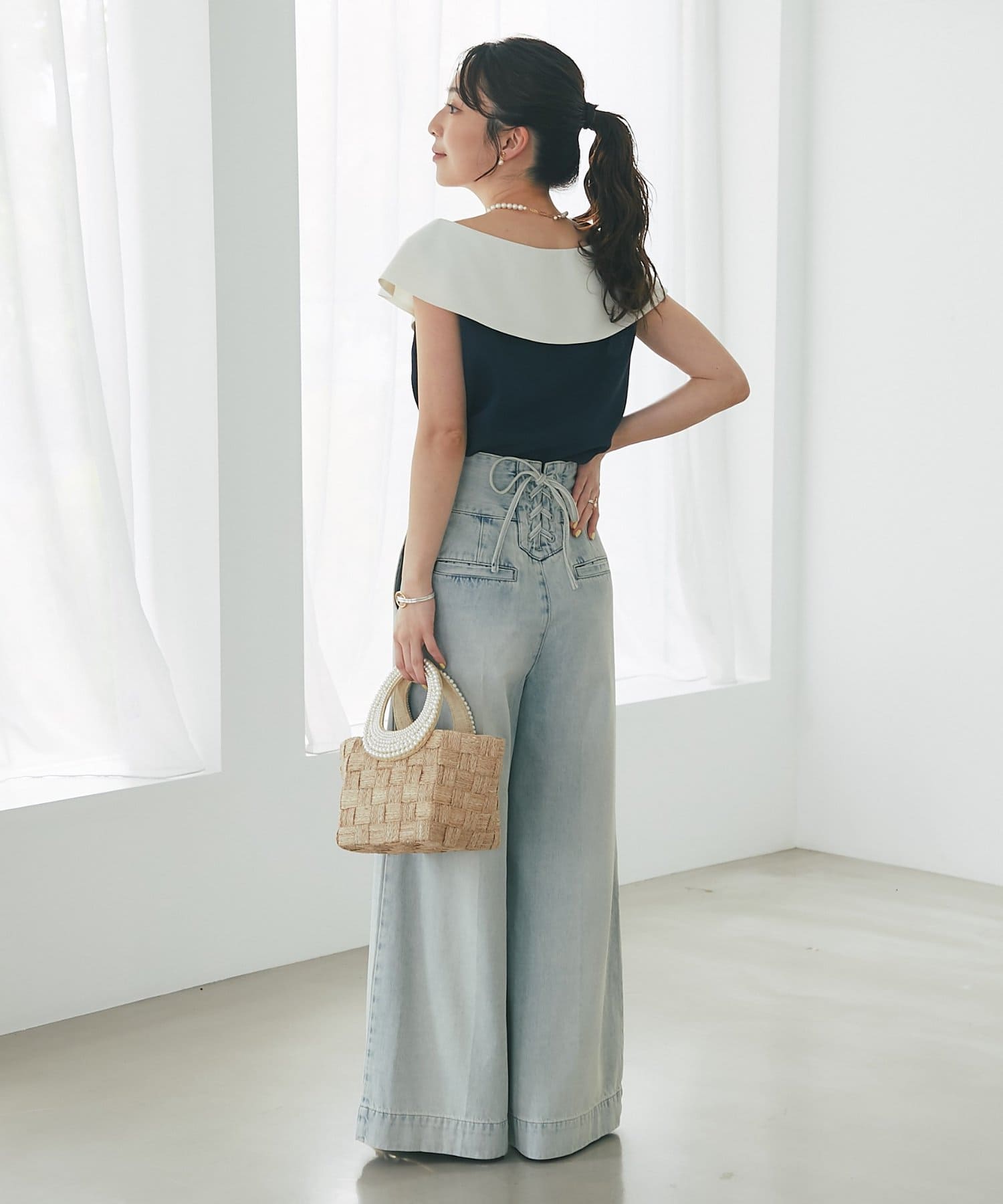 バックレースが目を引く、大人かわいいデニムワイドパンツ。