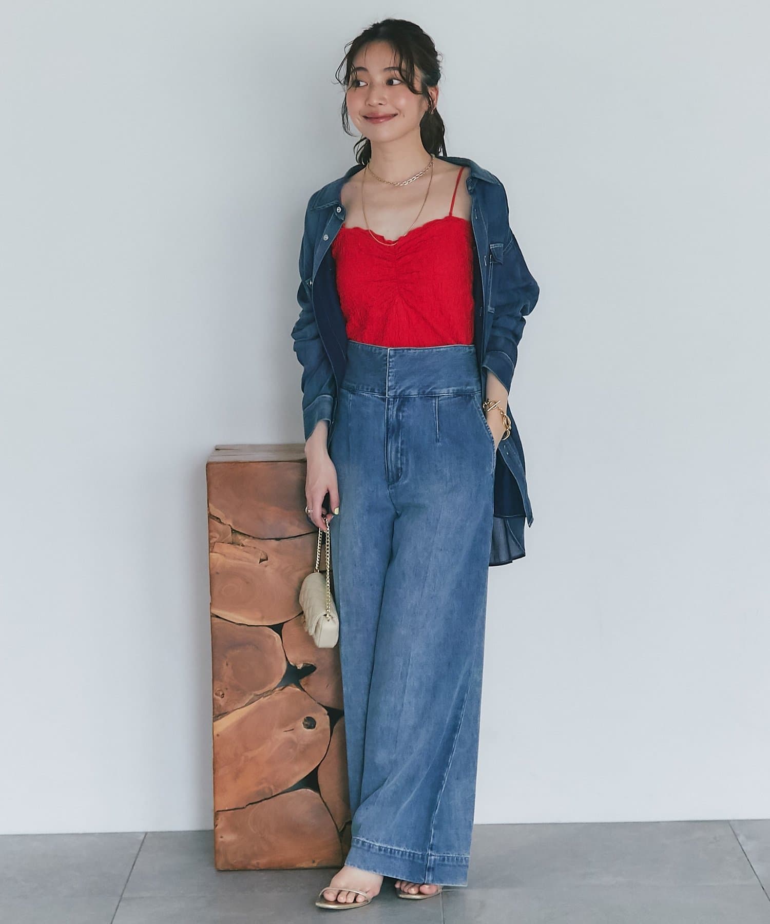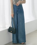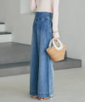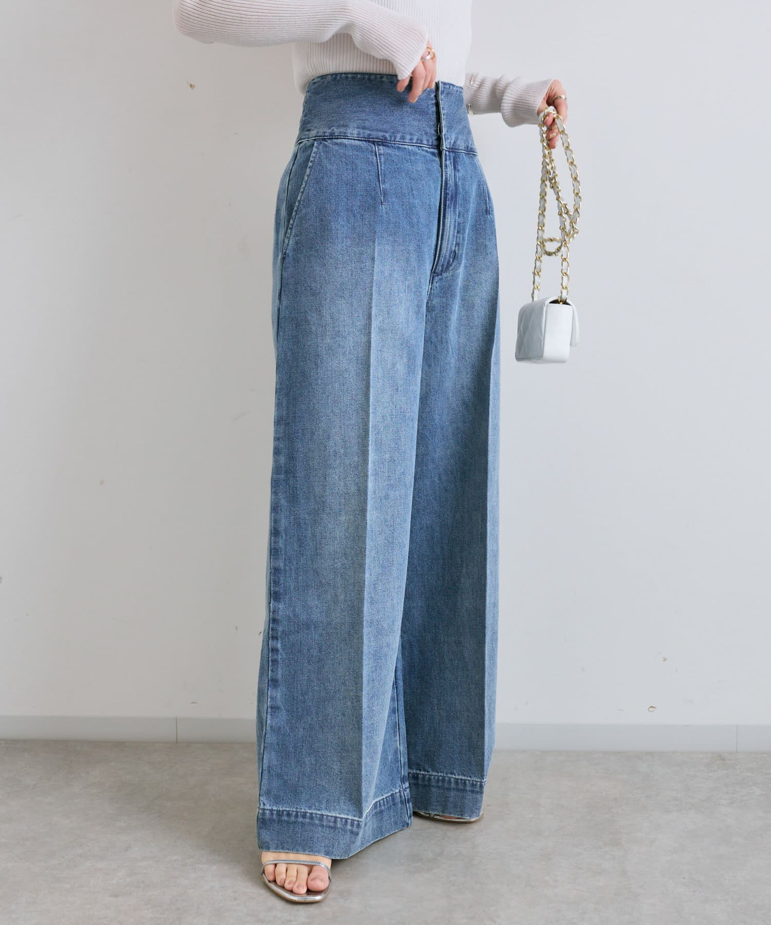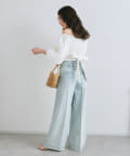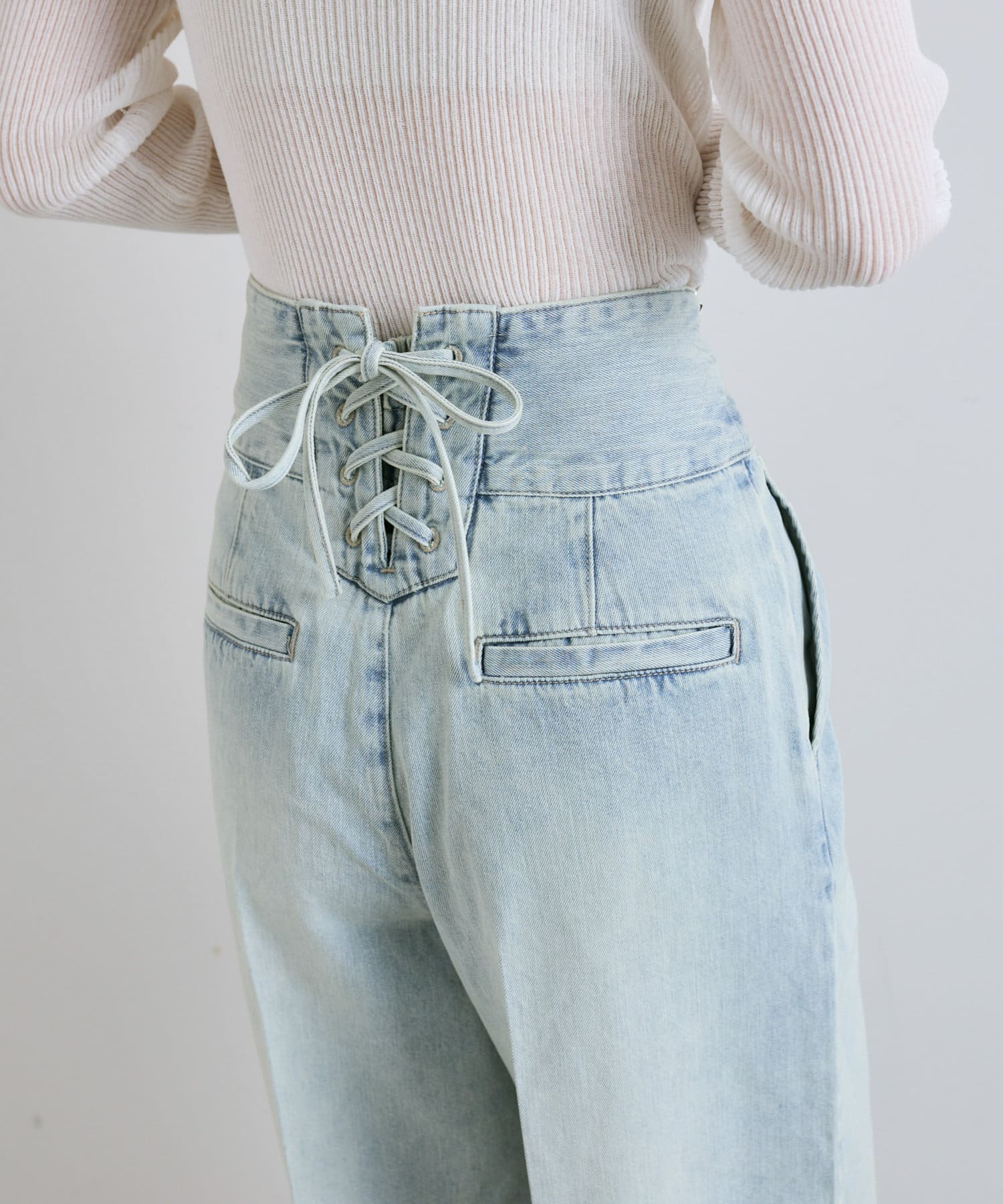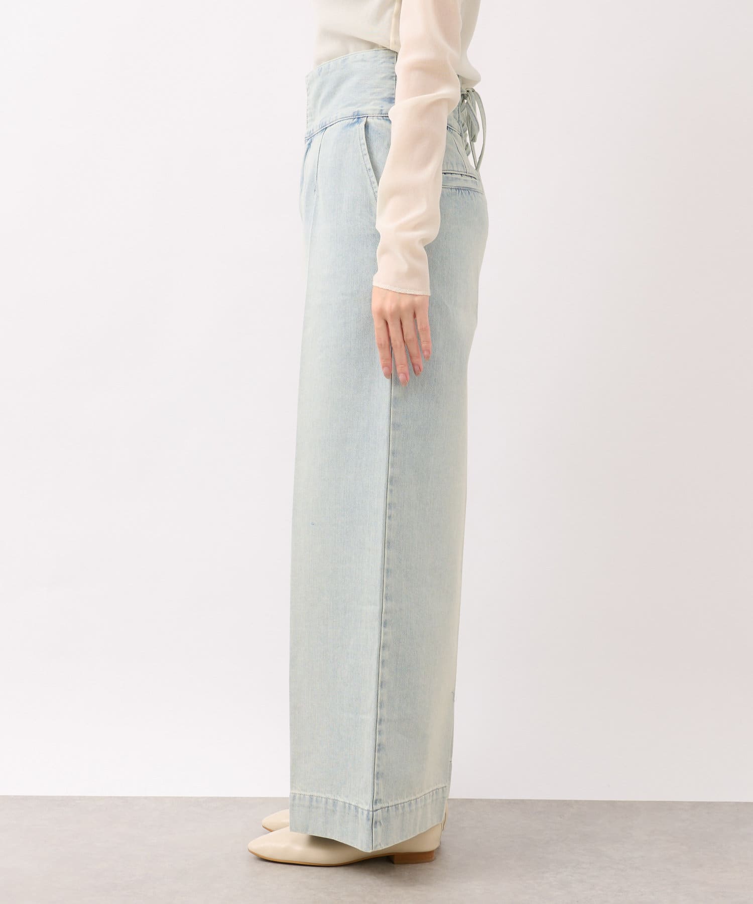 バックレースが目を引く、大人かわいいデニムワイドパンツ。