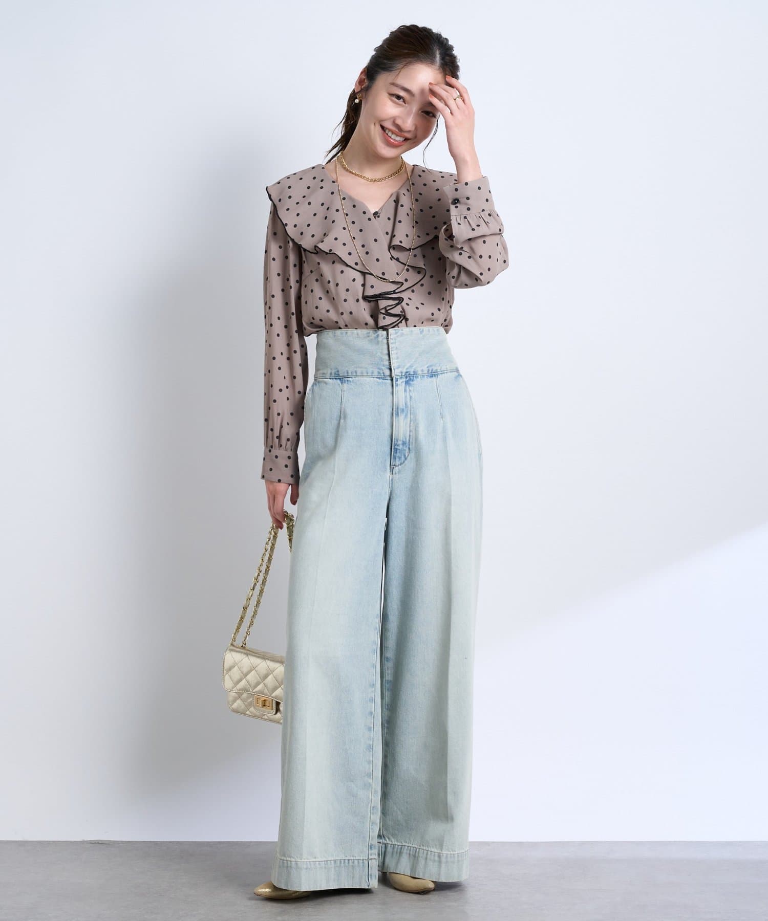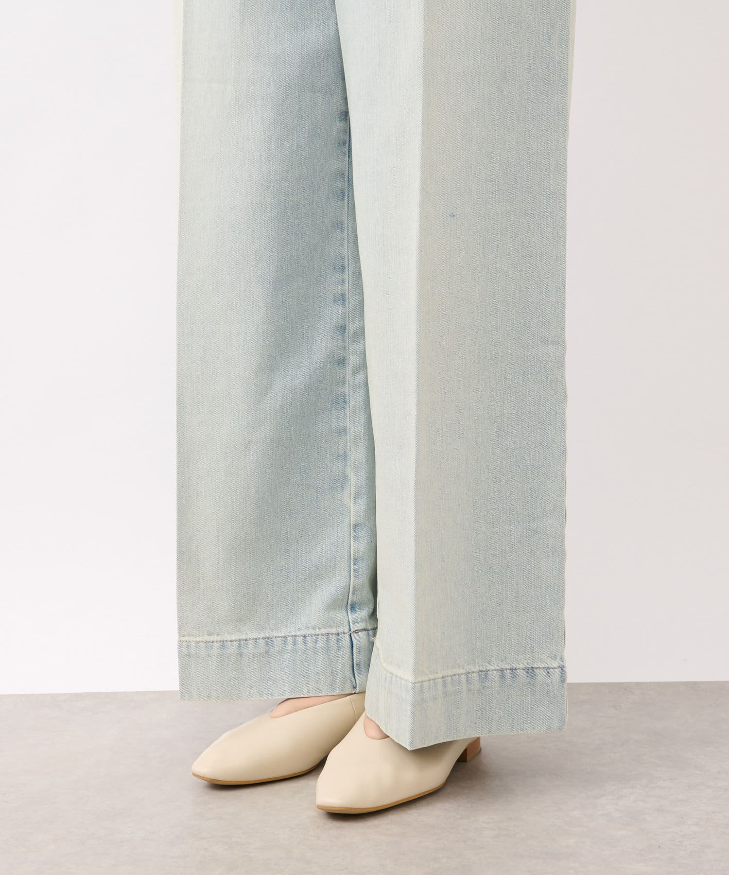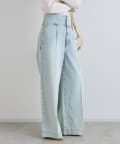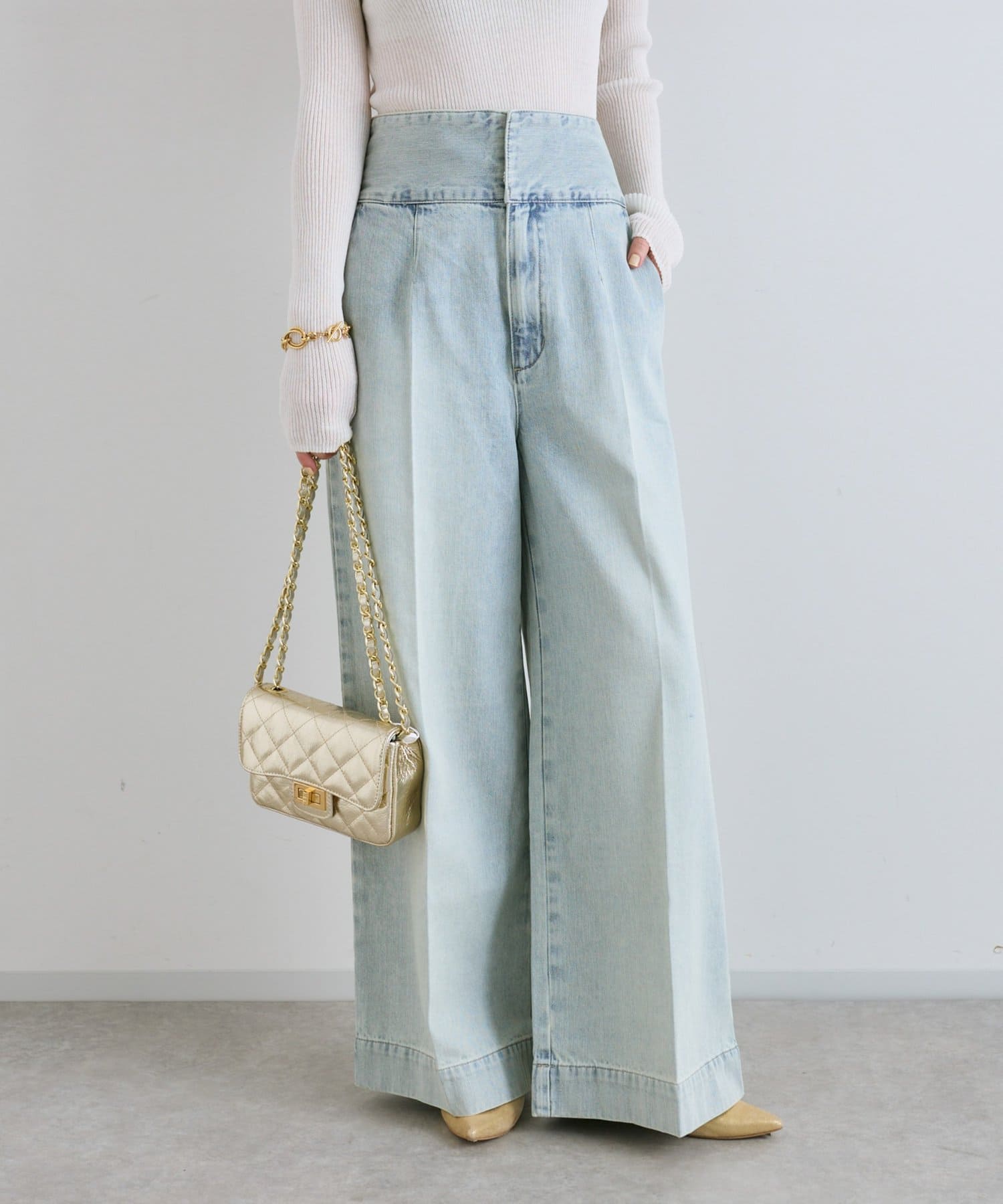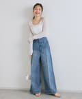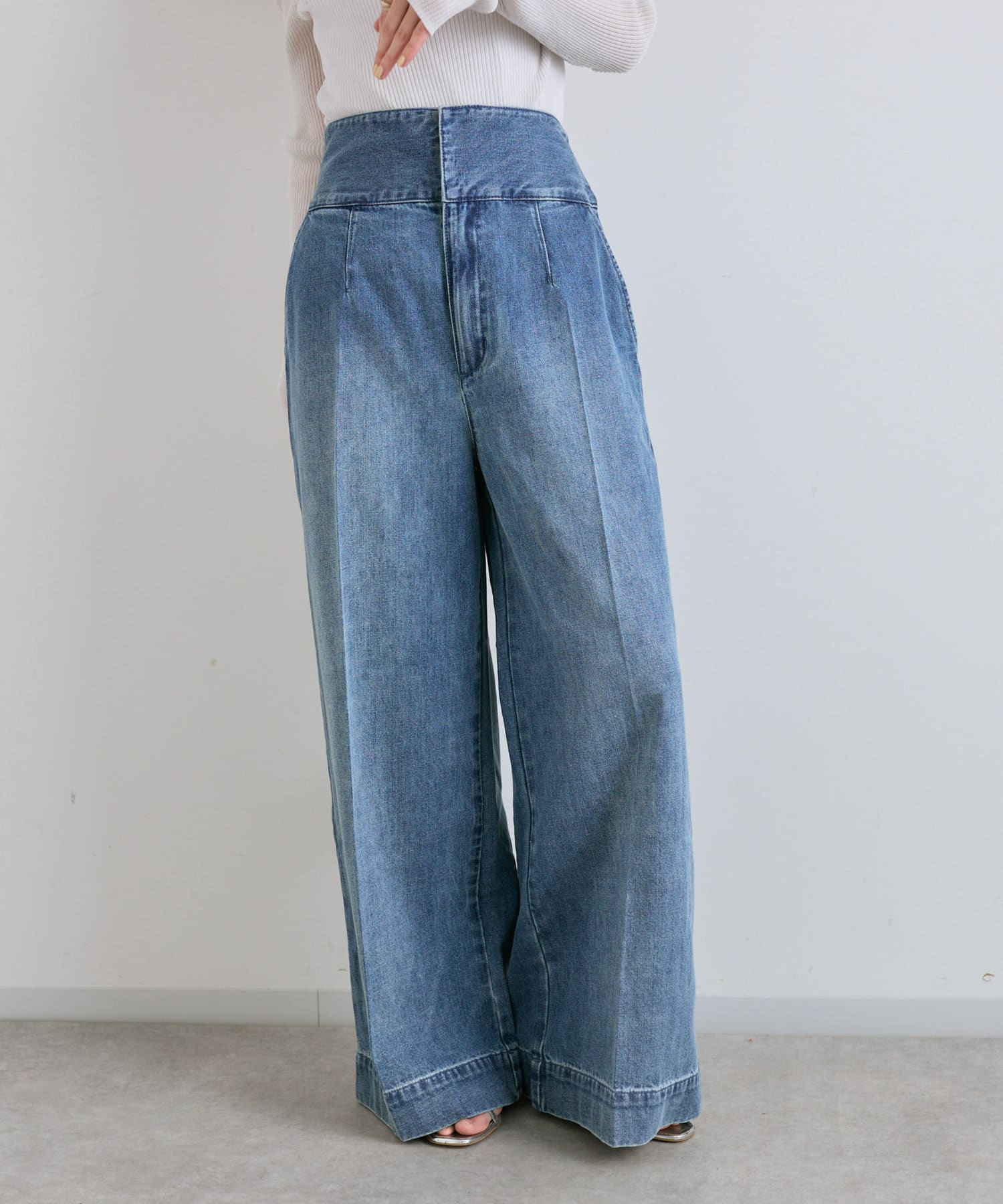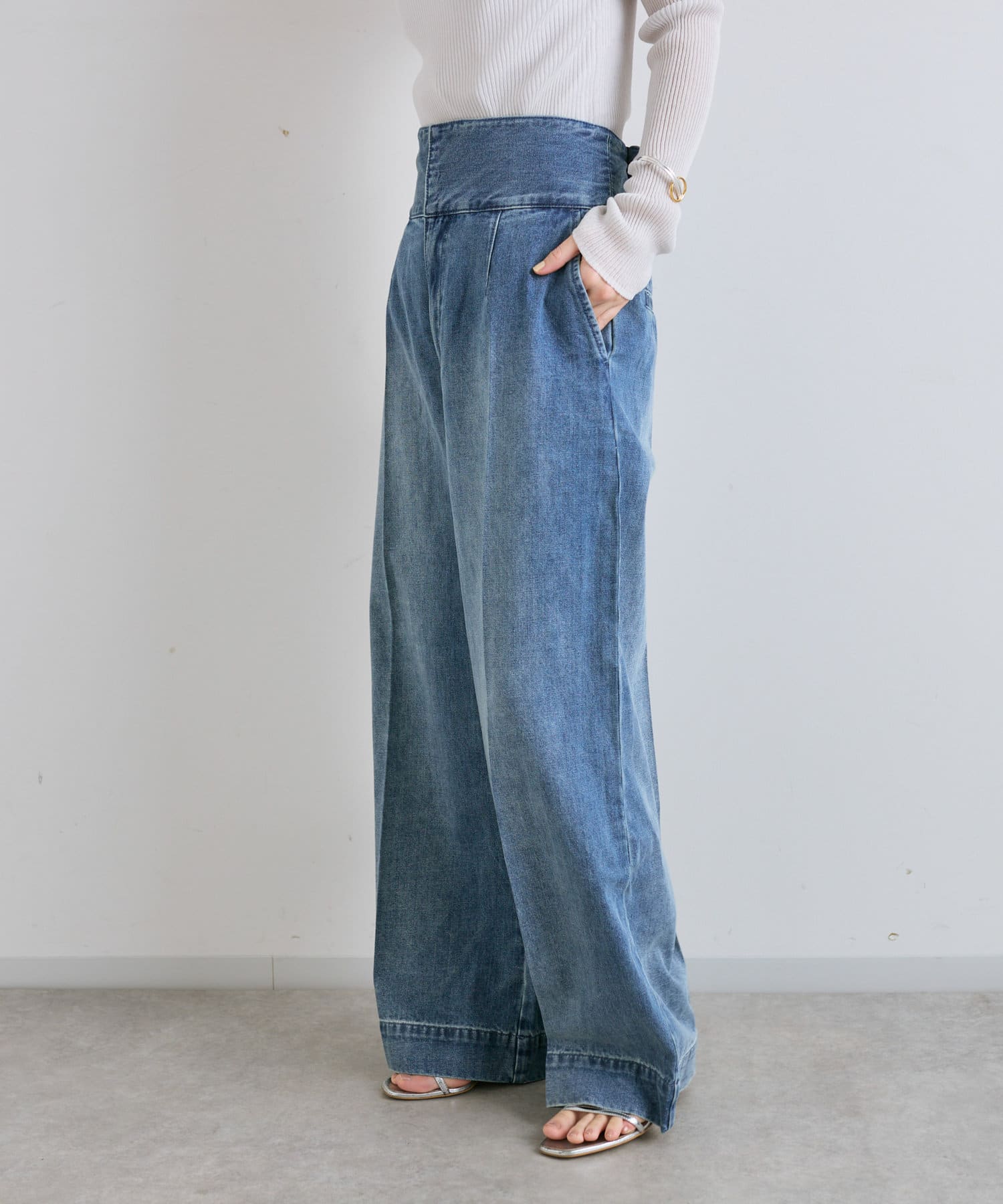 バックレースが目を引く、大人かわいいデニムワイドパンツ。
