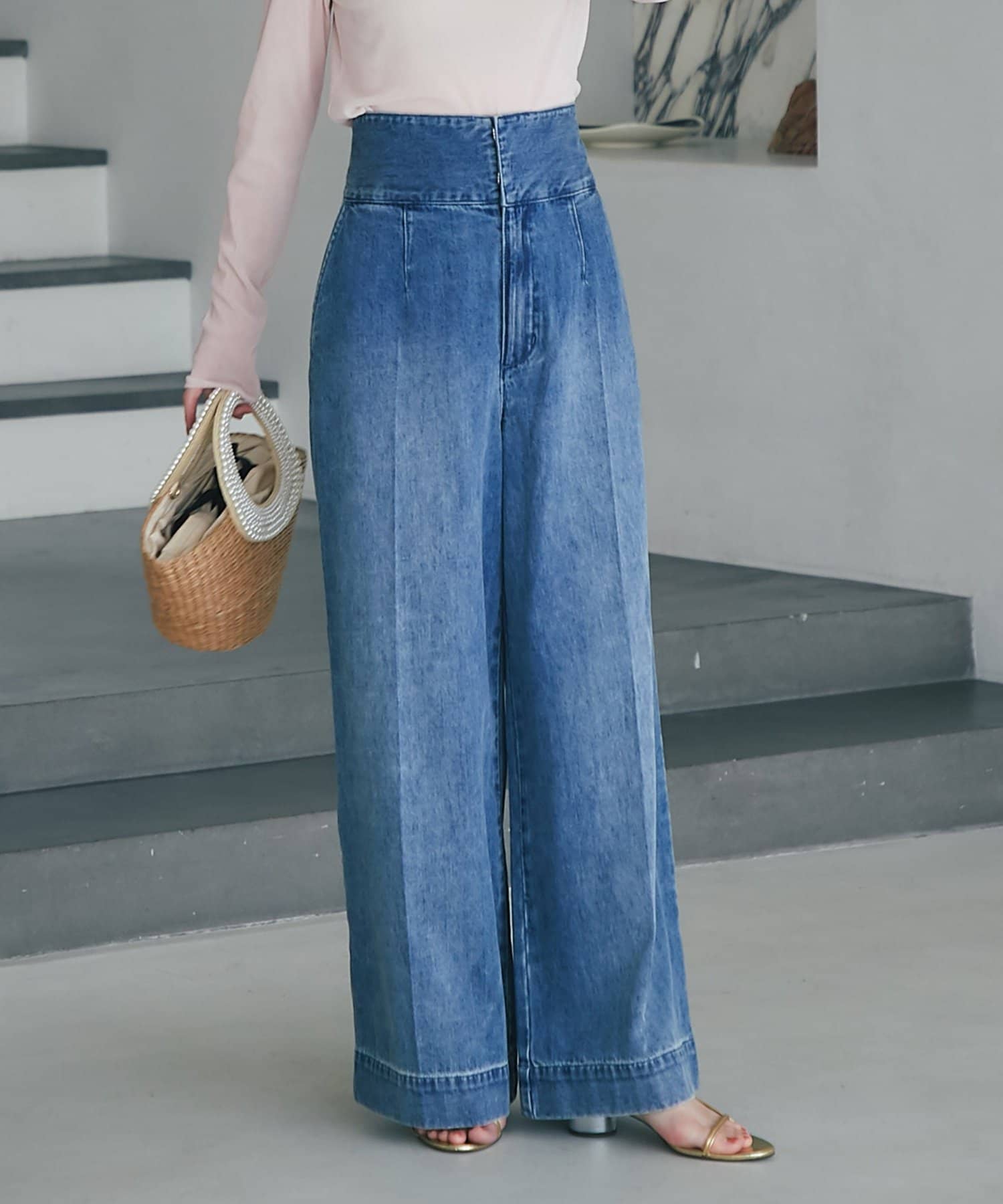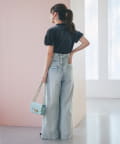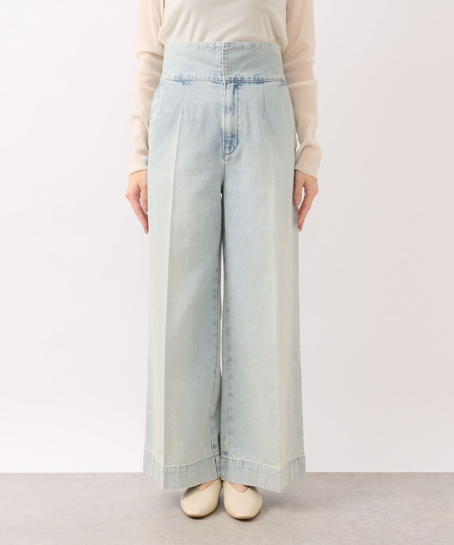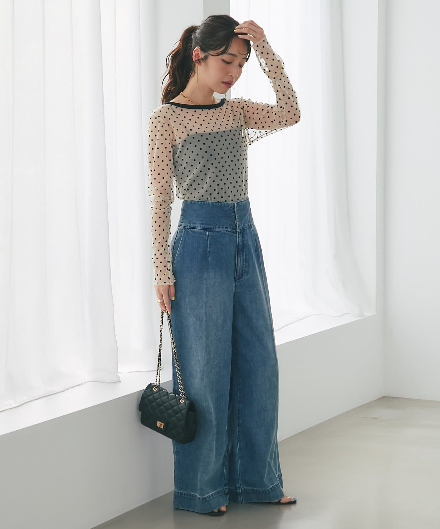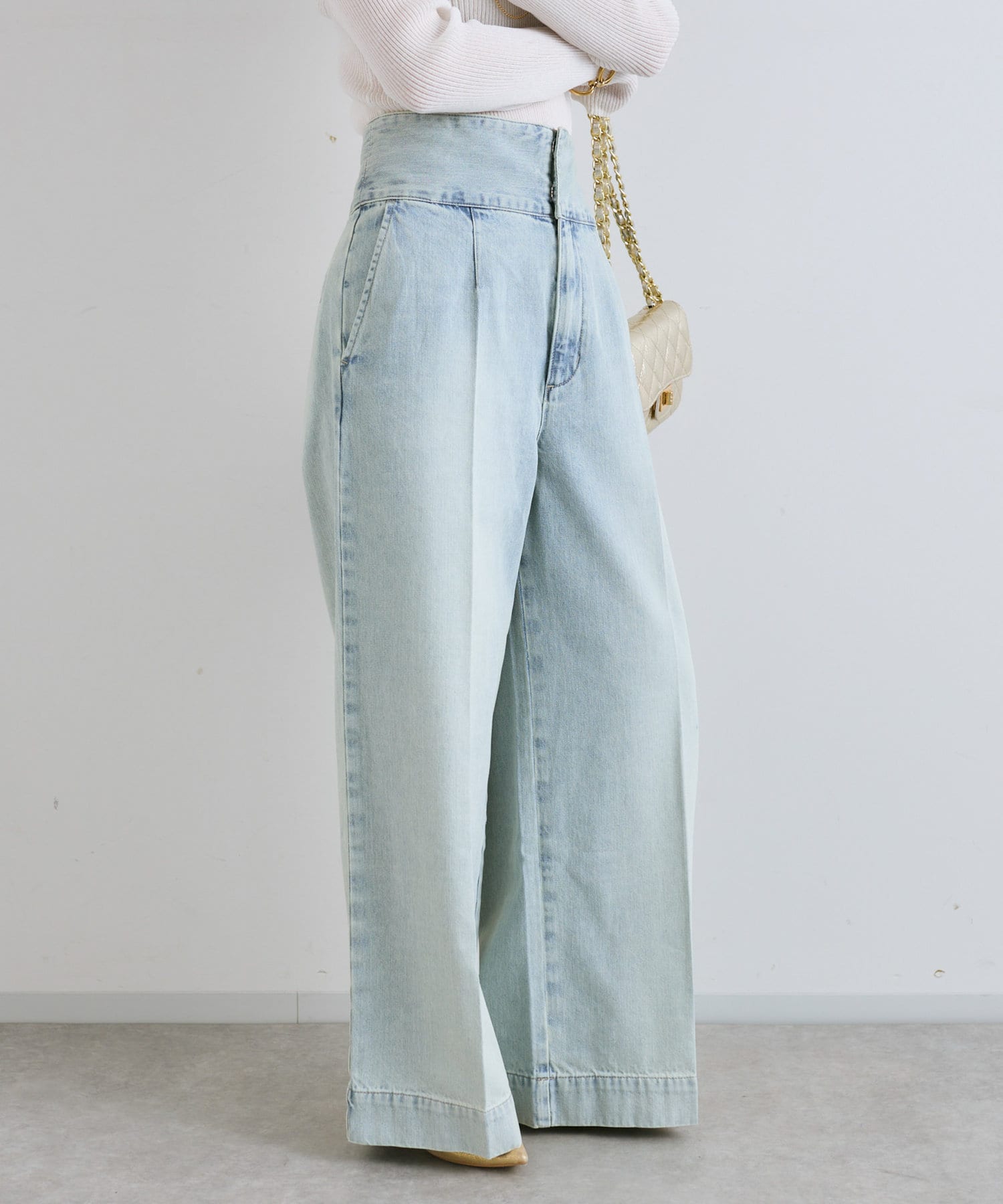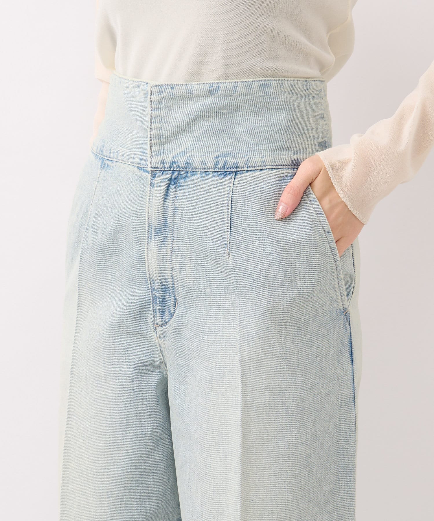 バックレースが目を引く、大人かわいいデニムワイドパンツ。