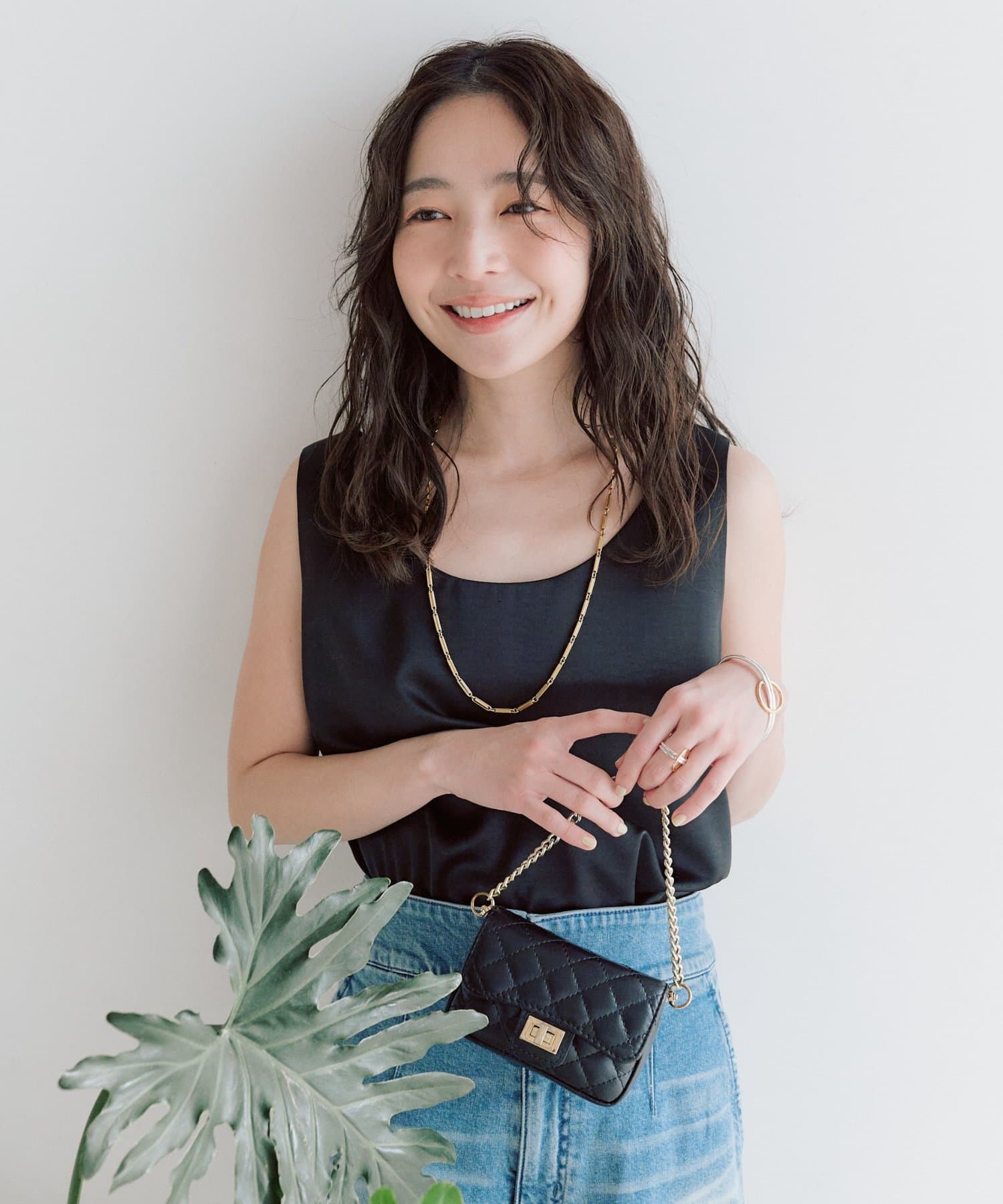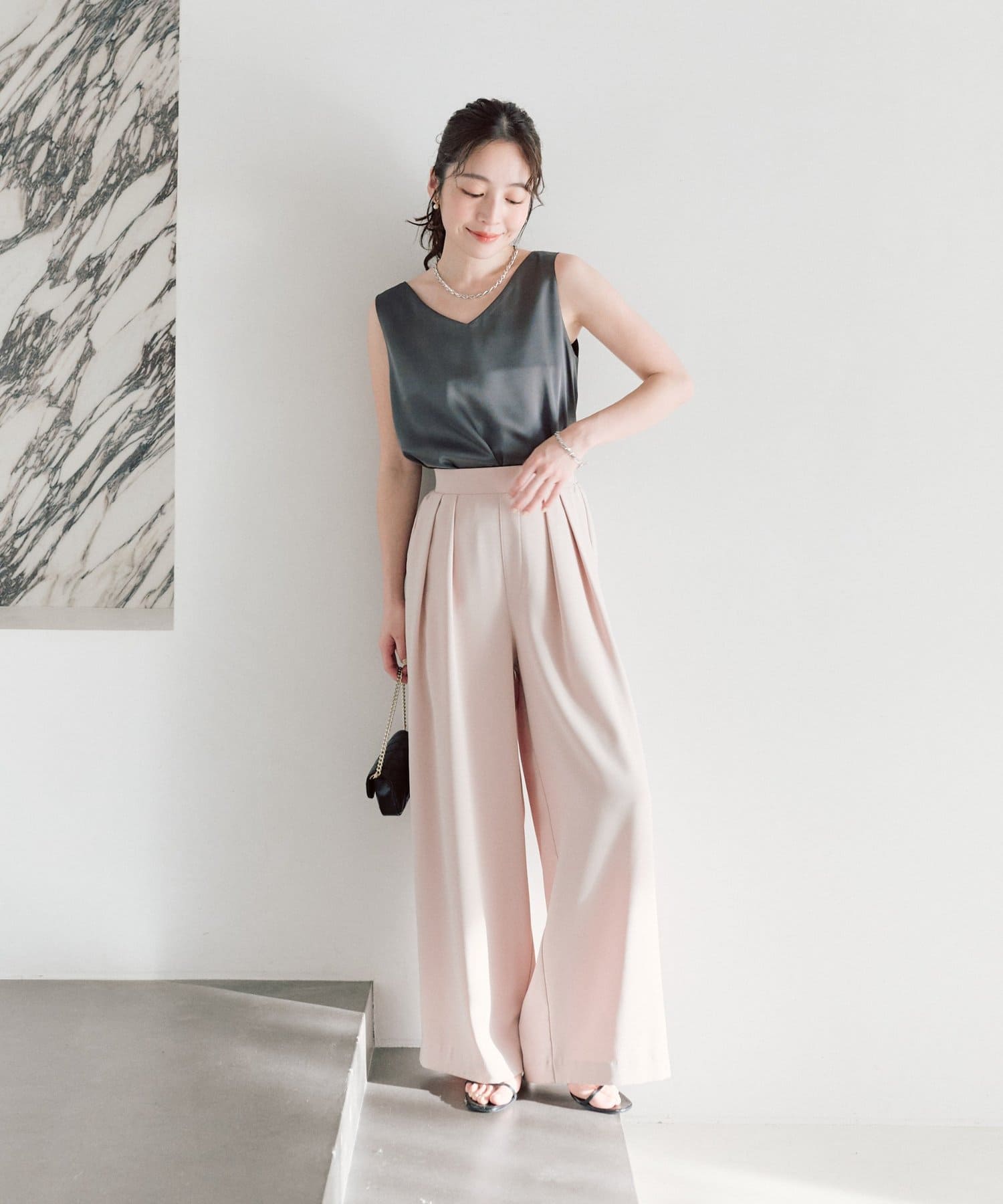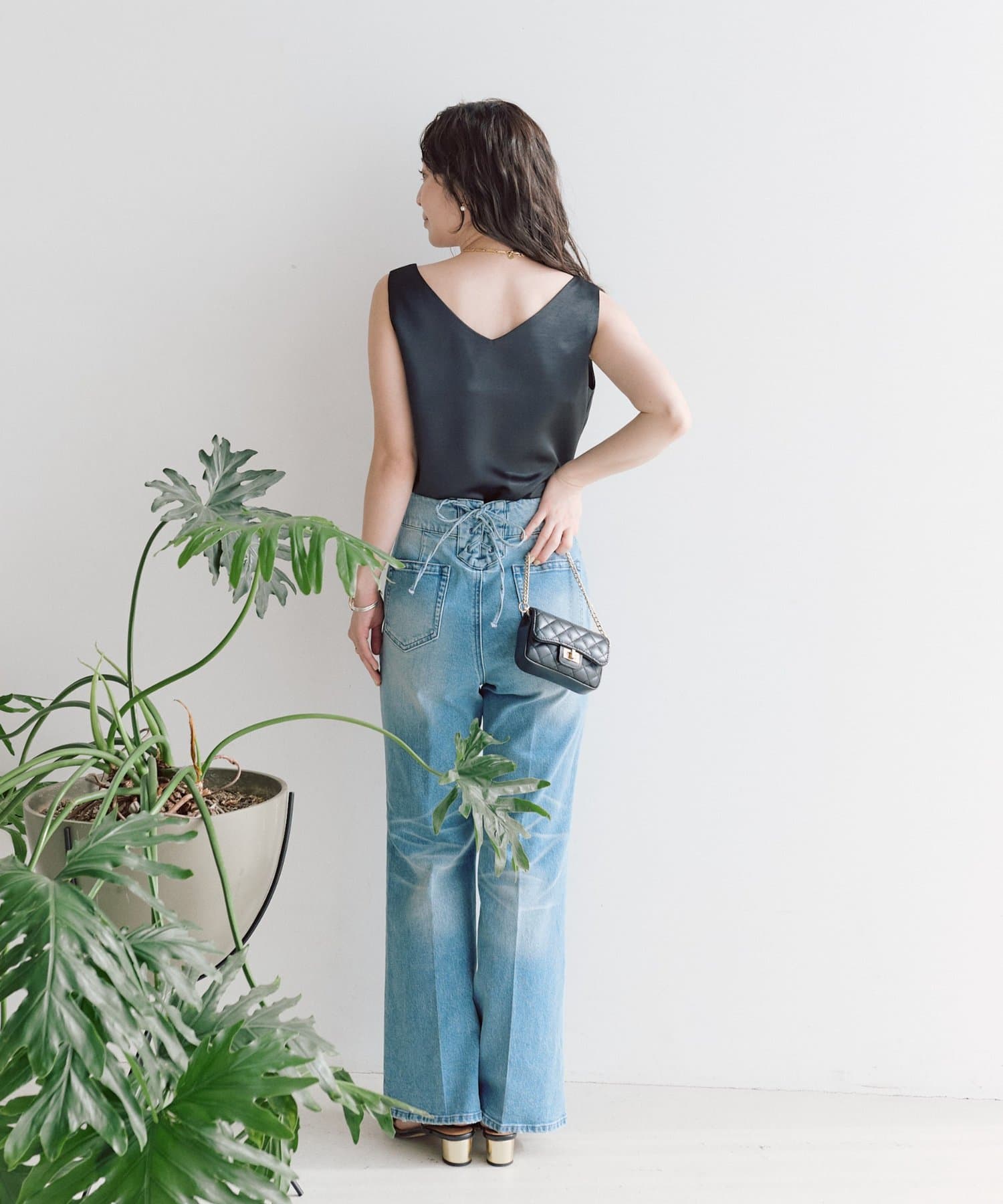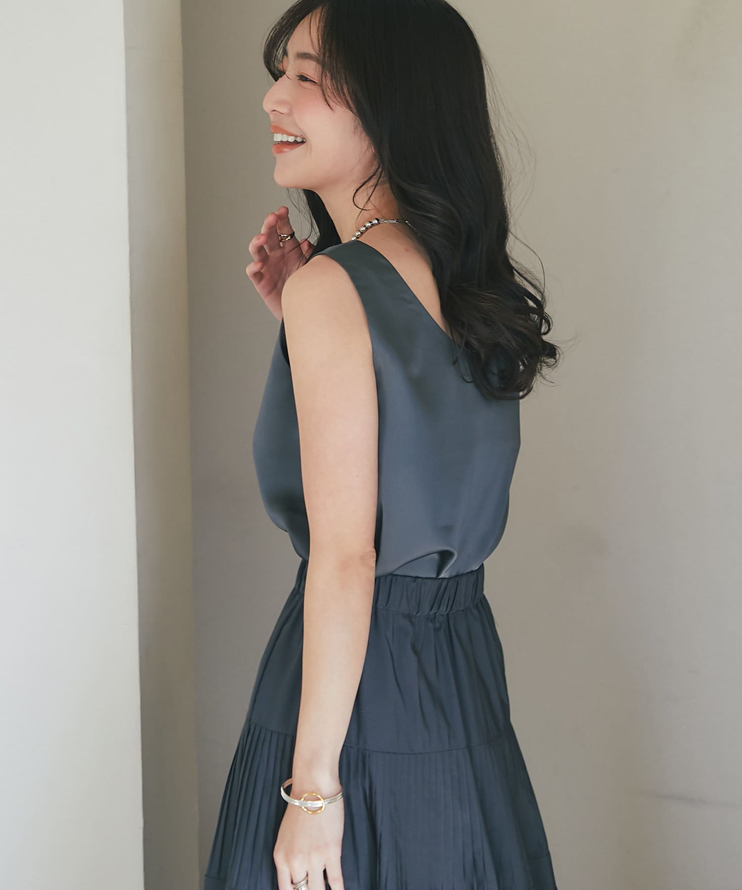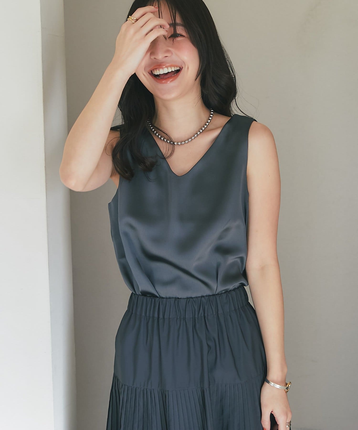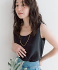 しっかりとしたサテン地の光沢感が上品でどんなスタイルにも合わせられるフェミニンな大人タンクです。