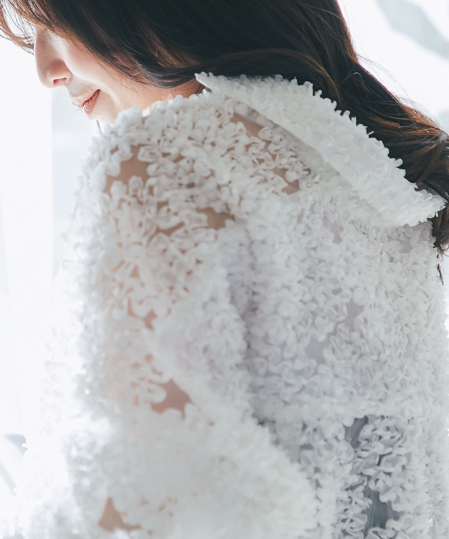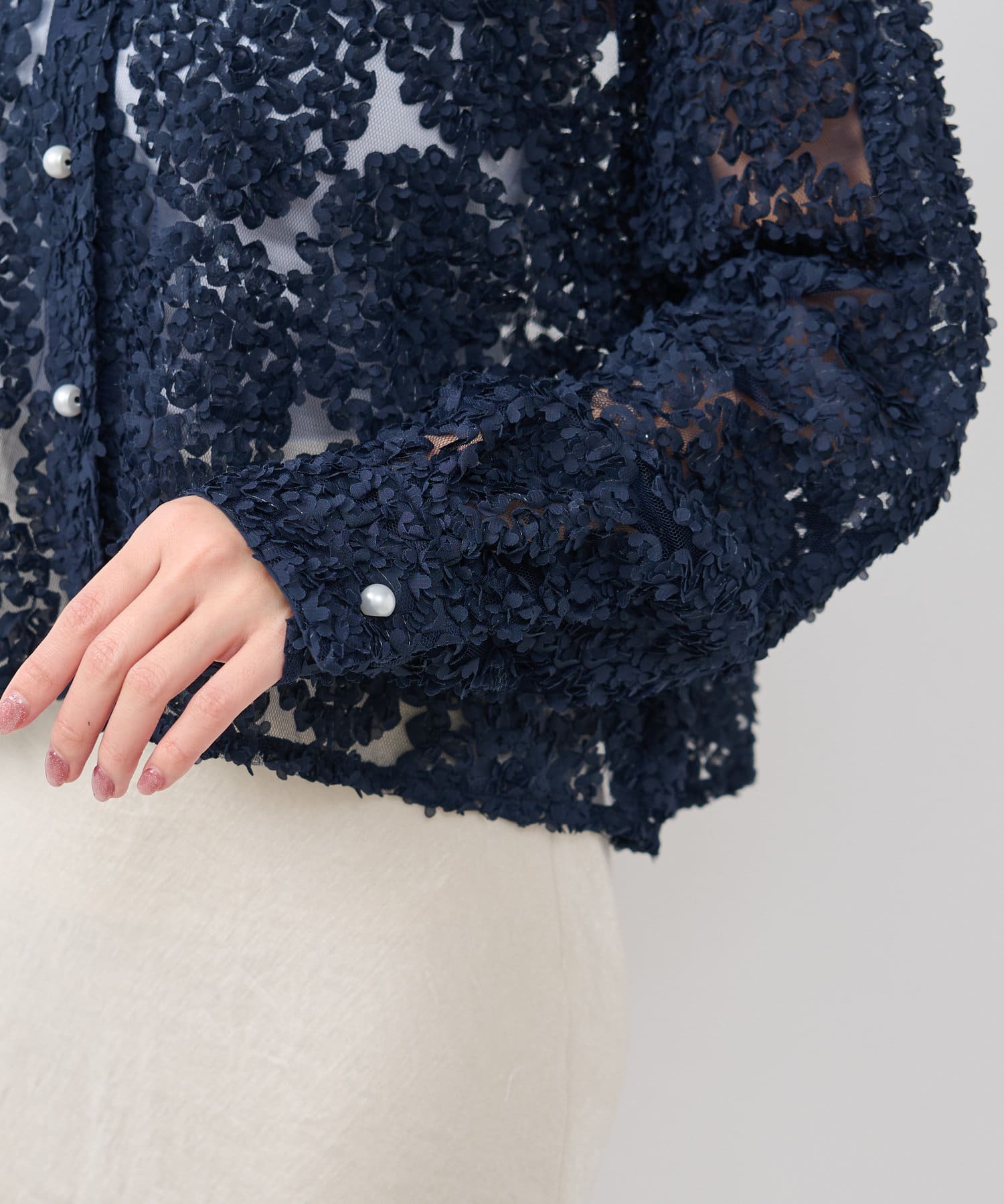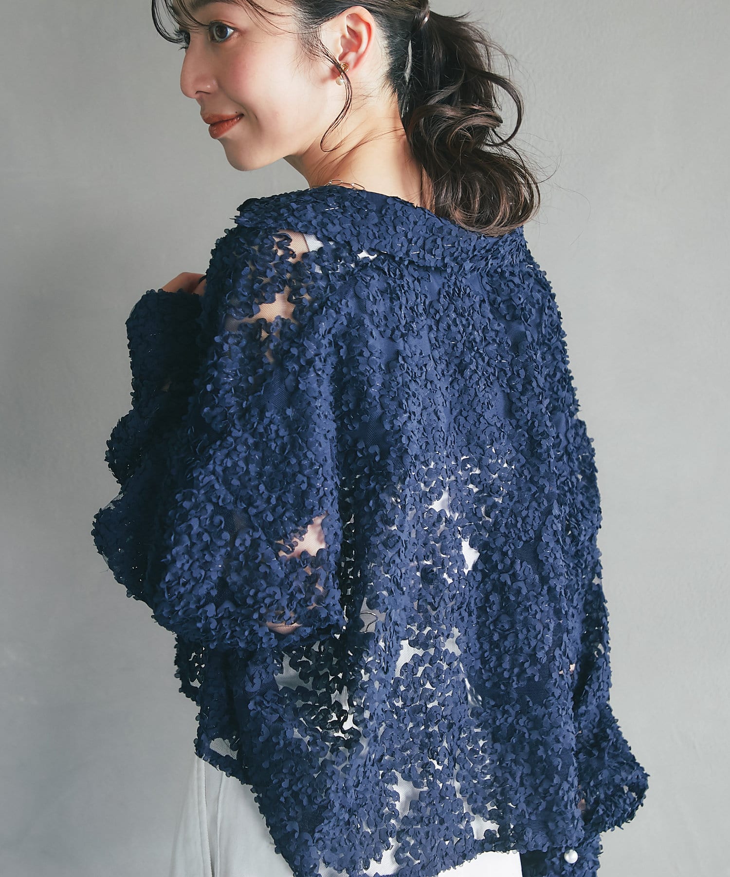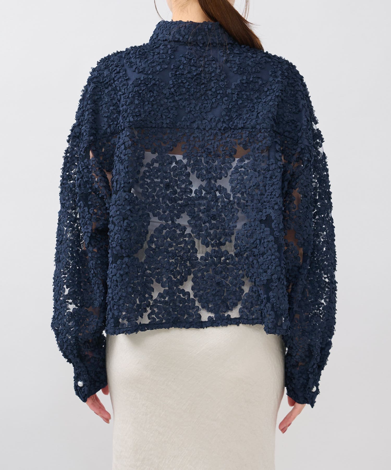 チュールにお花柄のモチーフを施した立体感のある華やかな雰囲気のシャツ。