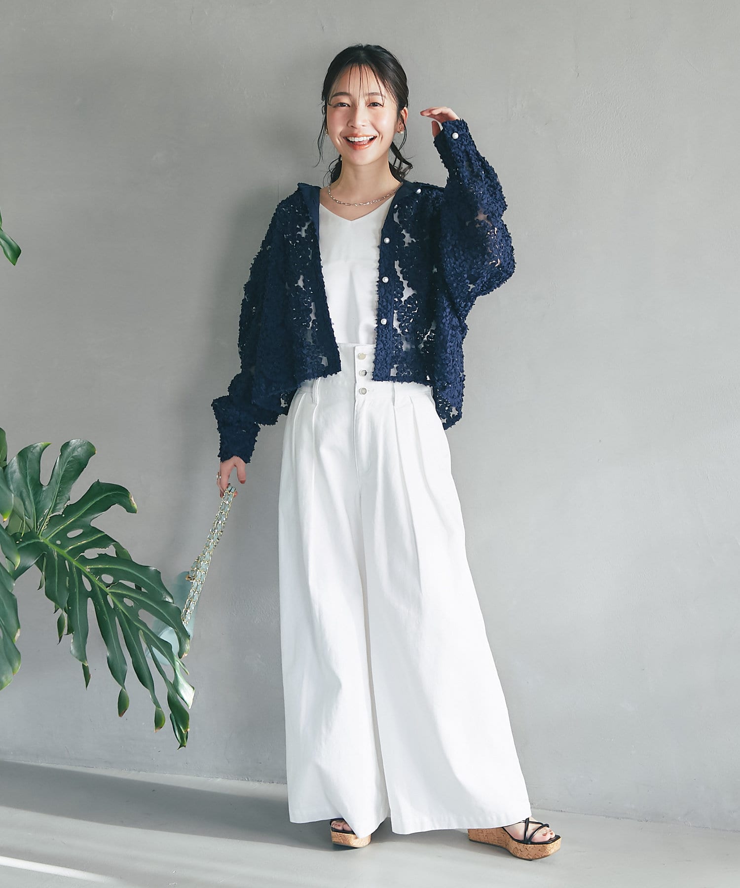 パールボタンもアクセントになり、女性らしい着こなしを演出できます。