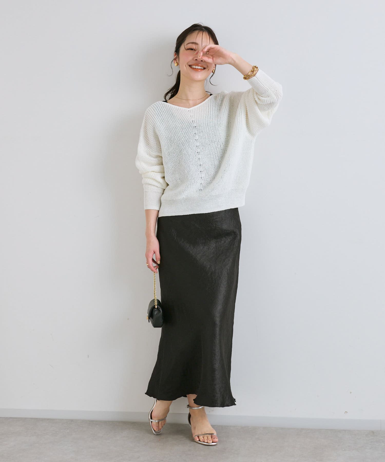 鎖骨が覗くほどのラウンドネックとデコルテを美しく映し出すスクエアネックの