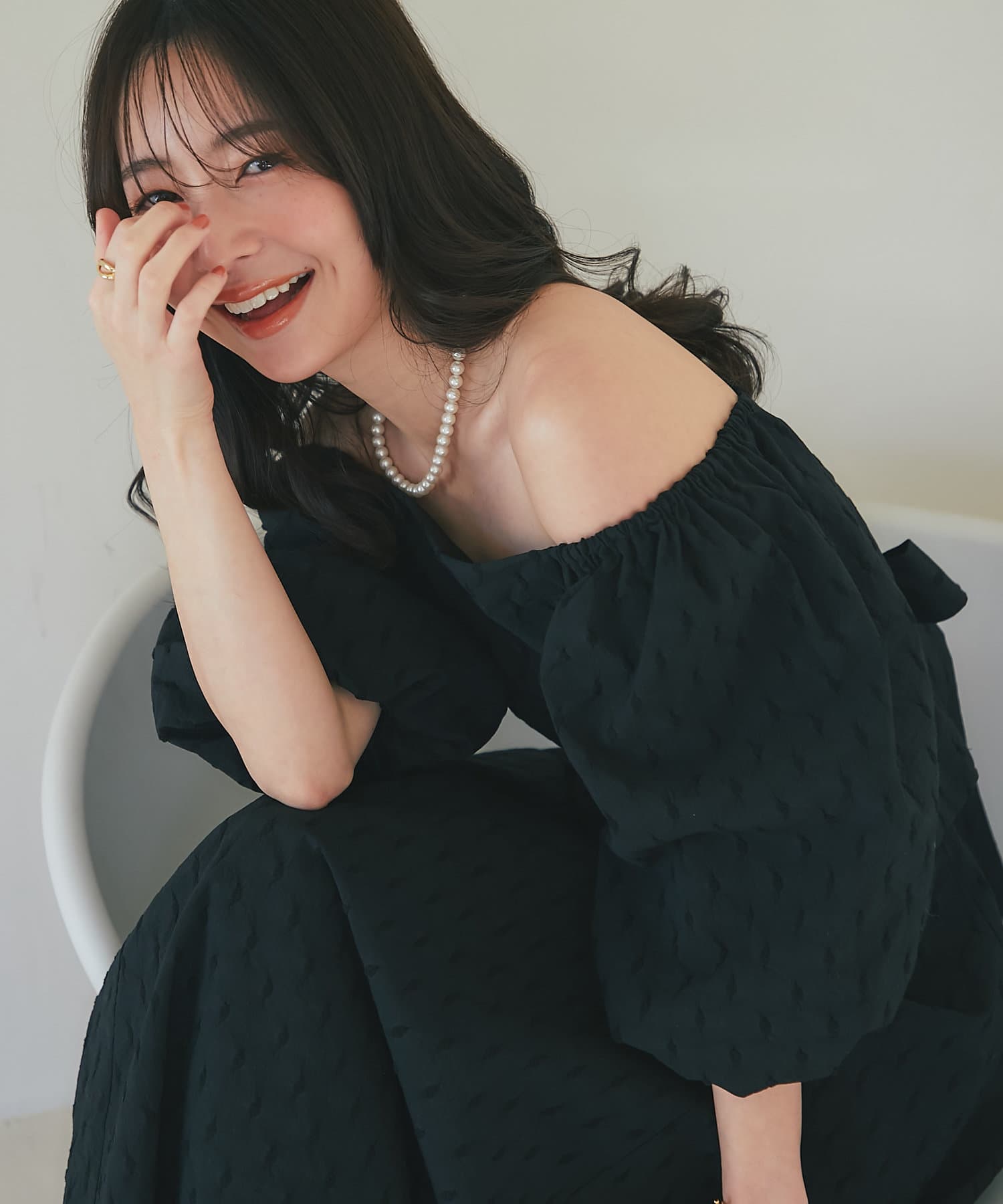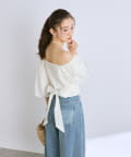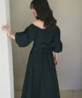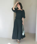 デコルテを美しく演出するスクエアネックと、袖のボリュームと手首の細さの対比で華奢見え効果も期待できるアイテム。